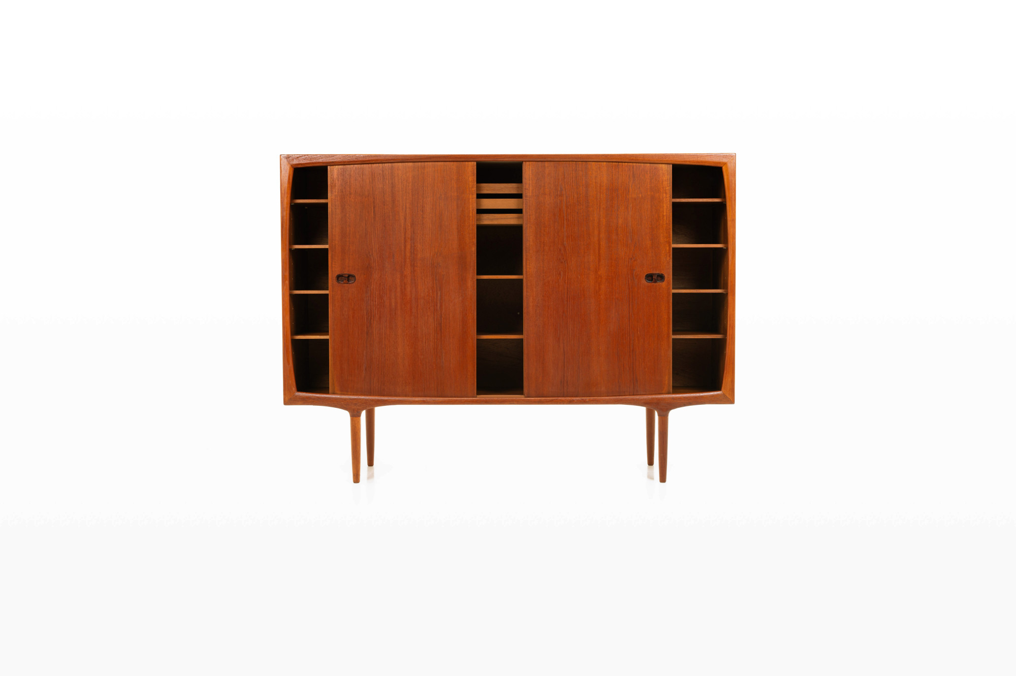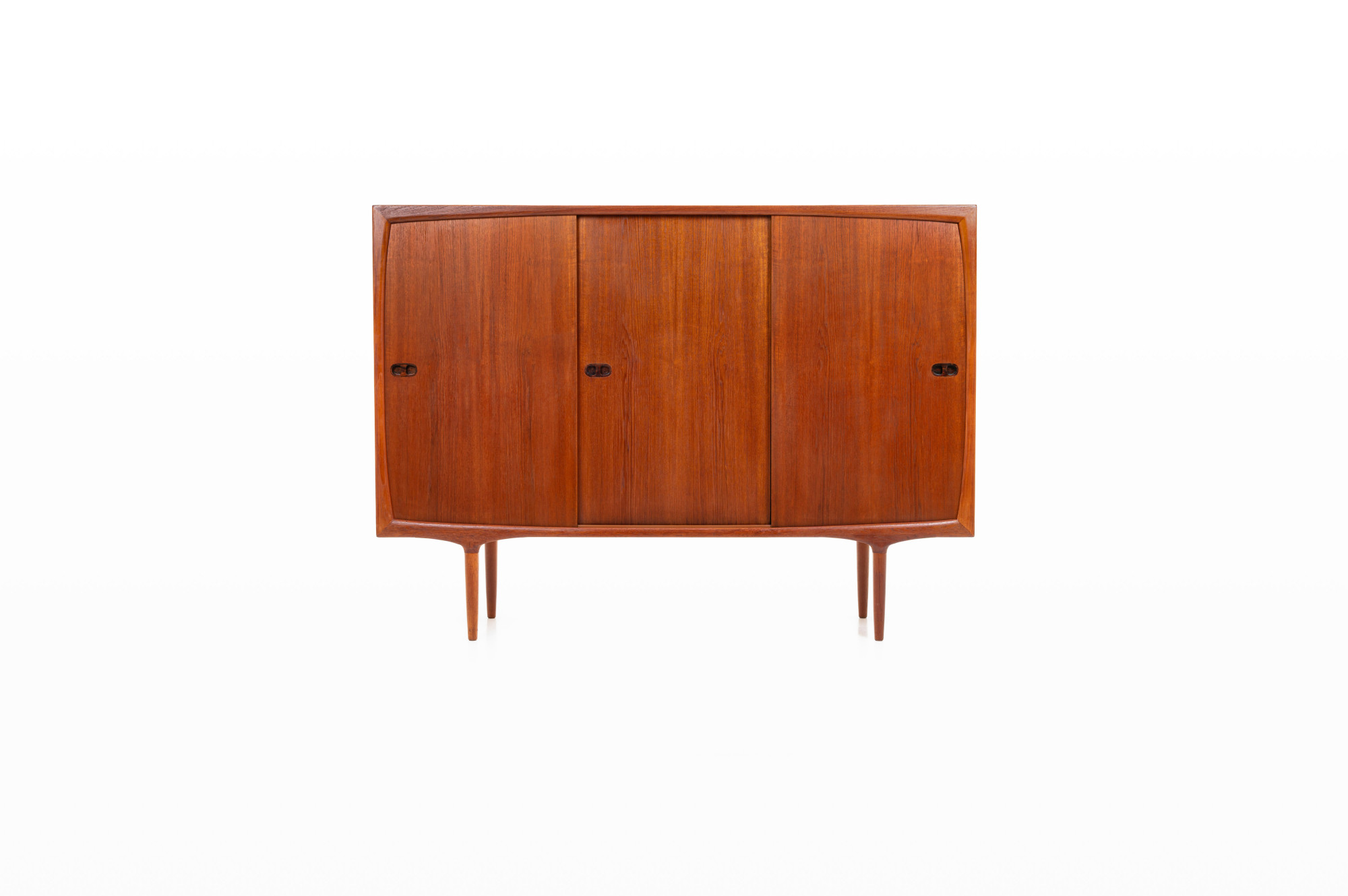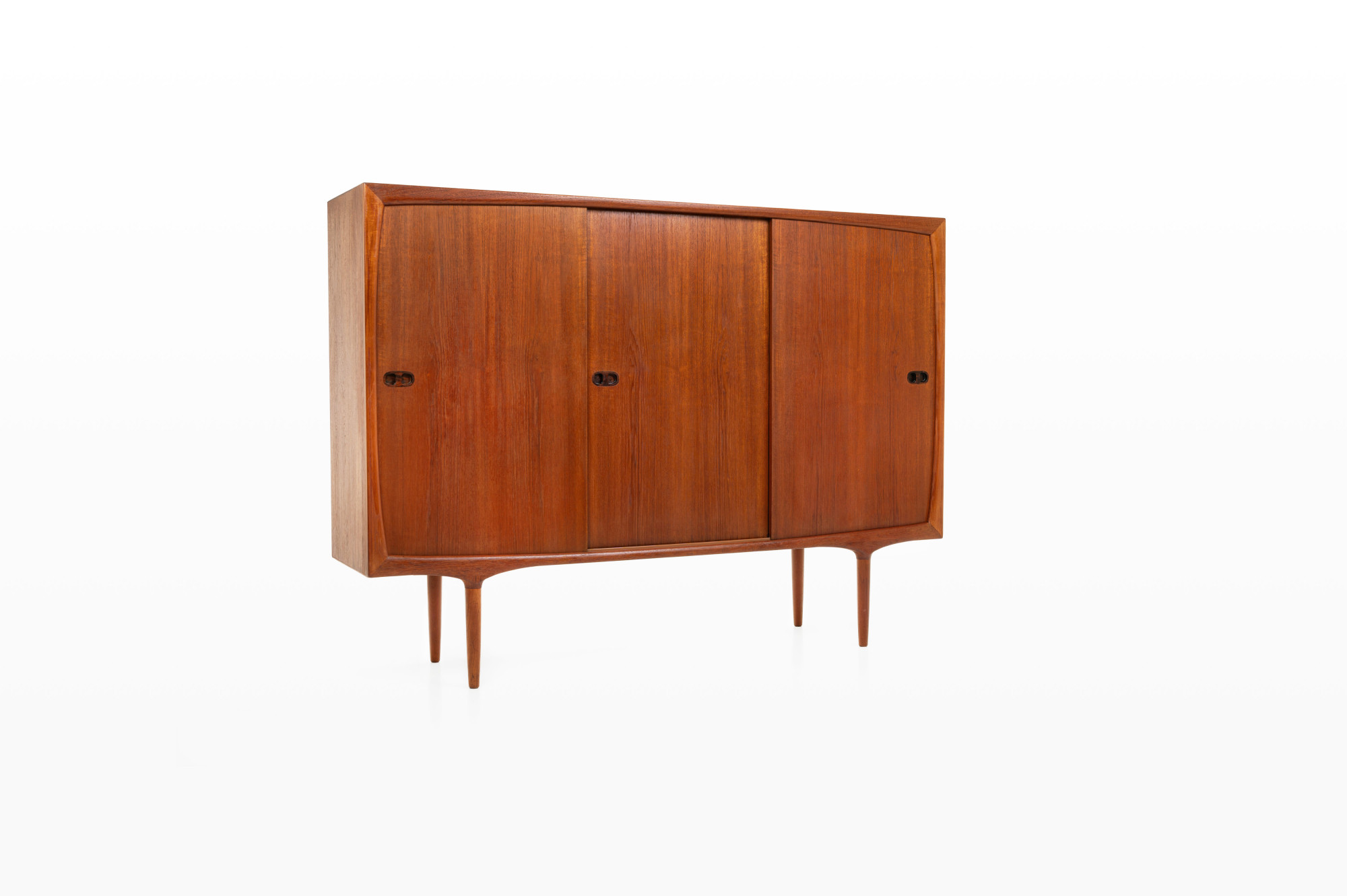Danish vintage highboard by Randers Møbelfabrik, Denmark 1960s. This gorgeous piece has three sliding doors, three inner drawers and a lot of storage space. This highboard is made of teak wood with rosewood handles and is in great condition.