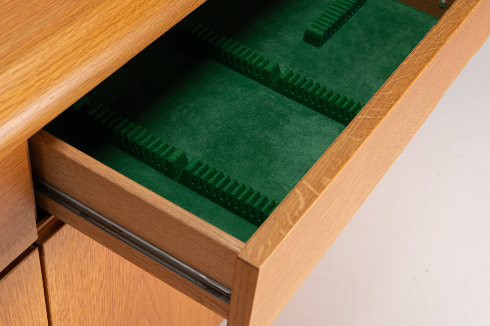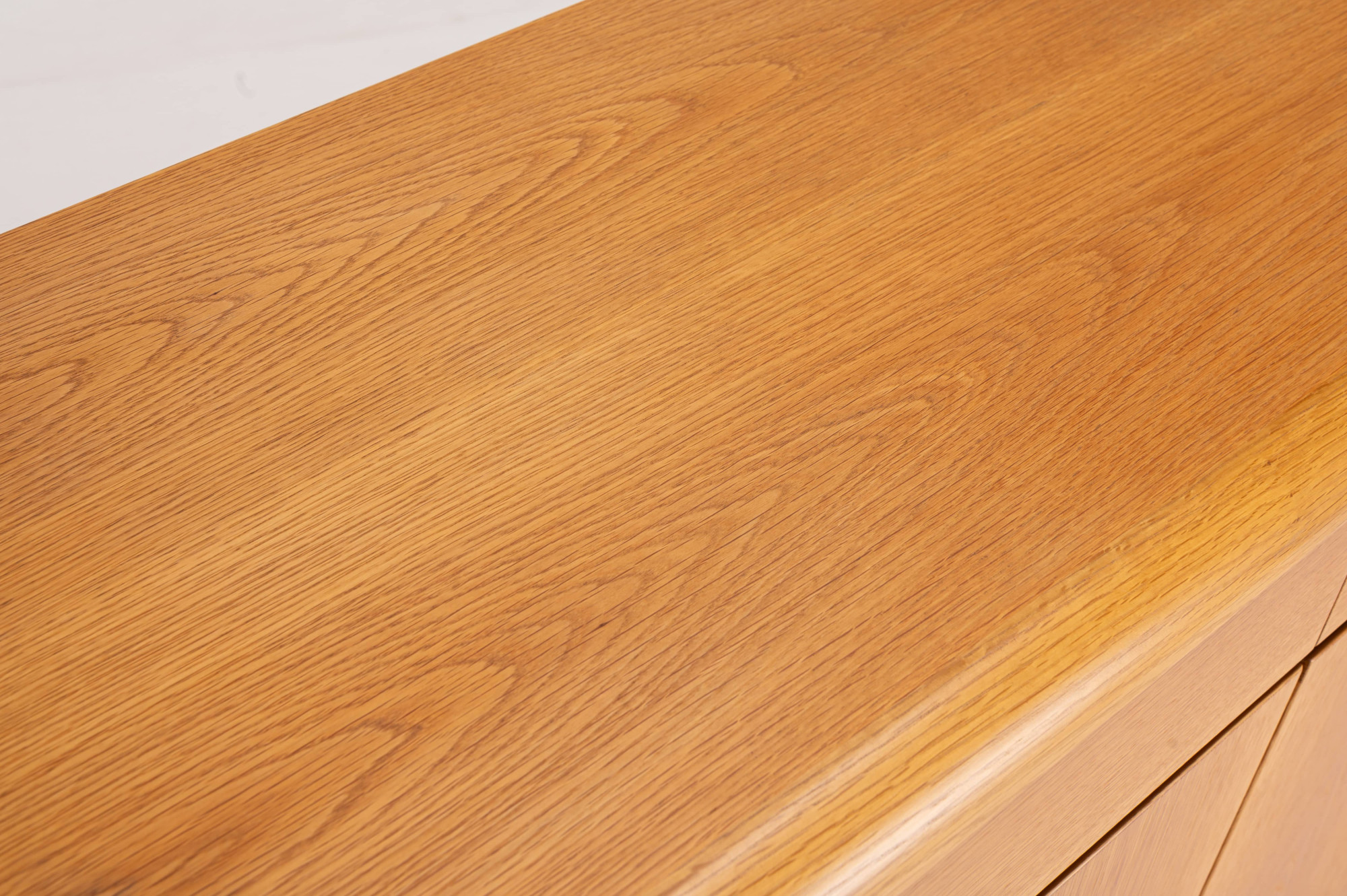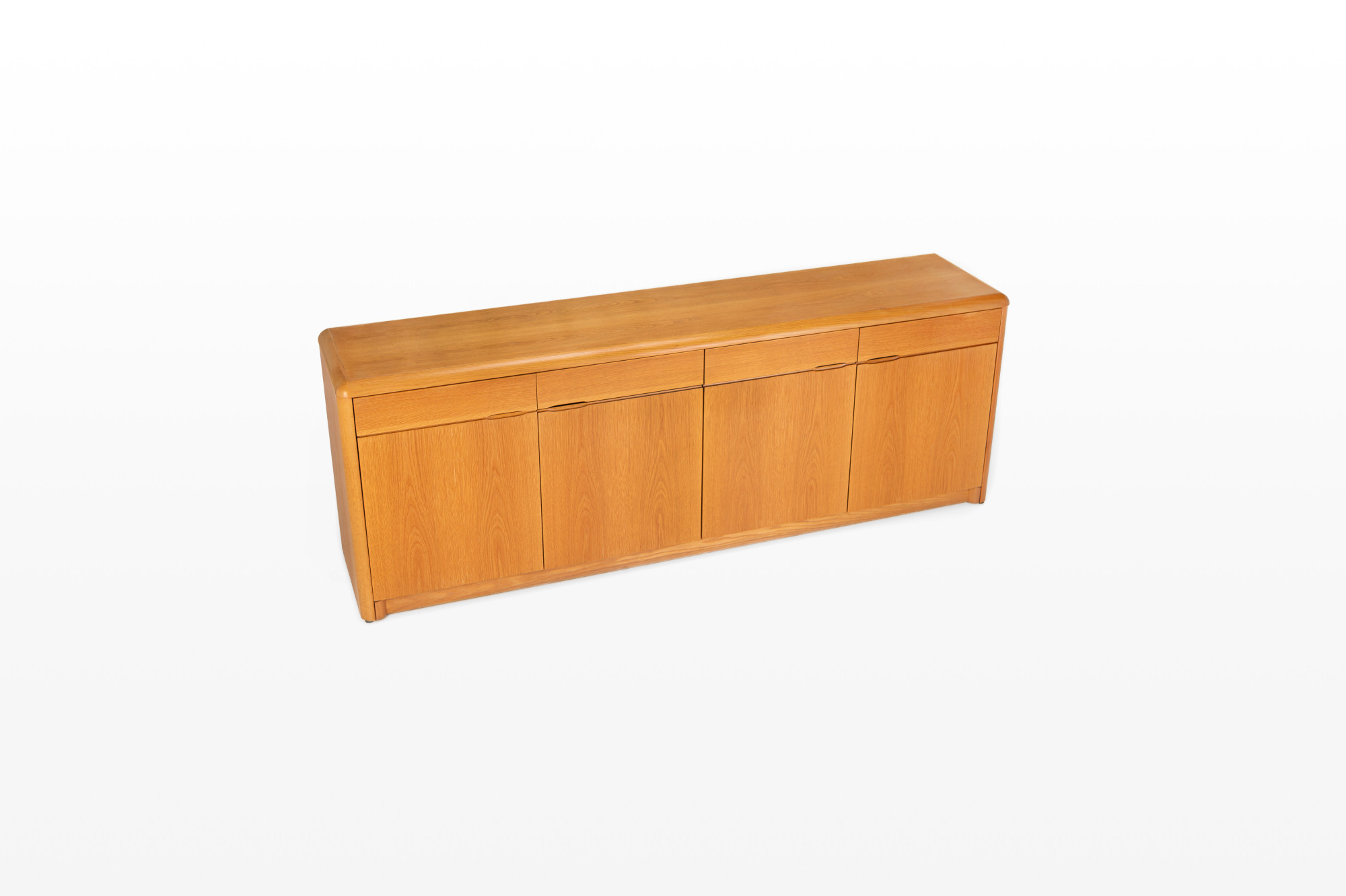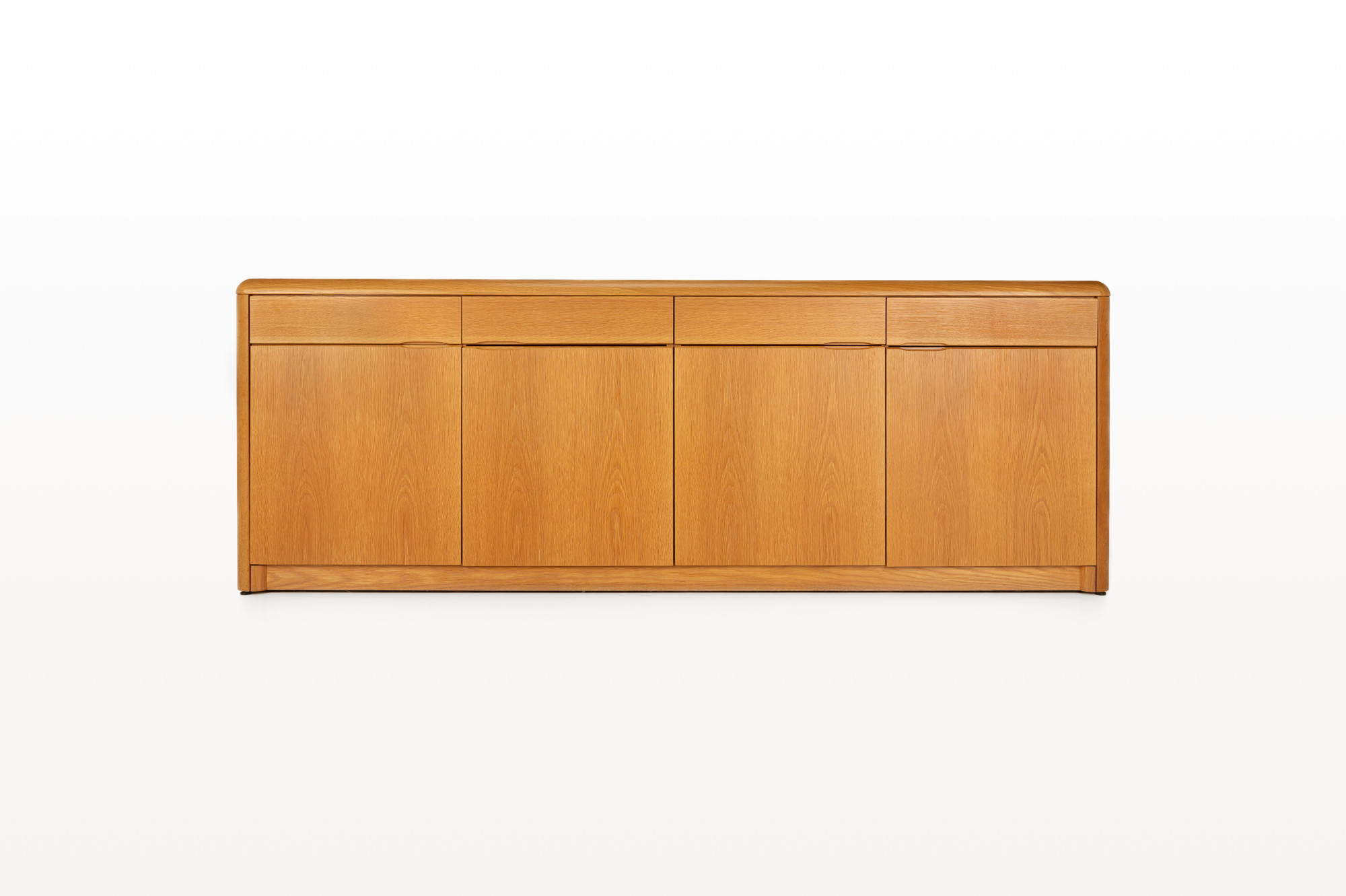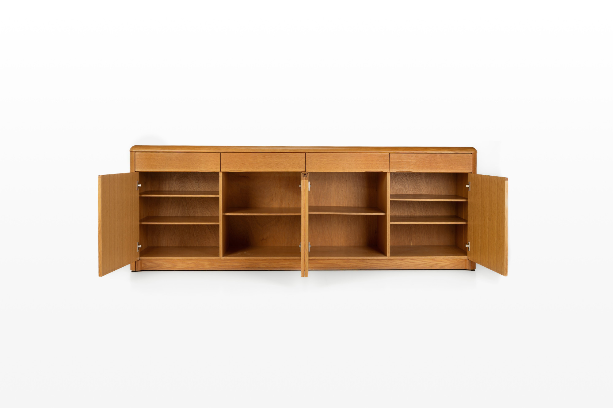 Belgian vintage sideboard in oak with natural varnish, produced by Van Den Berghe Pauvers as model 'Kopenhagen'. This sideboard has four hinged doors, six wooden shelves and four drawers. It is still in very good condition. The original proof of purchase is still present.