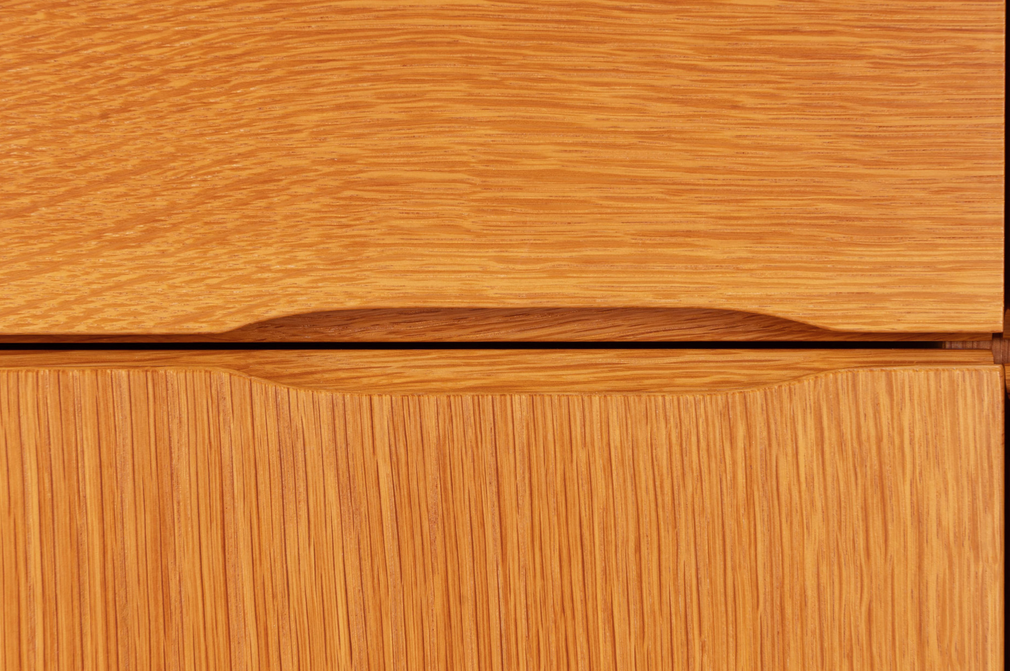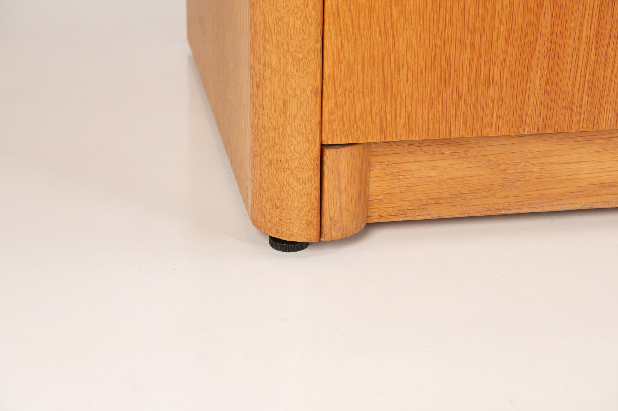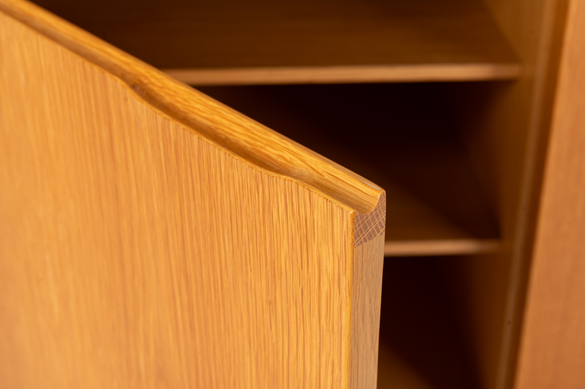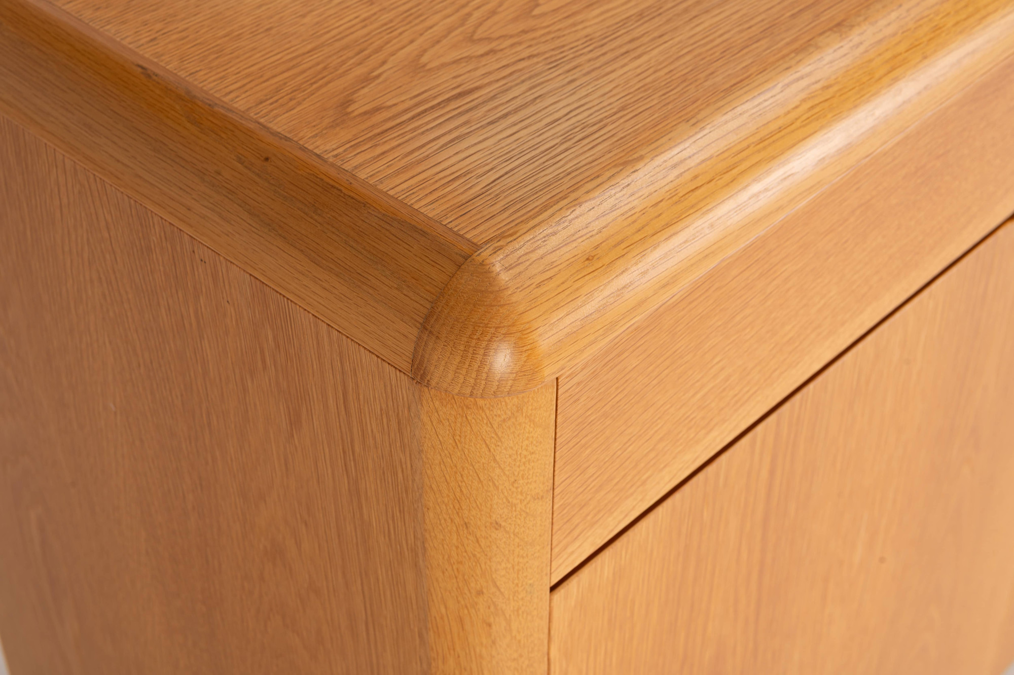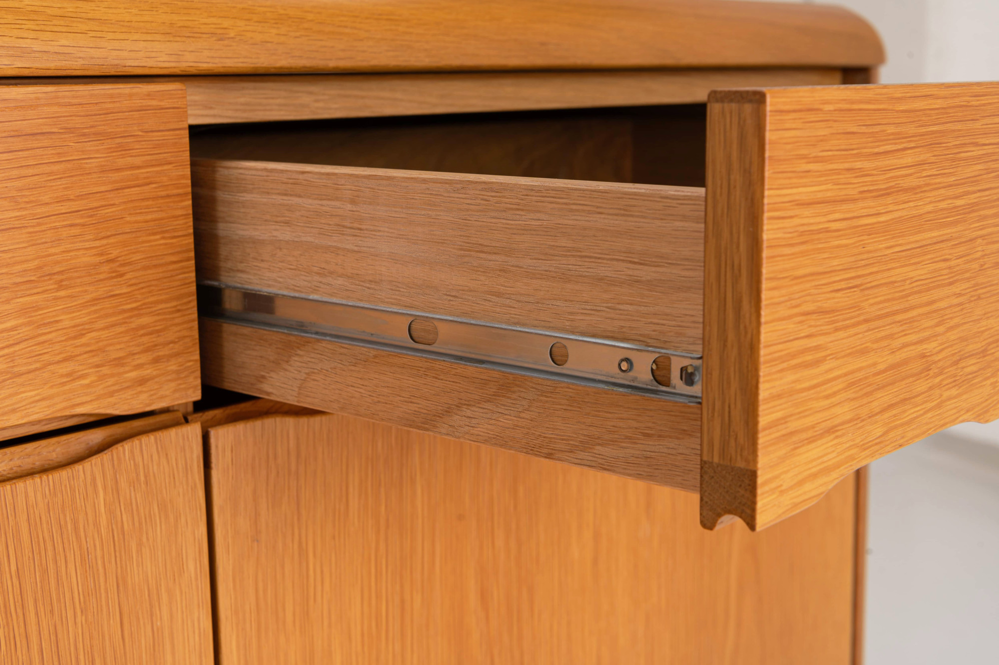 Belgian vintage sideboard in oak with natural varnish, produced by Van Den Berghe Pauvers as model 'Kopenhagen'. This sideboard has four hinged doors, six wooden shelves and four drawers. It is still in very good condition. The original proof of purchase is still present.
