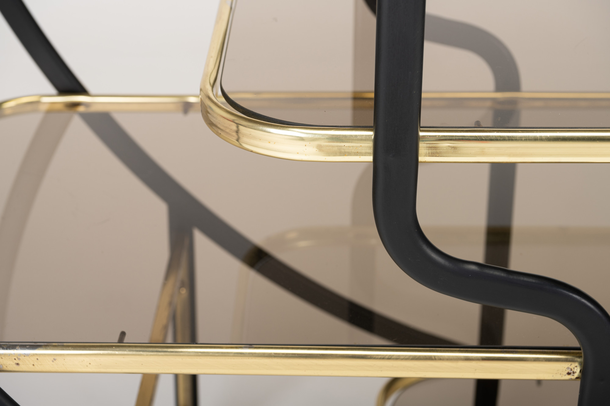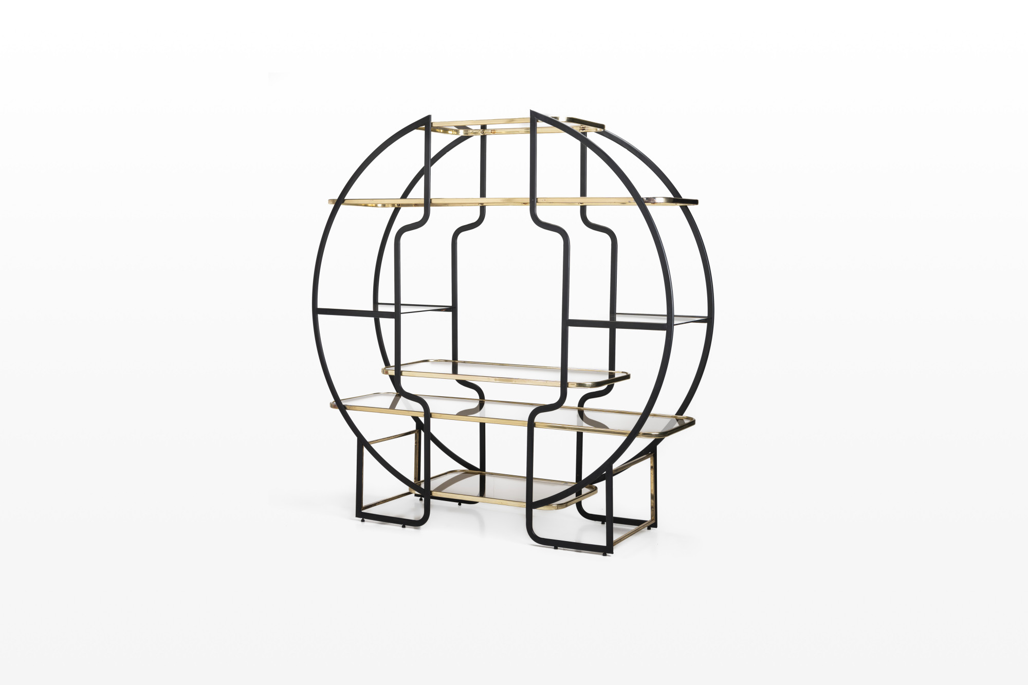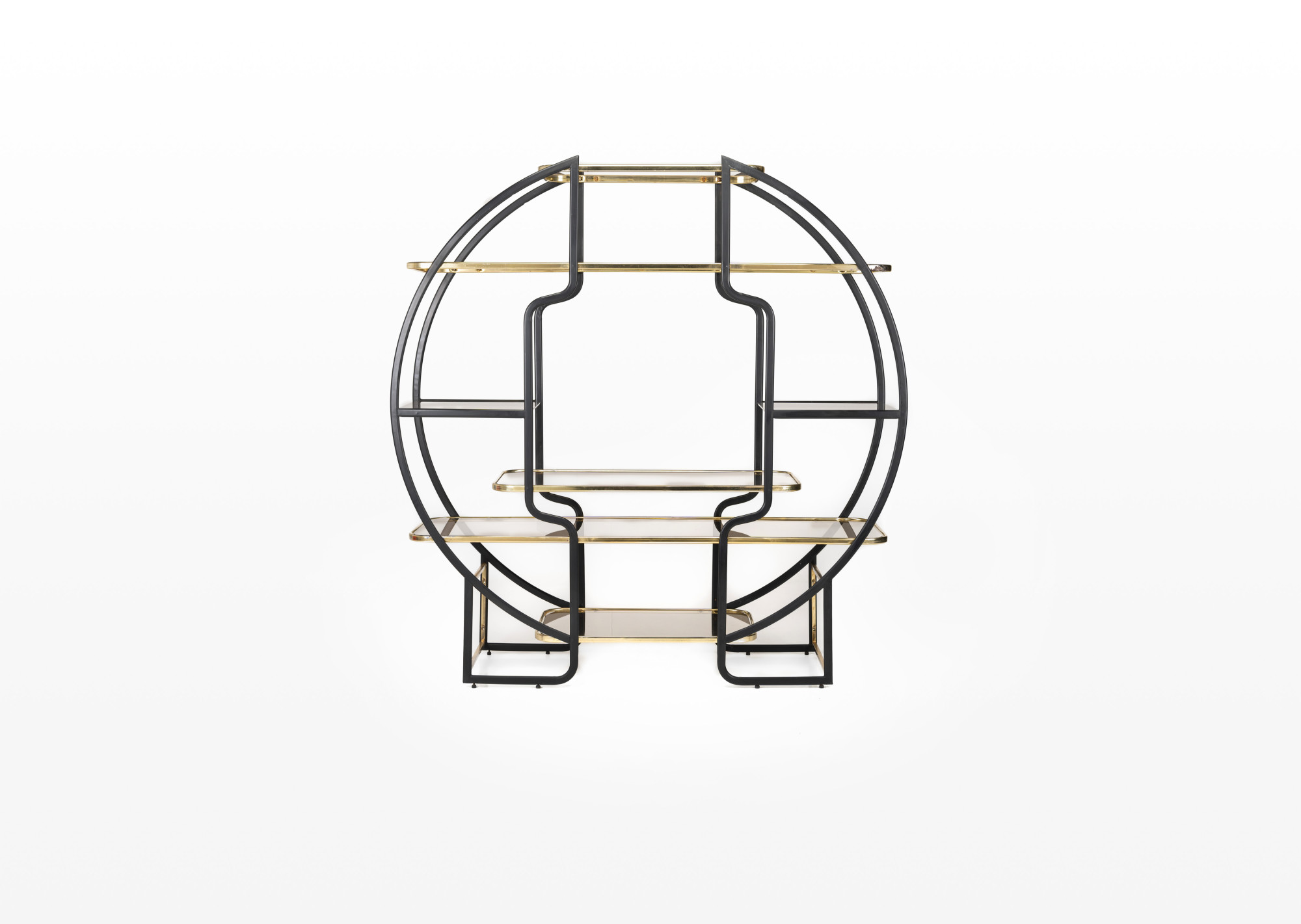 Beautiful Hollywood regency style round étagère or room divider with seven smoked glass shelves in a frame of brass and black lacquered metal.