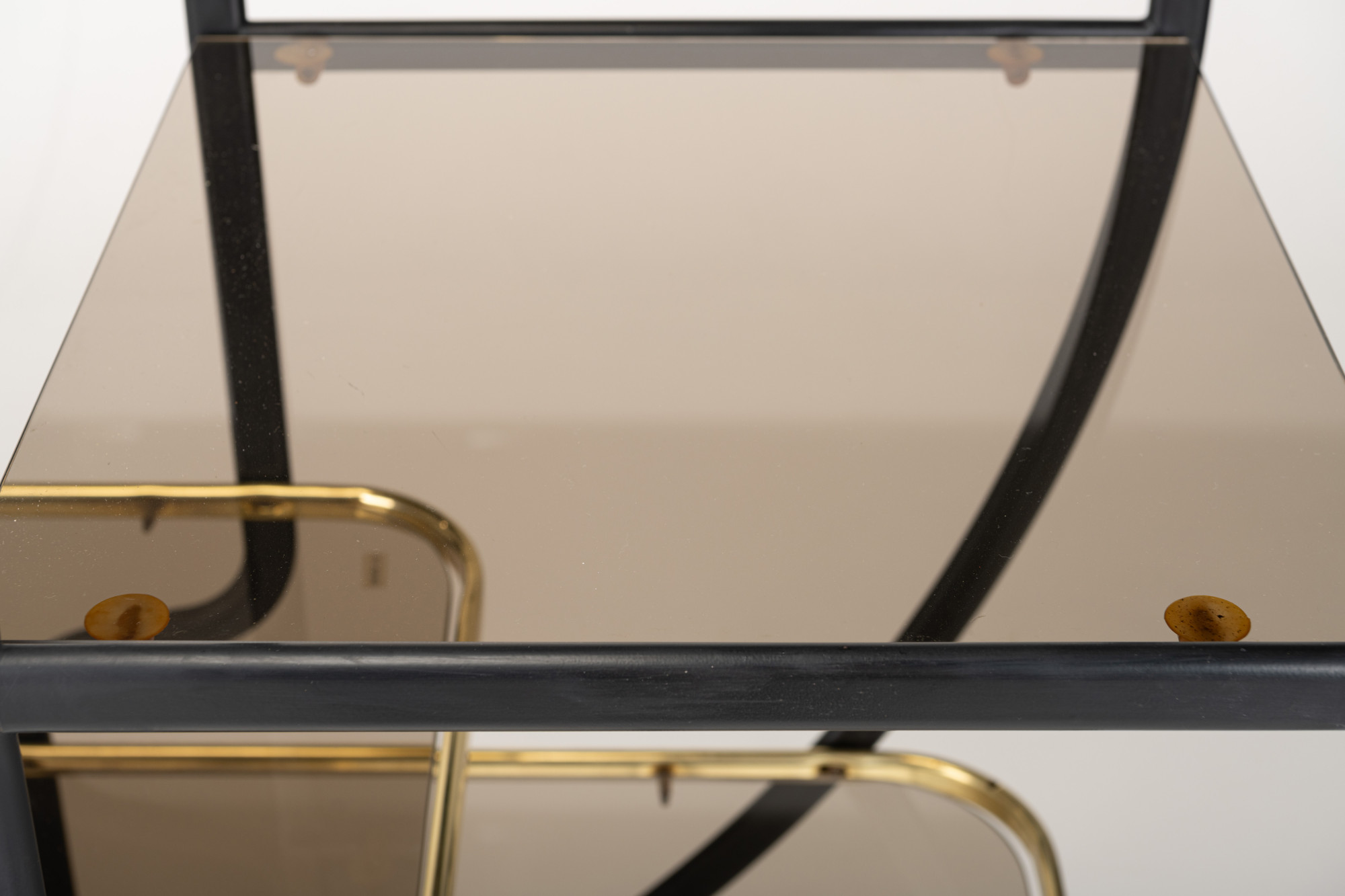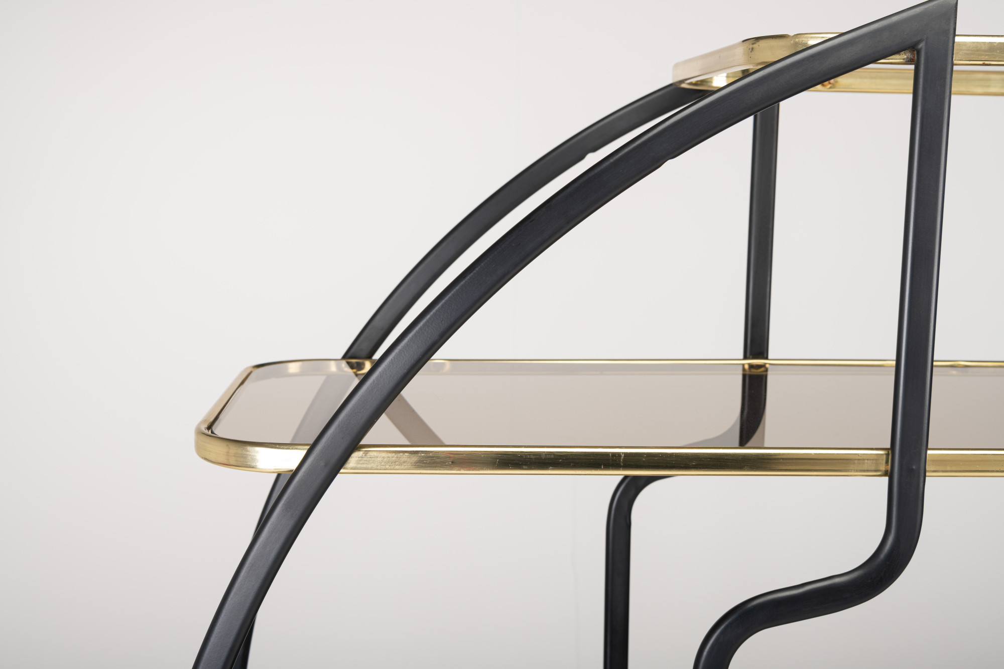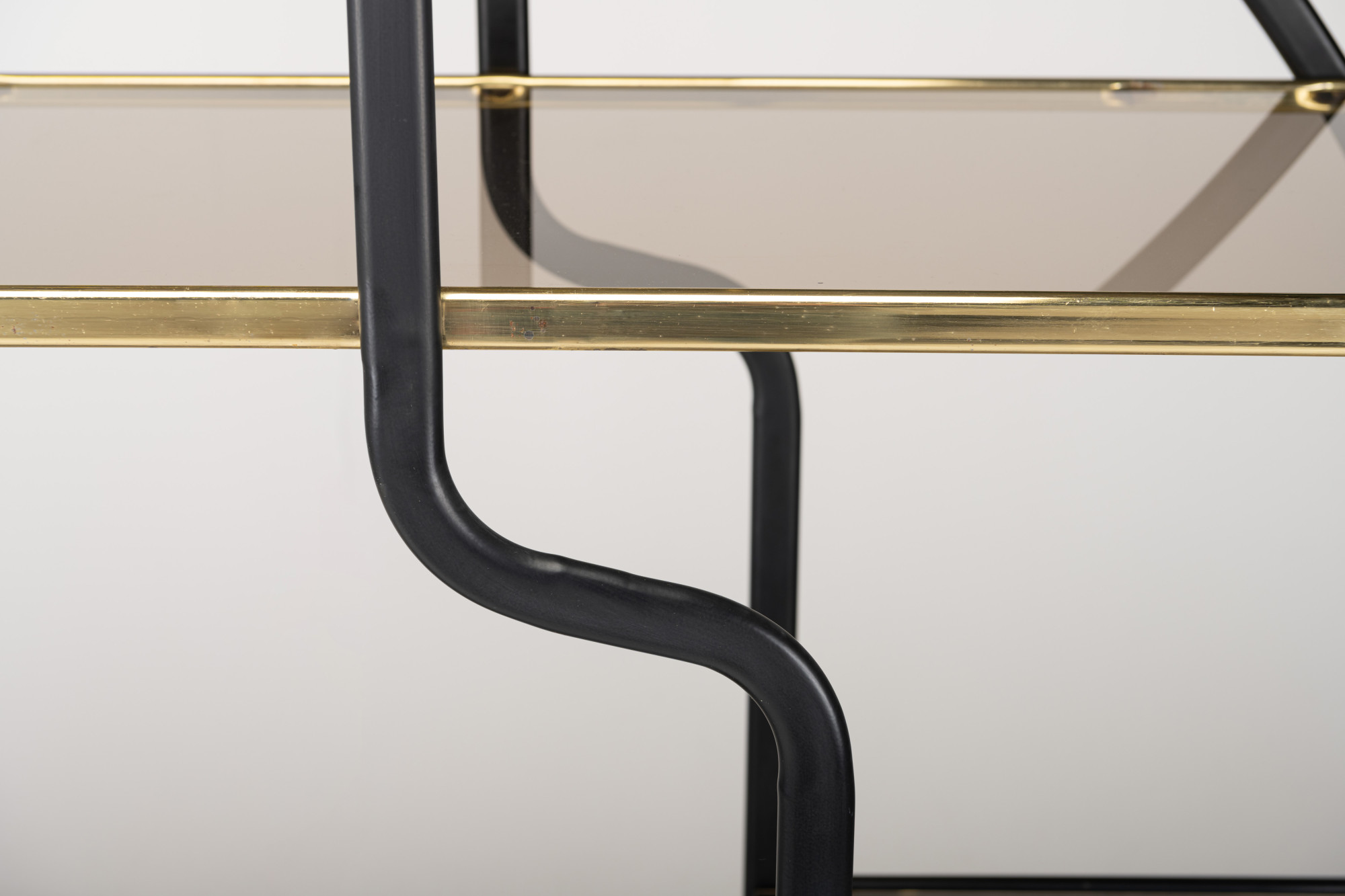Beautiful Hollywood regency style round étagère or room divider with seven smoked glass shelves in a frame of brass and black lacquered metal.