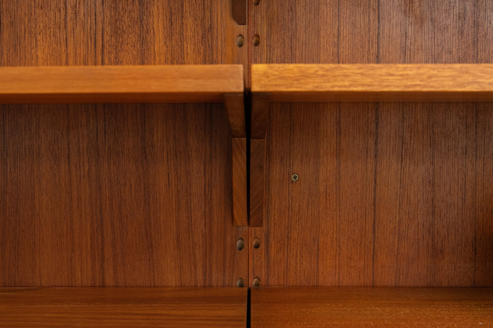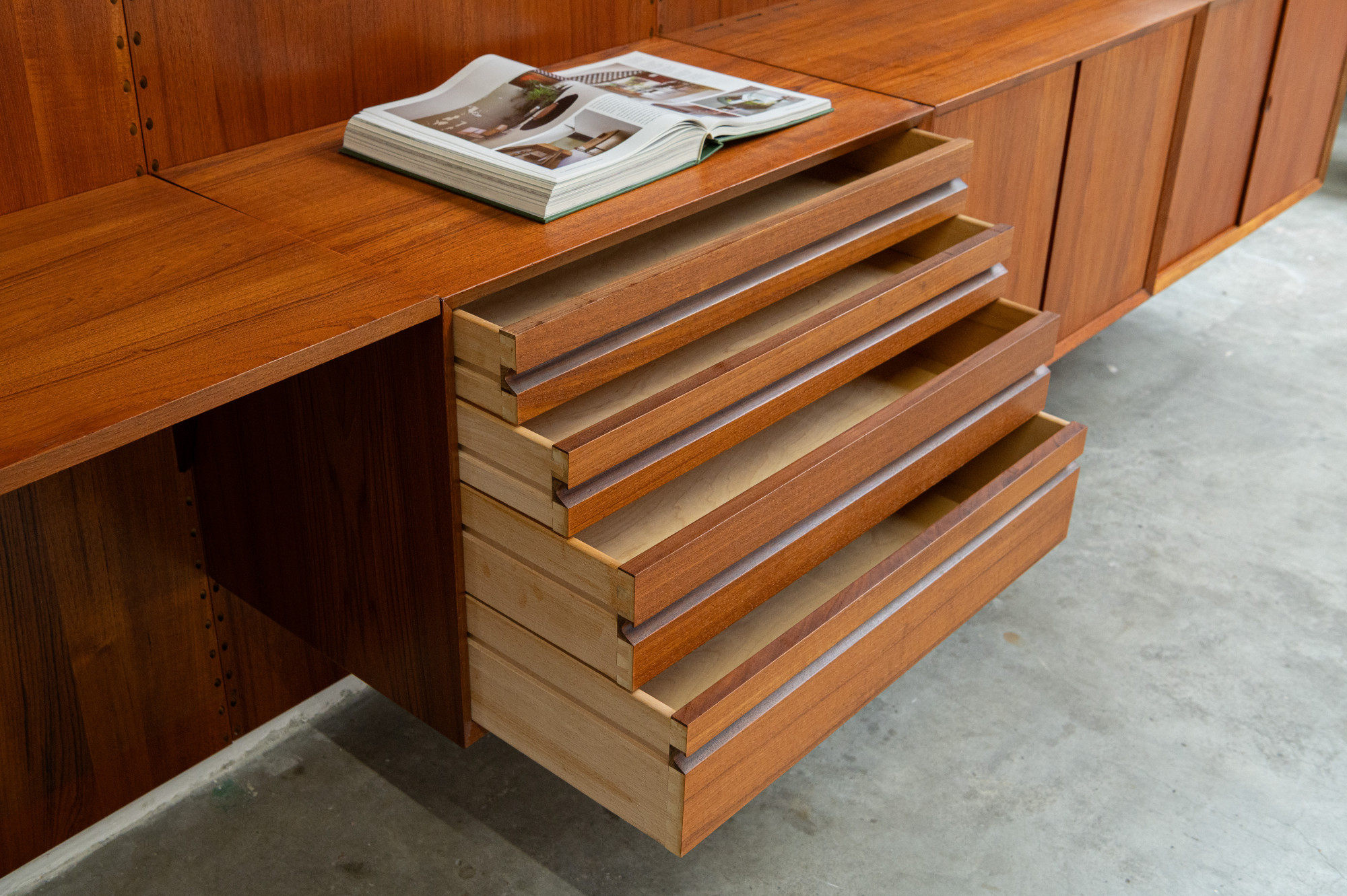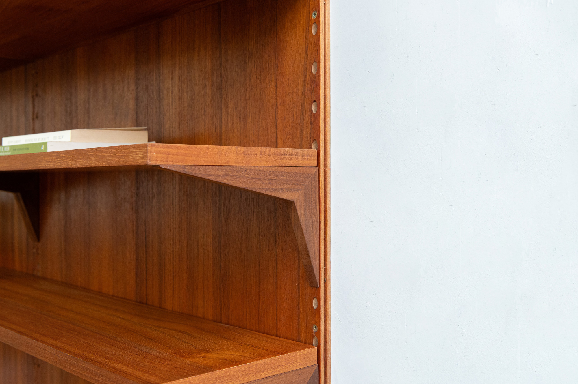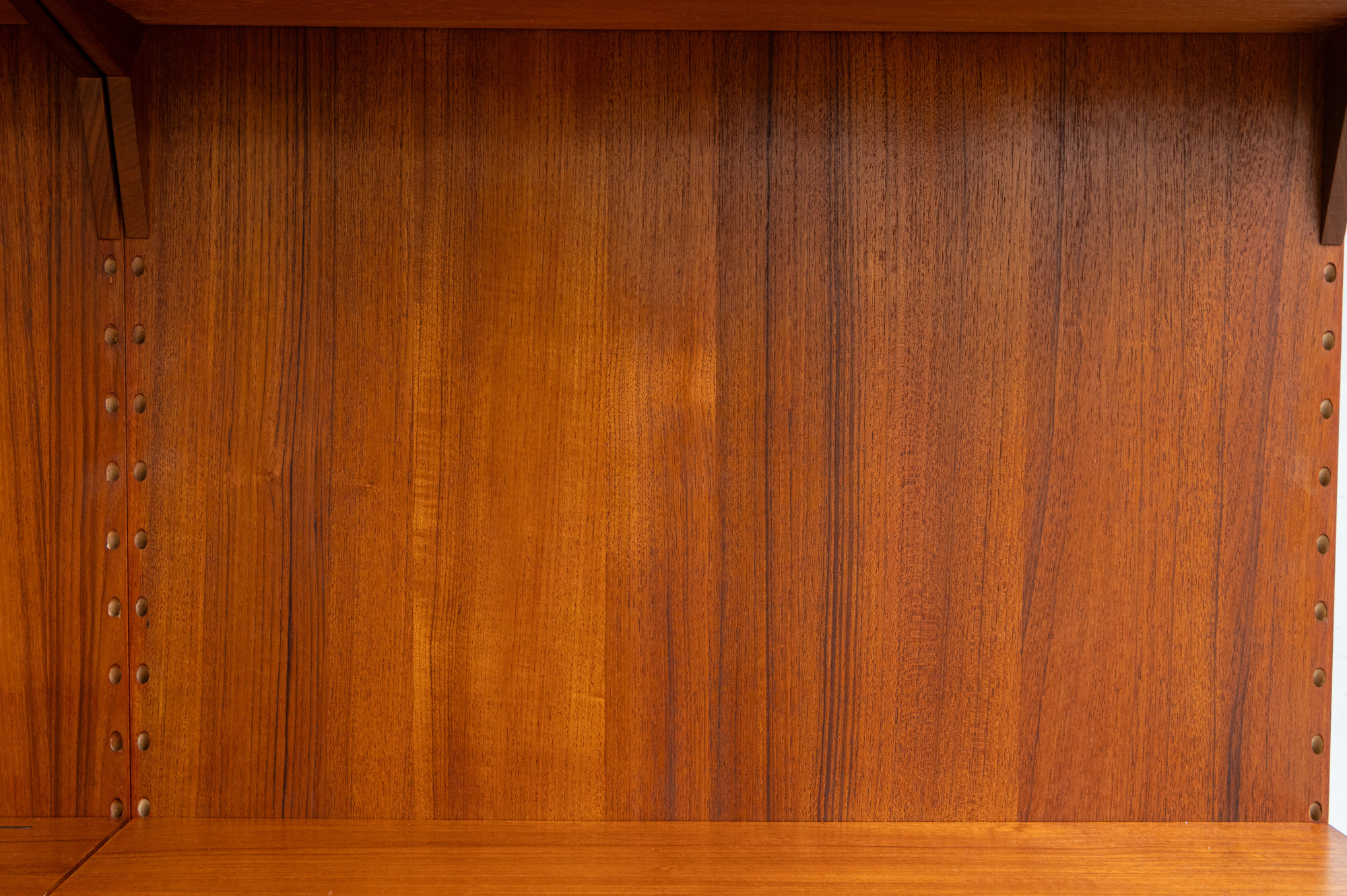 Danish modular wall unit by Poul Cadovius for Cado. This teak setup has one drawer cabinet, four storage cabinets, one desk shelf and twelve bookshelves. Always adaptable and further expandable.