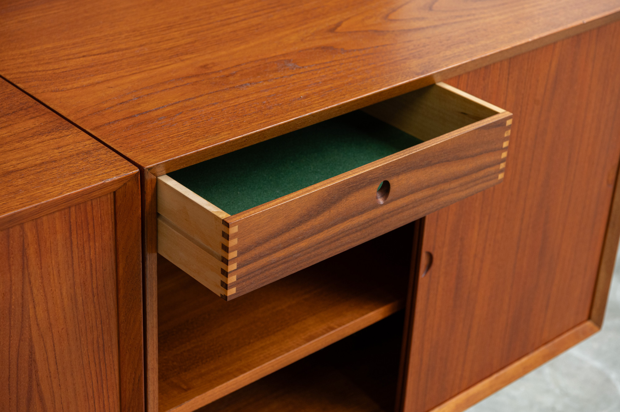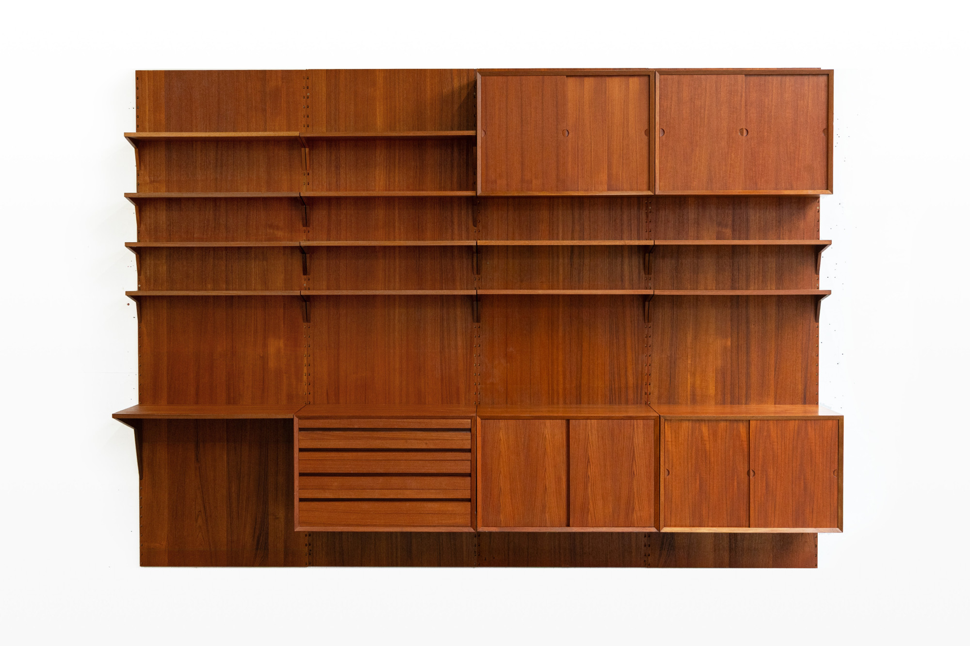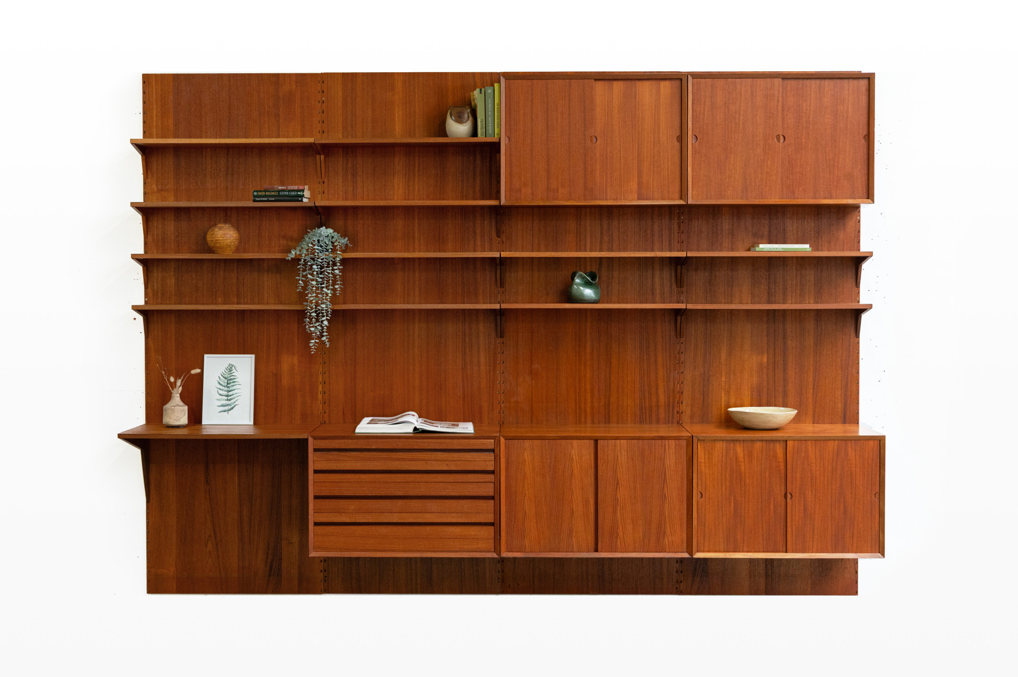 Danish modular wall unit by Poul Cadovius for Cado. This teak setup has one drawer cabinet, four storage cabinets, one desk shelf and twelve bookshelves. Always adaptable and further expandable.