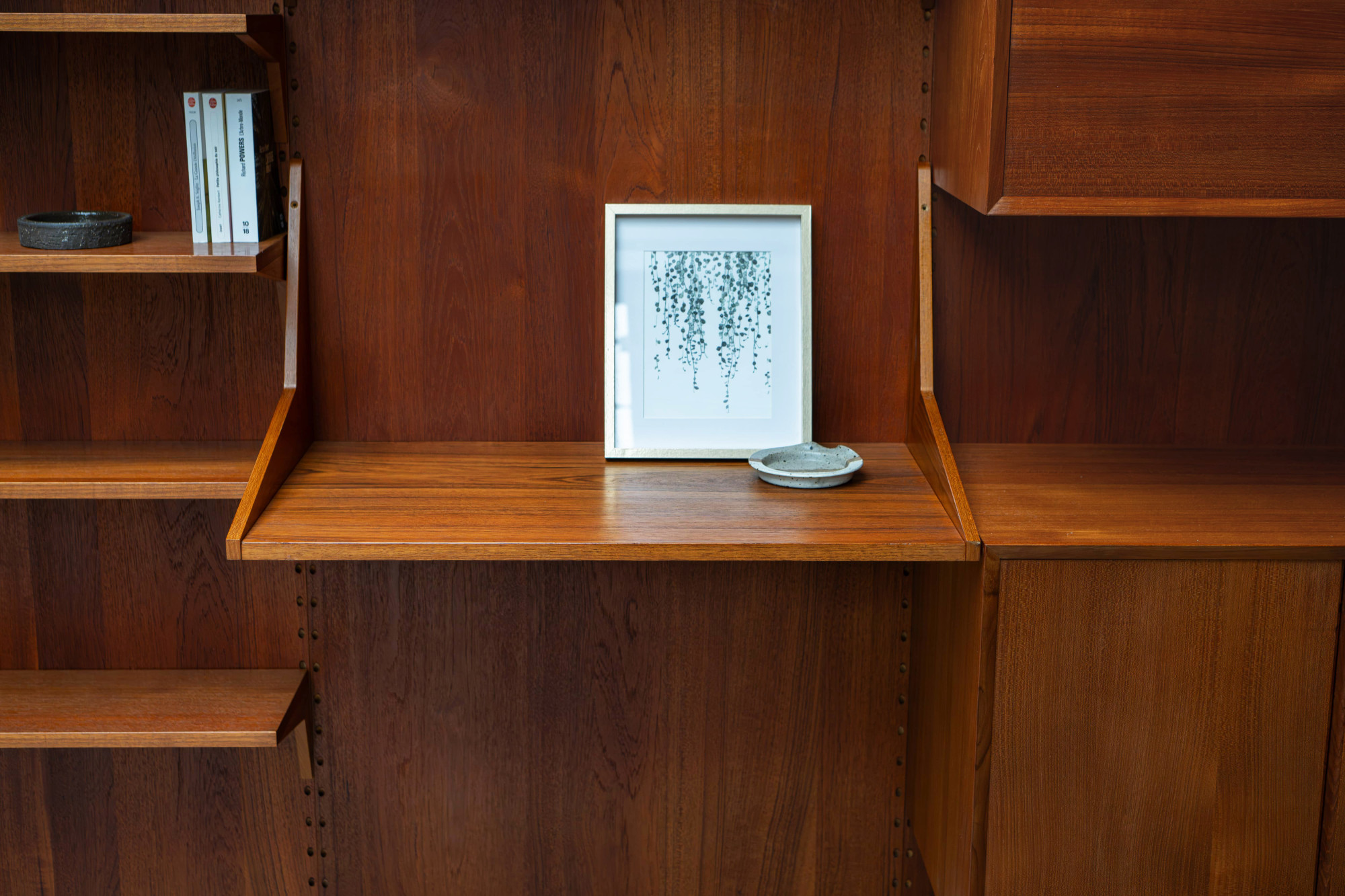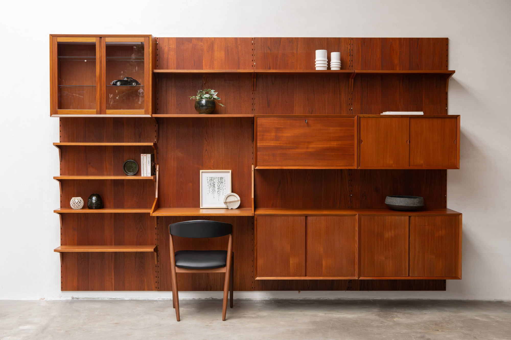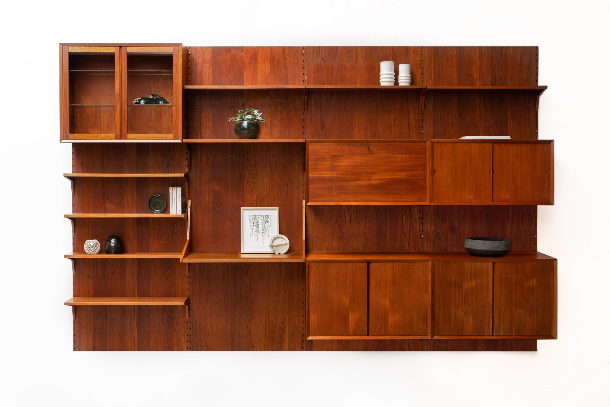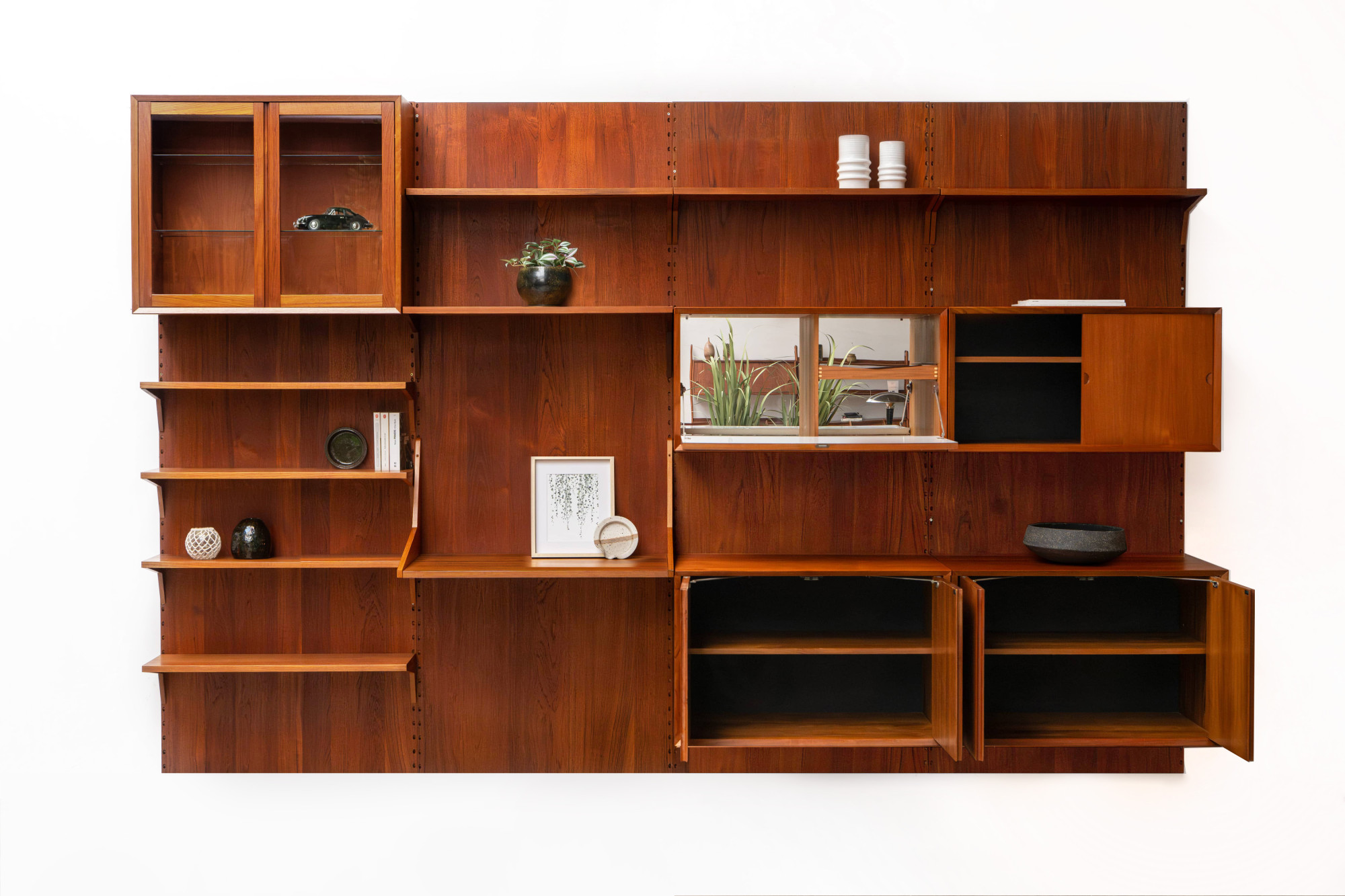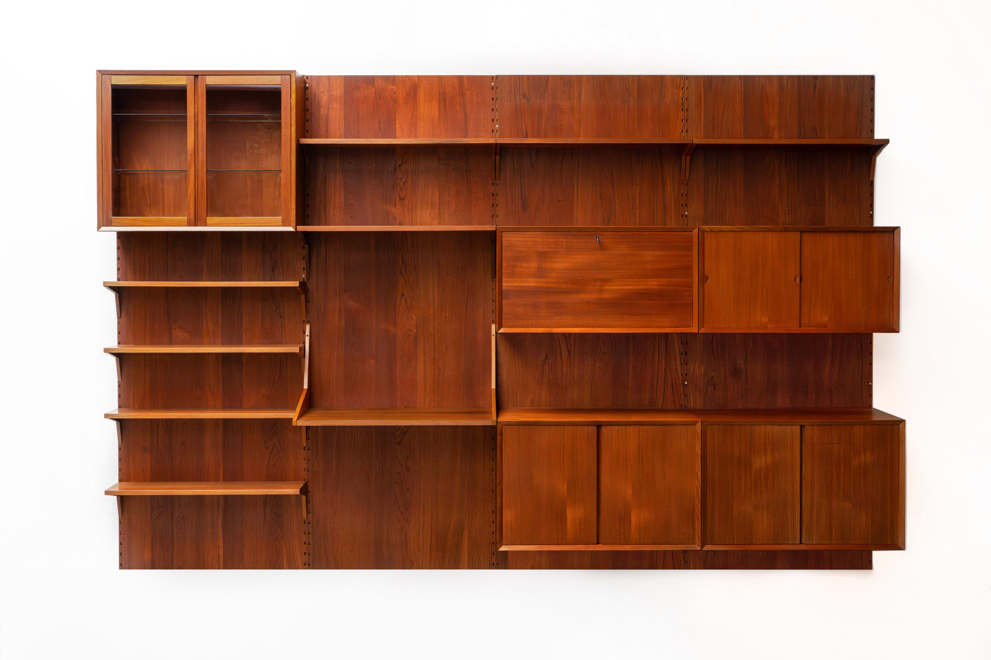 Danish modular wall unit by Poul Cadovius for Cado. This teak setup has three storage cabinets, one display cabinet, one bar cabinet, one desk shelf and eight bookshelves. Always adaptable and further expandable.