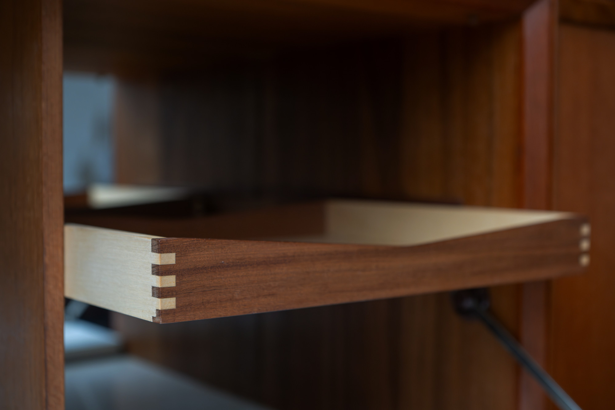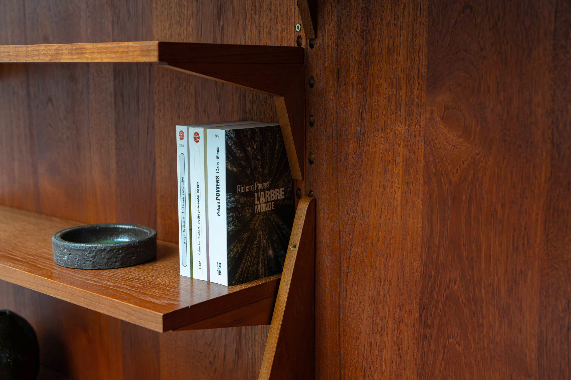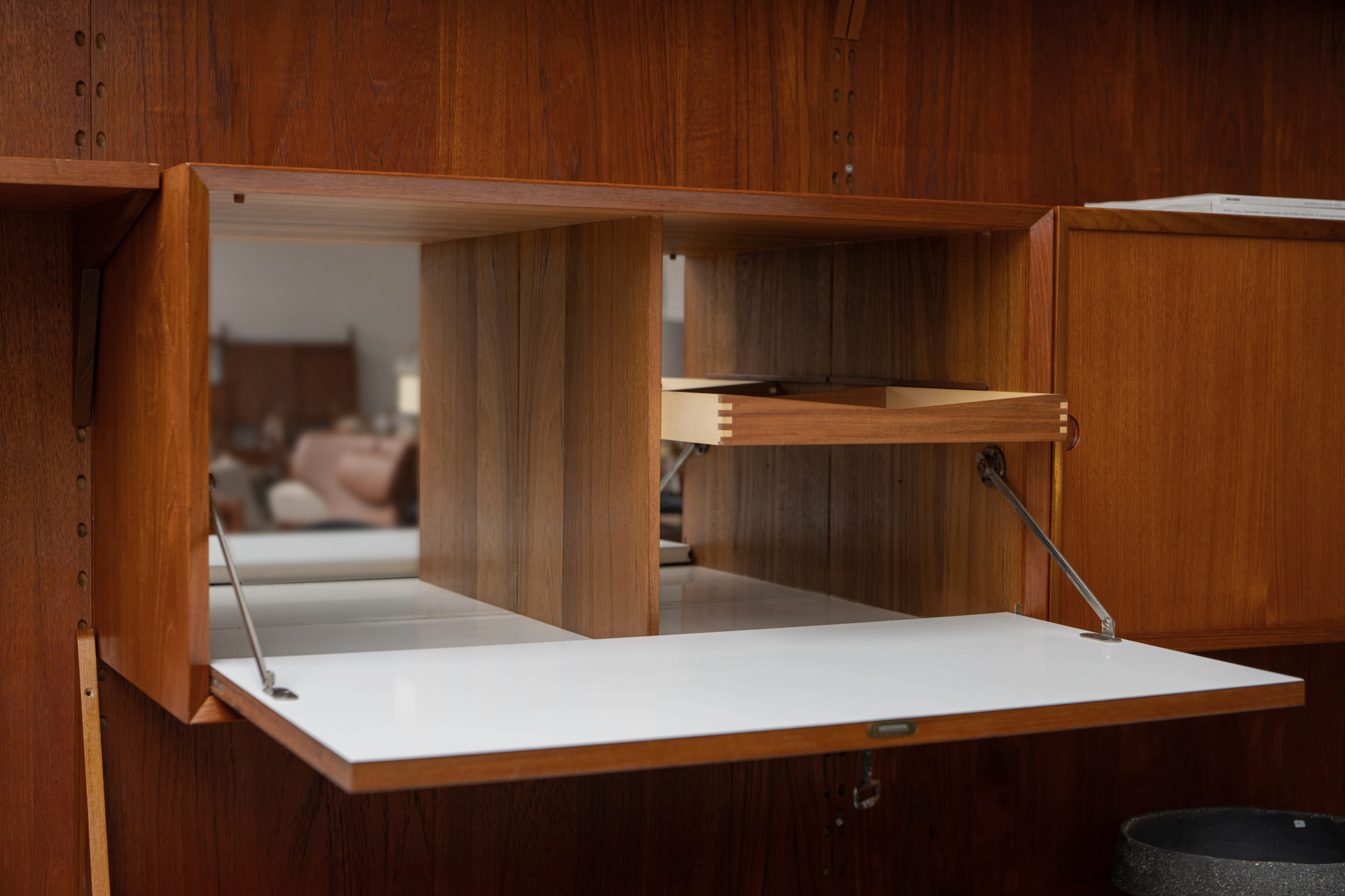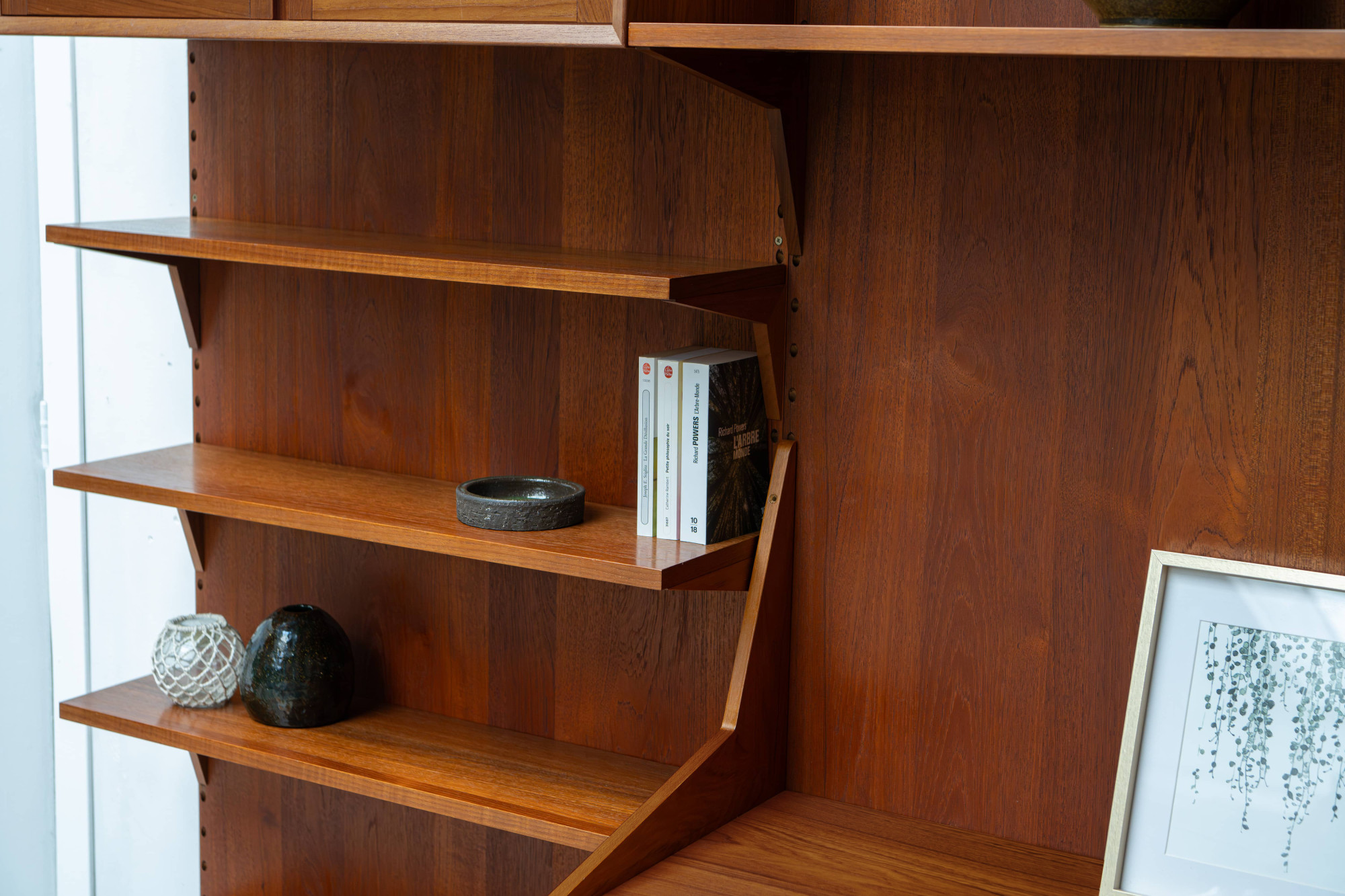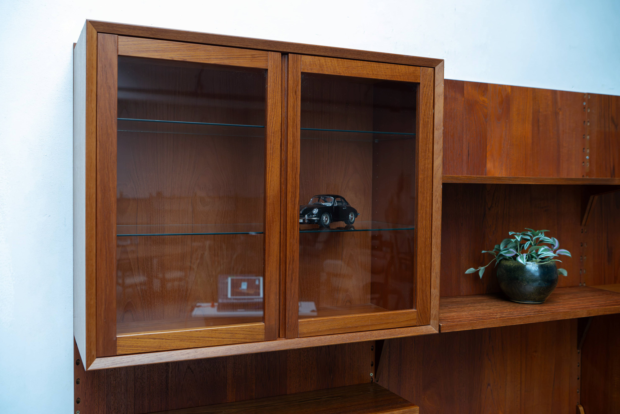 Danish modular wall unit by Poul Cadovius for Cado. This teak setup has three storage cabinets, one display cabinet, one bar cabinet, one desk shelf and eight bookshelves. Always adaptable and further expandable.