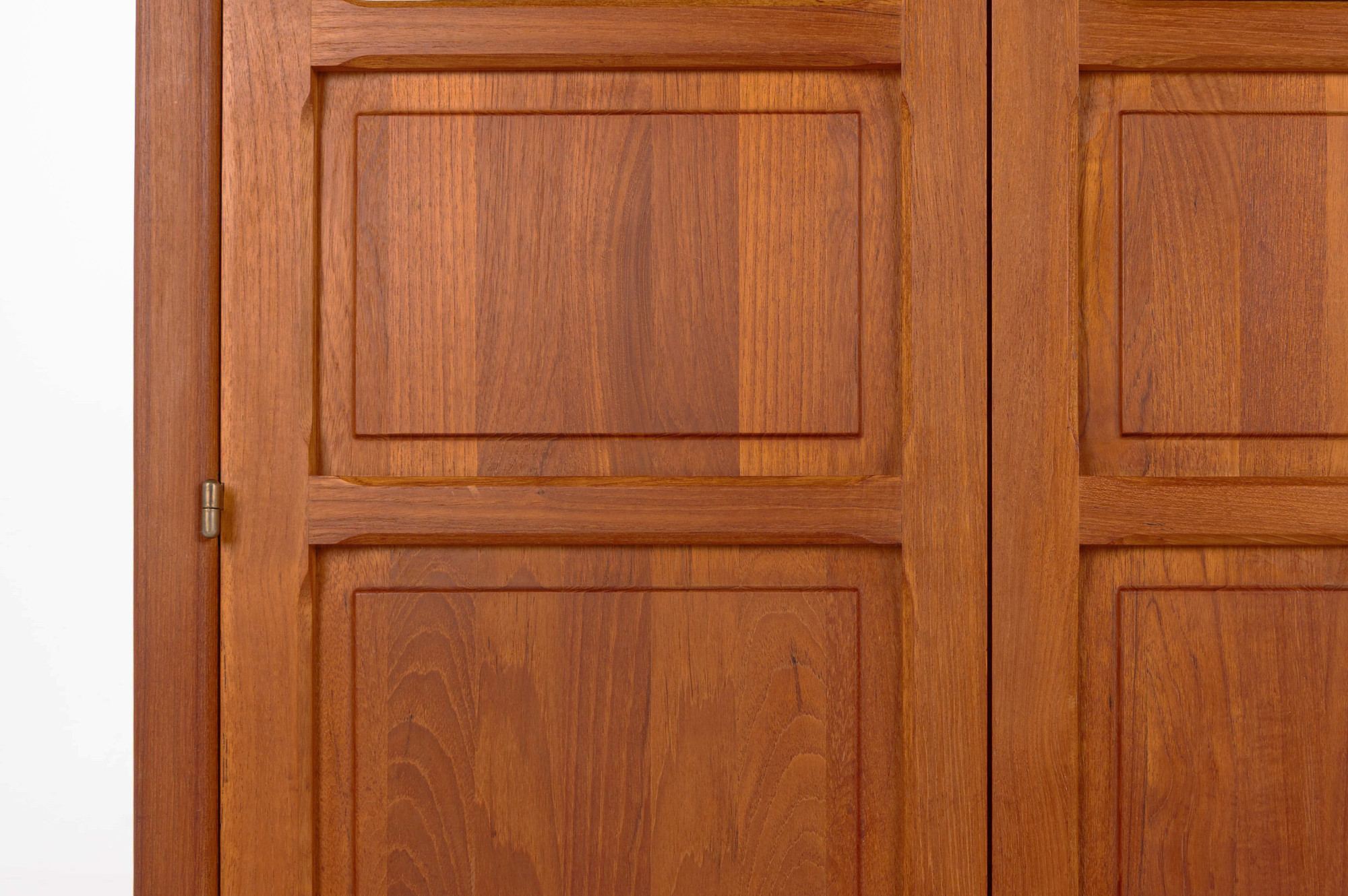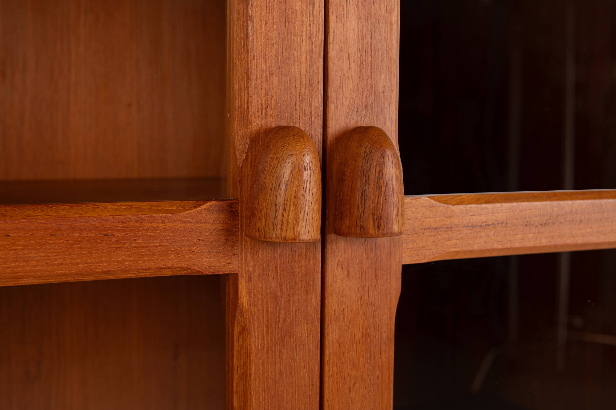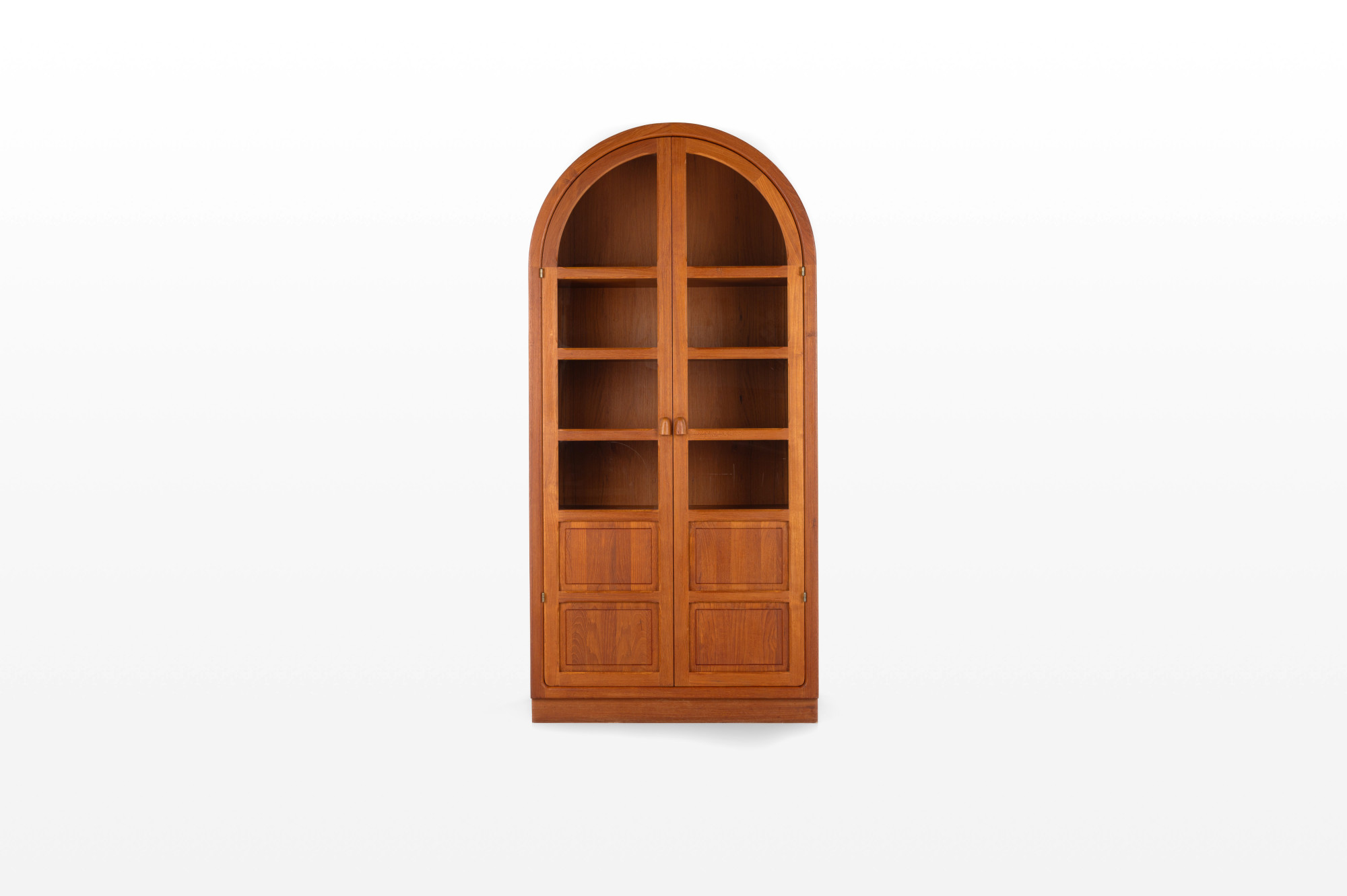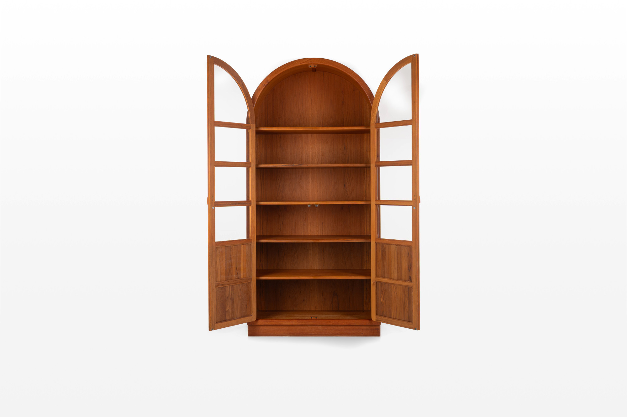 Impressive Danish vintage display cabinet in teak. The cabinet is rounded at the top, has two doors and five shelves and two cute handles. The cabinet is in excellent condition.