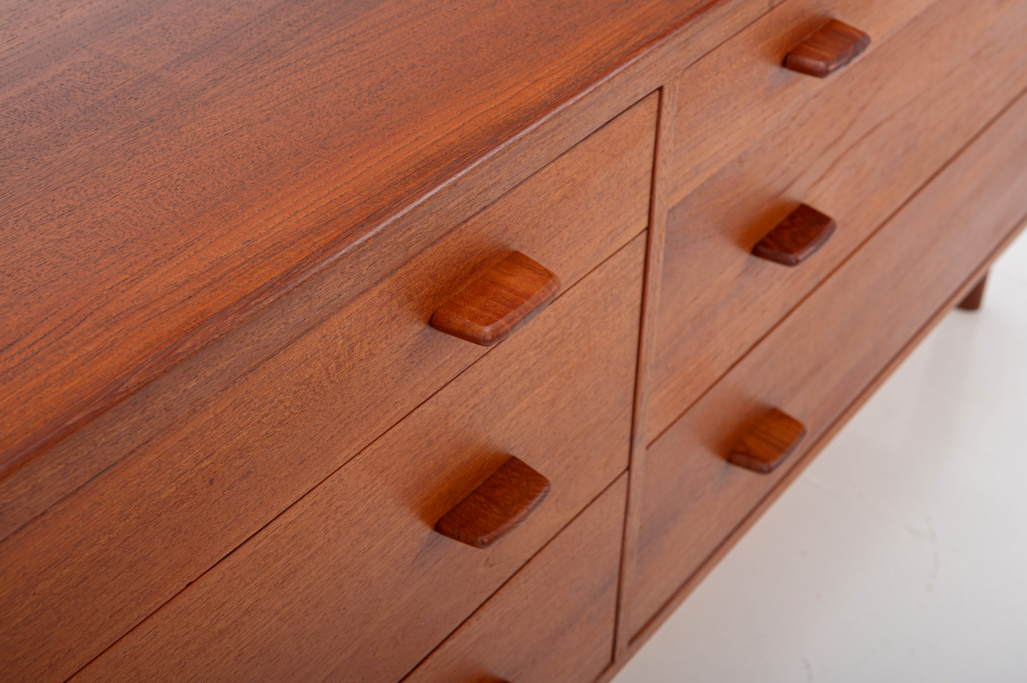 Beautiful double sideboard in teak, designed by Hans J. Wegner in the 1950s and produced by Ry Møbler. This beautifully crafted sideboard features elegant handles, six drawers, two sliding doors and a lot of storage space with adjustable shelves. This piece is marked by the producer.