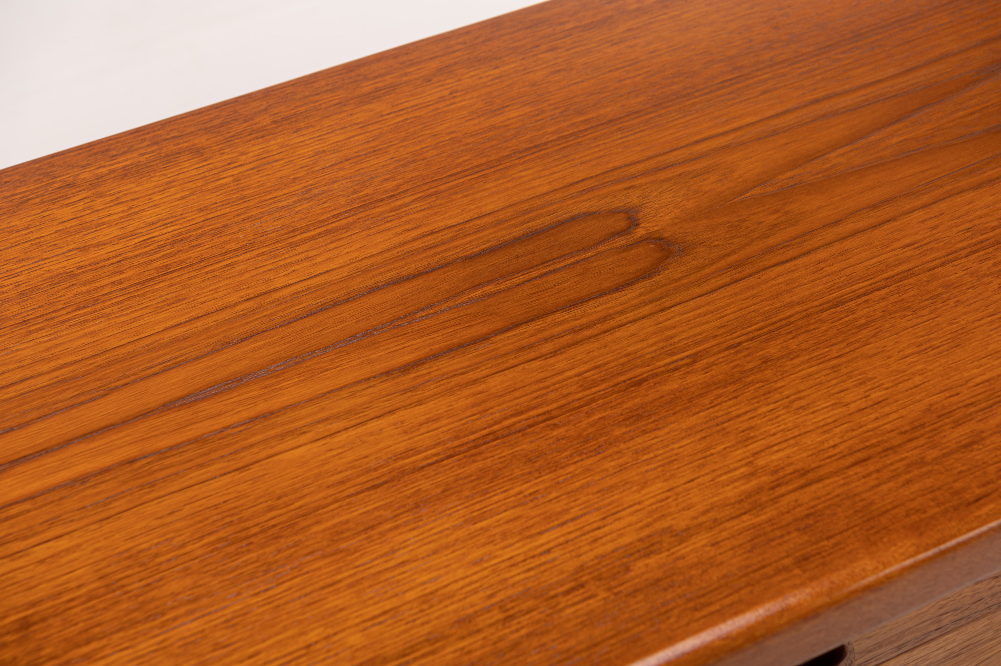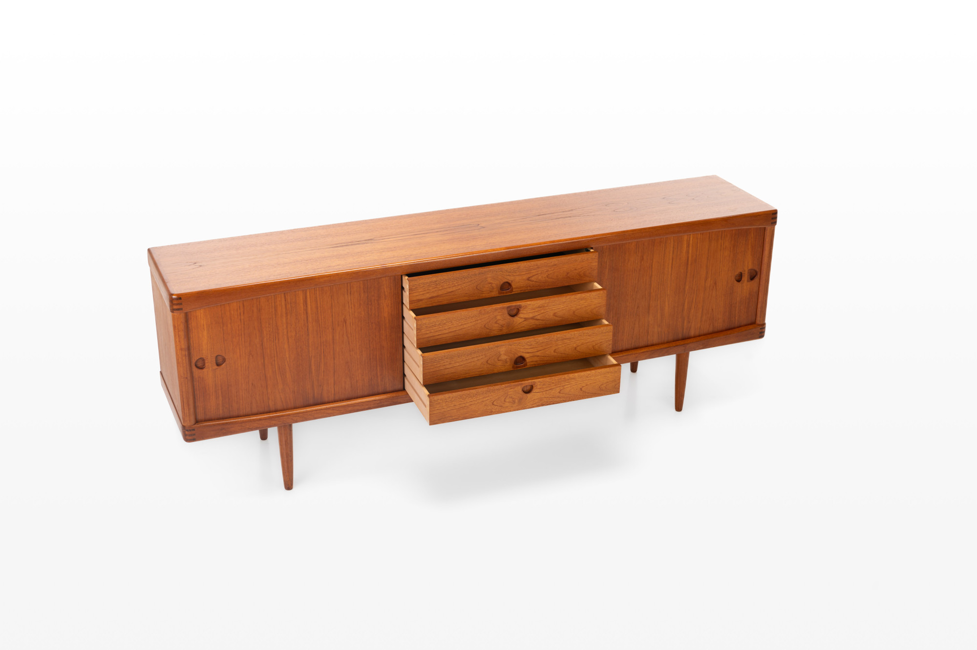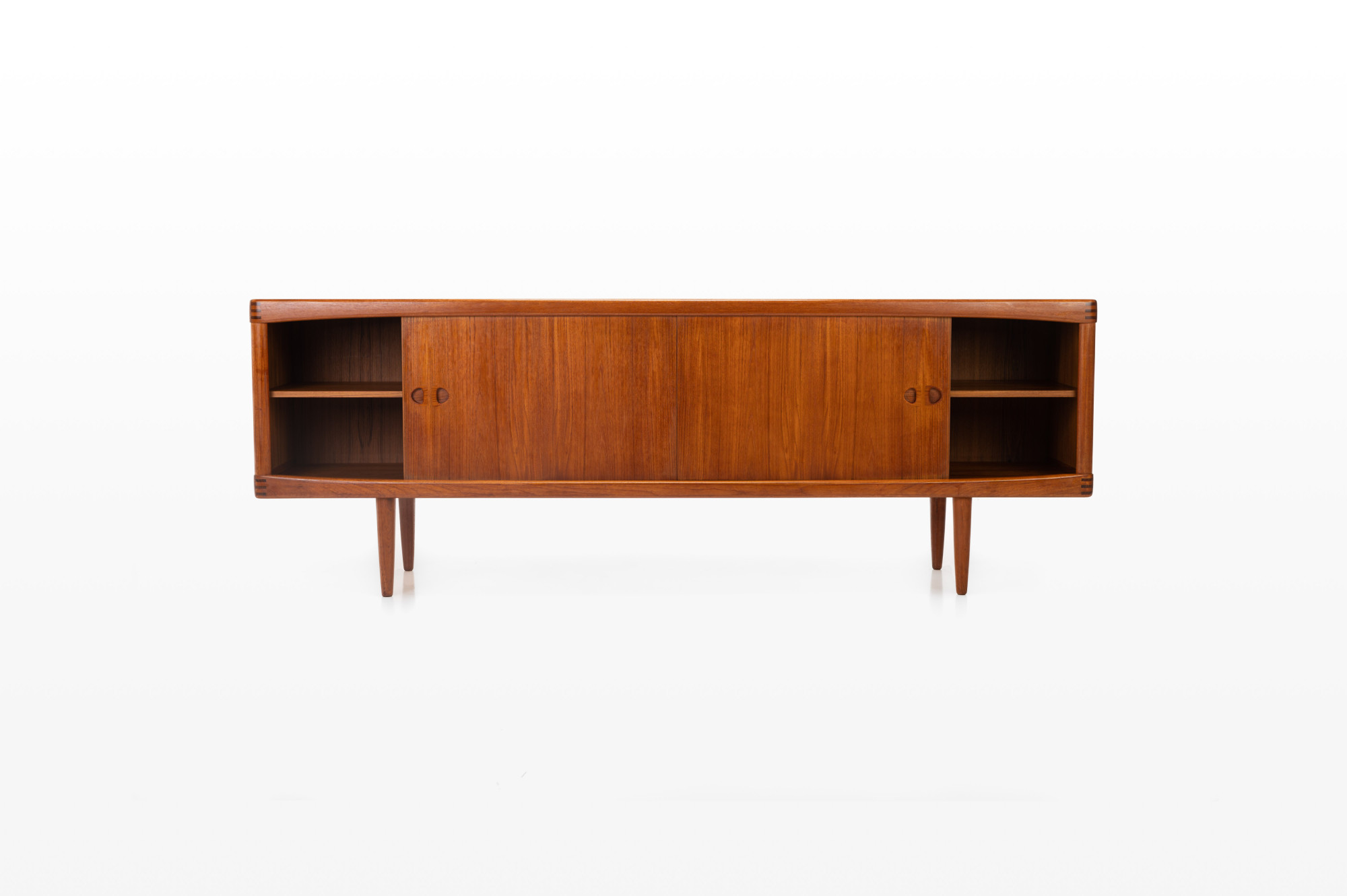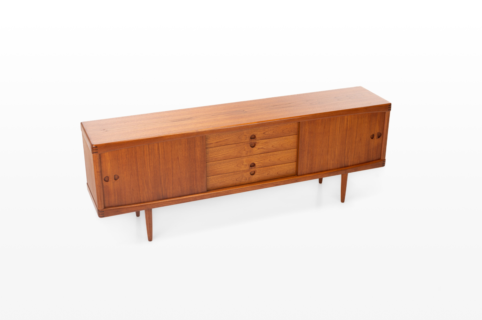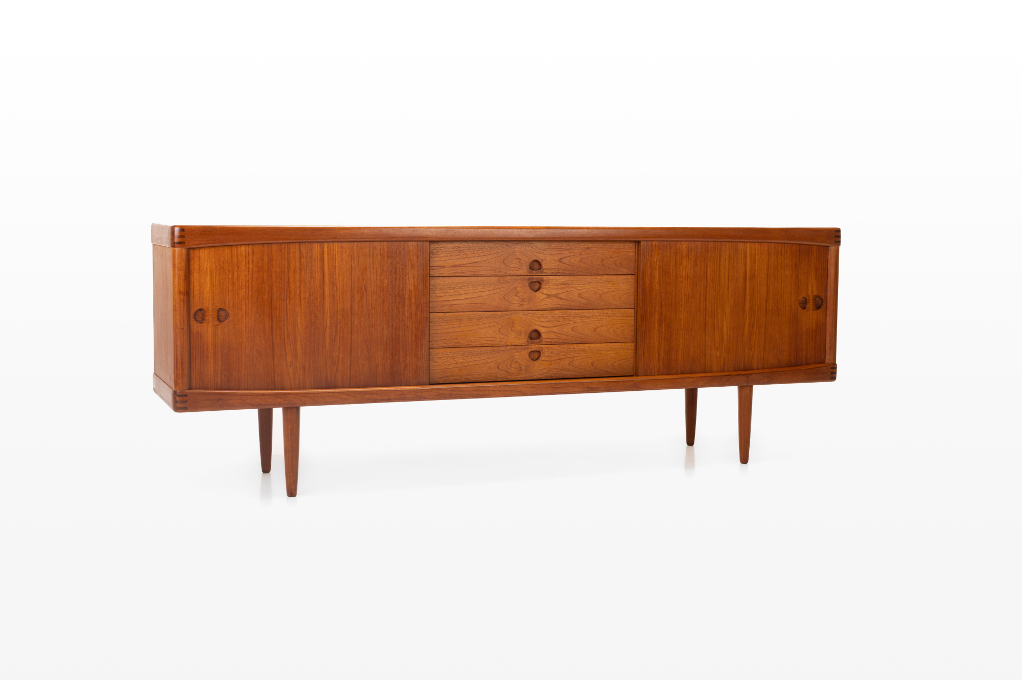 This sideboard was designed by Henry W. Klein for Bramin, Denmark 1960s. There are two sliding doors, four drawers and shelves. The sideboard is of very high quality and in very good condition. Finished in teak.