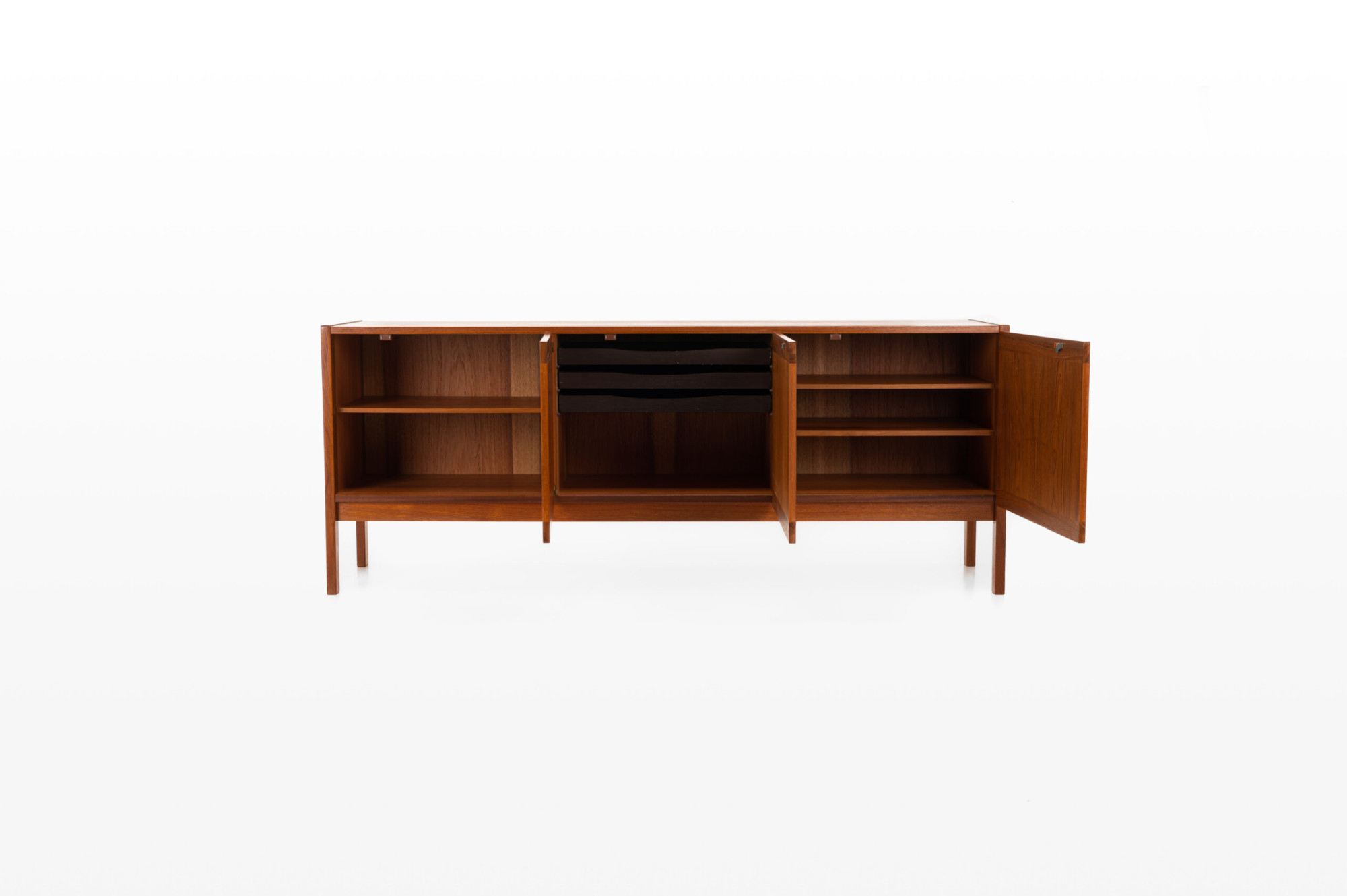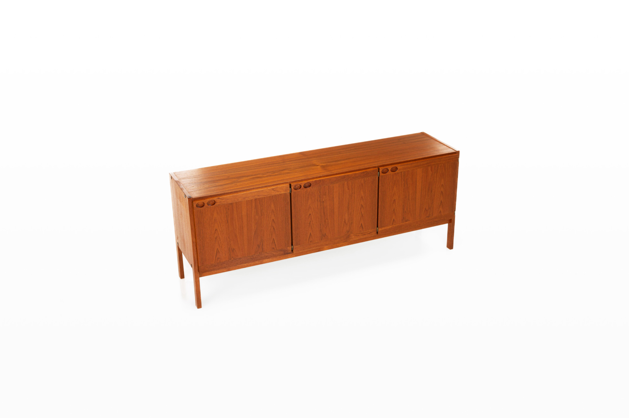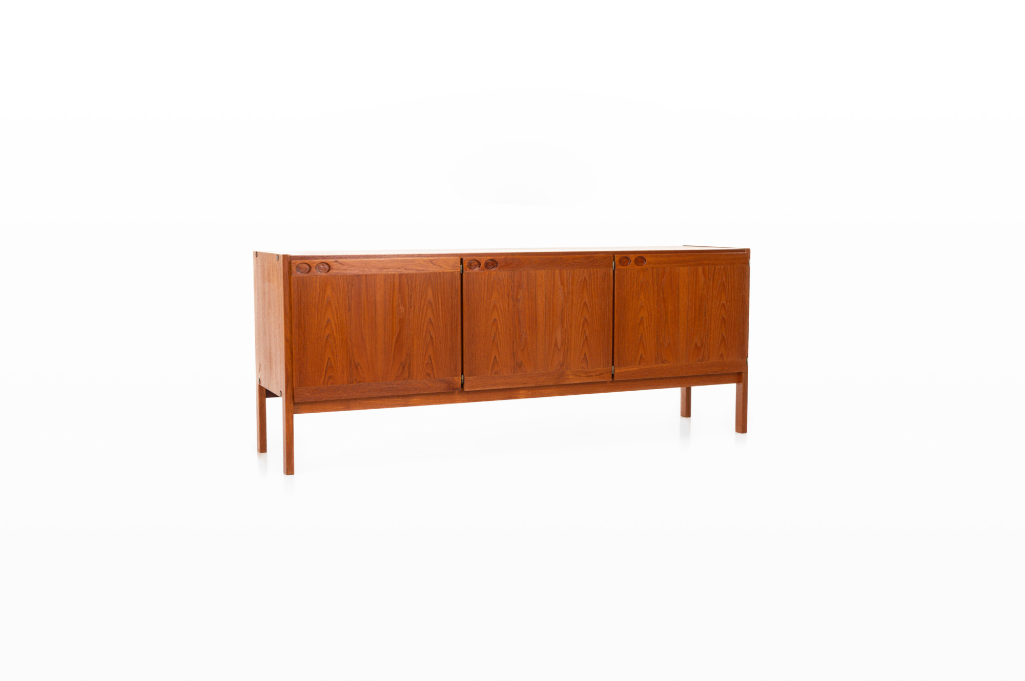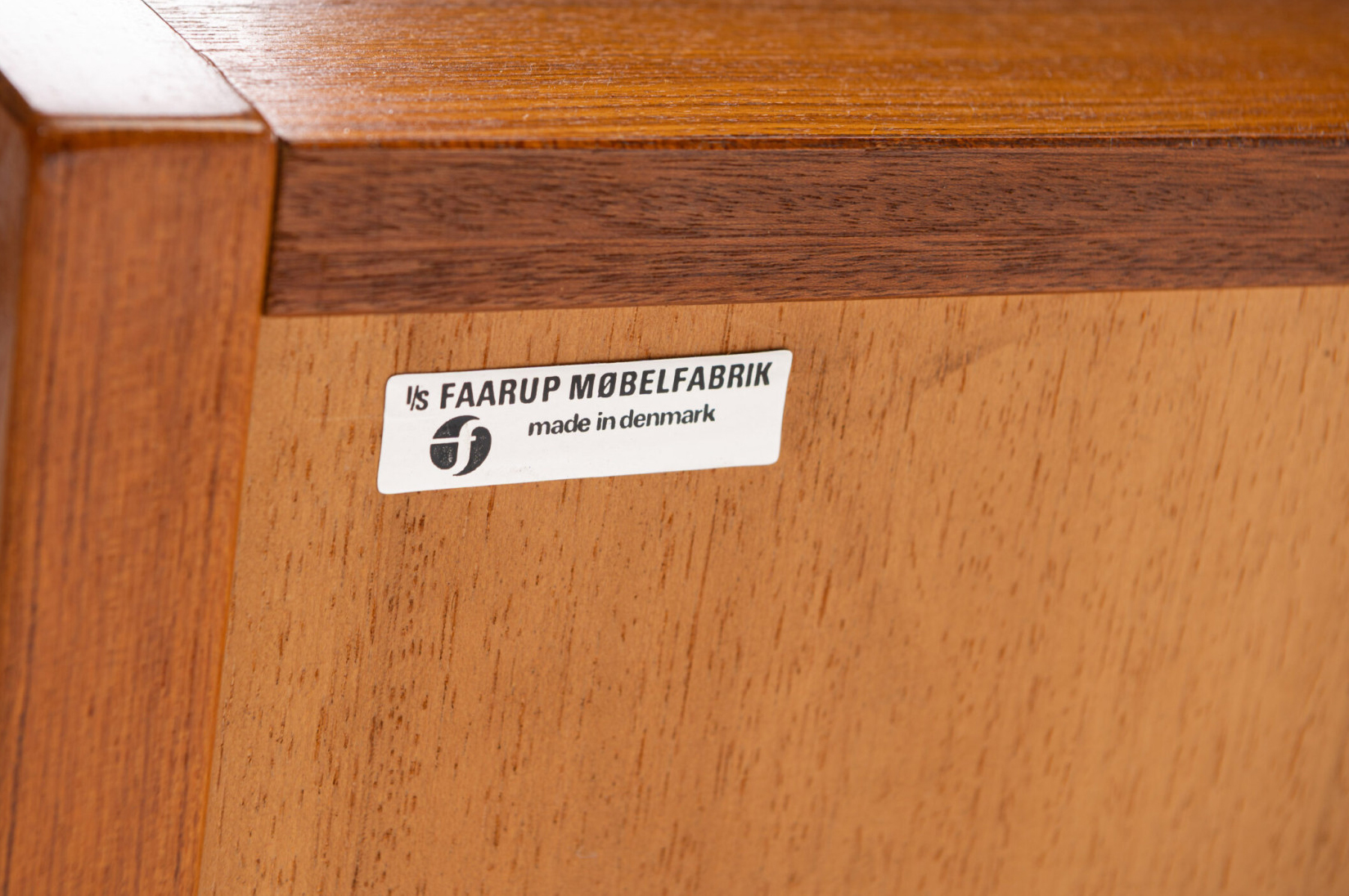 Vintage sideboard in teak designed by Ib Kofod Larsen and produced by Faarup Møbelfabrik in Denmark in the 1960s. The sideboard has three doors, three inner drawers and plenty of storage space. The sticker of the producer is still present.