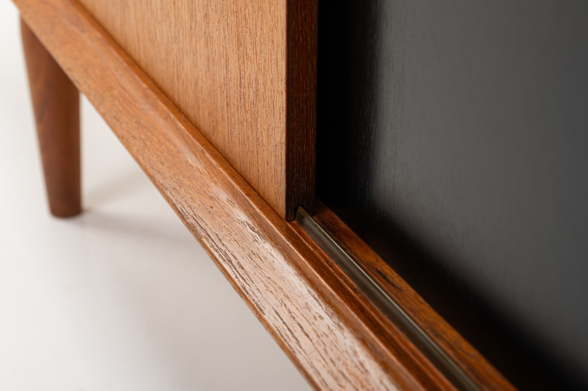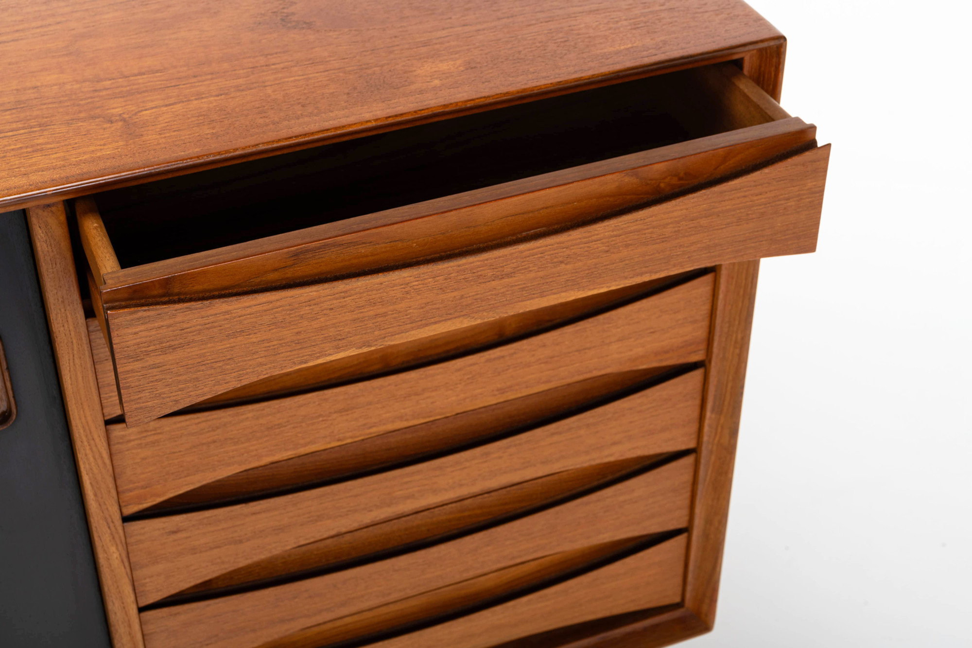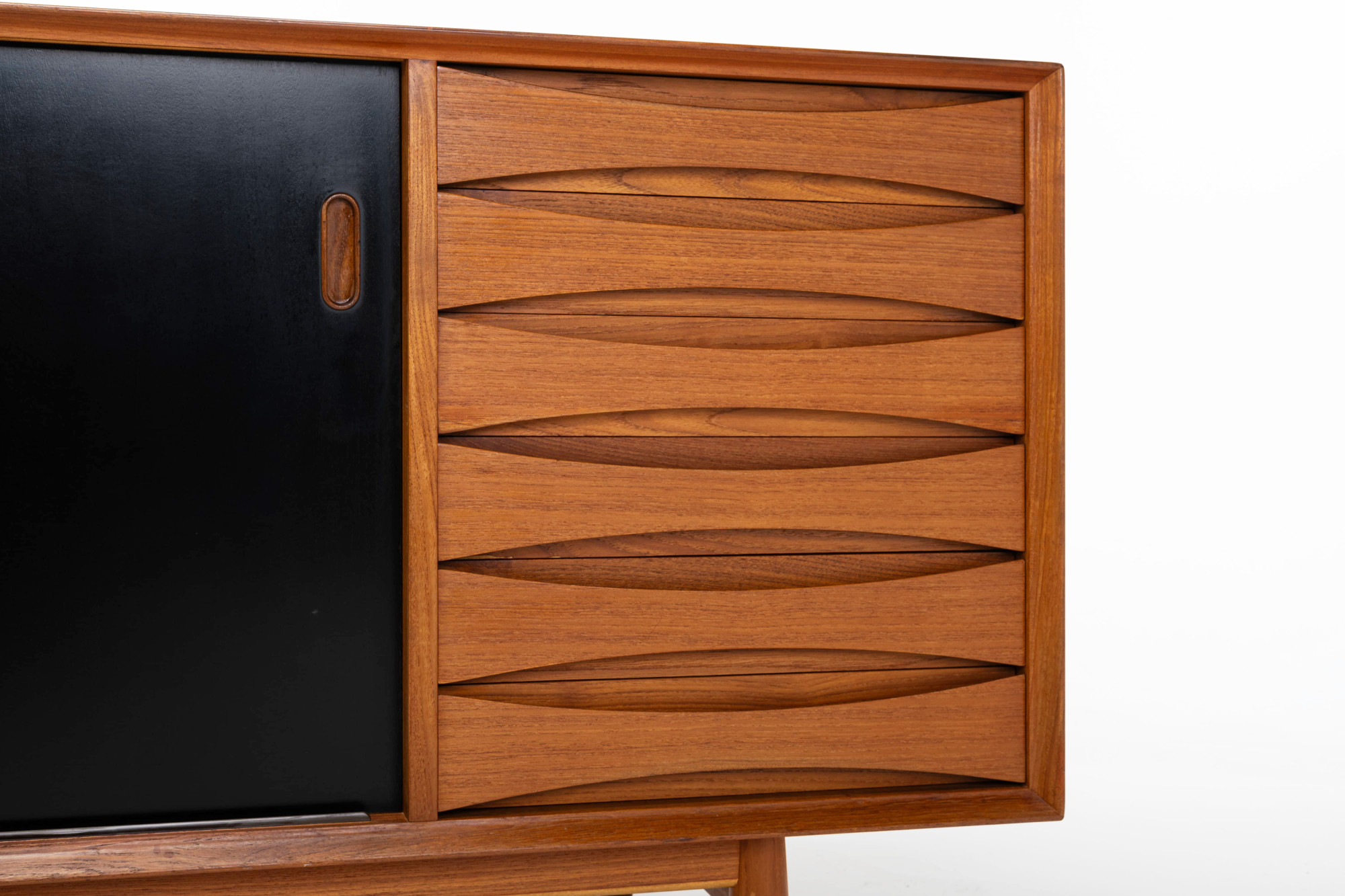 This sideboard, model OS29, designed by Arne Vodder and produced by Sibast in Denmark during the 1960s, is a classic example of mid-century craftsmanship. Recognized by its distinctive drawer handles and raised back edge. The sideboard showcases exceptional quality in both materials and construction, with perfectly balanced proportions. The piece includes two sliding doors, six drawers, and three internal shelves, all crafted from teak. Both doors can be turned into black doors.