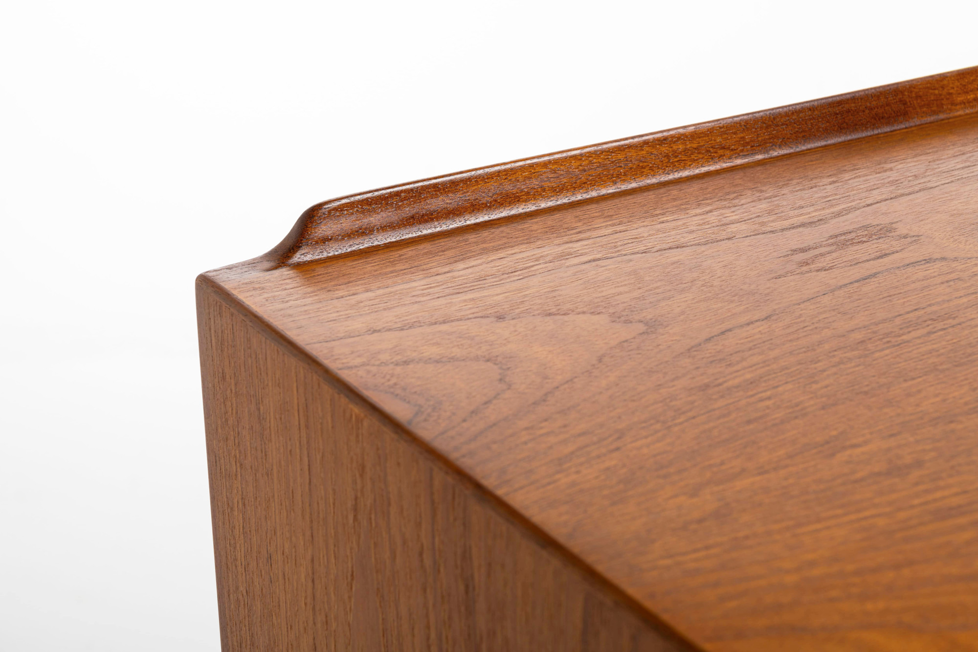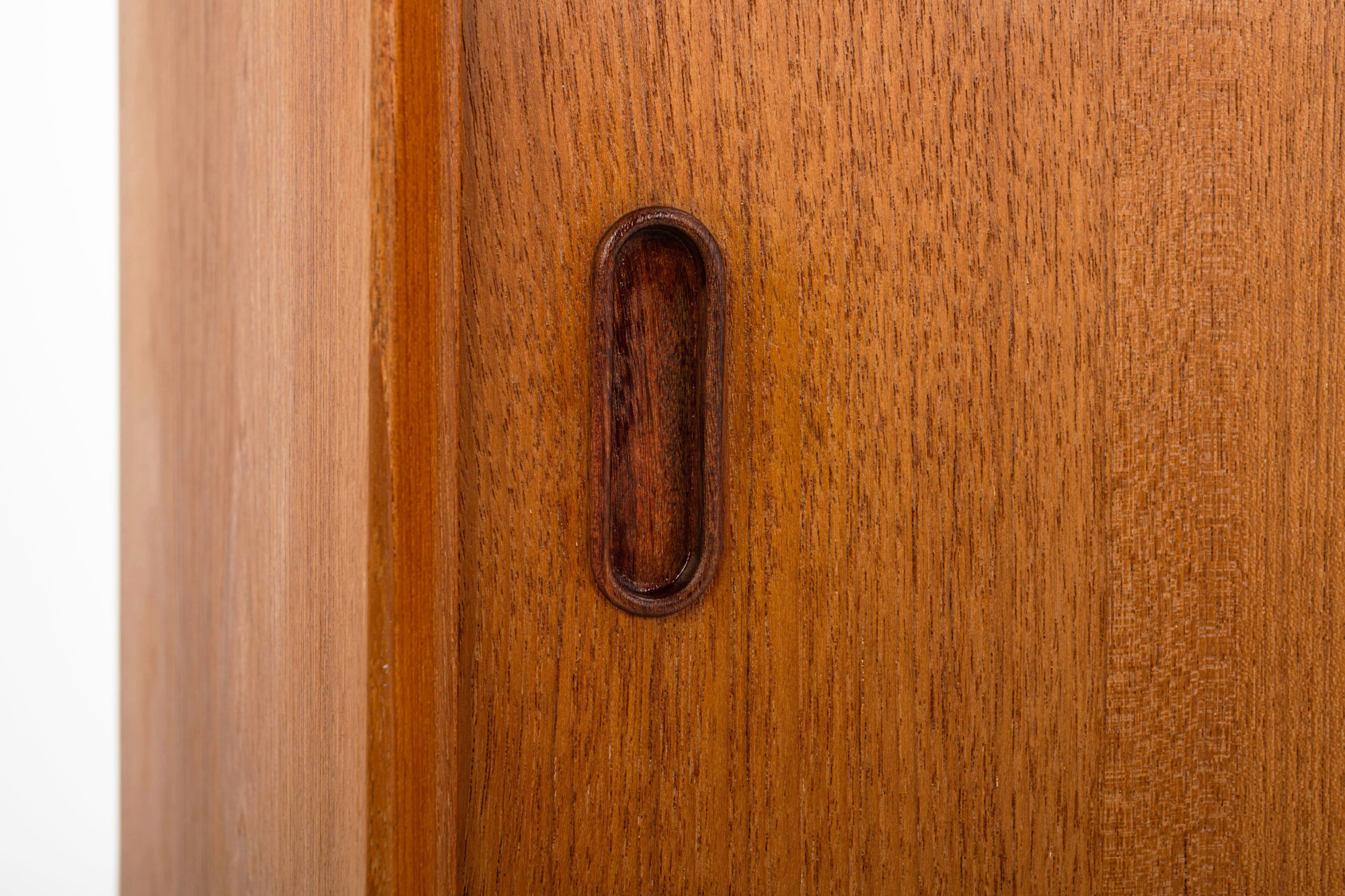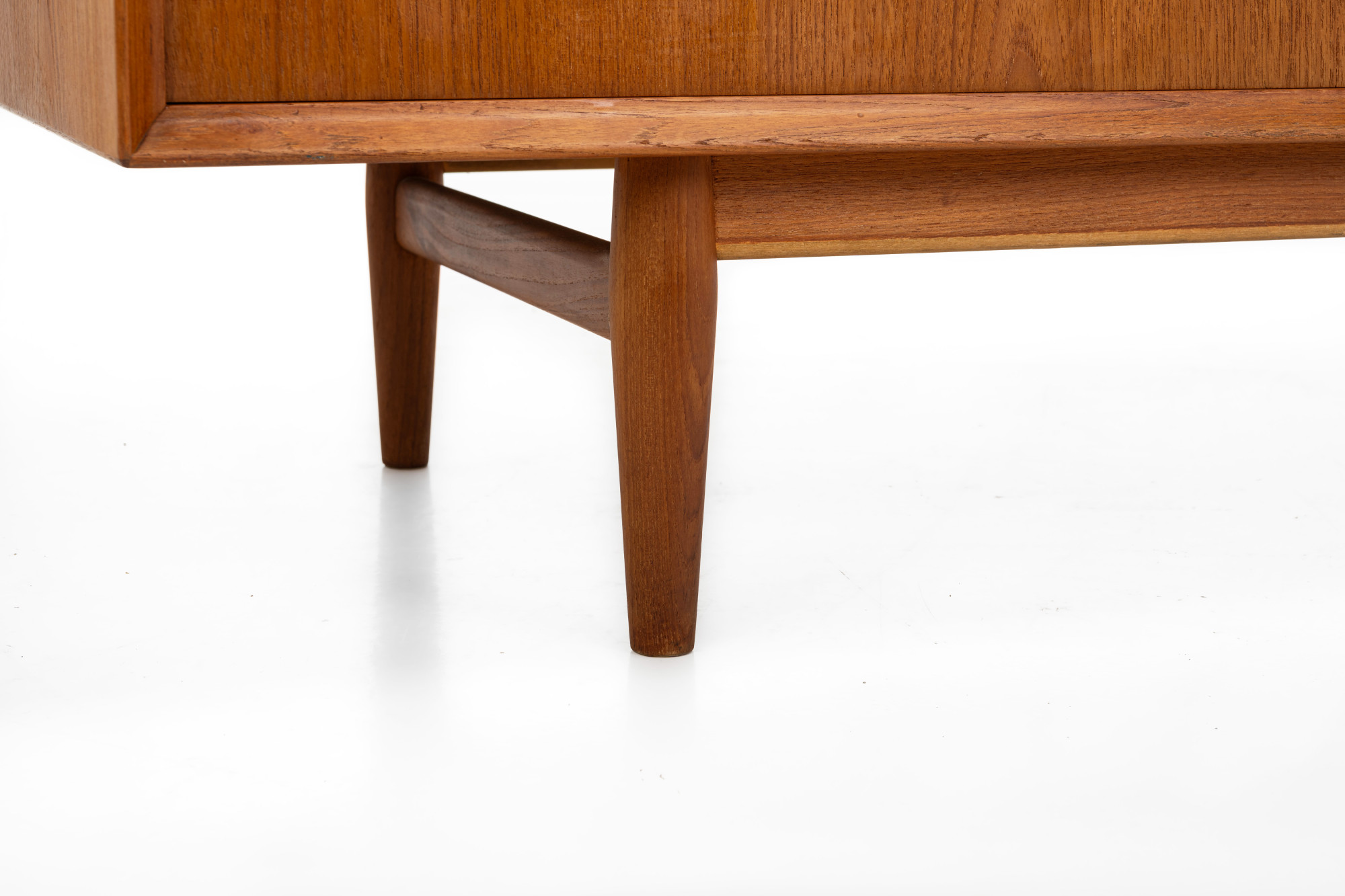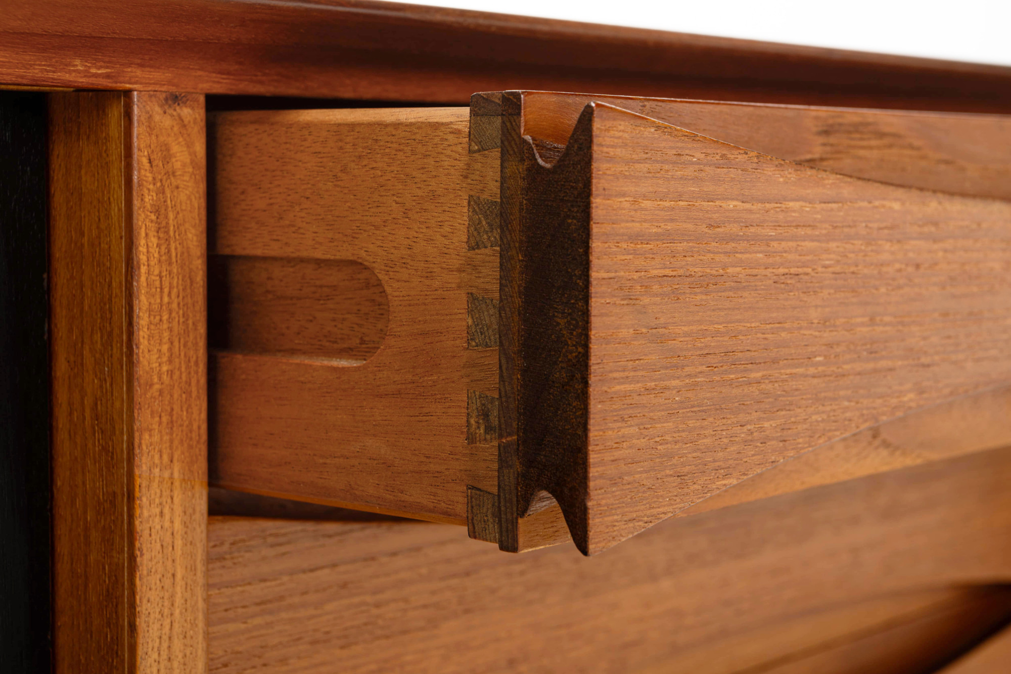This sideboard, model OS29, designed by Arne Vodder and produced by Sibast in Denmark during the 1960s, is a classic example of mid-century craftsmanship. Recognized by its distinctive drawer handles and raised back edge. The sideboard showcases exceptional quality in both materials and construction, with perfectly balanced proportions. The piece includes two sliding doors, six drawers, and three internal shelves, all crafted from teak. Both doors can be turned into black doors.