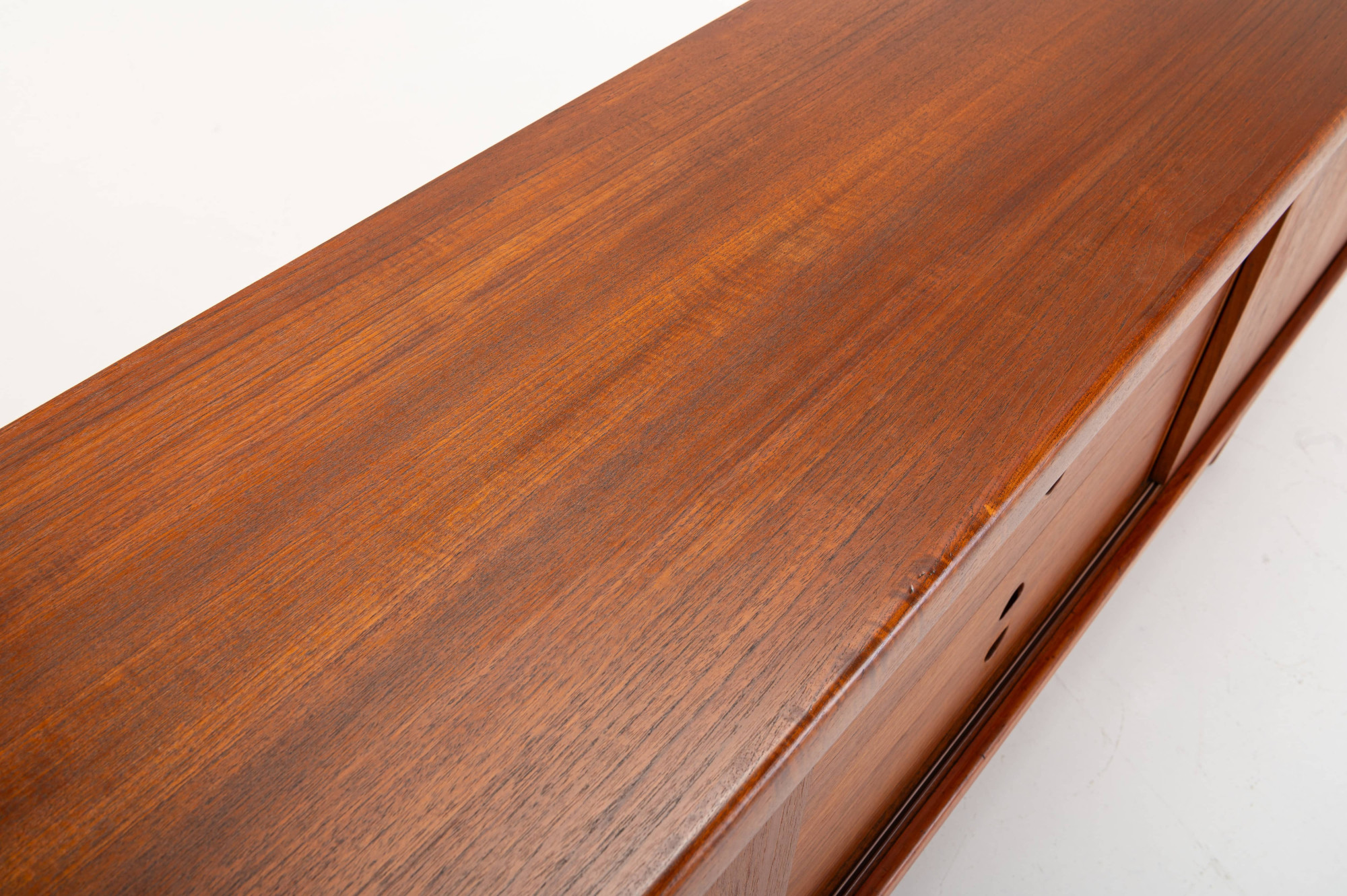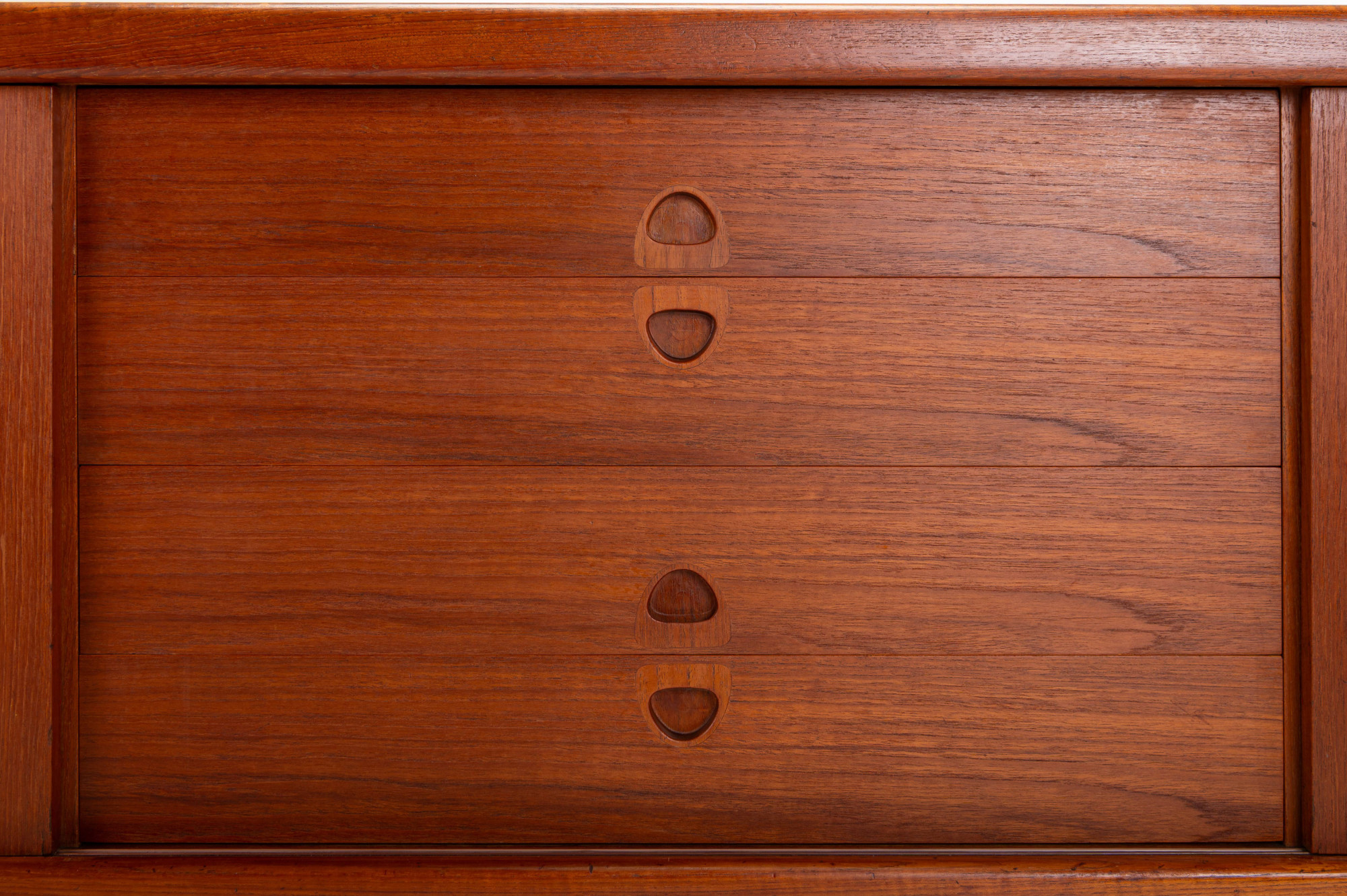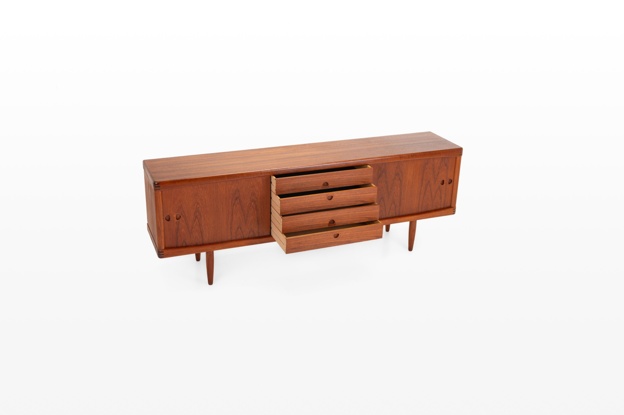This sideboard was designed by Henry W. Klein and manufactured by Bramin, Denmark 1960s. There are two sliding doors, four drawers and shelves. The sideboard is of very high quality and in very good condition. Finished in teak.