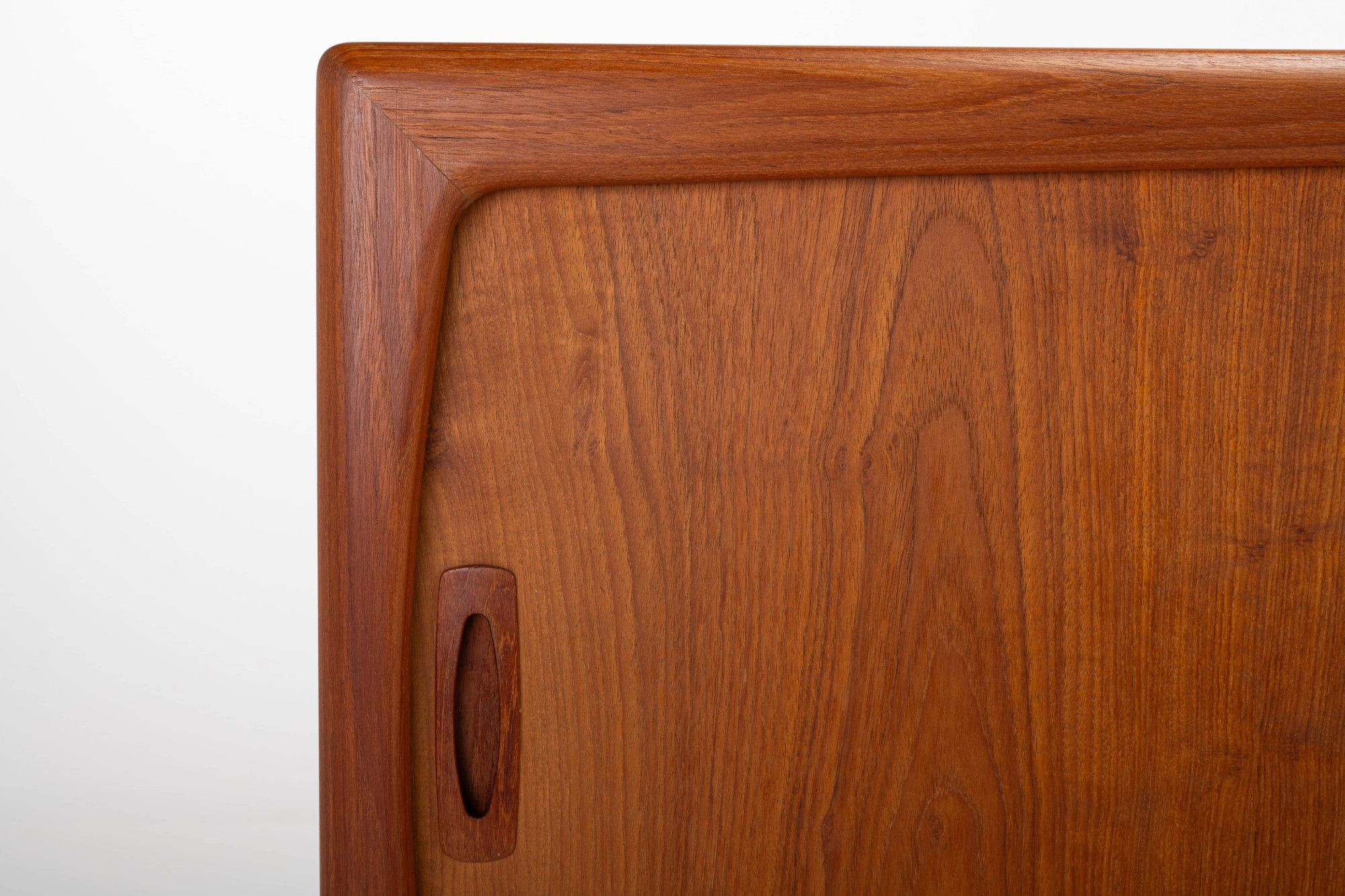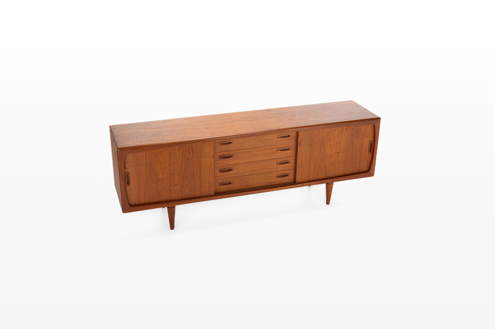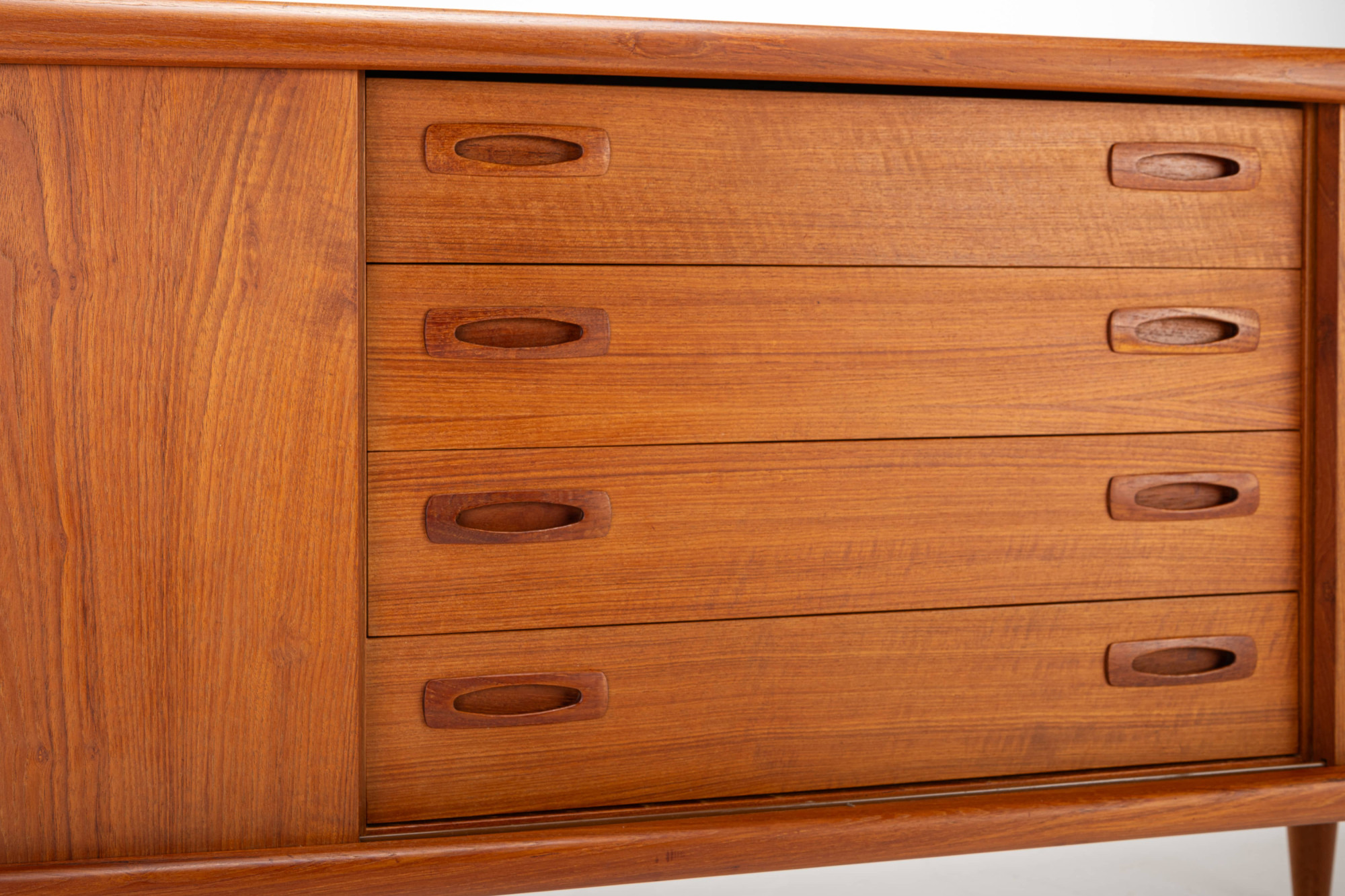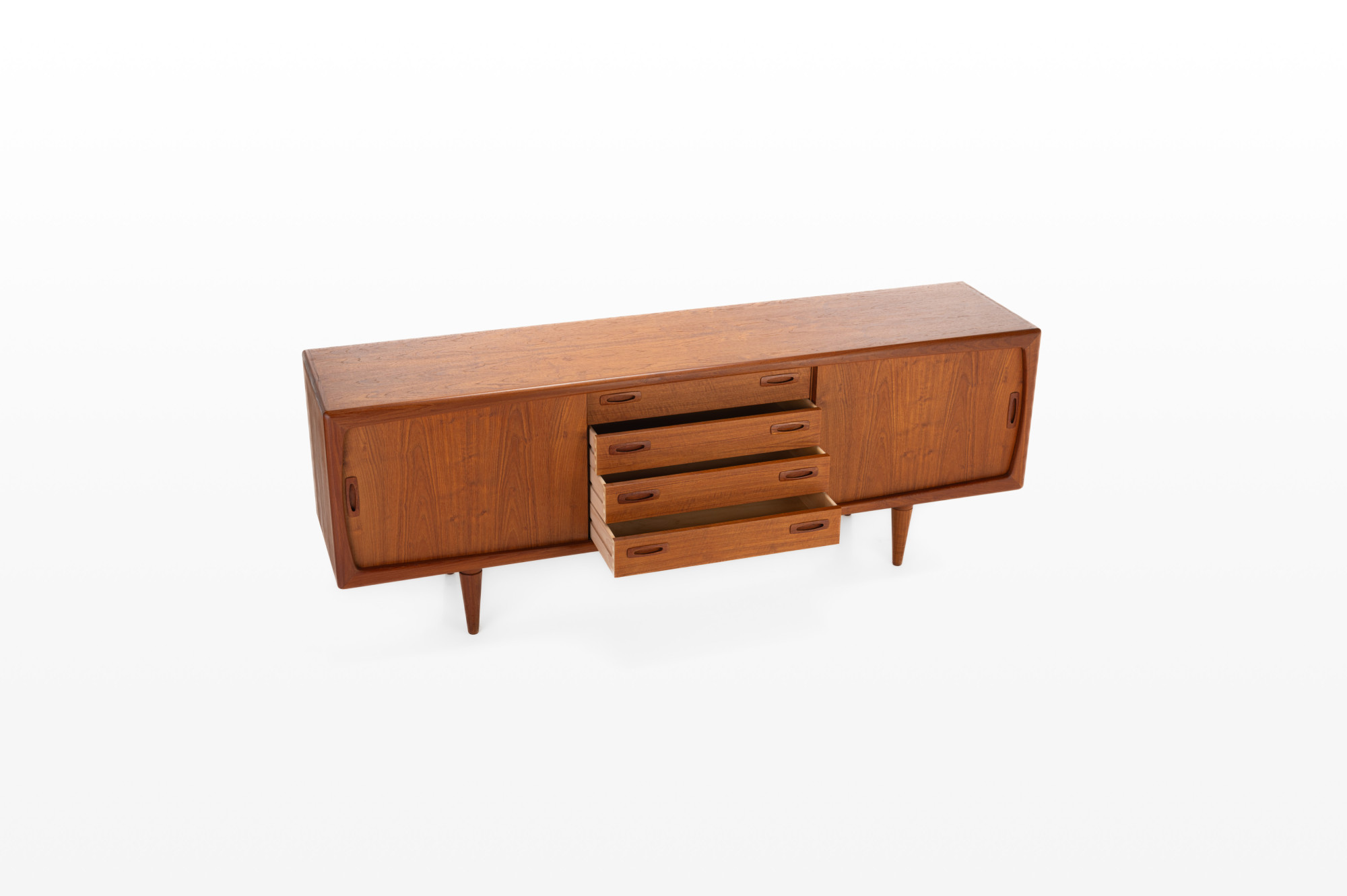 This sideboard is produced by H.P. Hansen, Denmark. There are two sliding doors, four drawers and shelves. The sideboard is finished in teak and is in very good condition.