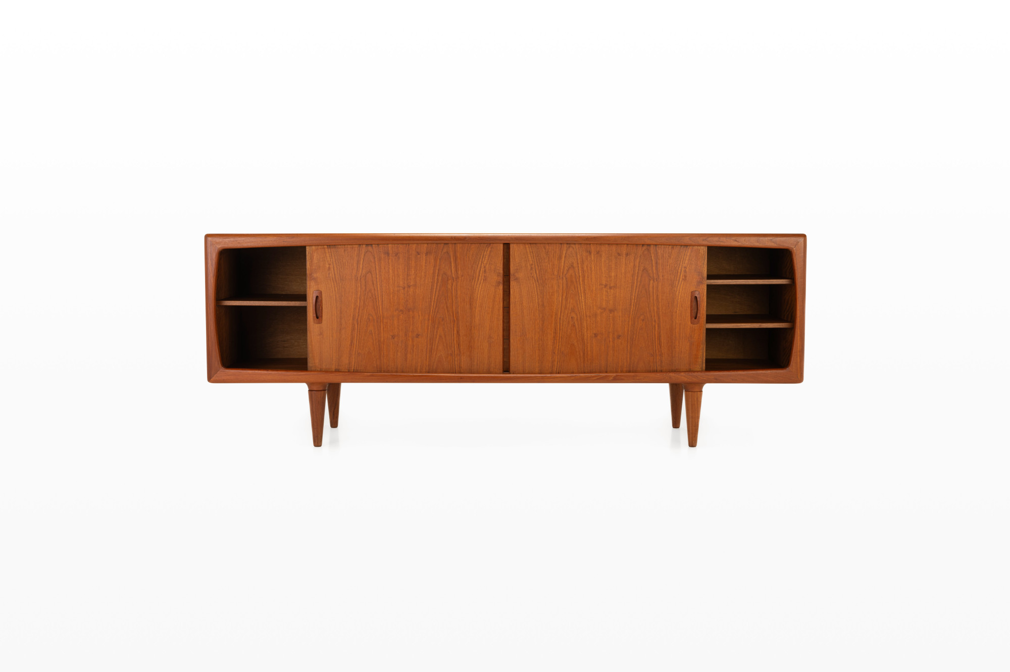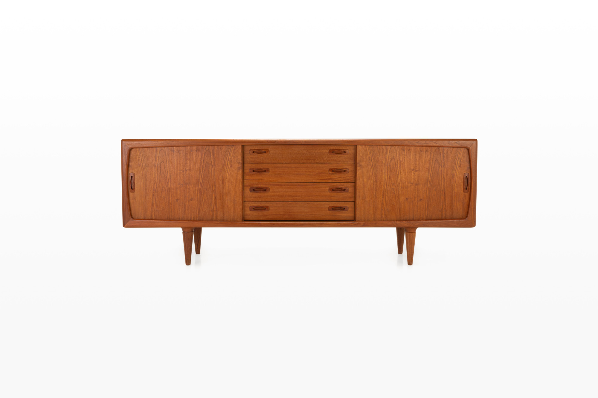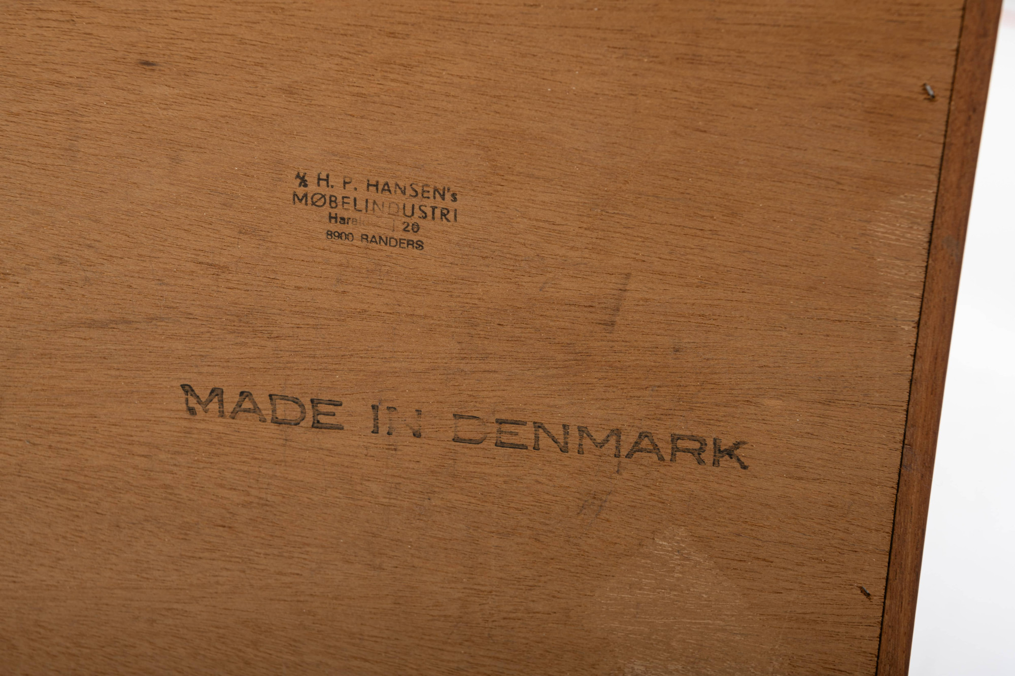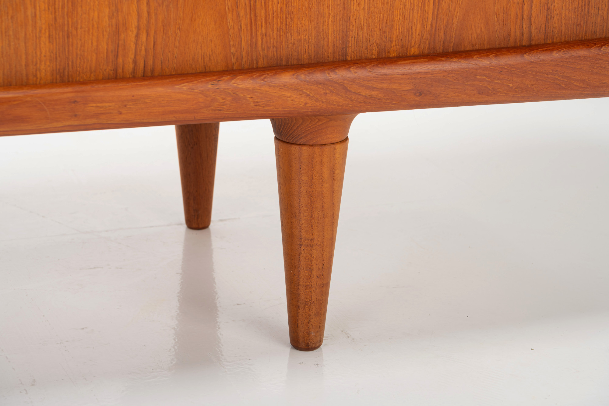 This sideboard is produced by H.P. Hansen, Denmark. There are two sliding doors, four drawers and shelves. The sideboard is finished in teak and is in very good condition.