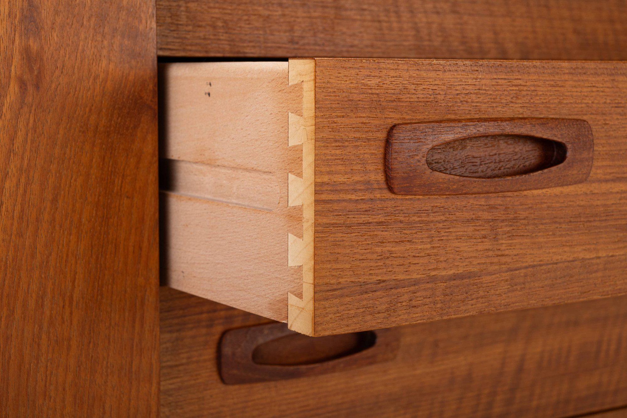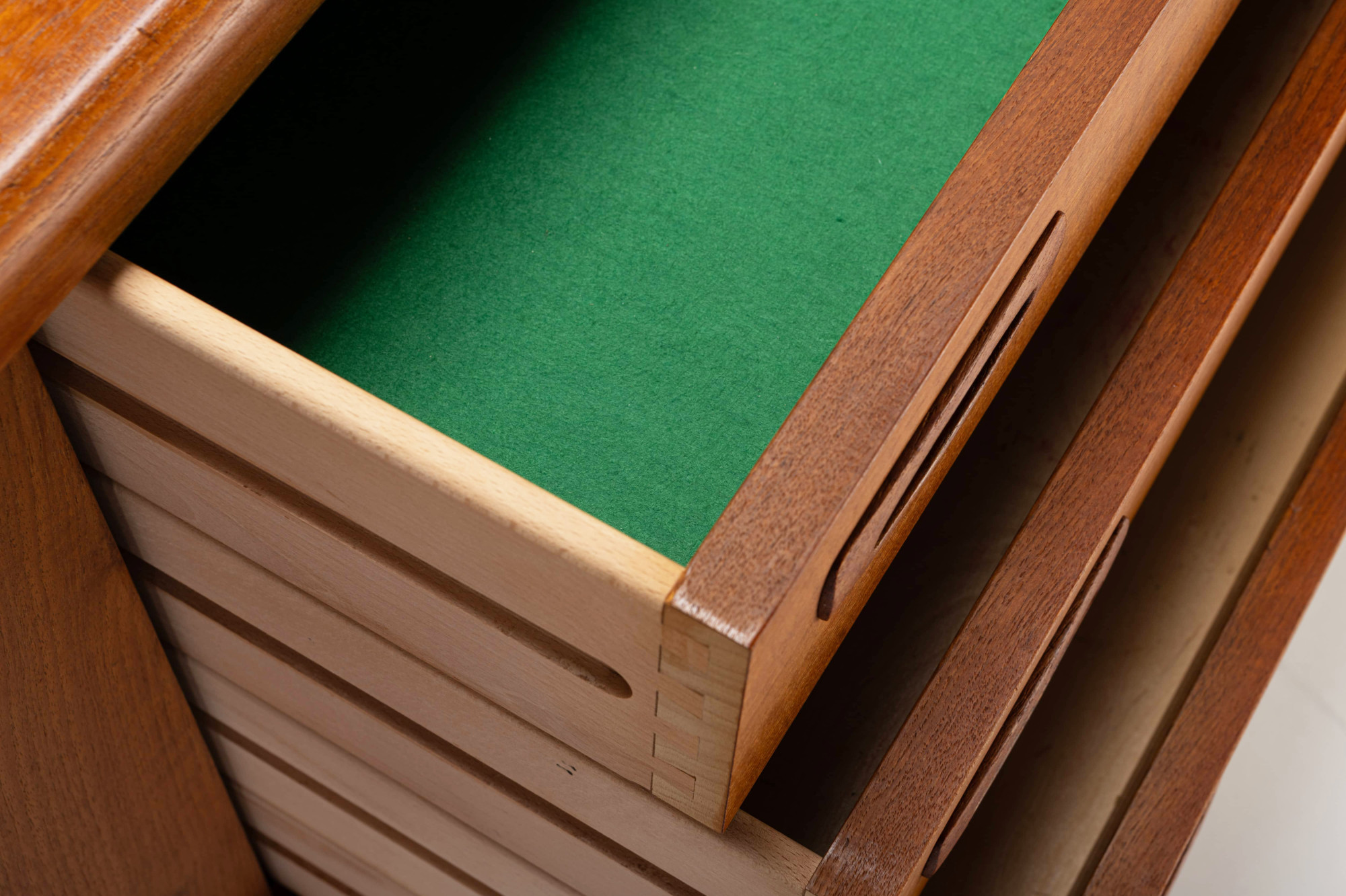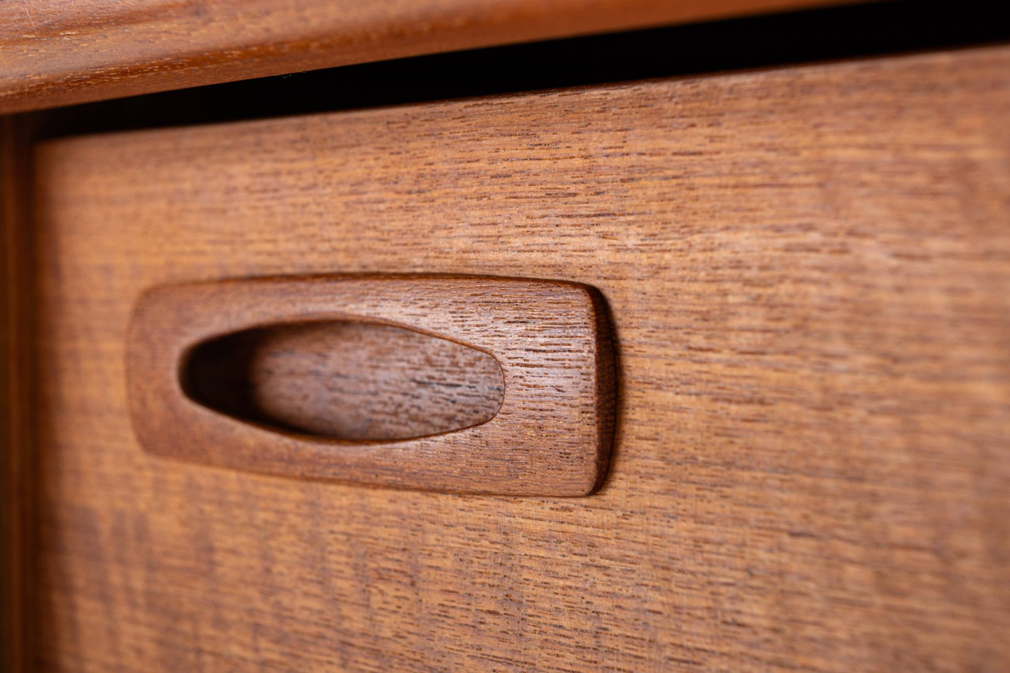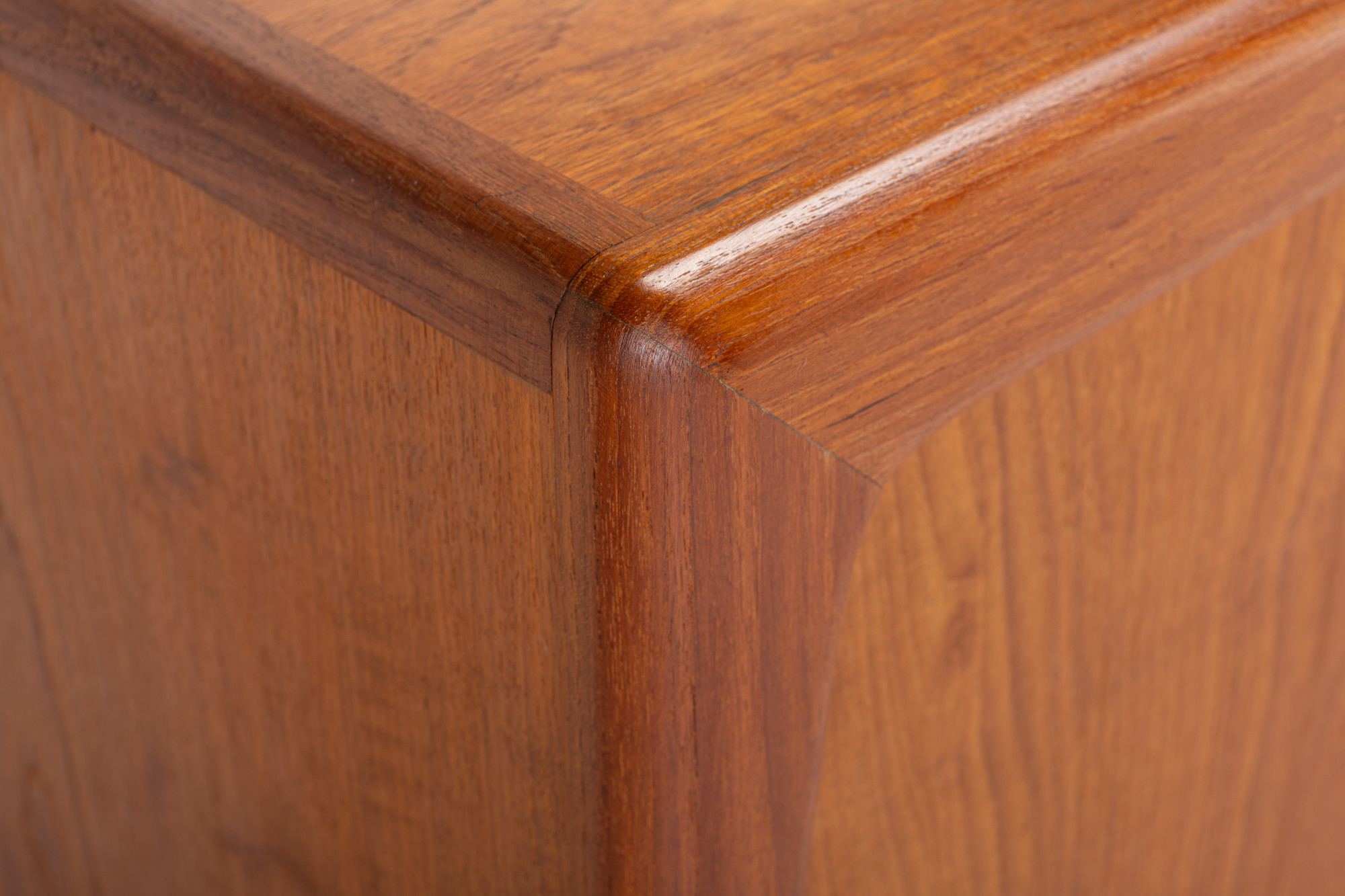 This sideboard is produced by H.P. Hansen, Denmark. There are two sliding doors, four drawers and shelves. The sideboard is finished in teak and is in very good condition.