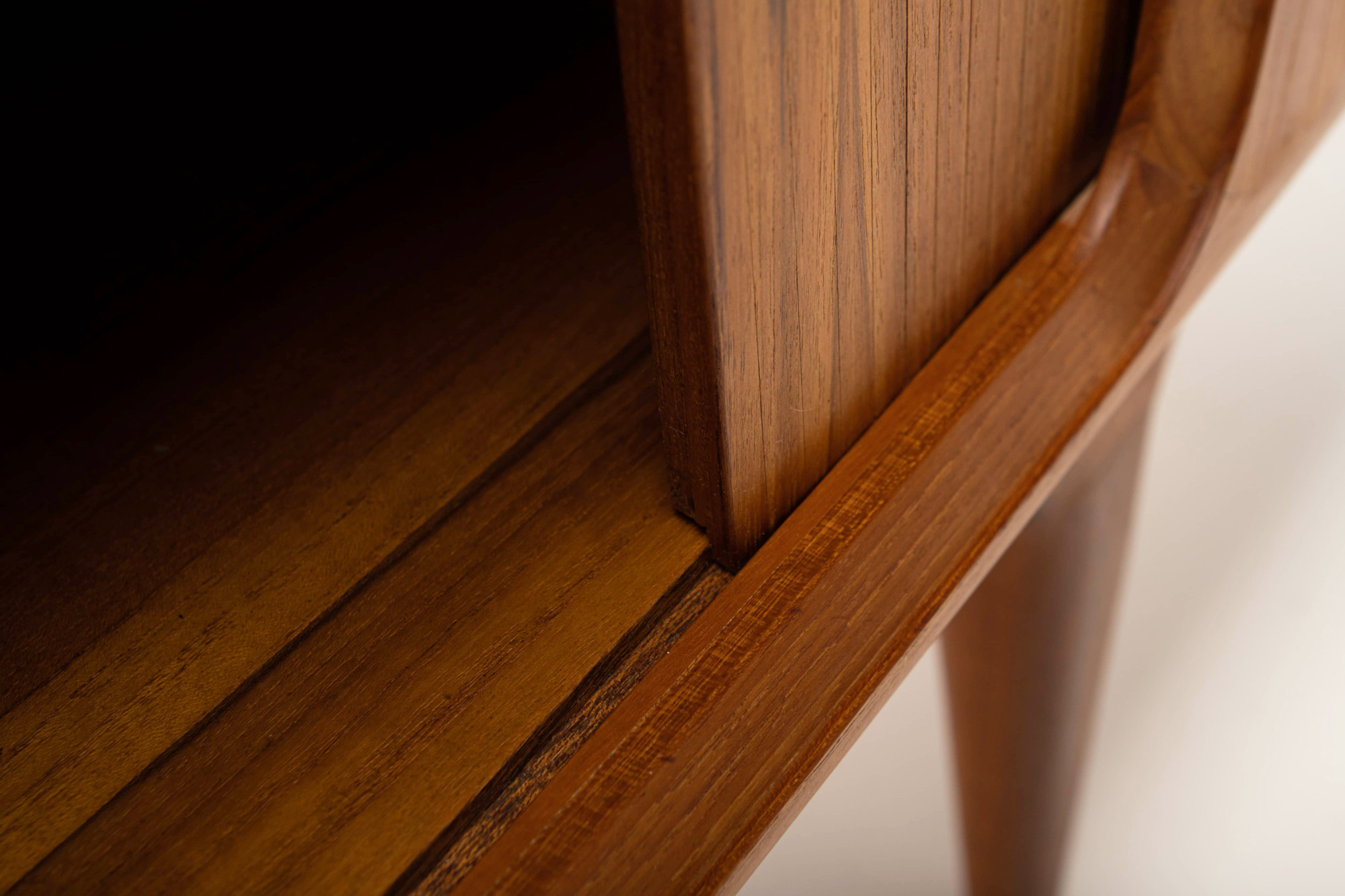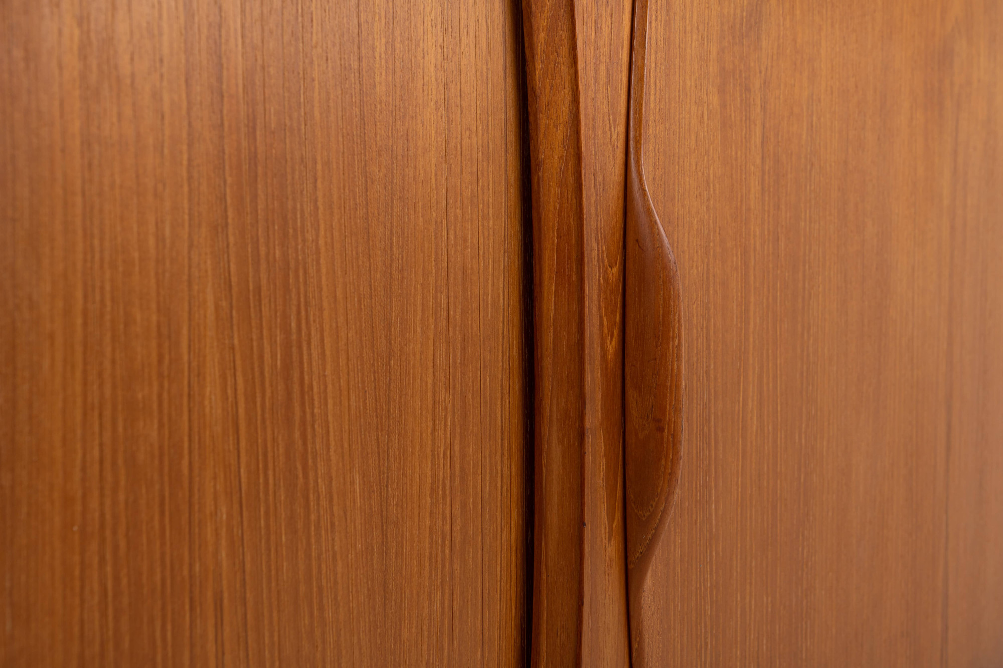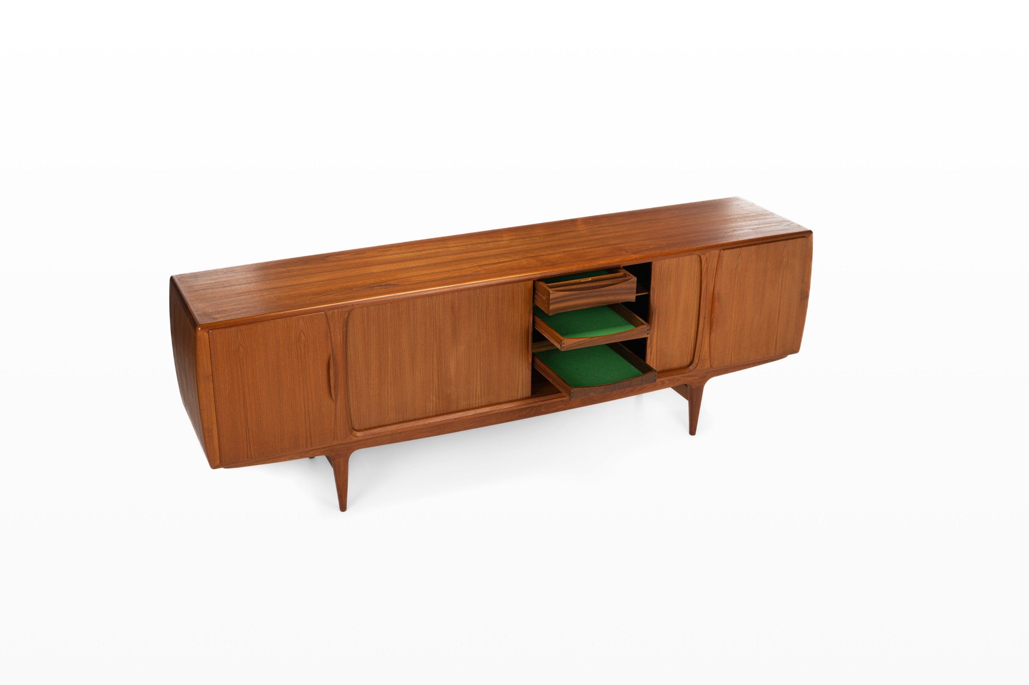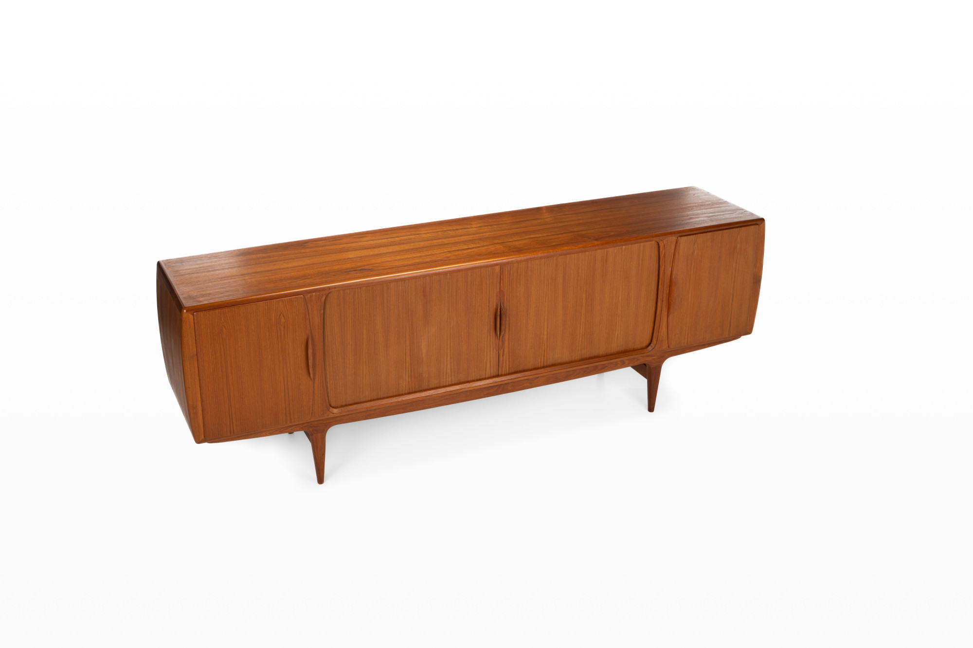 Magnificent sideboard in teak designed by Johannes Andersen for Uldum Møbelfabrik, Denmark 1960s. This sideboard has four tambour doors, two doors and plenty of storage space.
