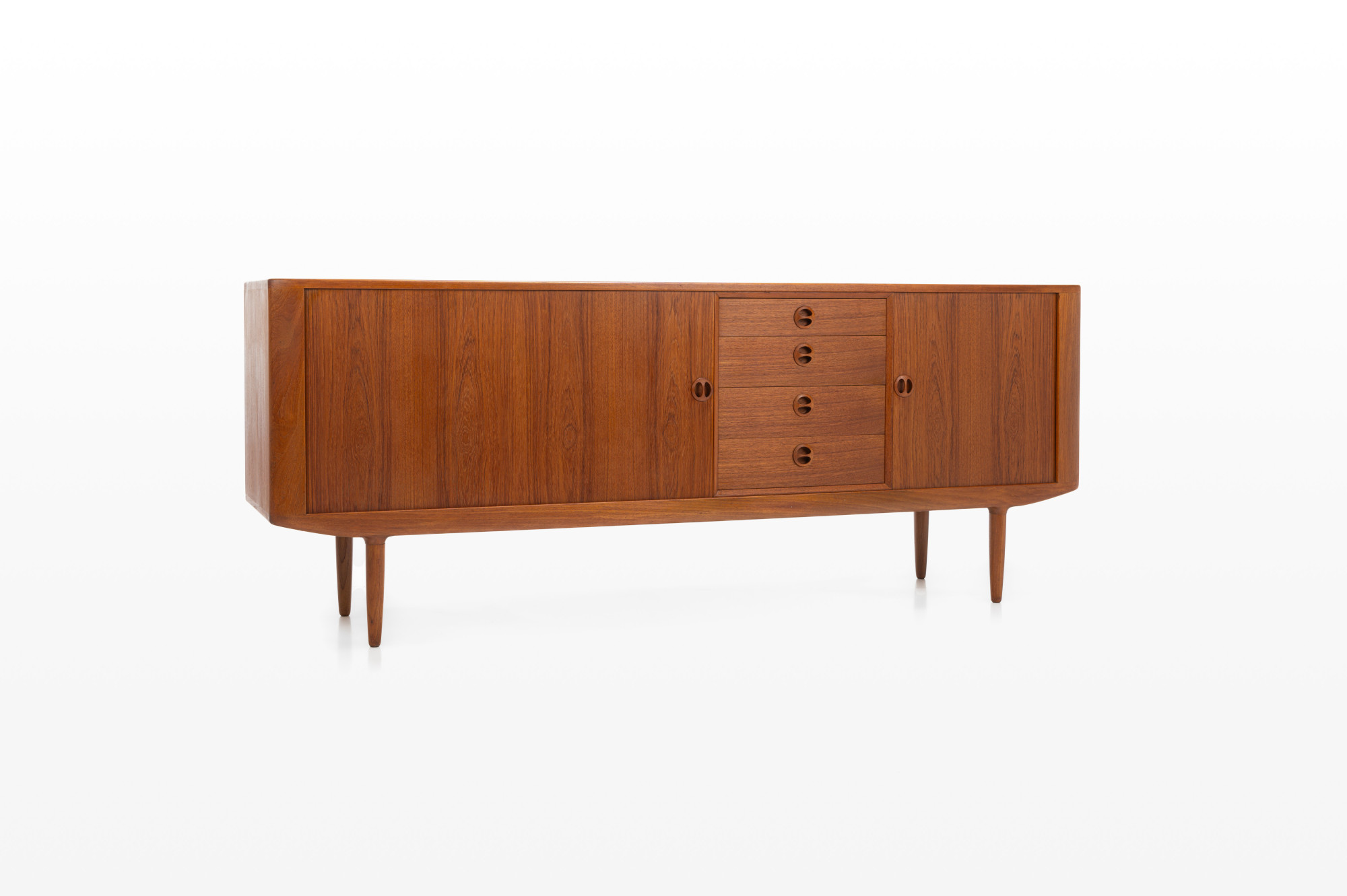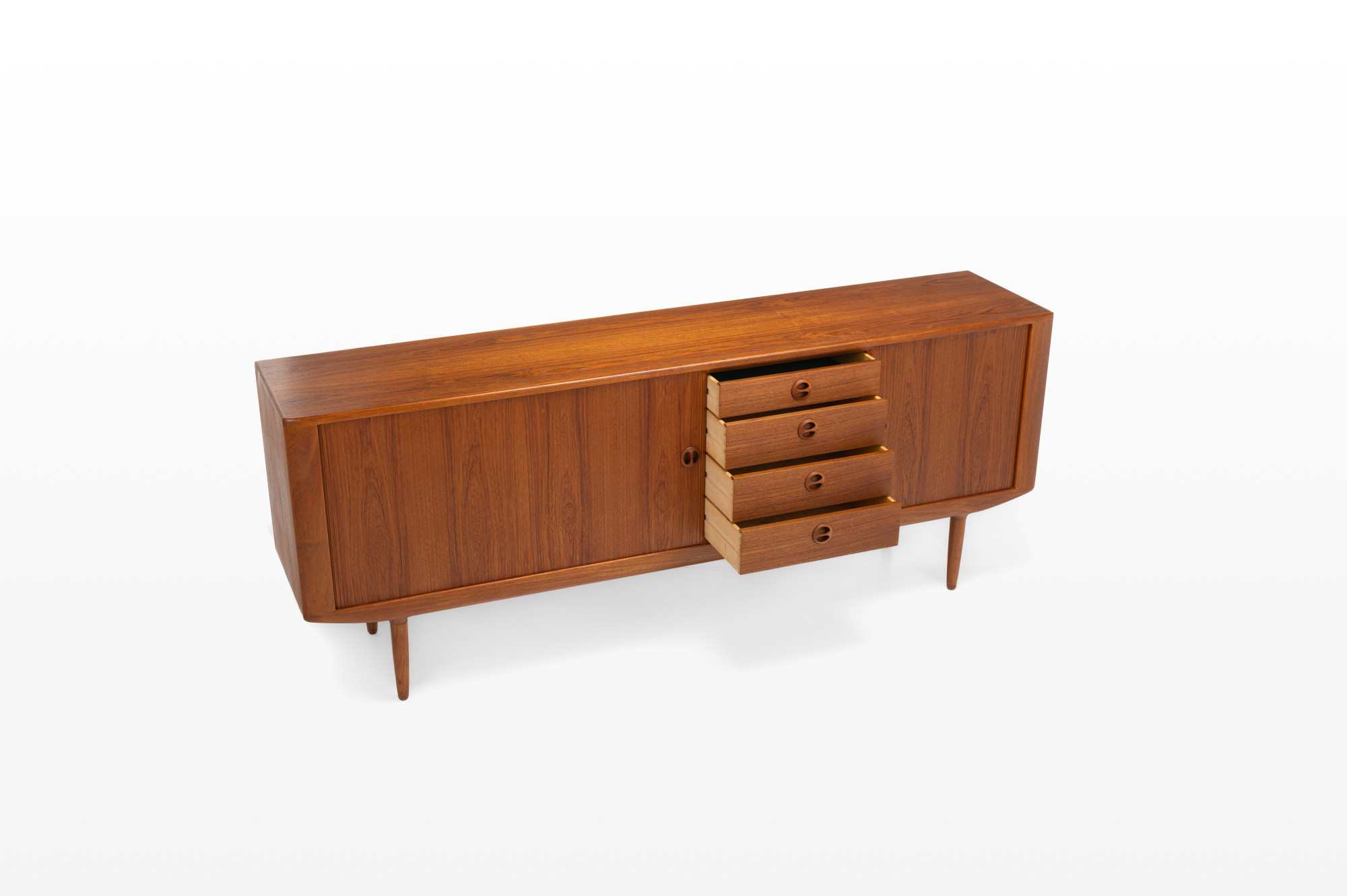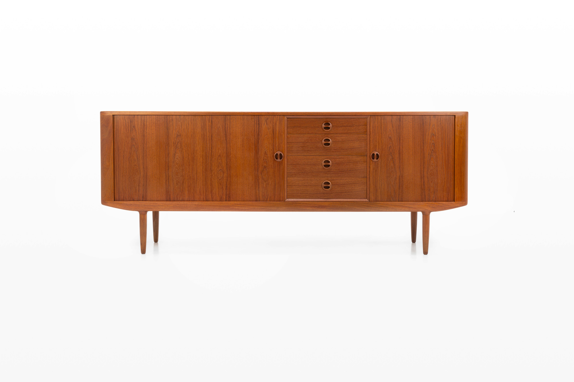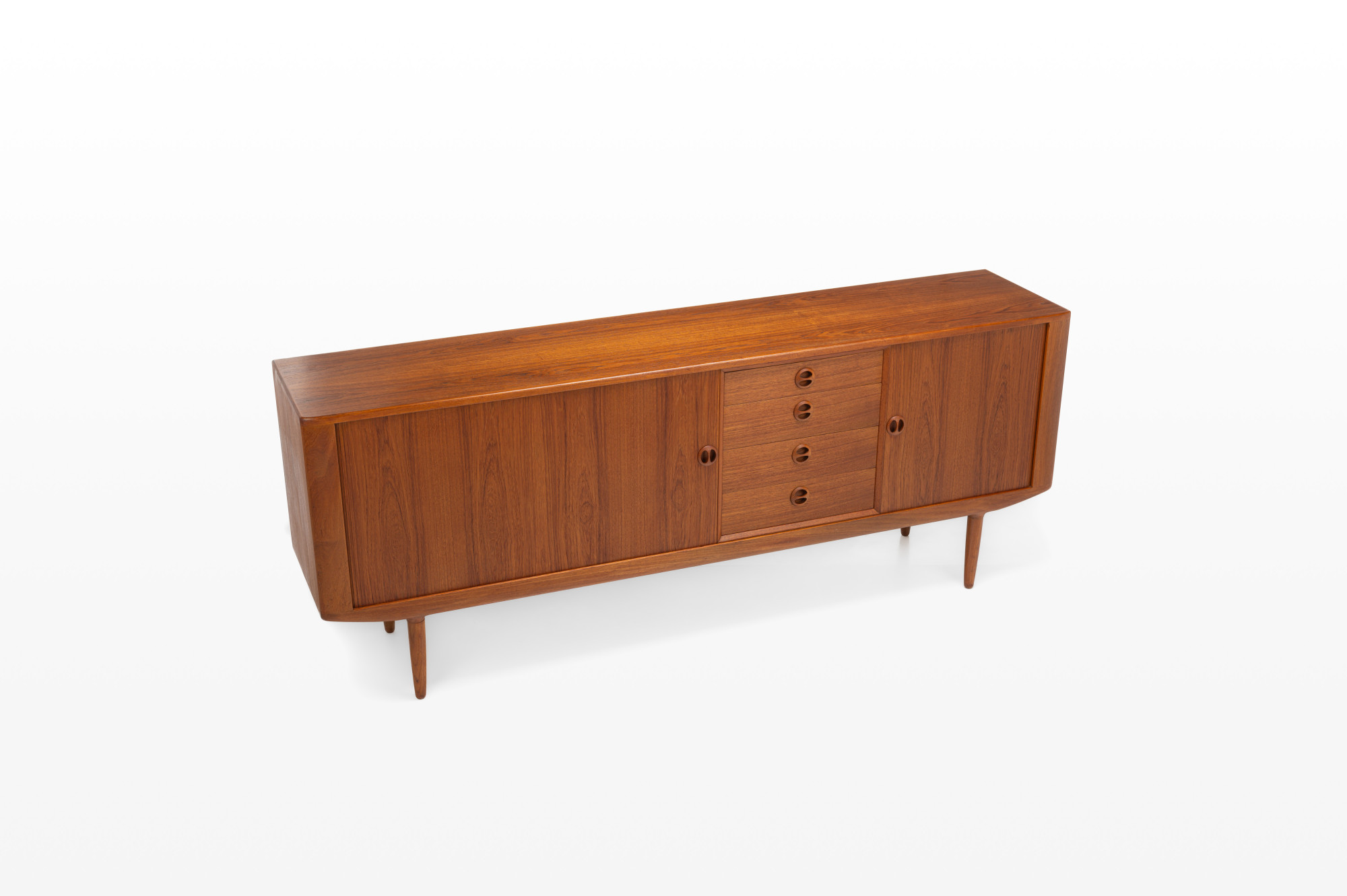 Rare Danish teak sideboard by Randers Møbelfabrik. This gorgeous sideboard has two tambour doors, four drawers and a lot of storage space. This sideboard is truly a beautiful piece with a few elegant details.