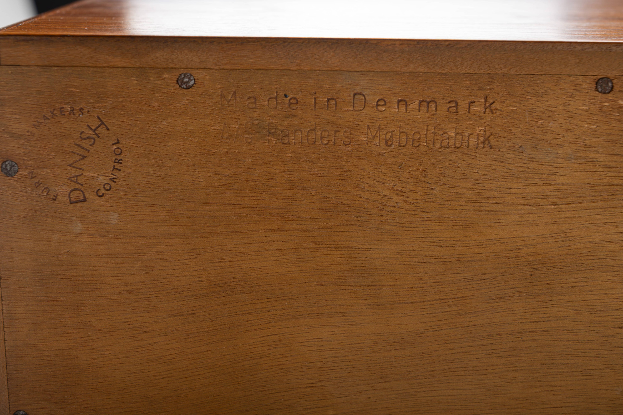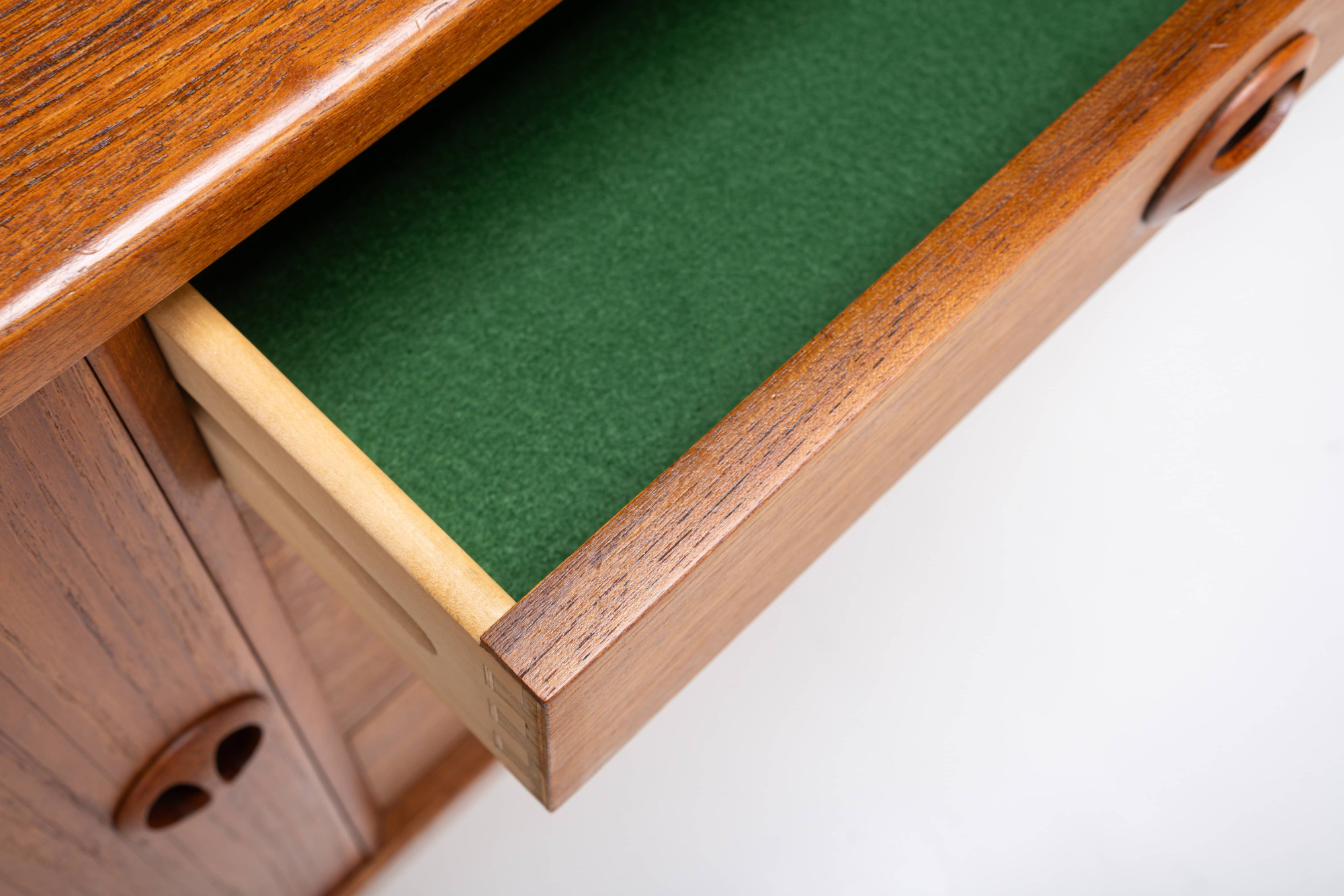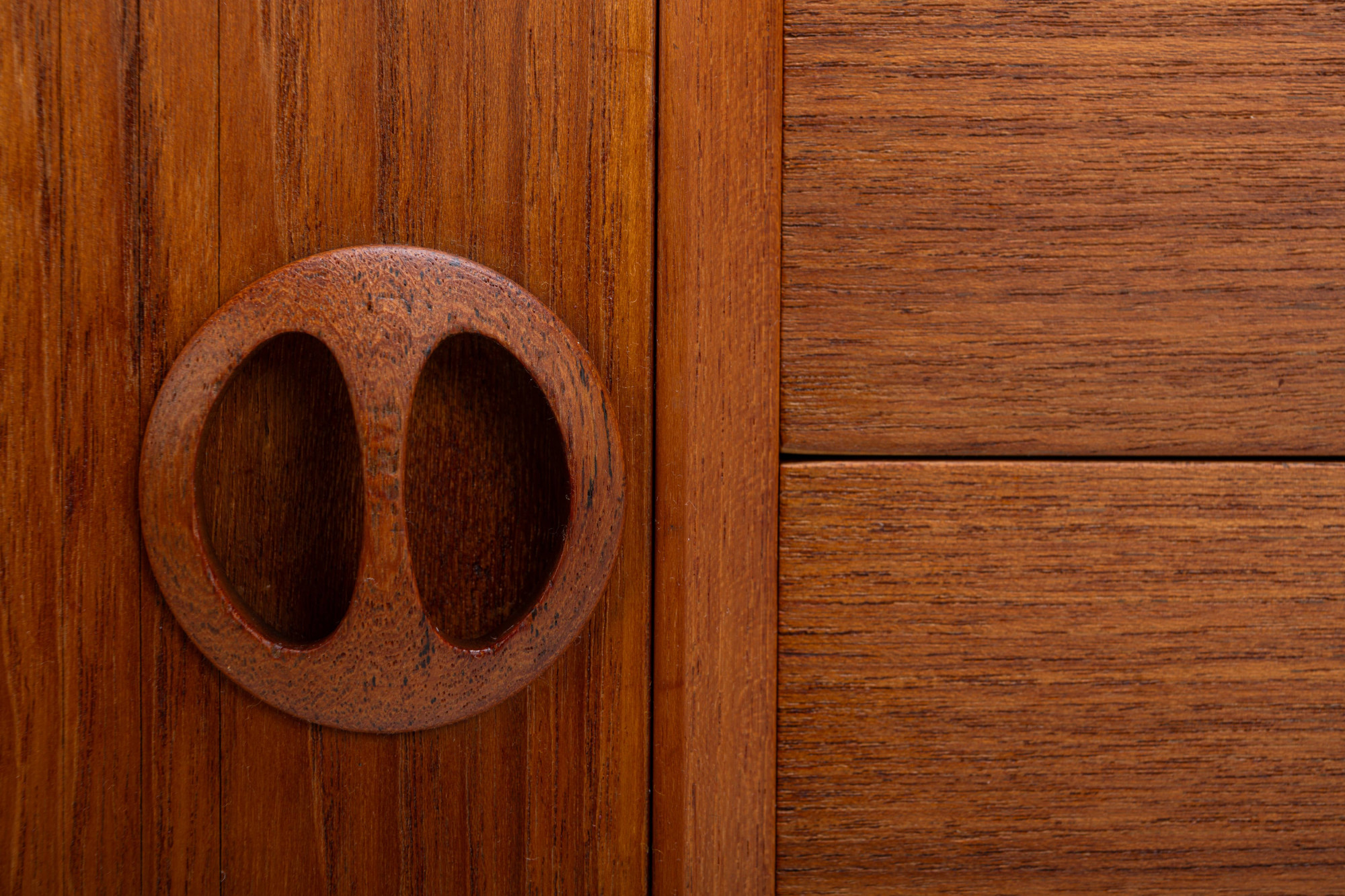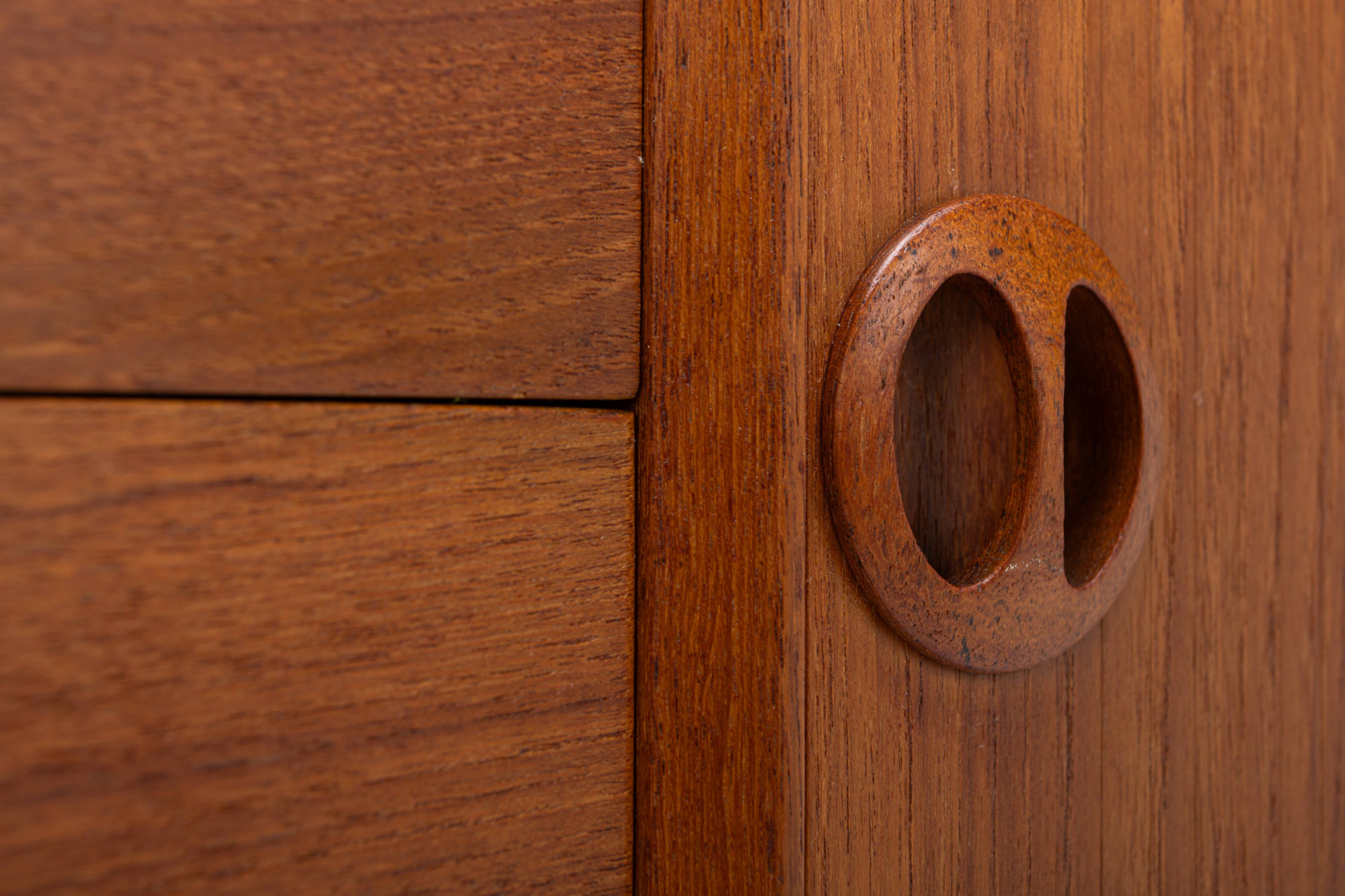 Rare Danish teak sideboard by Randers Møbelfabrik. This gorgeous sideboard has two tambour doors, four drawers and a lot of storage space. This sideboard is truly a beautiful piece with a few elegant details.