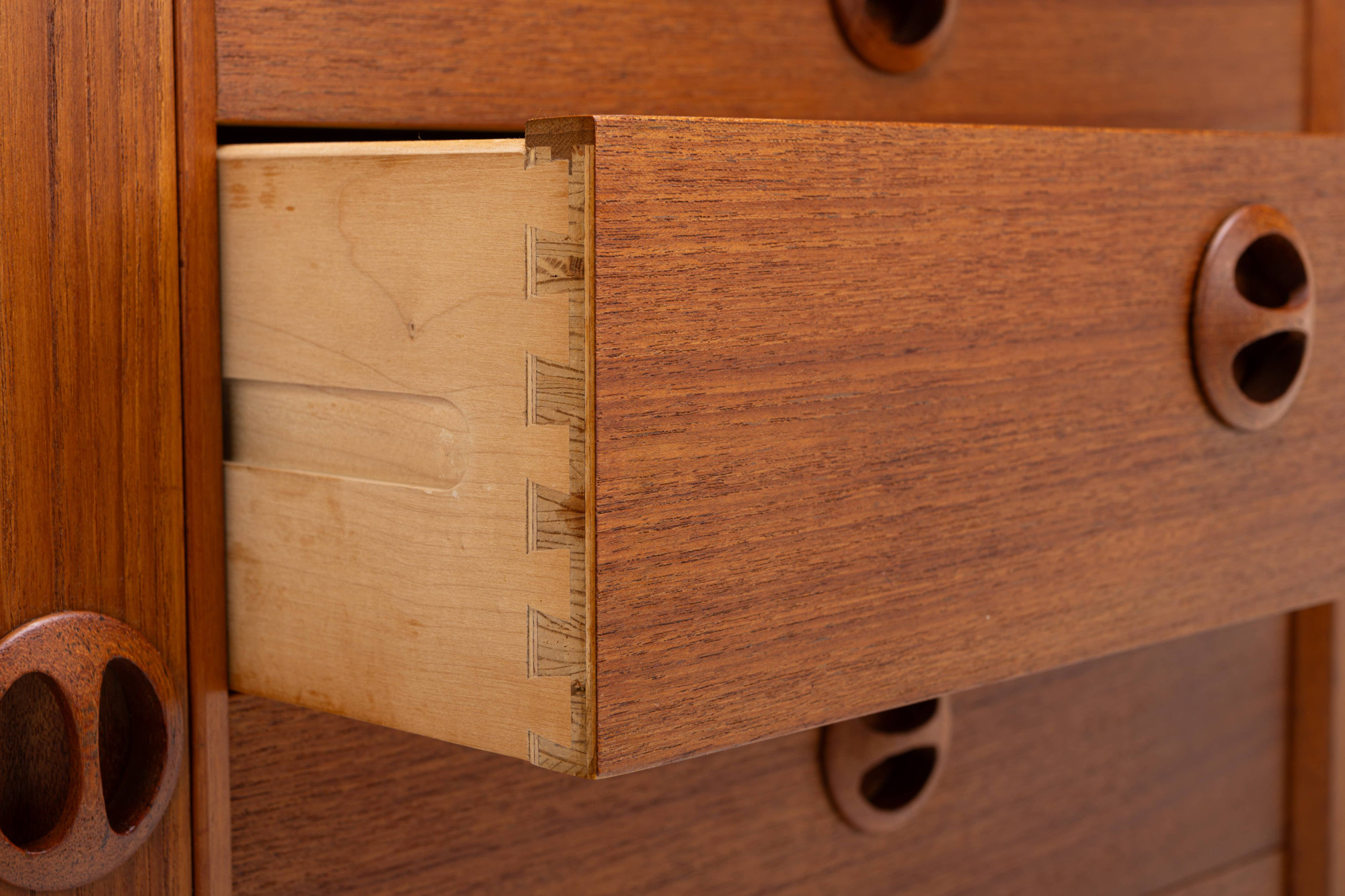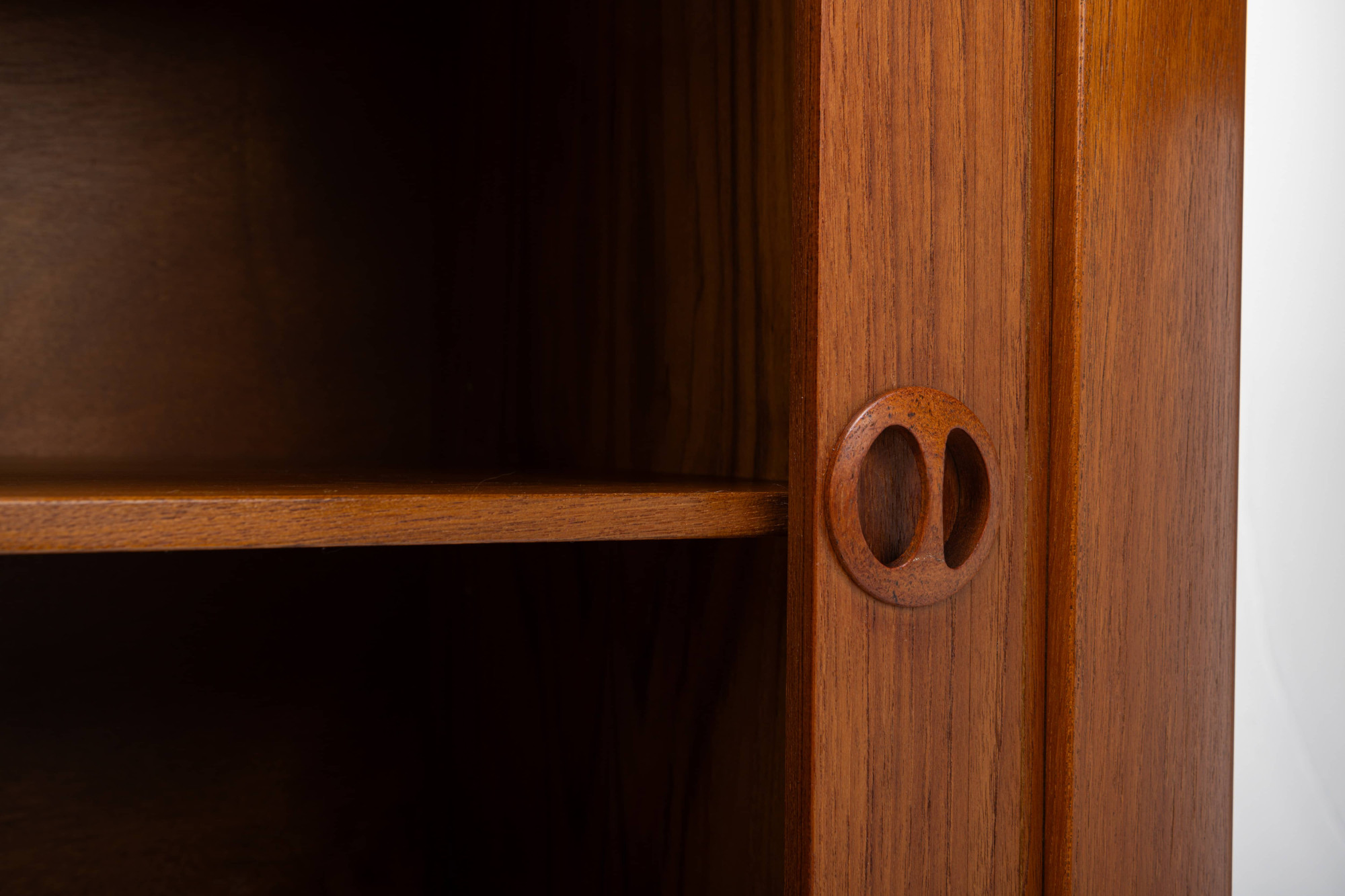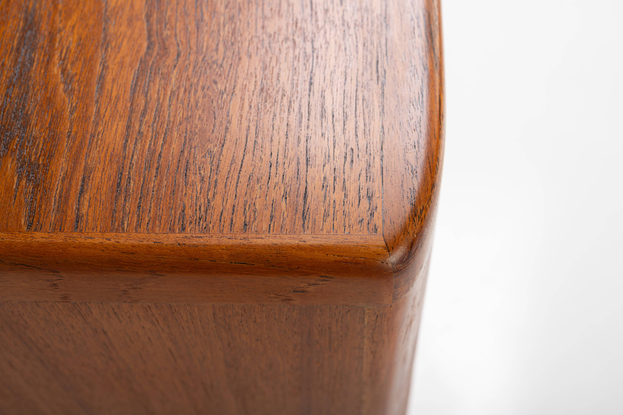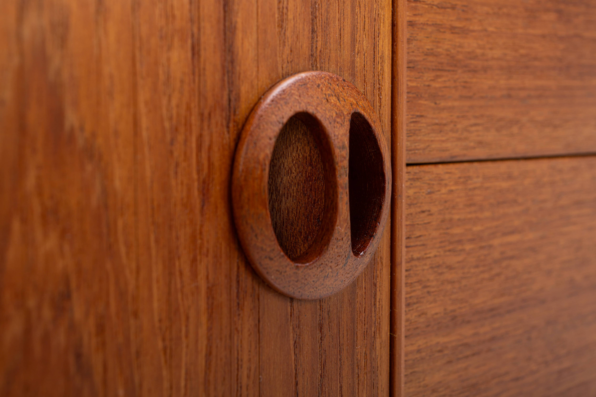 Rare Danish teak sideboard by Randers Møbelfabrik. This gorgeous sideboard has two tambour doors, four drawers and a lot of storage space. This sideboard is truly a beautiful piece with a few elegant details.