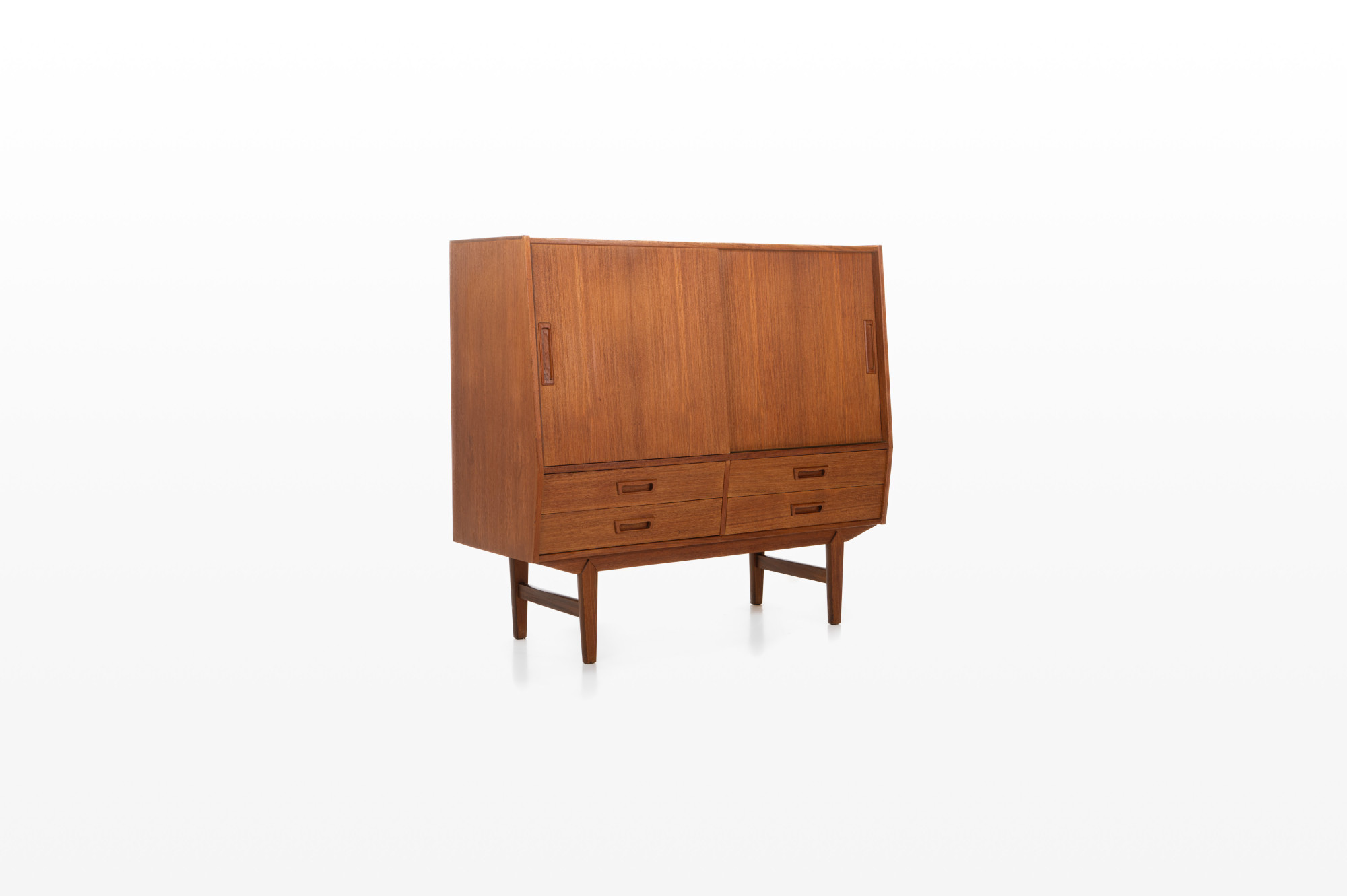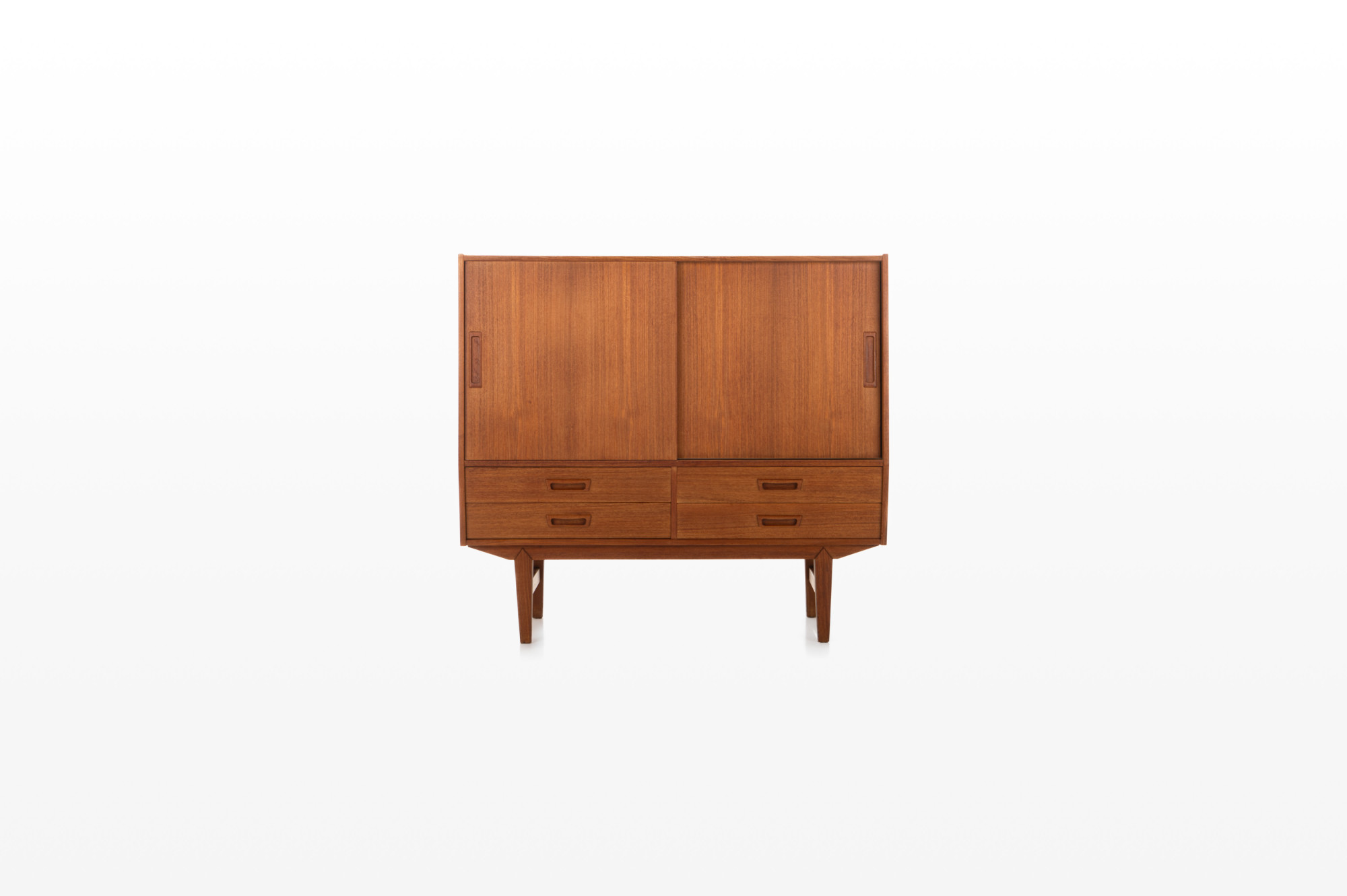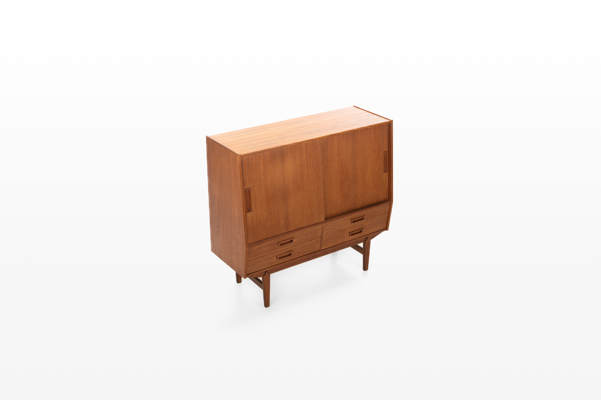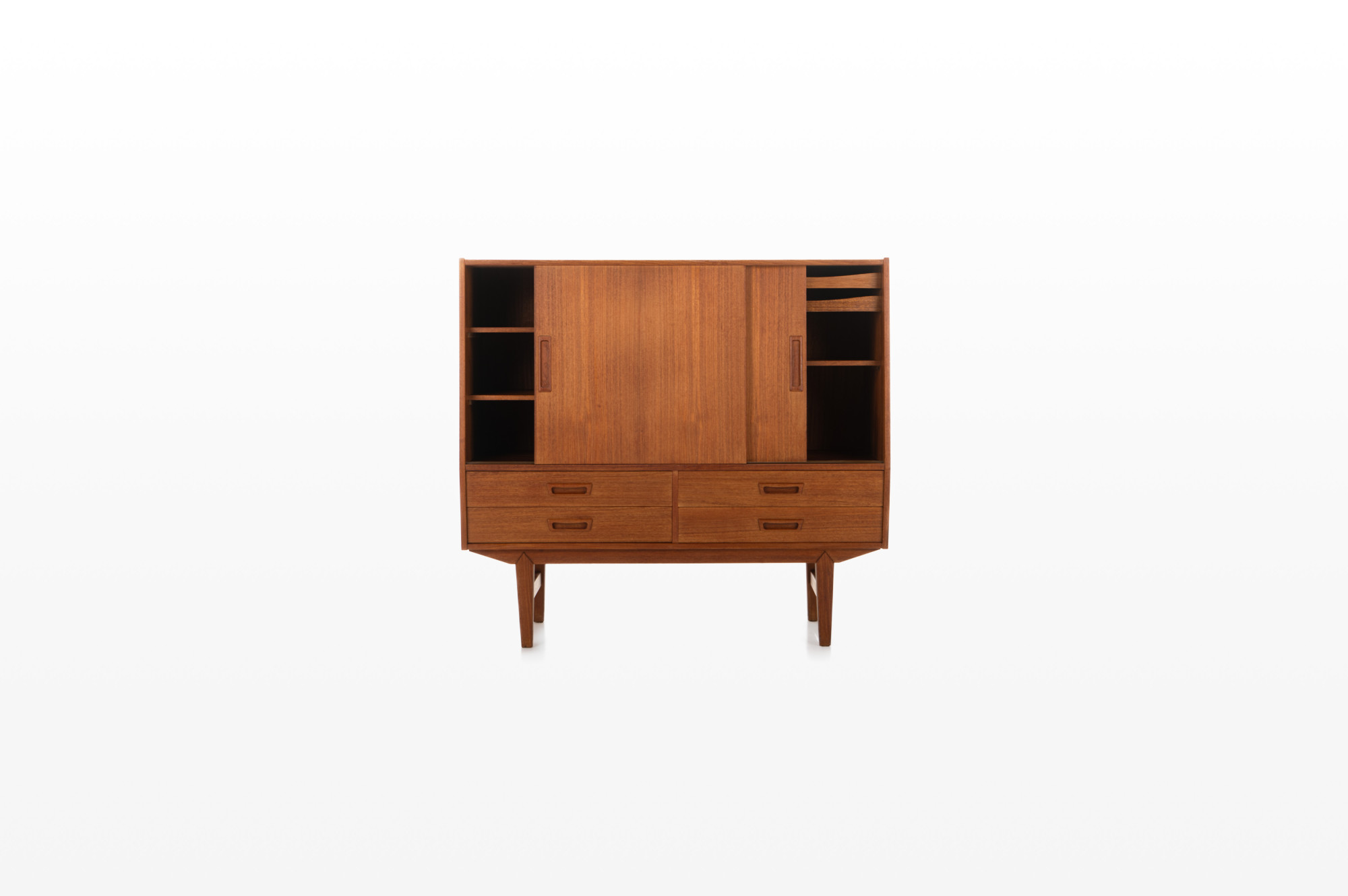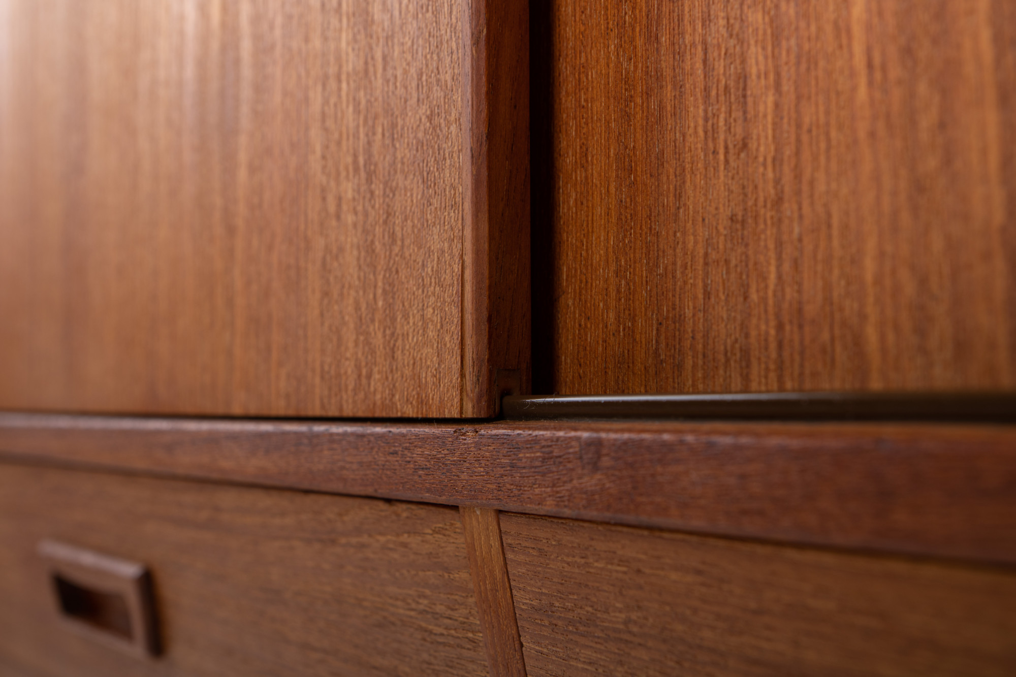 Scandinavian Mid Century cabinet in teak produced by Vemb Møbelfabrik, 1960s. The cabinet has two sliding doors, four drawers and plenty of storage space.