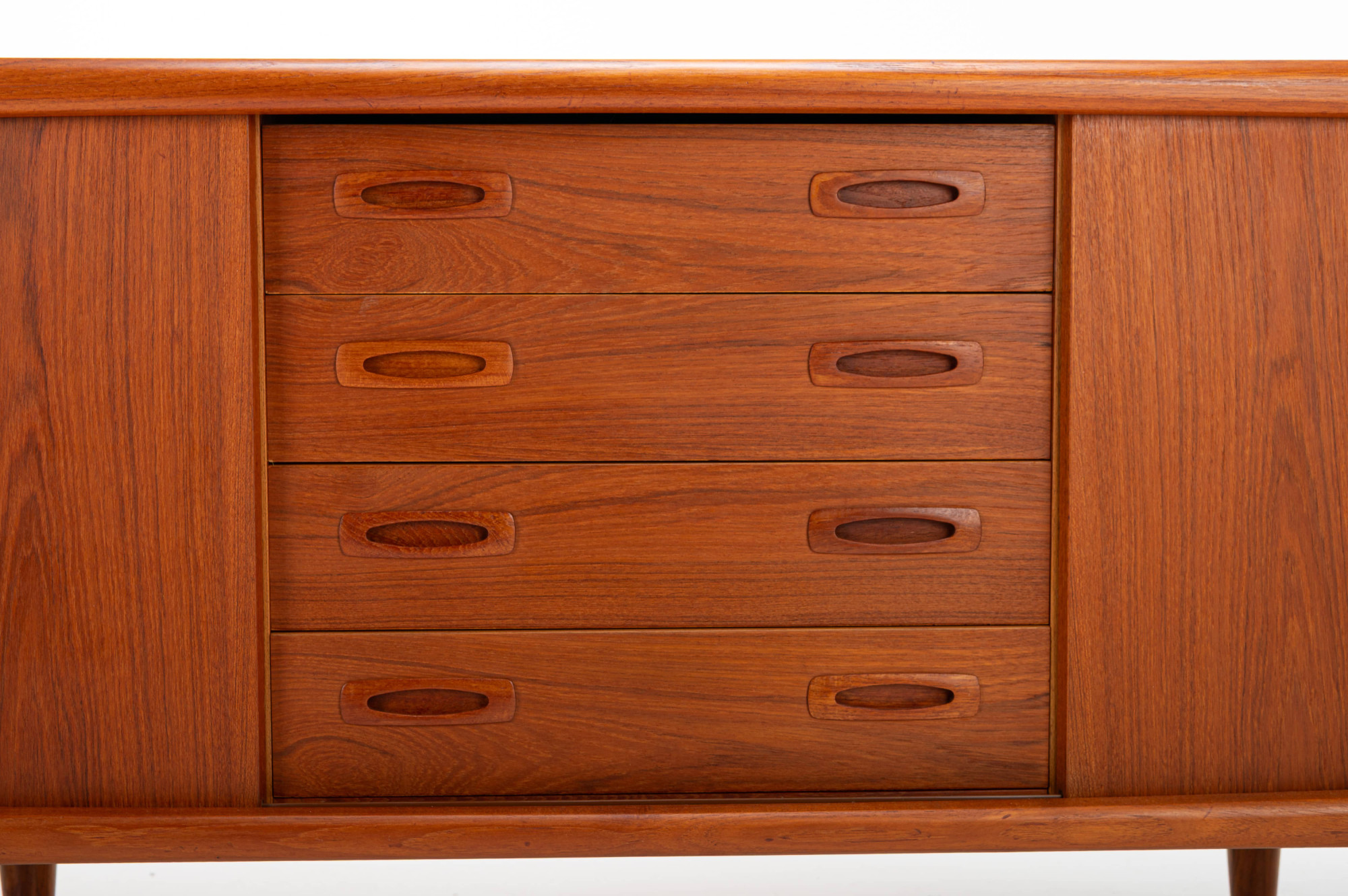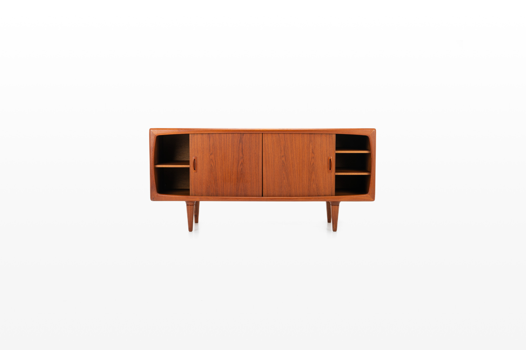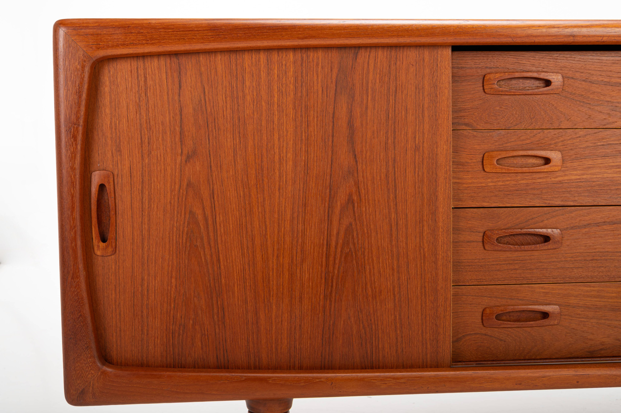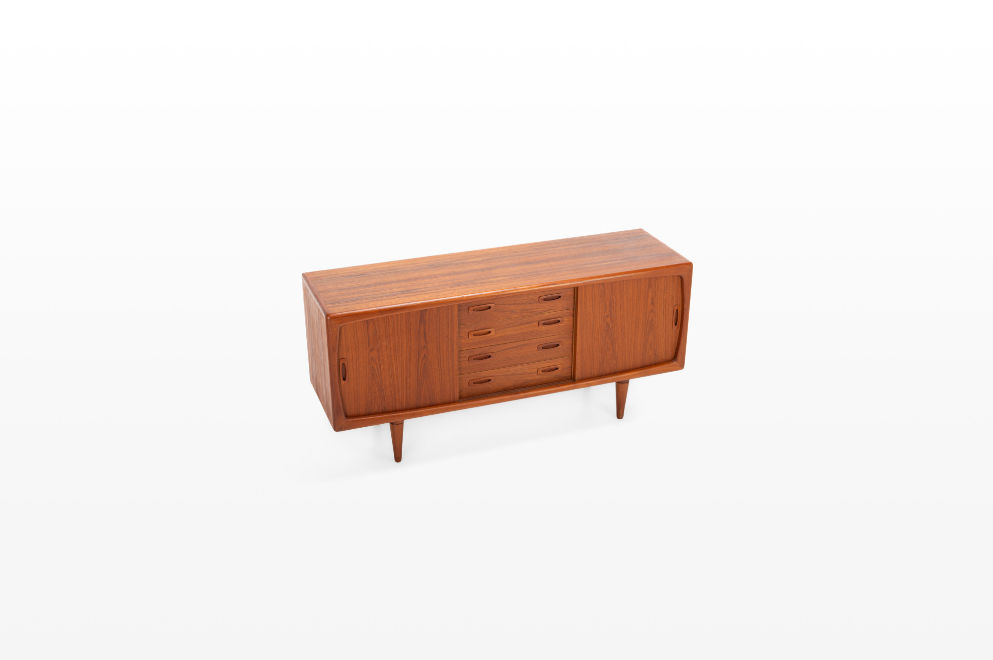This magnificent sideboard is produced by H.P. Hansen in Denmark in the 1960s. There are two sliding doors, four drawers and shelves. The sideboard is finished in teak and is in very good condition. This smaller version is marked by the producer.