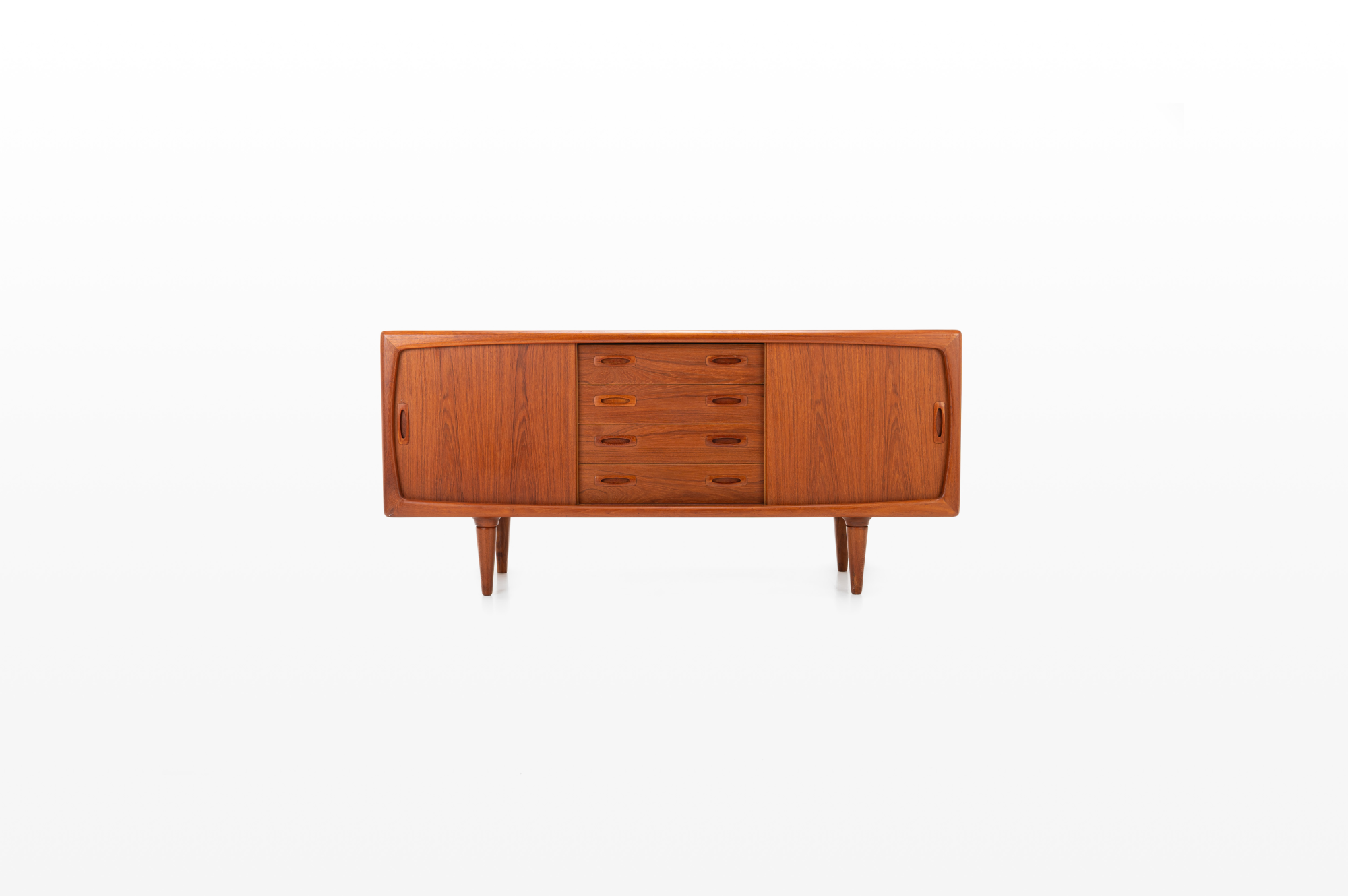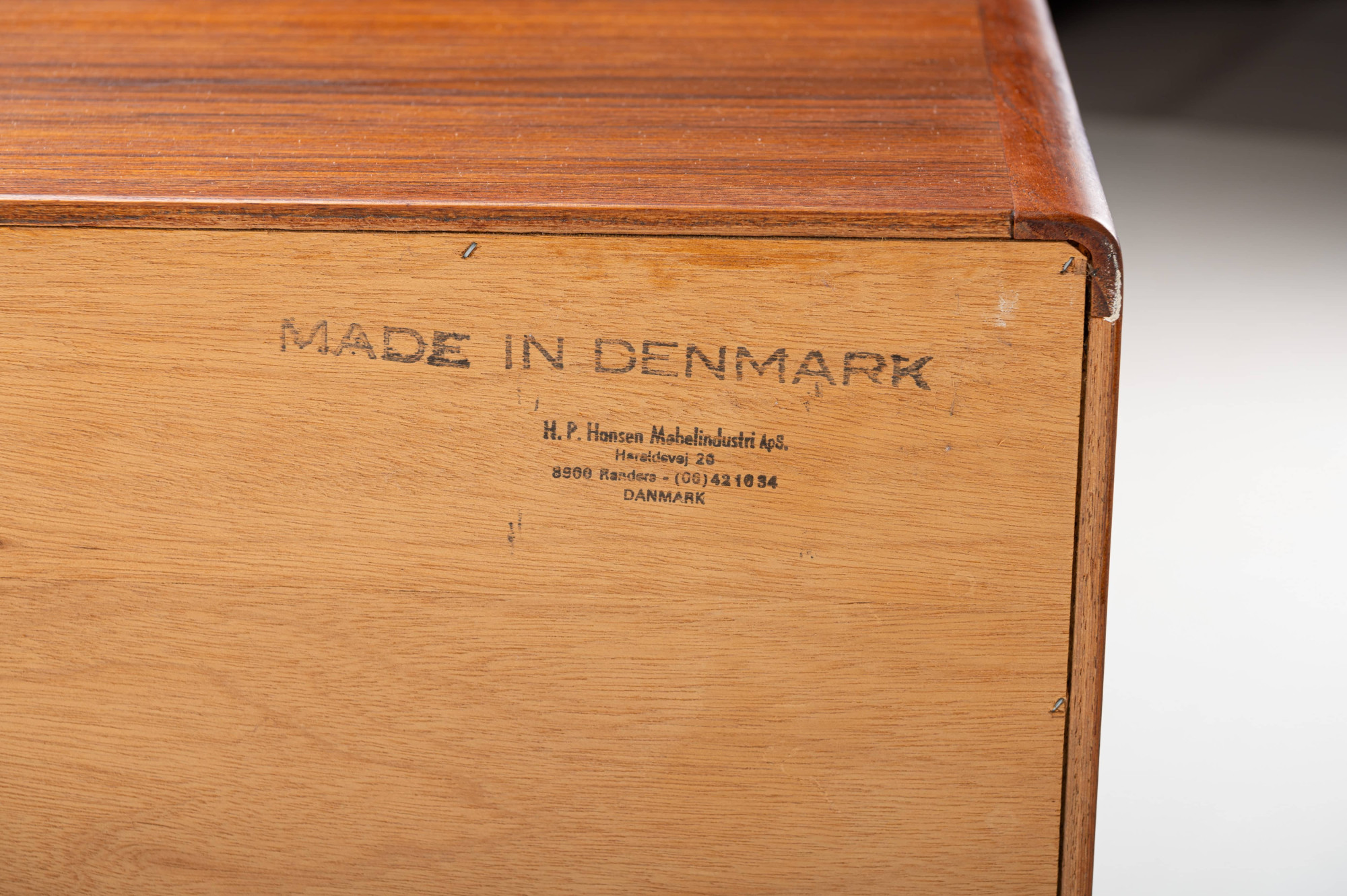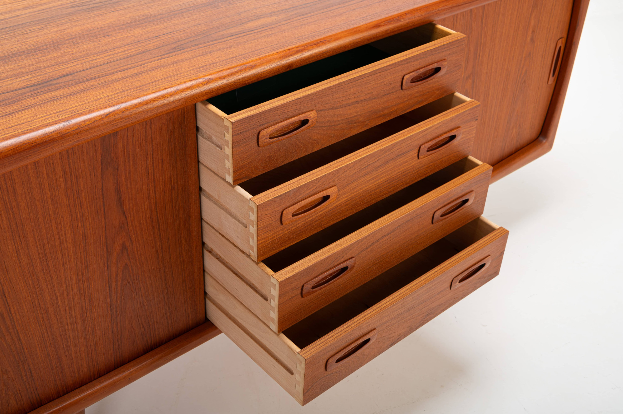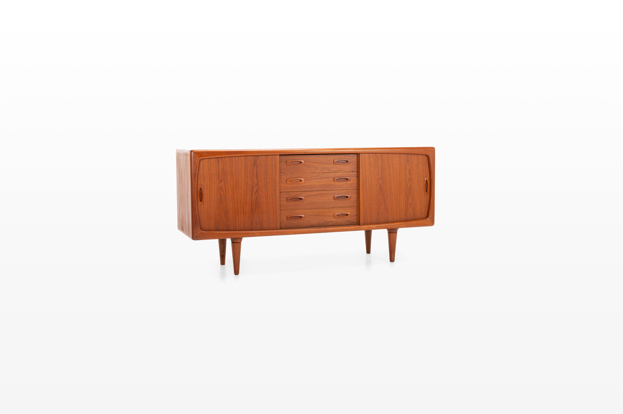 This magnificent sideboard is produced by H.P. Hansen in Denmark in the 1960s. There are two sliding doors, four drawers and shelves. The sideboard is finished in teak and is in very good condition. This smaller version is marked by the producer.