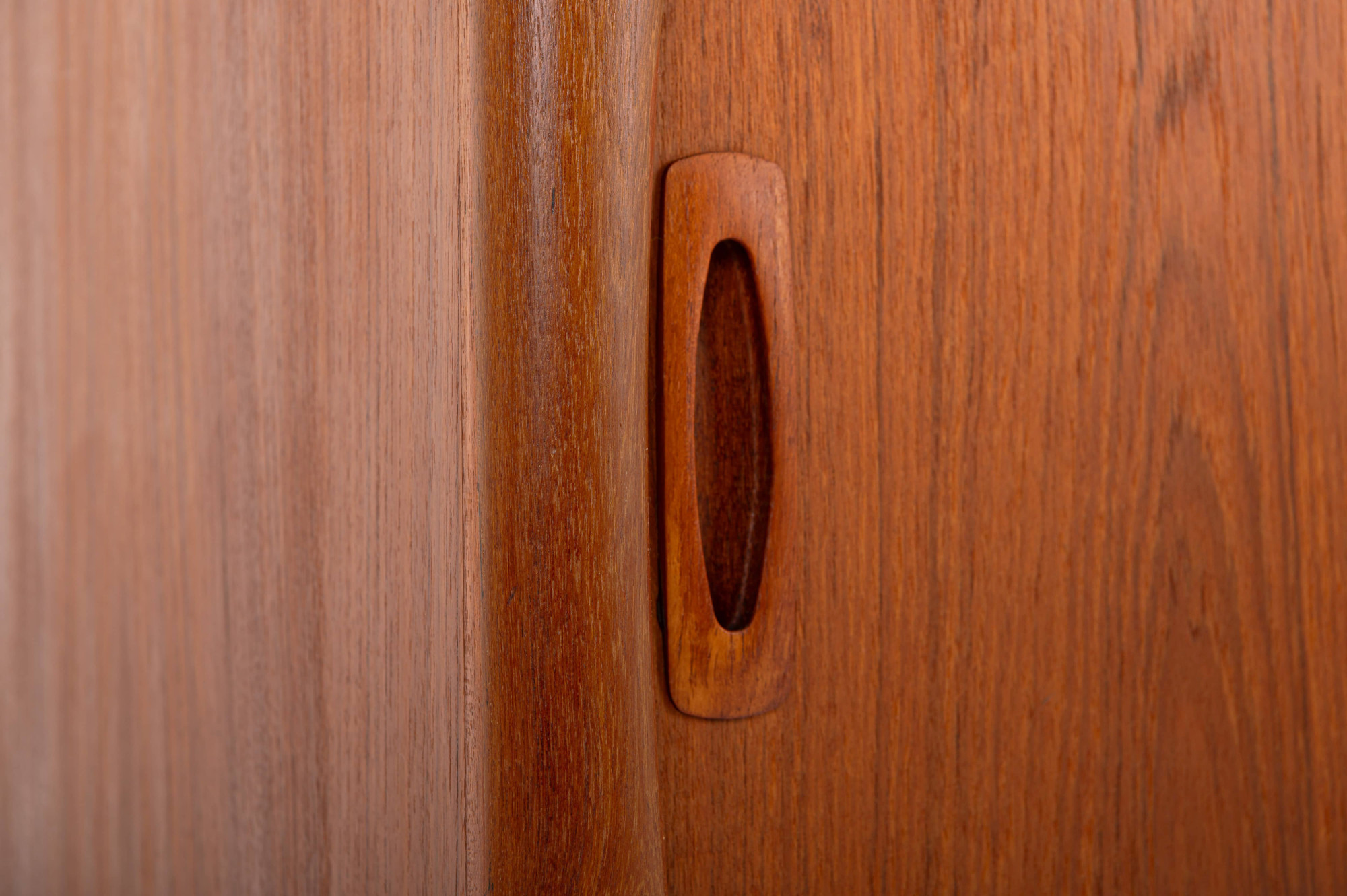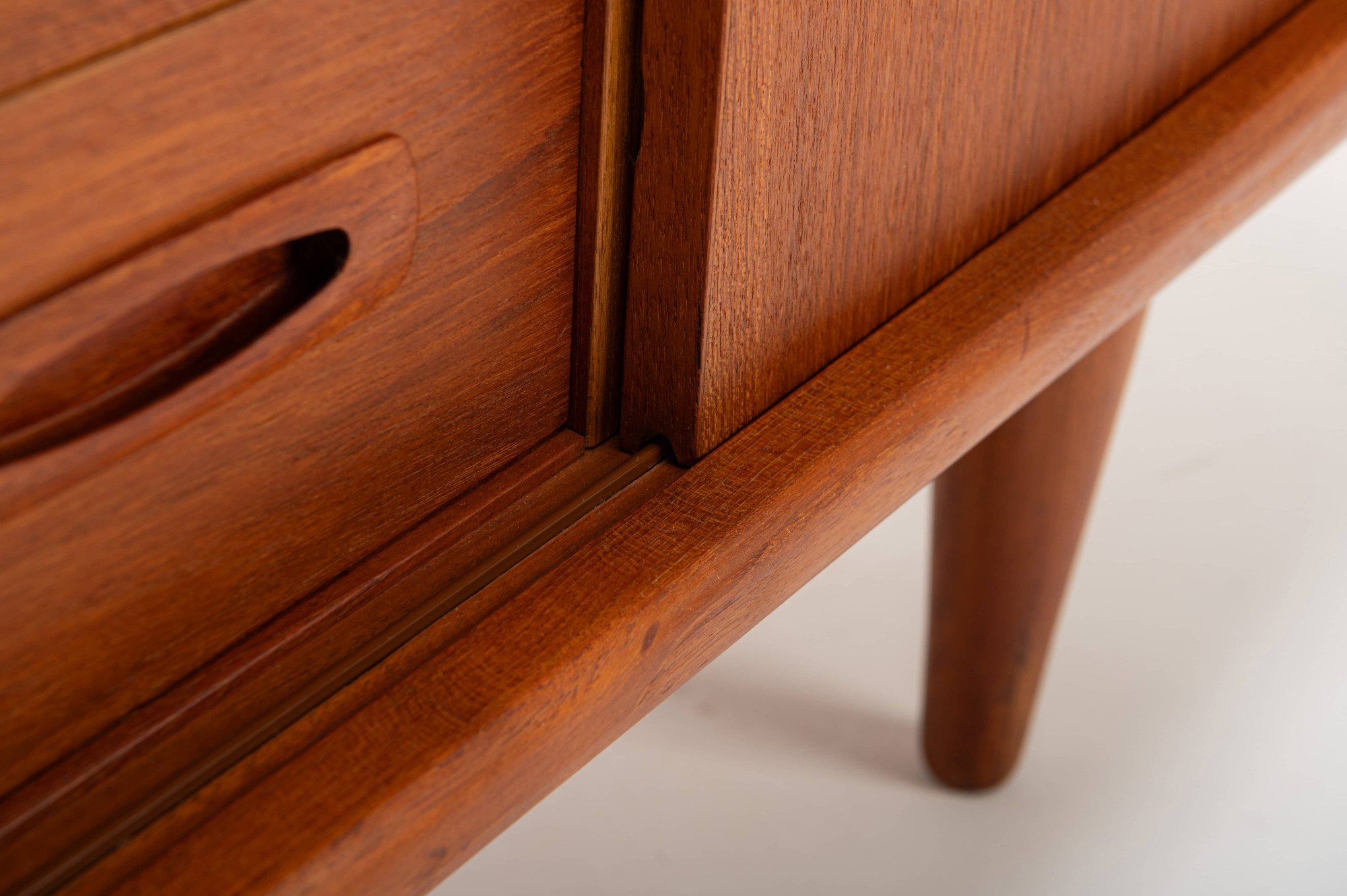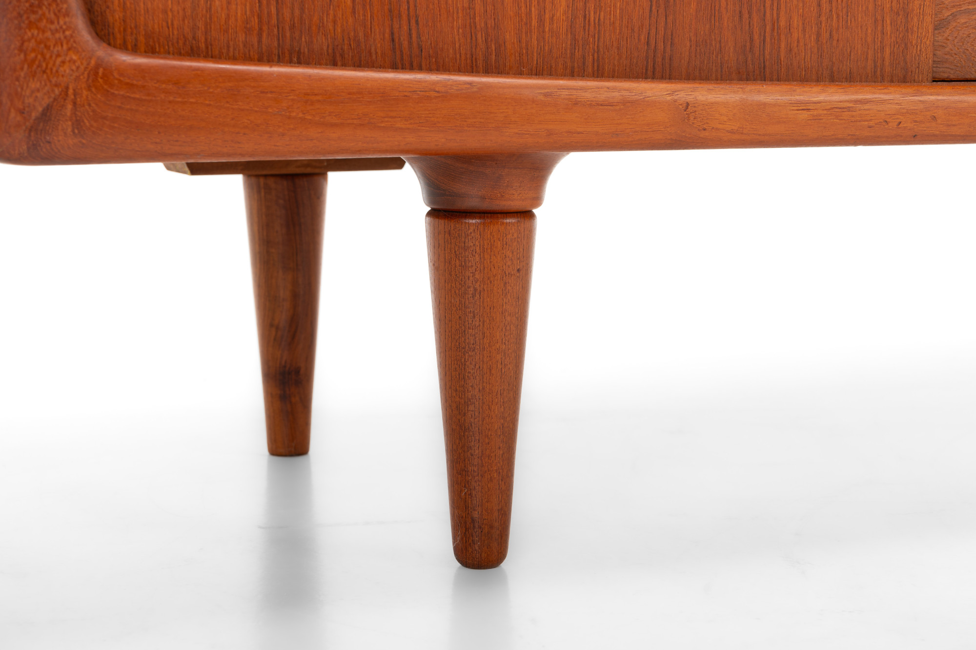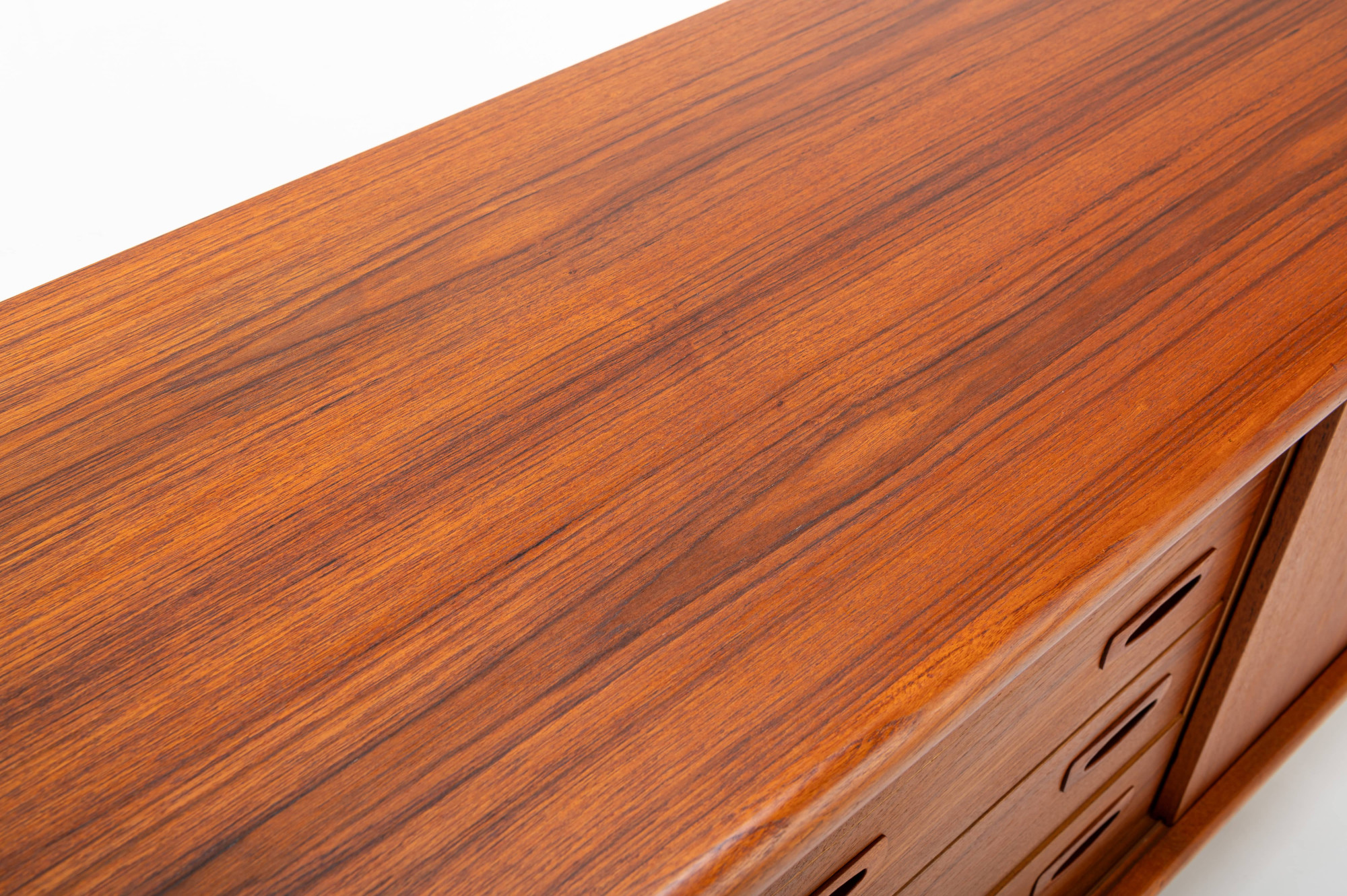 This magnificent sideboard is produced by H.P. Hansen in Denmark in the 1960s. There are two sliding doors, four drawers and shelves. The sideboard is finished in teak and is in very good condition. This smaller version is marked by the producer.