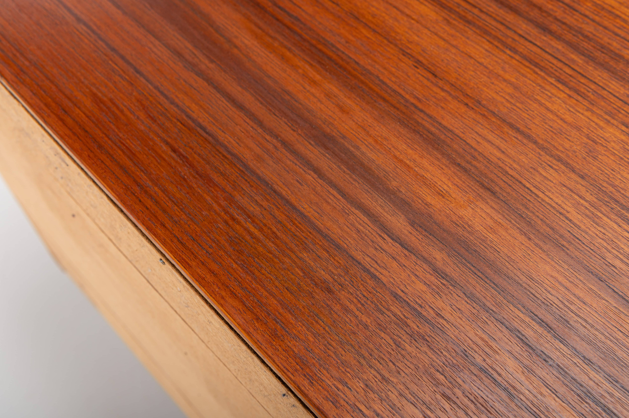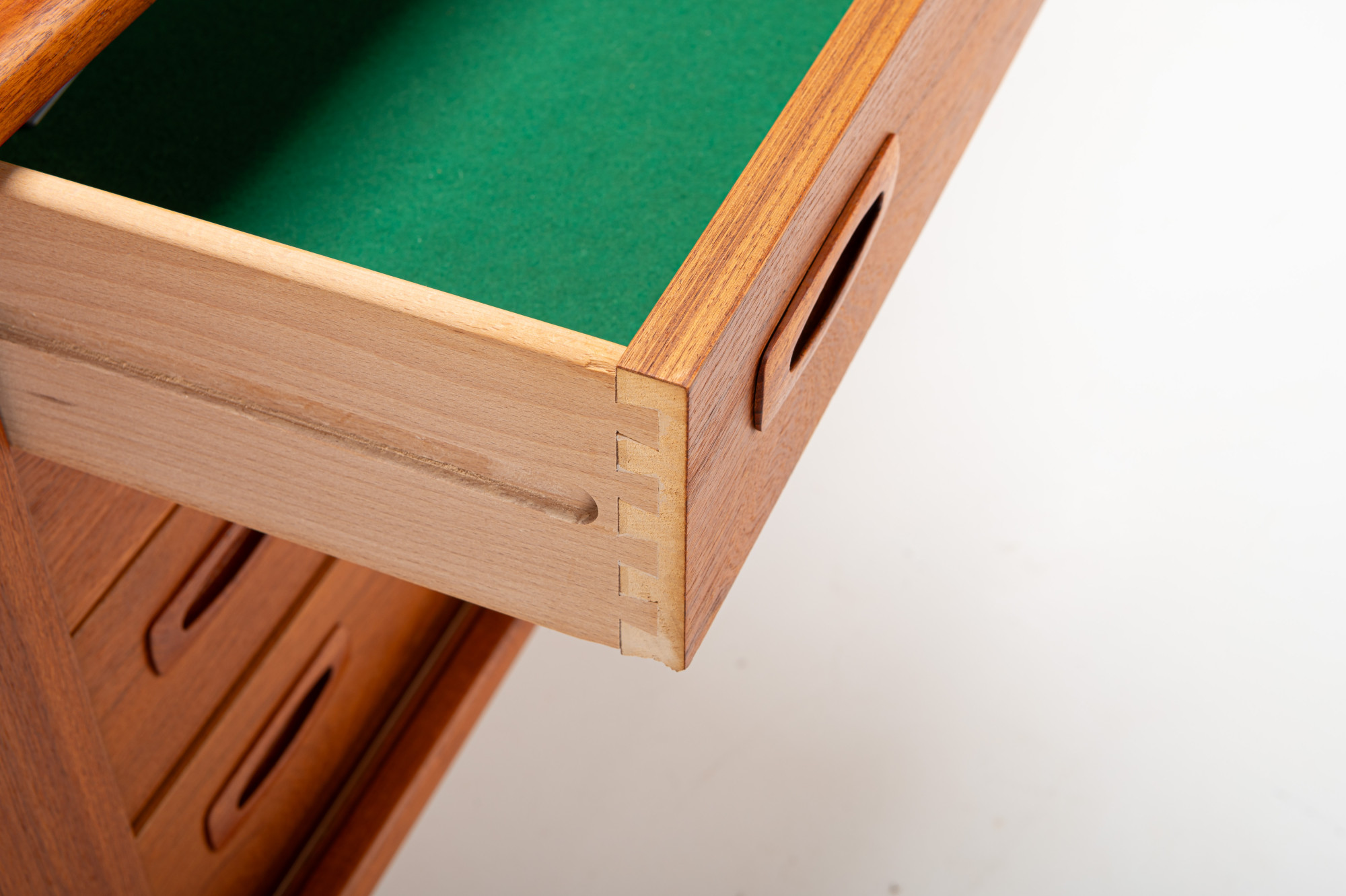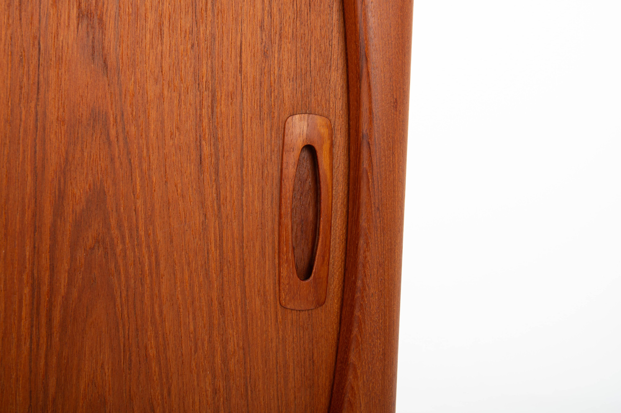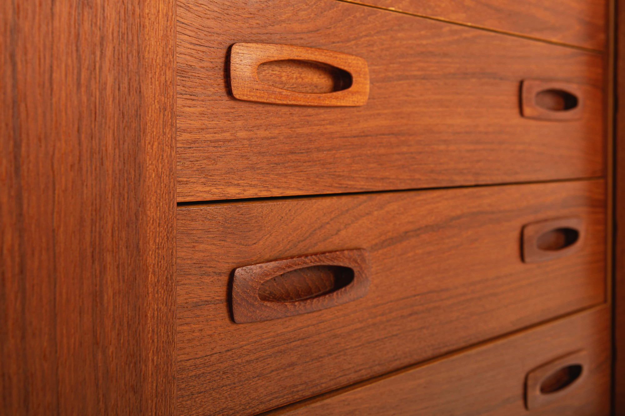 This magnificent sideboard is produced by H.P. Hansen in Denmark in the 1960s. There are two sliding doors, four drawers and shelves. The sideboard is finished in teak and is in very good condition. This smaller version is marked by the producer.