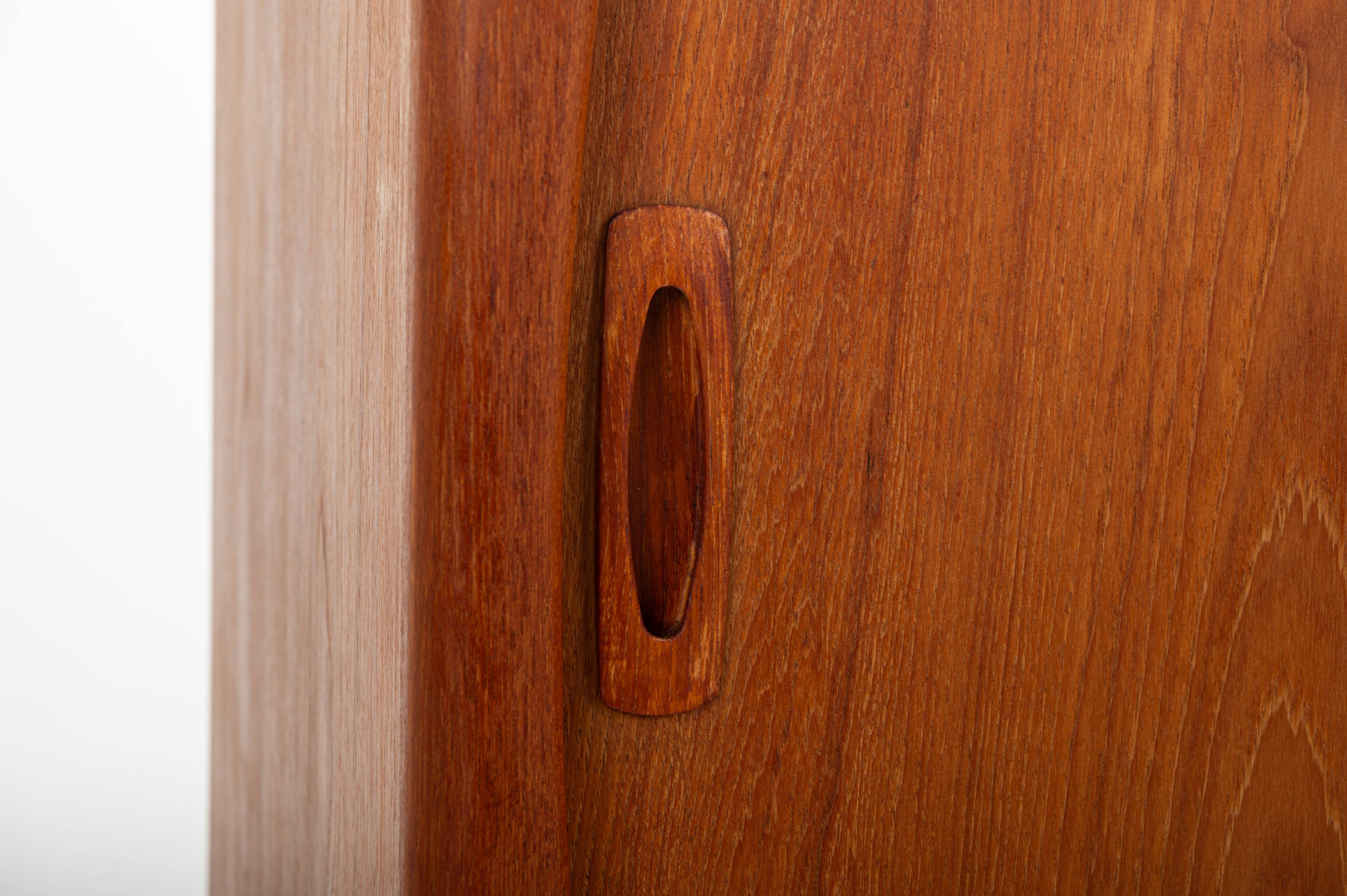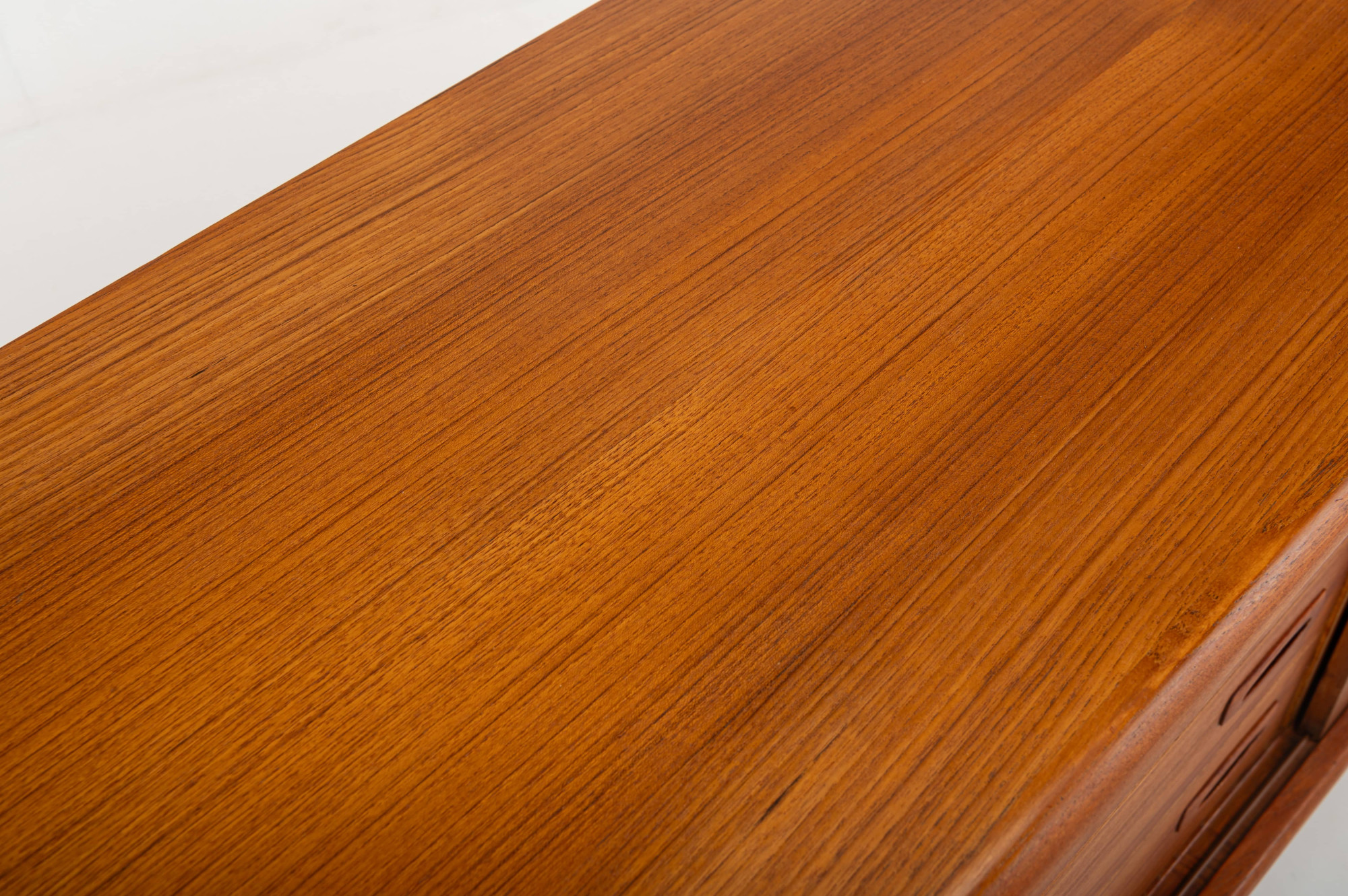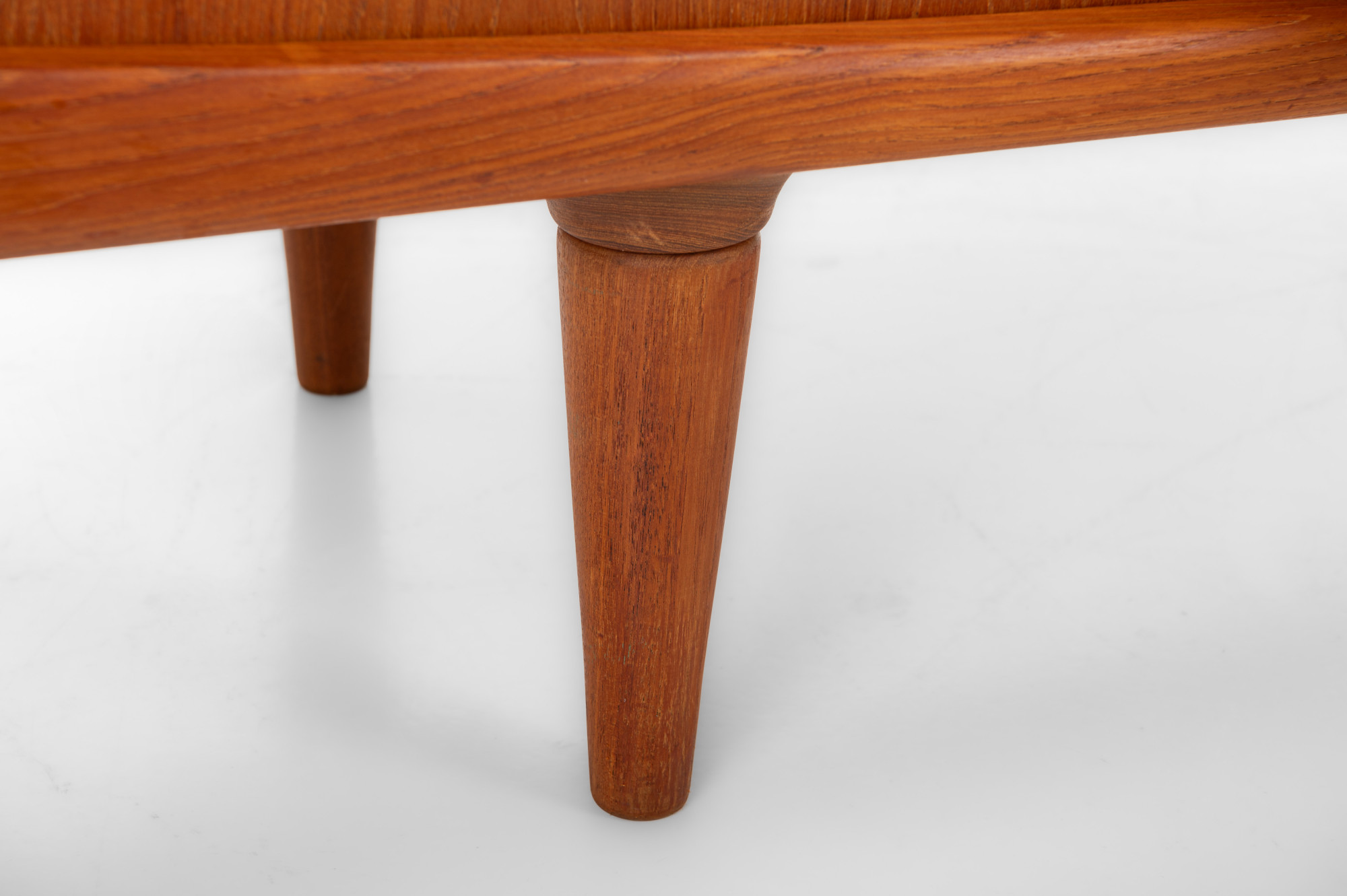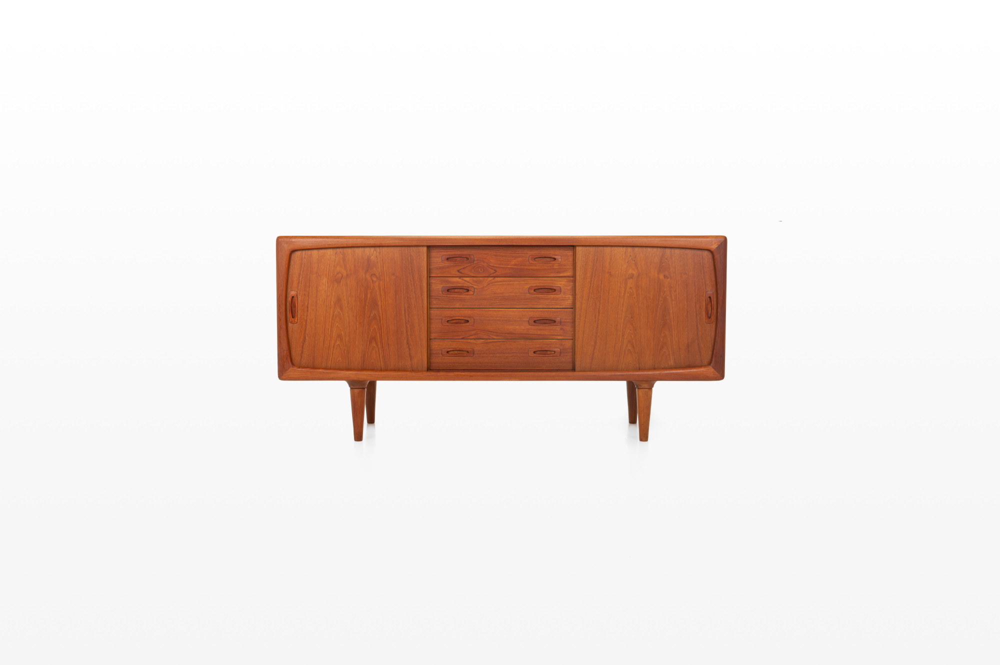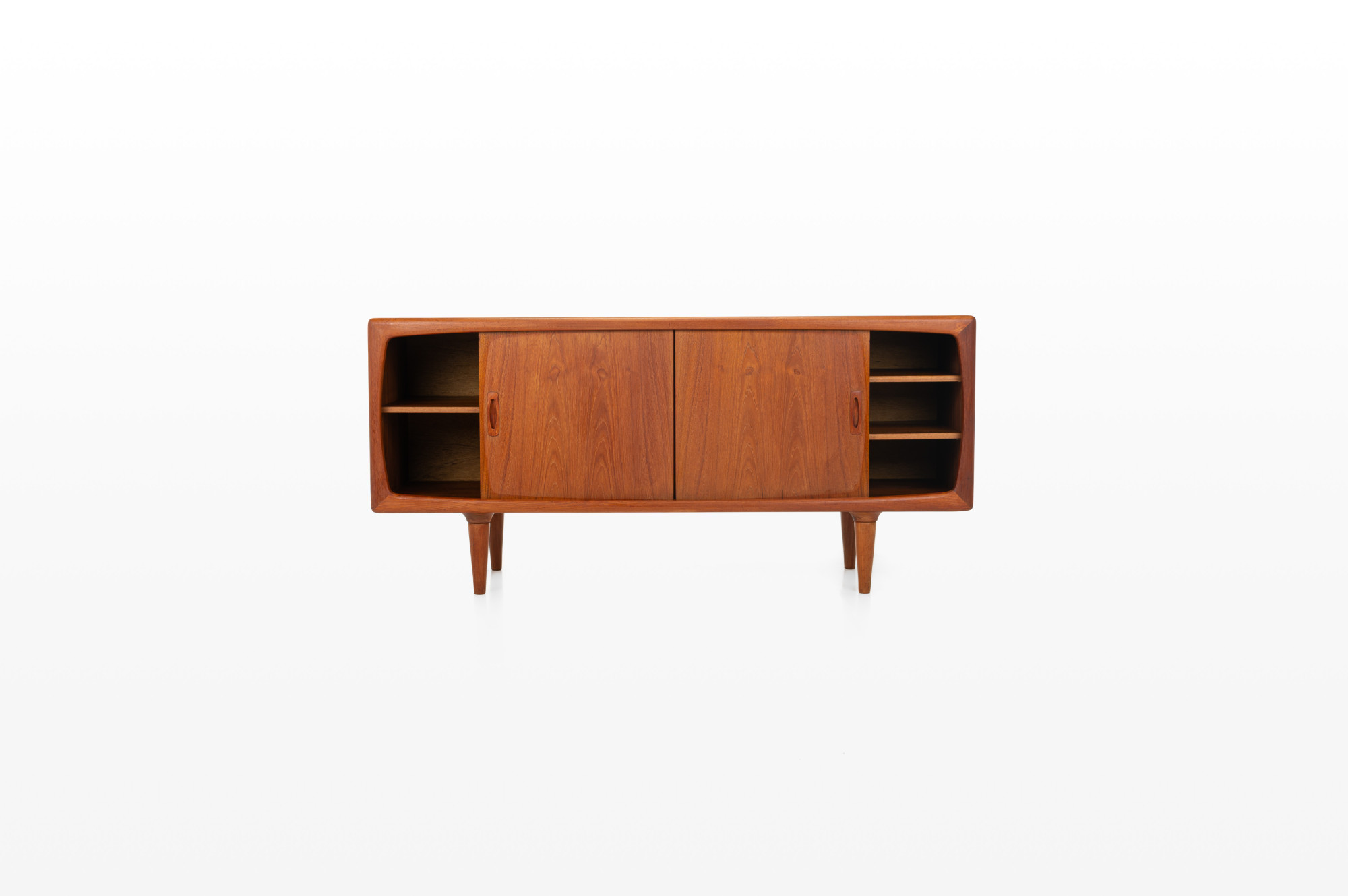 This magnificent sideboard is produced by H.P. Hansen in Denmark in the 1960s. There are two sliding doors, four drawers and shelves. The sideboard is finished in teak and is in very good condition. This smaller version is marked by the producer.