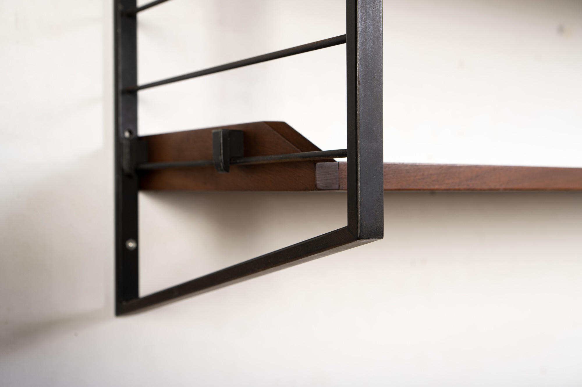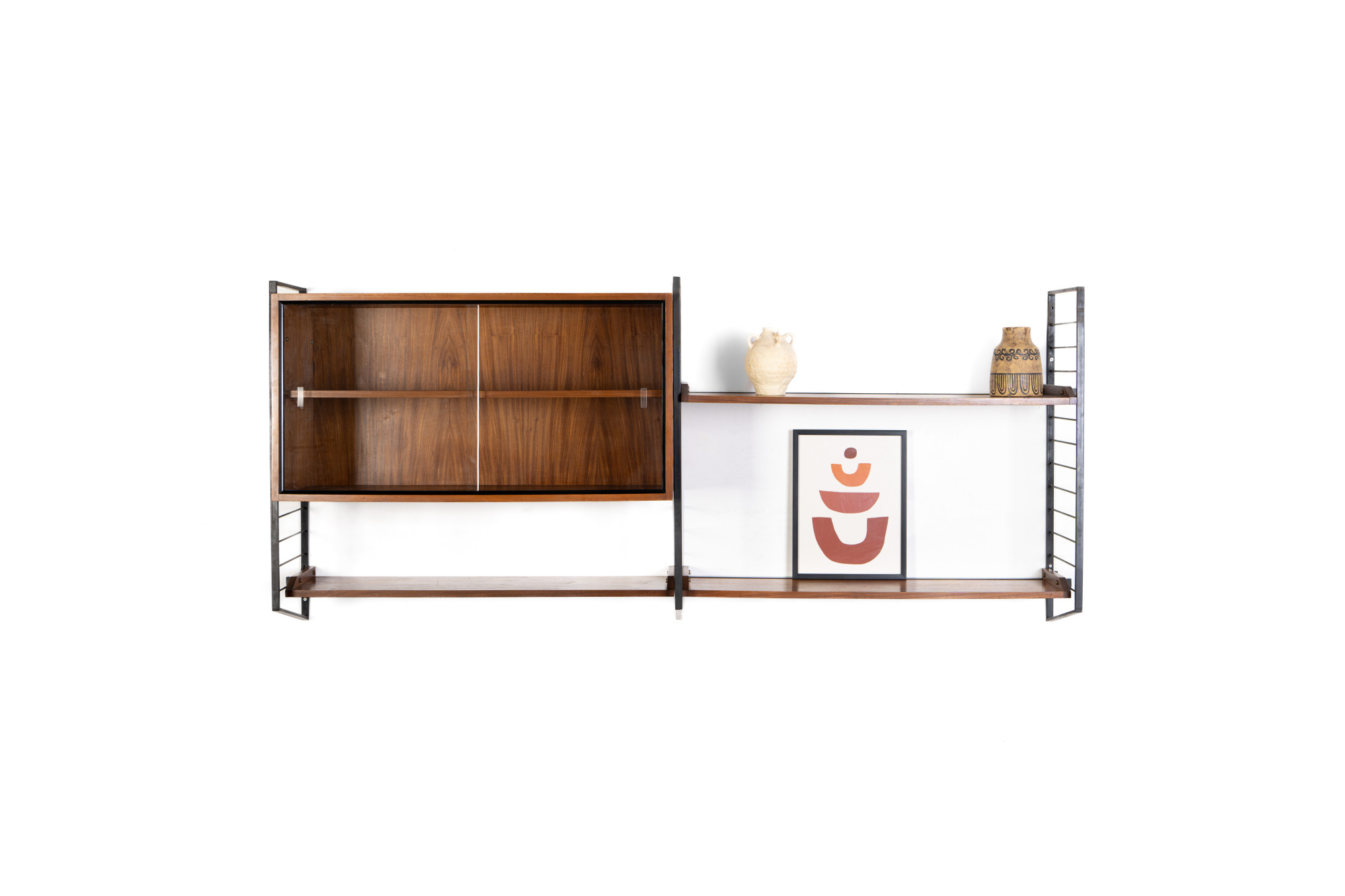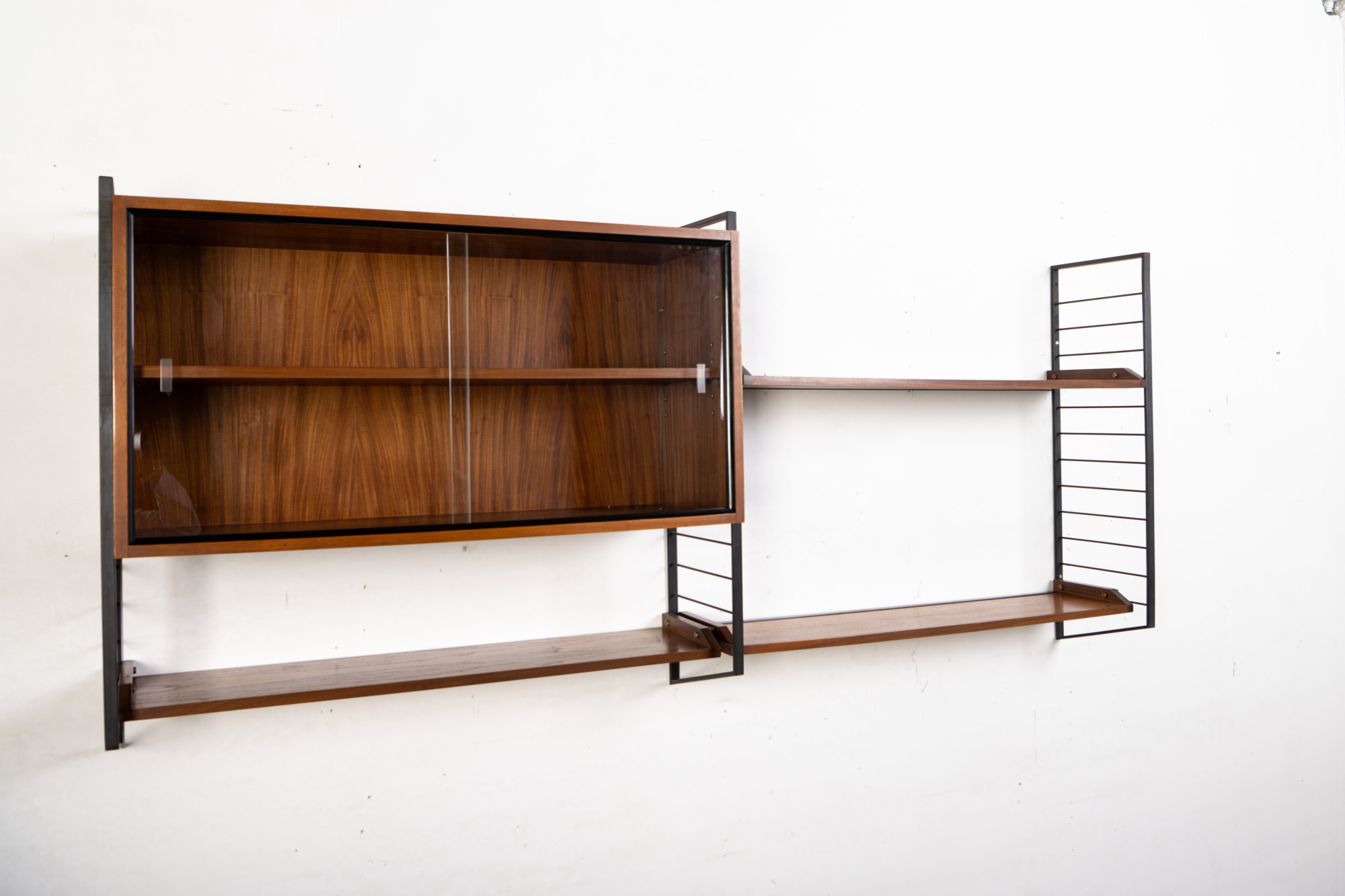 Vintage wall unit by Combineurop, Belgium. This setup includes a display cabinet, black metal hooks and teak wood shelves. Always adaptable and further expandable.