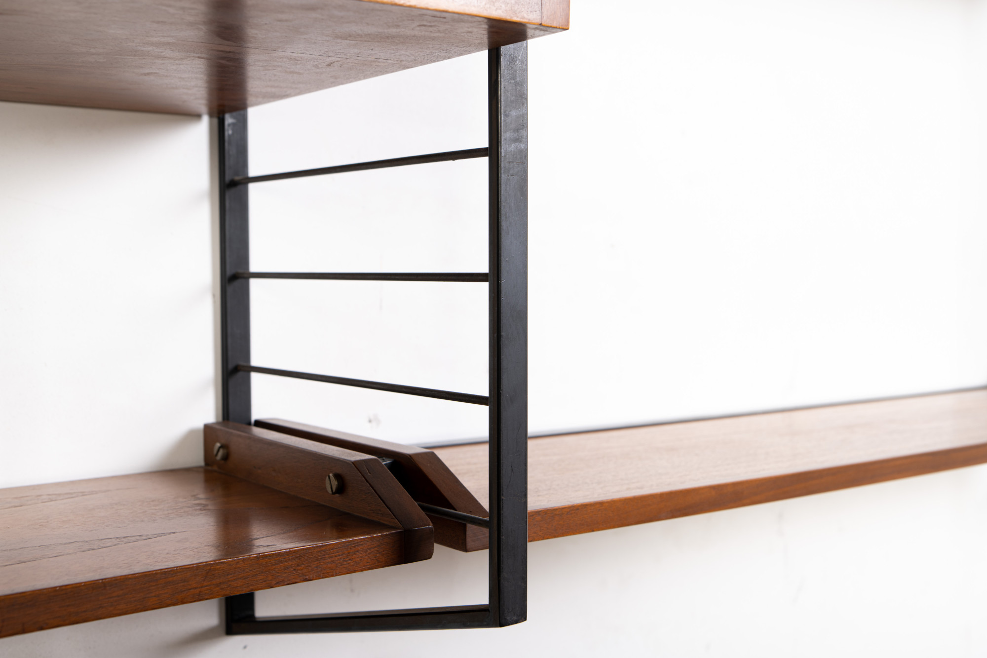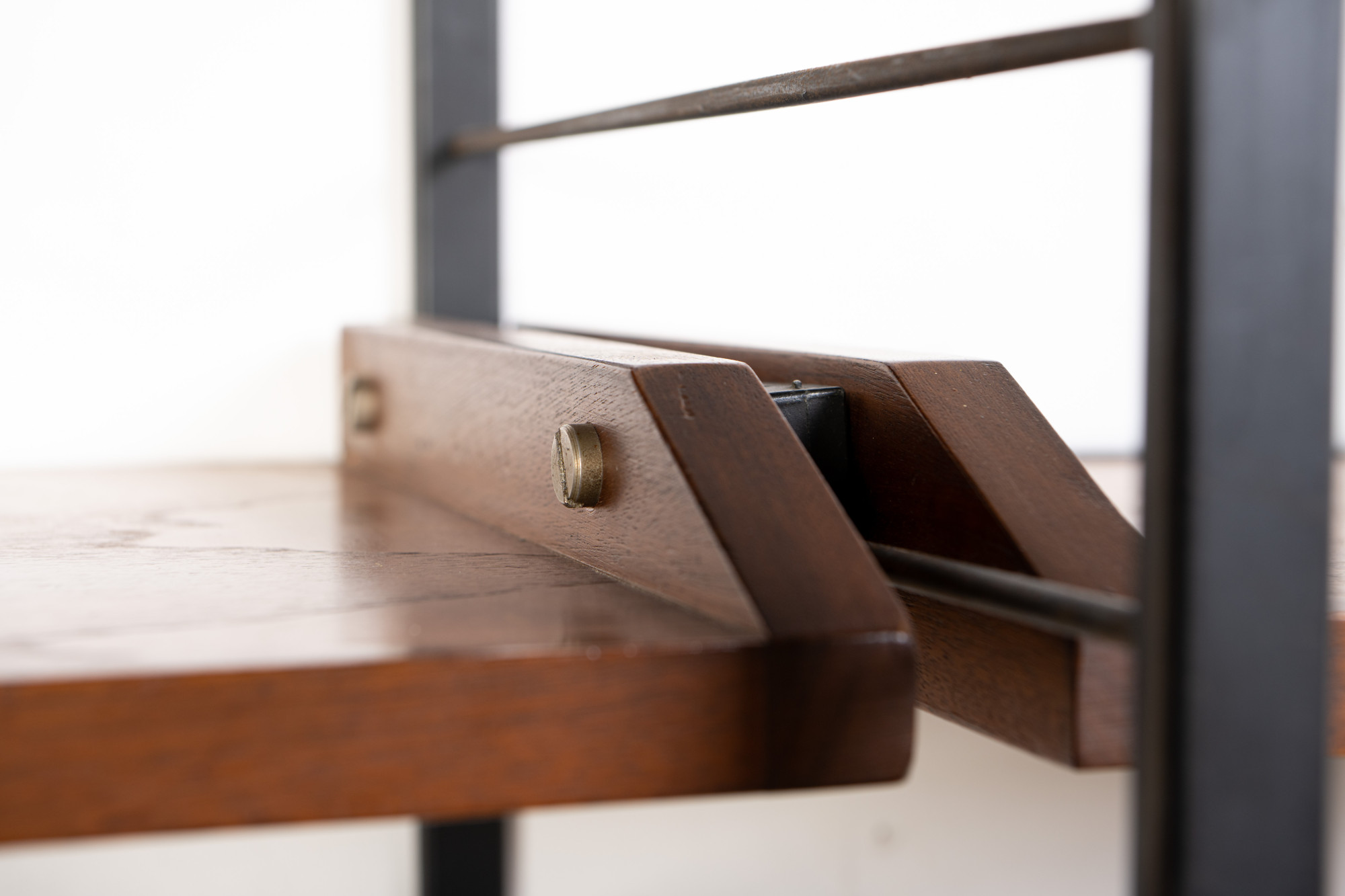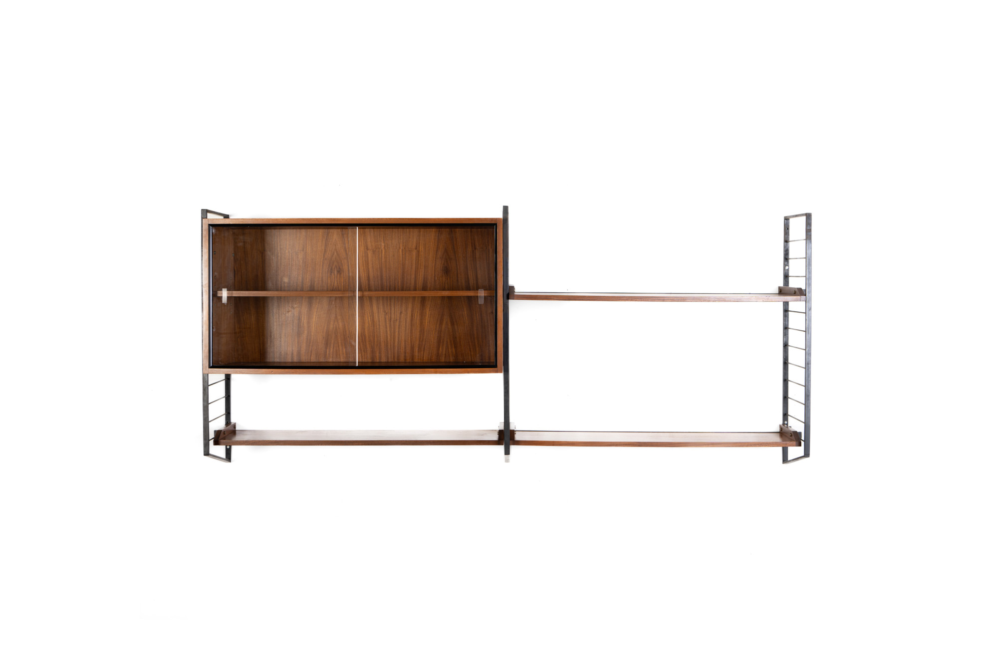 Vintage wall unit by Combineurop, Belgium. This setup includes a display cabinet, black metal hooks and teak wood shelves. Always adaptable and further expandable.