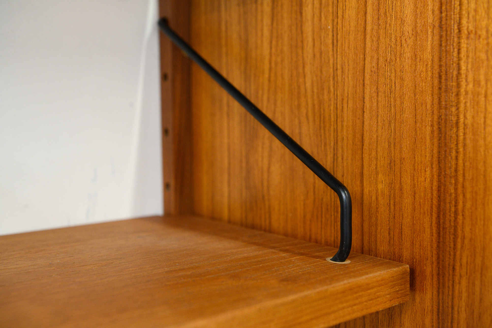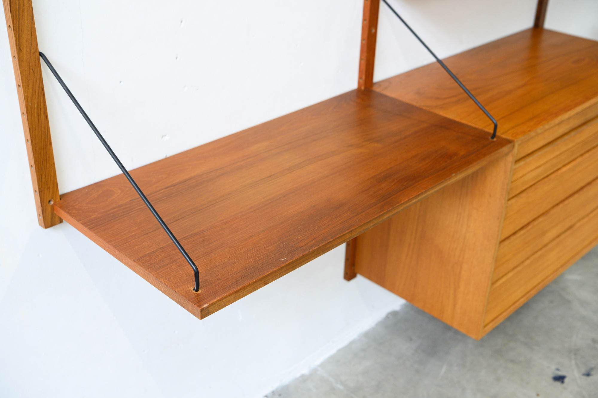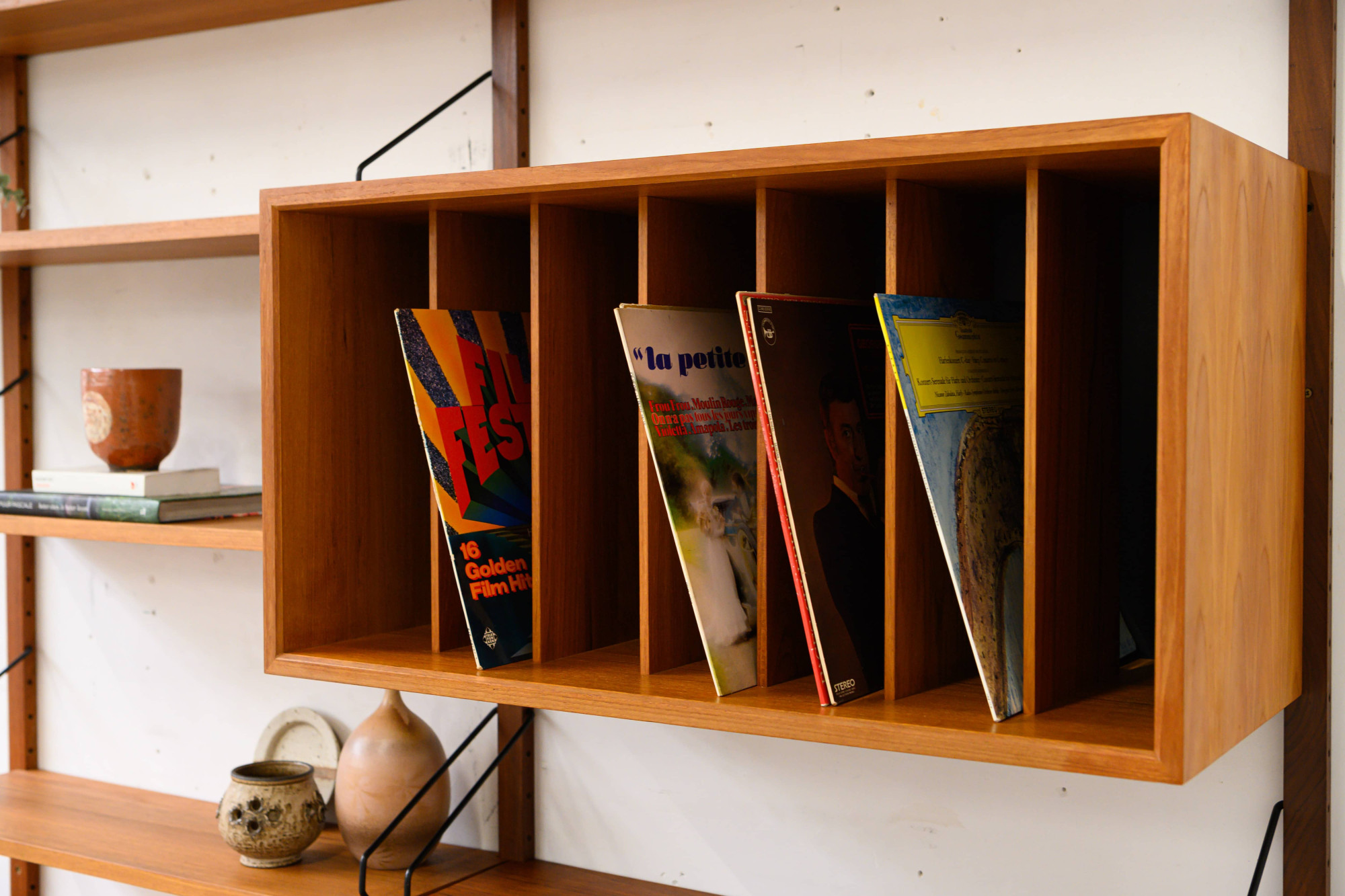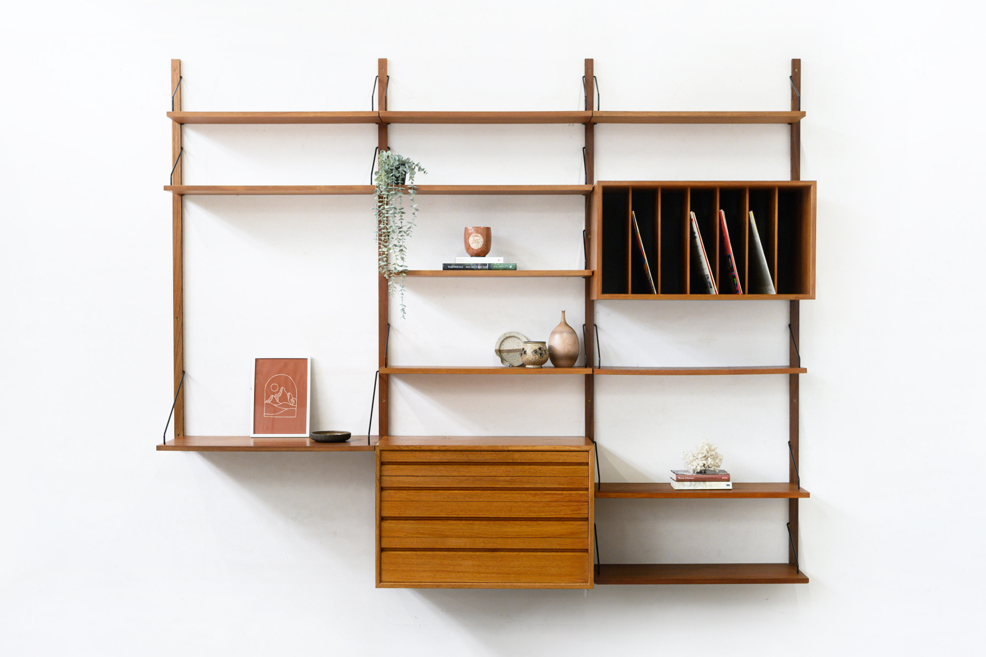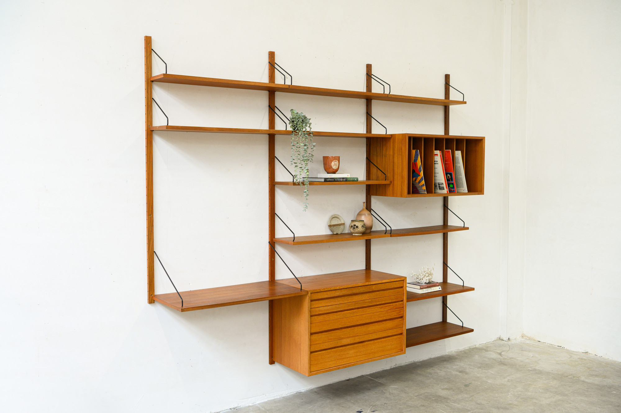 Danish modular wall unit by Poul Cadovius for Royal System. This teak setup has one storage cabinet, one LP cabinet, one desk shelf and ten bookshelves. Always adaptable and further expandable.