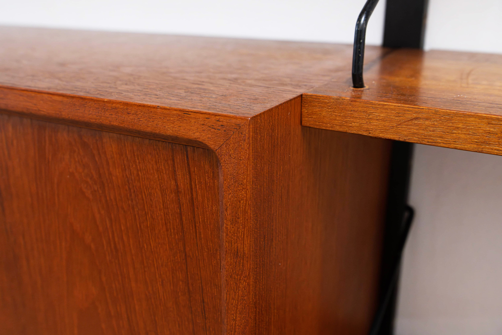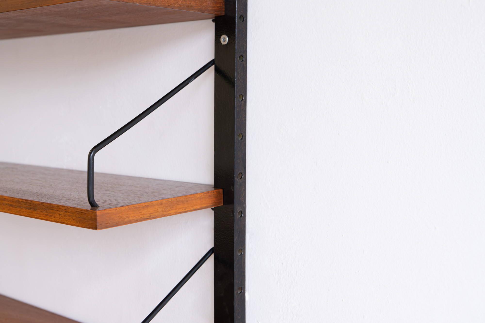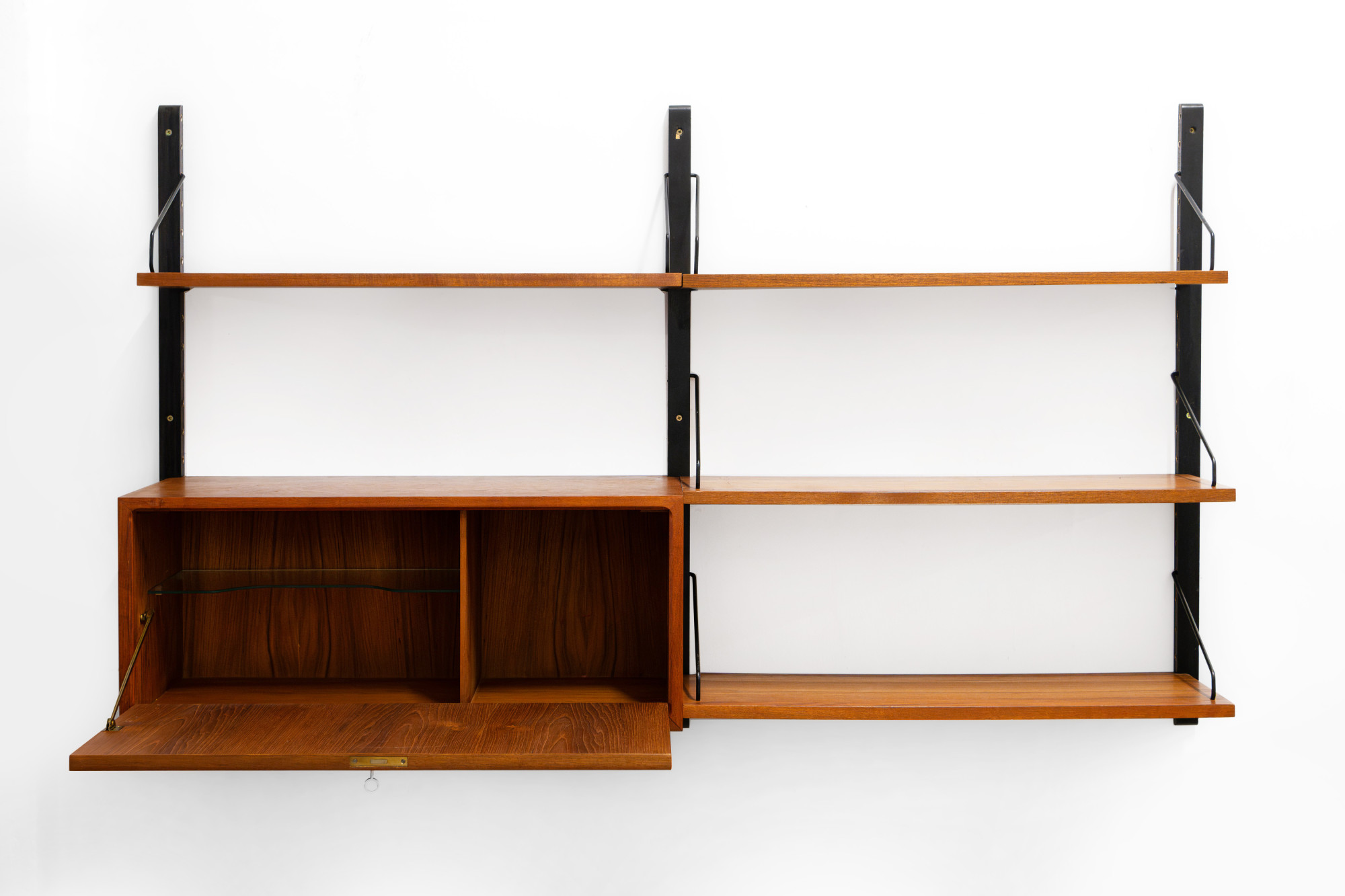Danish modular wall unit by Poul Cadovius for Royal System. This teak setup with black lats has one storage cabinet and four bookshelves. Always adaptable and further expandable.