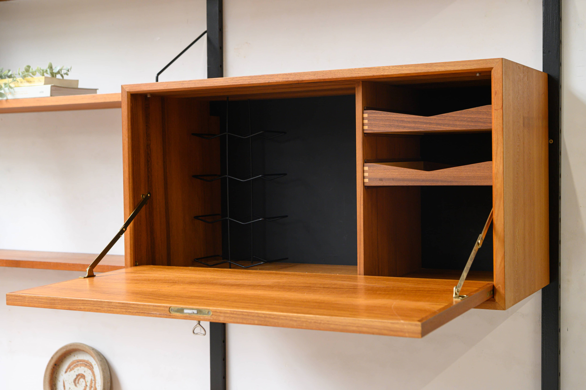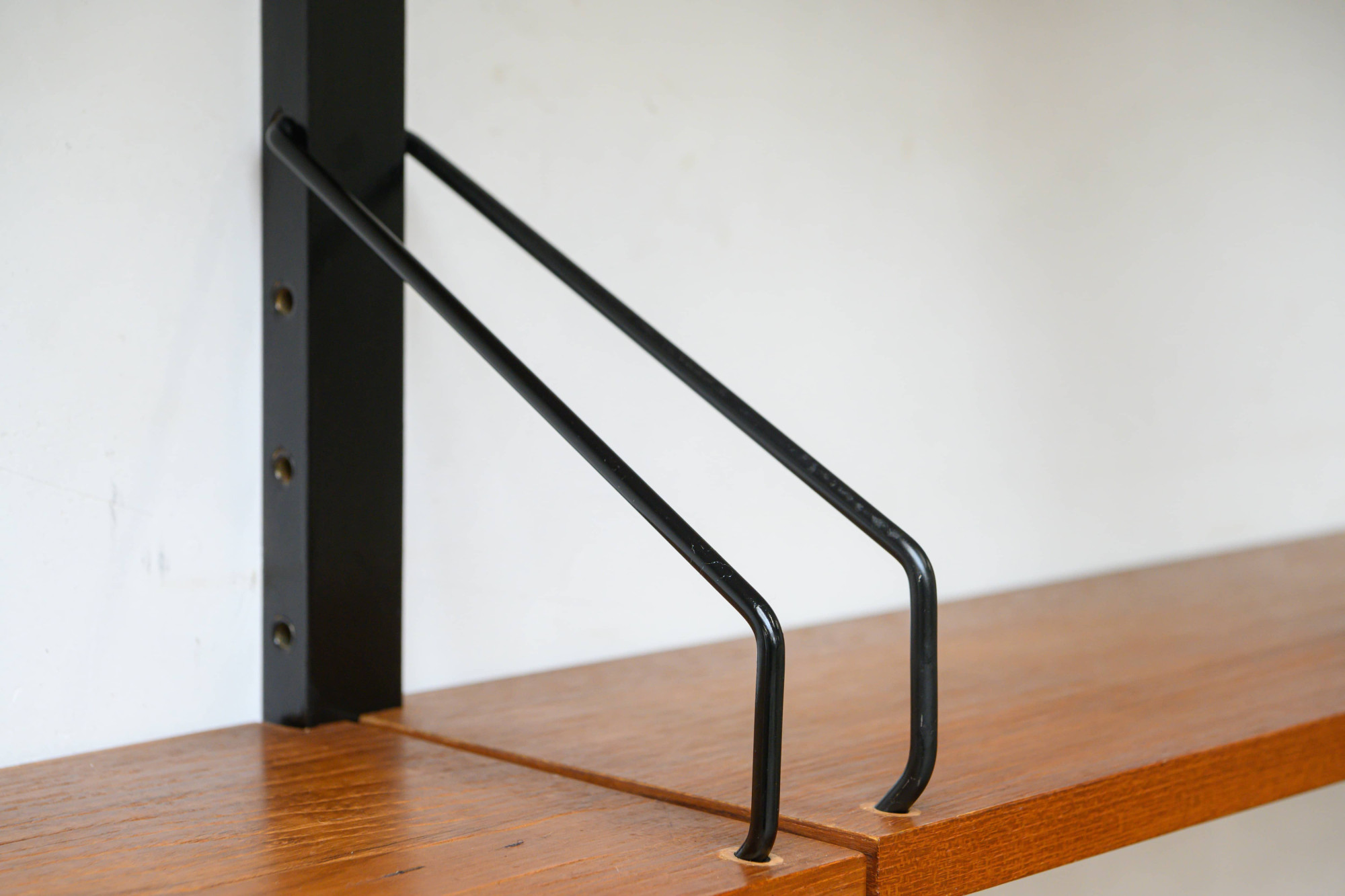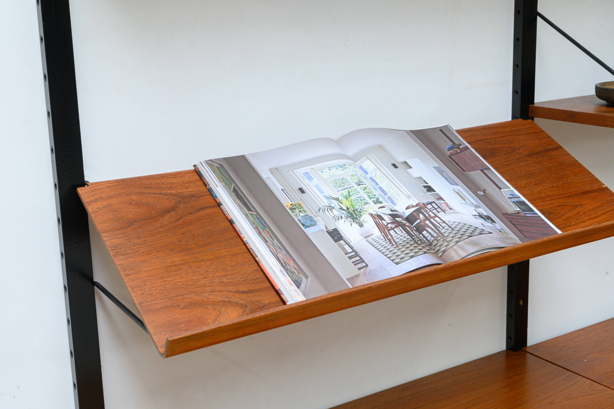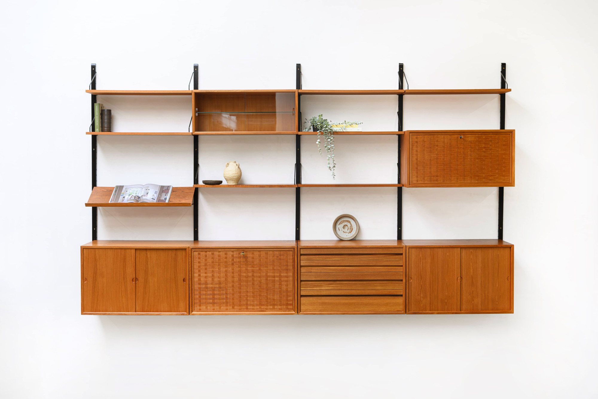 Danish modular wall unit by Poul Cadovius for Royal System. This teak setup has five storage cabinets, one display cabinet, one reading shelf, five wooden wall lats and seven bookshelves. Always adaptable and further expandable.