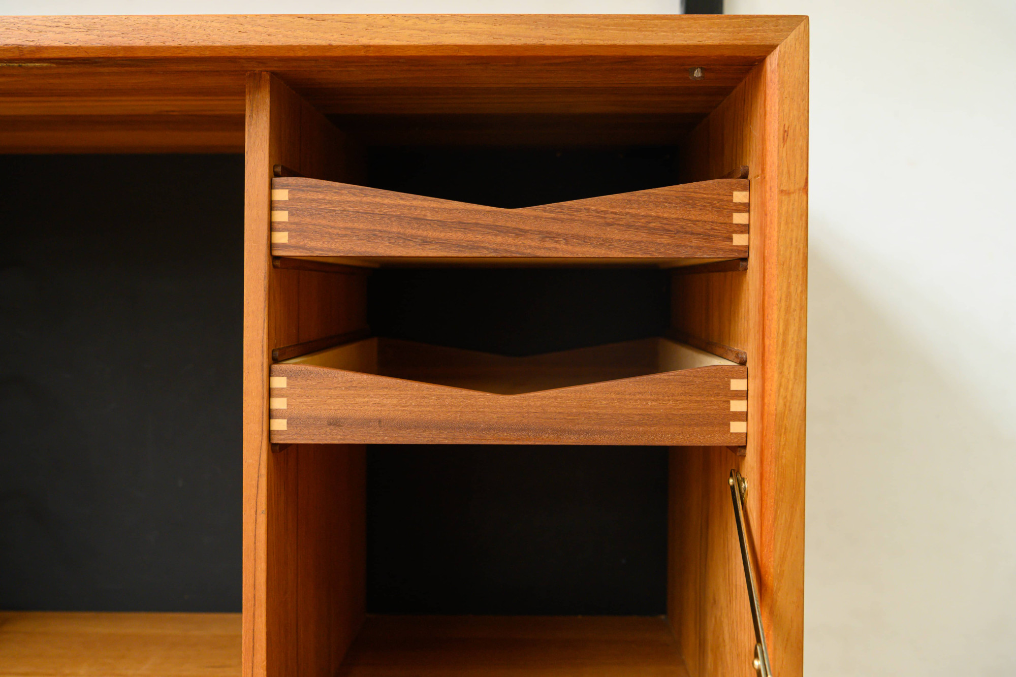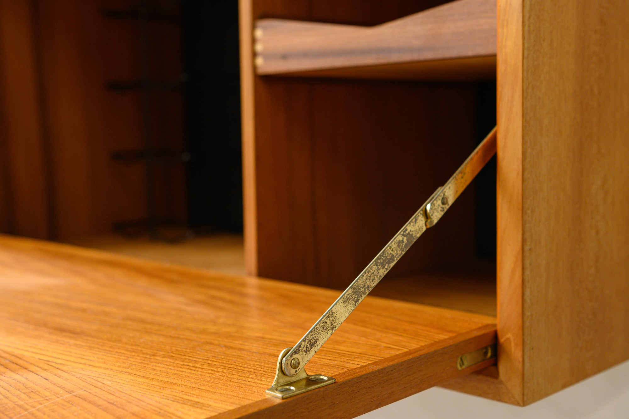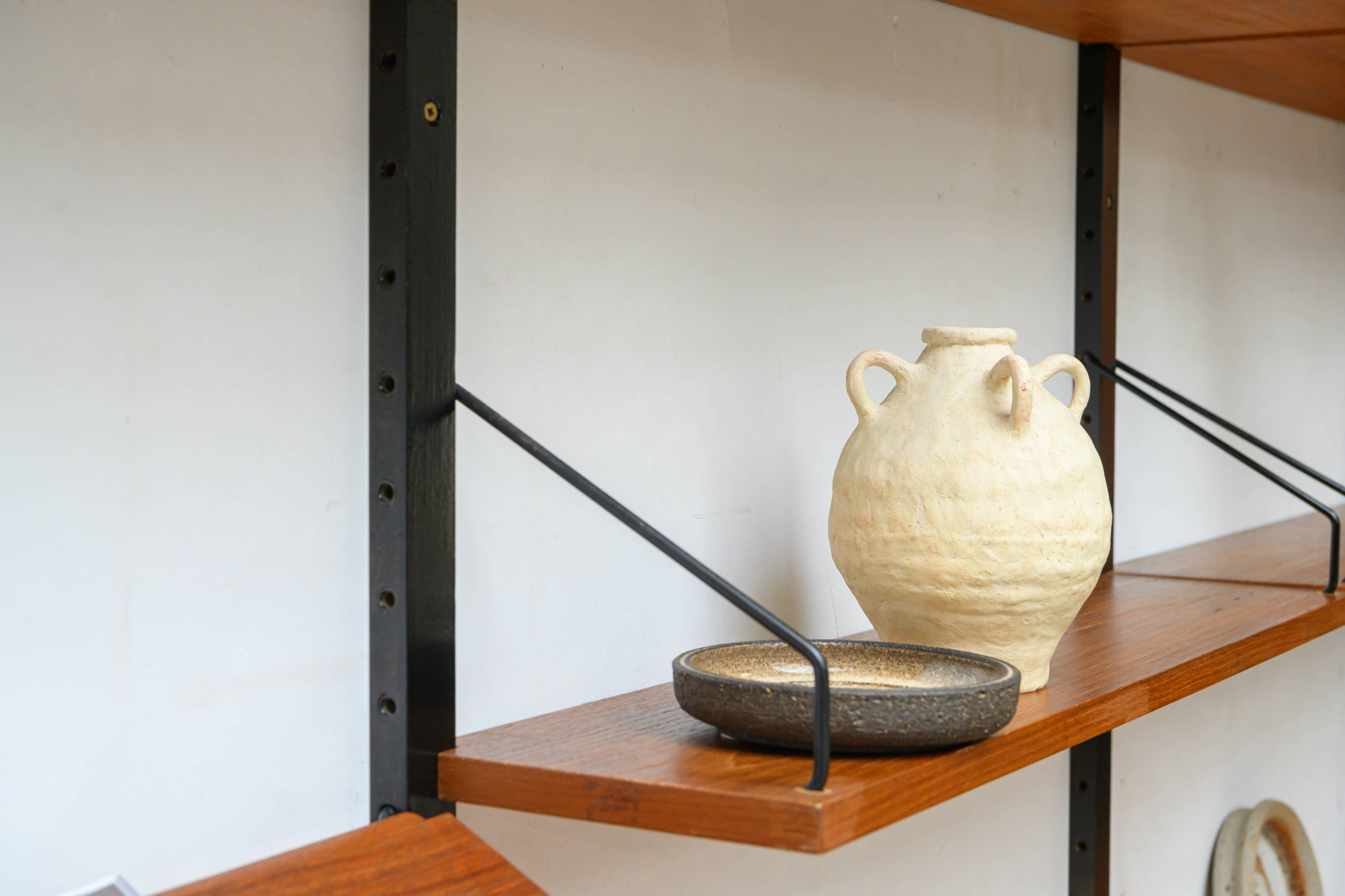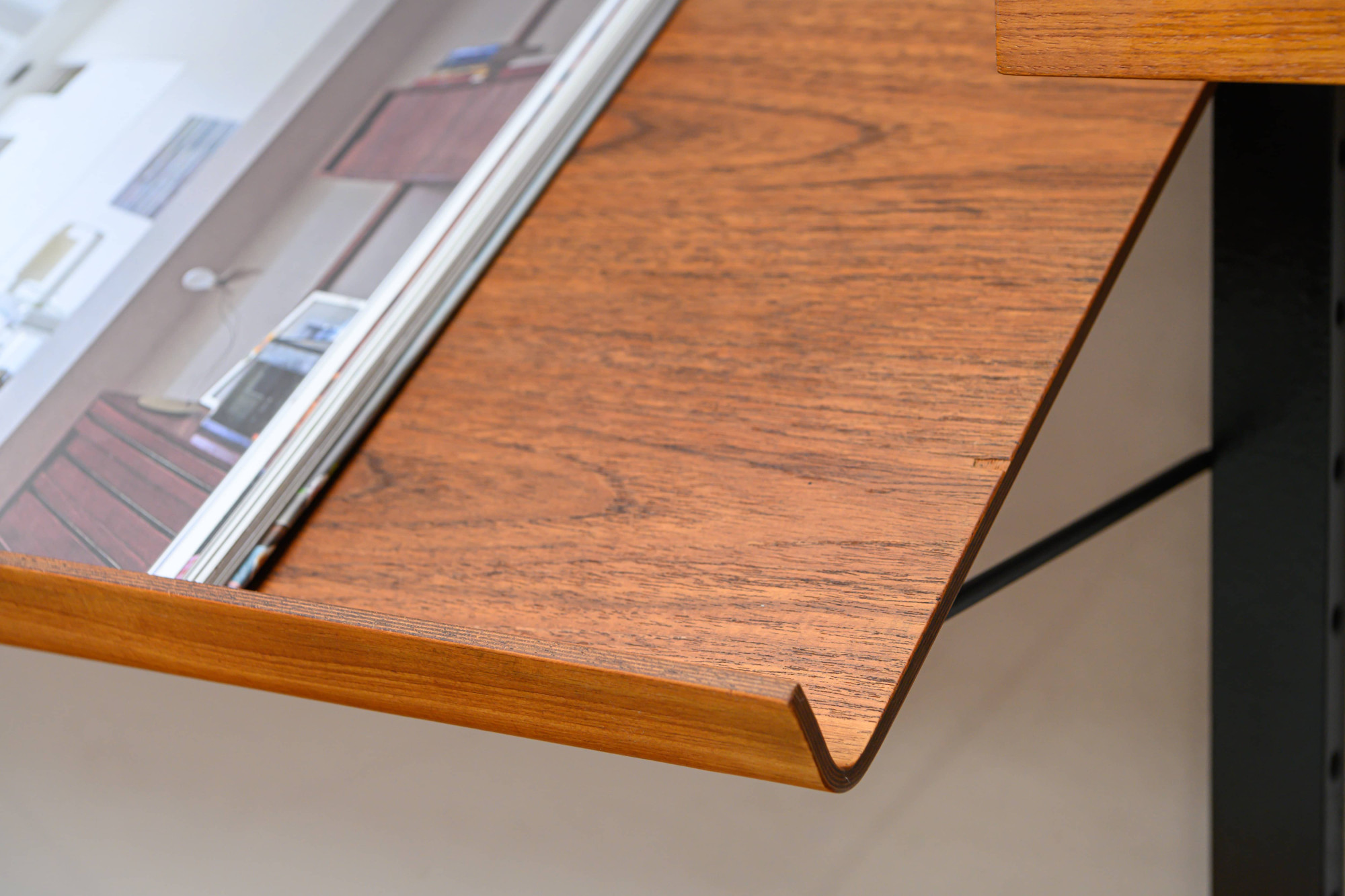 Danish modular wall unit by Poul Cadovius for Royal System. This teak setup has five storage cabinets, one display cabinet, one reading shelf, five wooden wall lats and seven bookshelves. Always adaptable and further expandable.