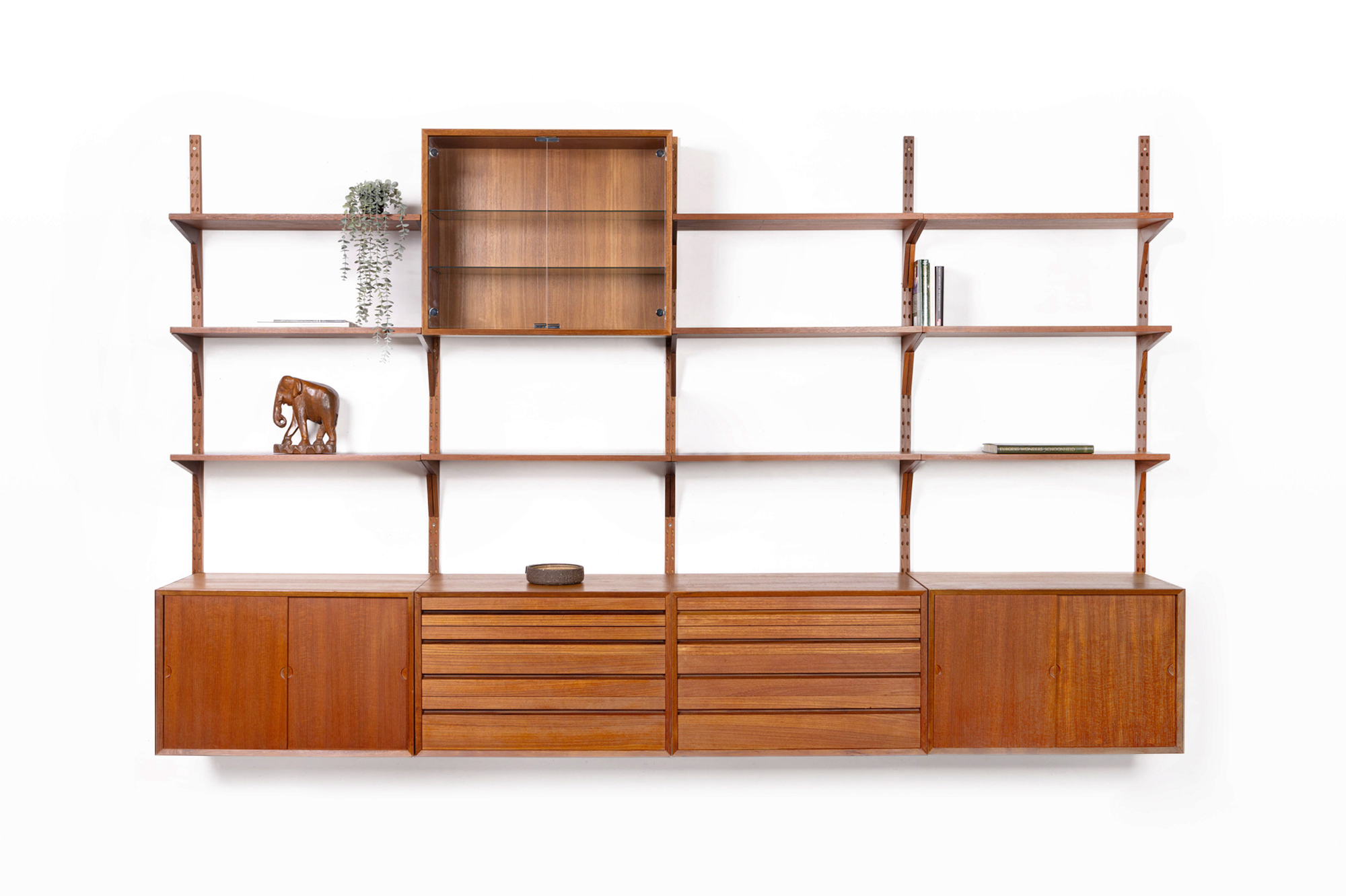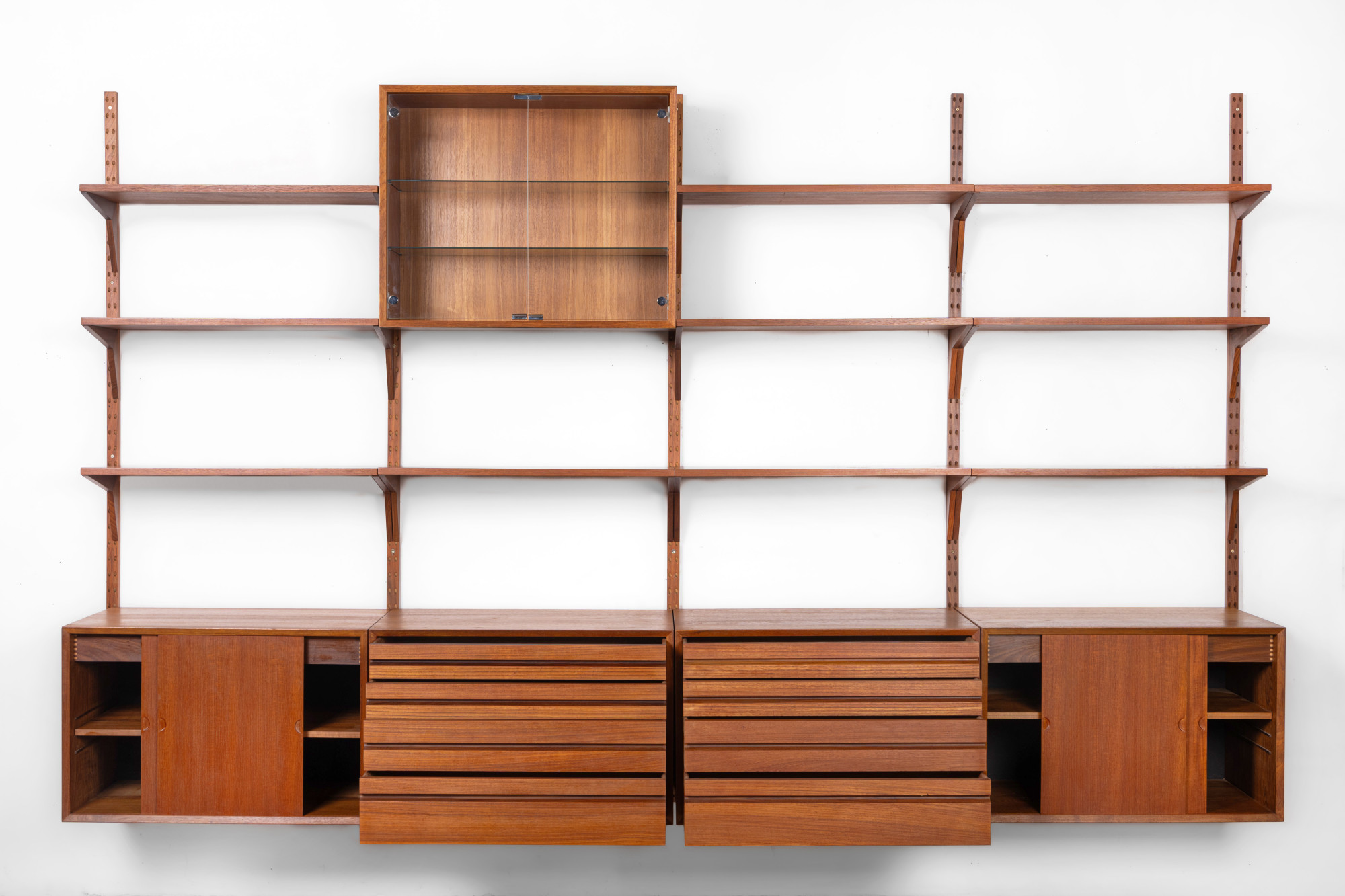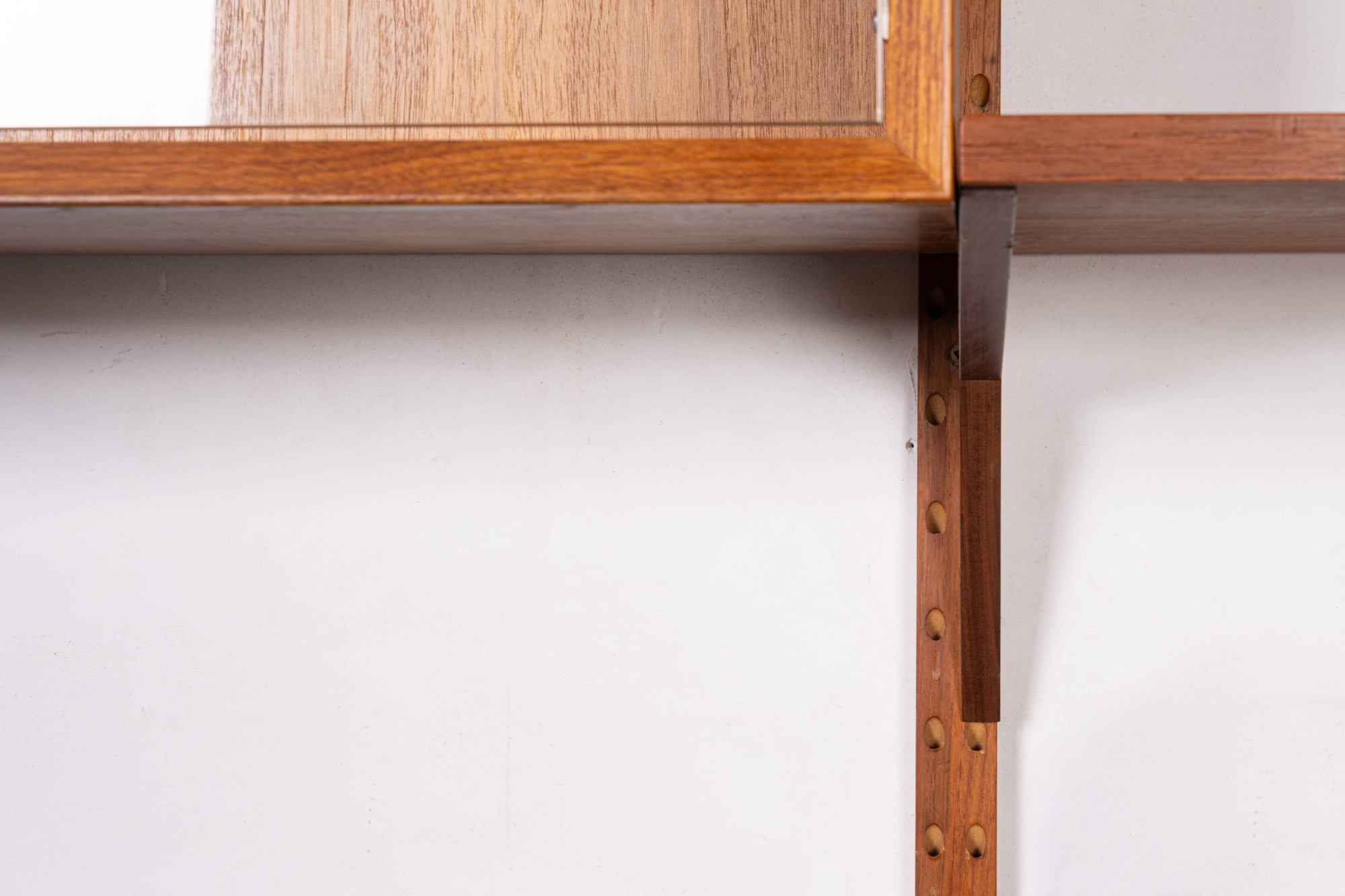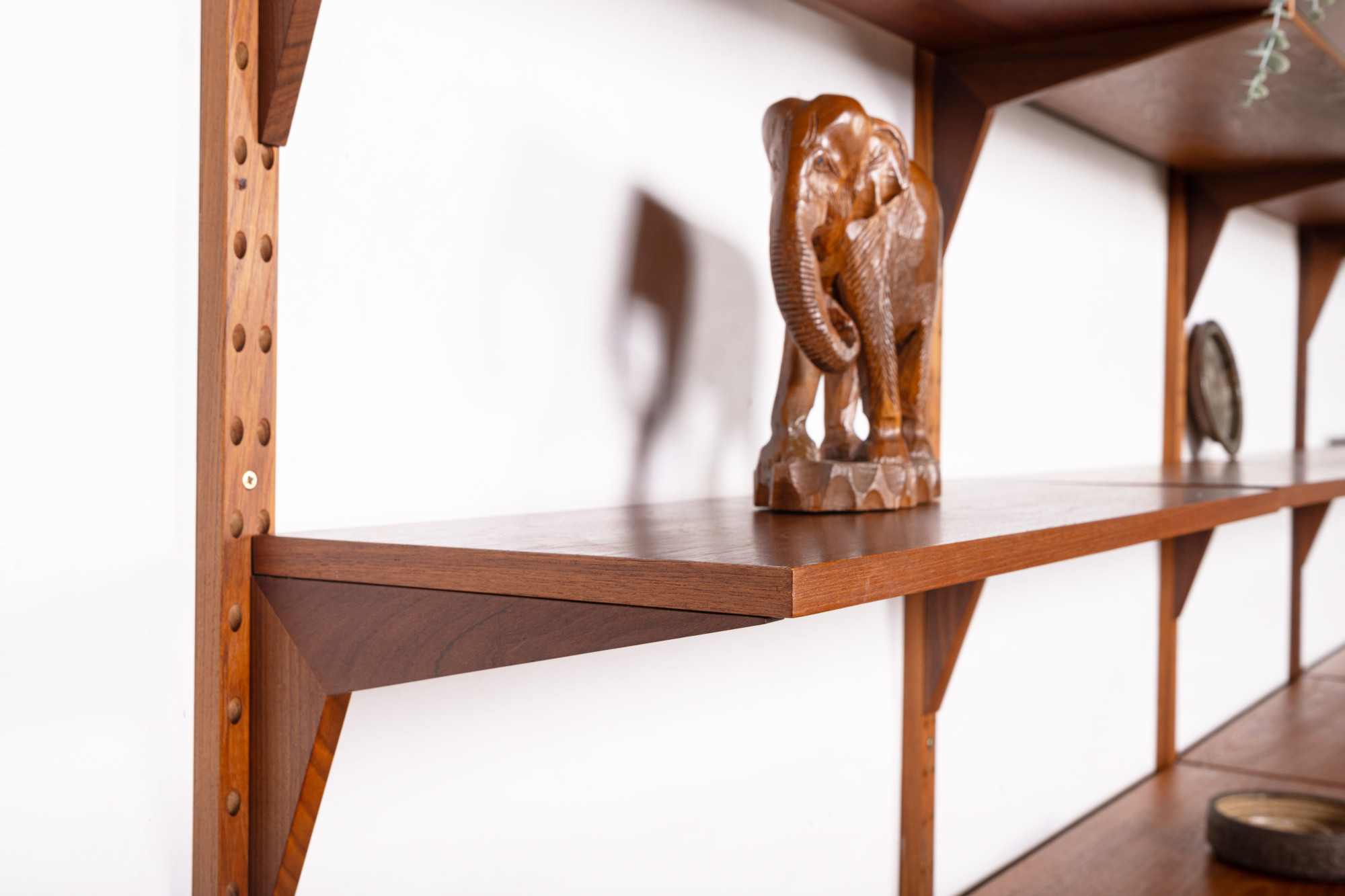 Danish modular wall unit by Poul Cadovius for Cado. This teak setup has four storage cabinets, one display cabinet and ten bookshelves. Always adaptable and further expandable.