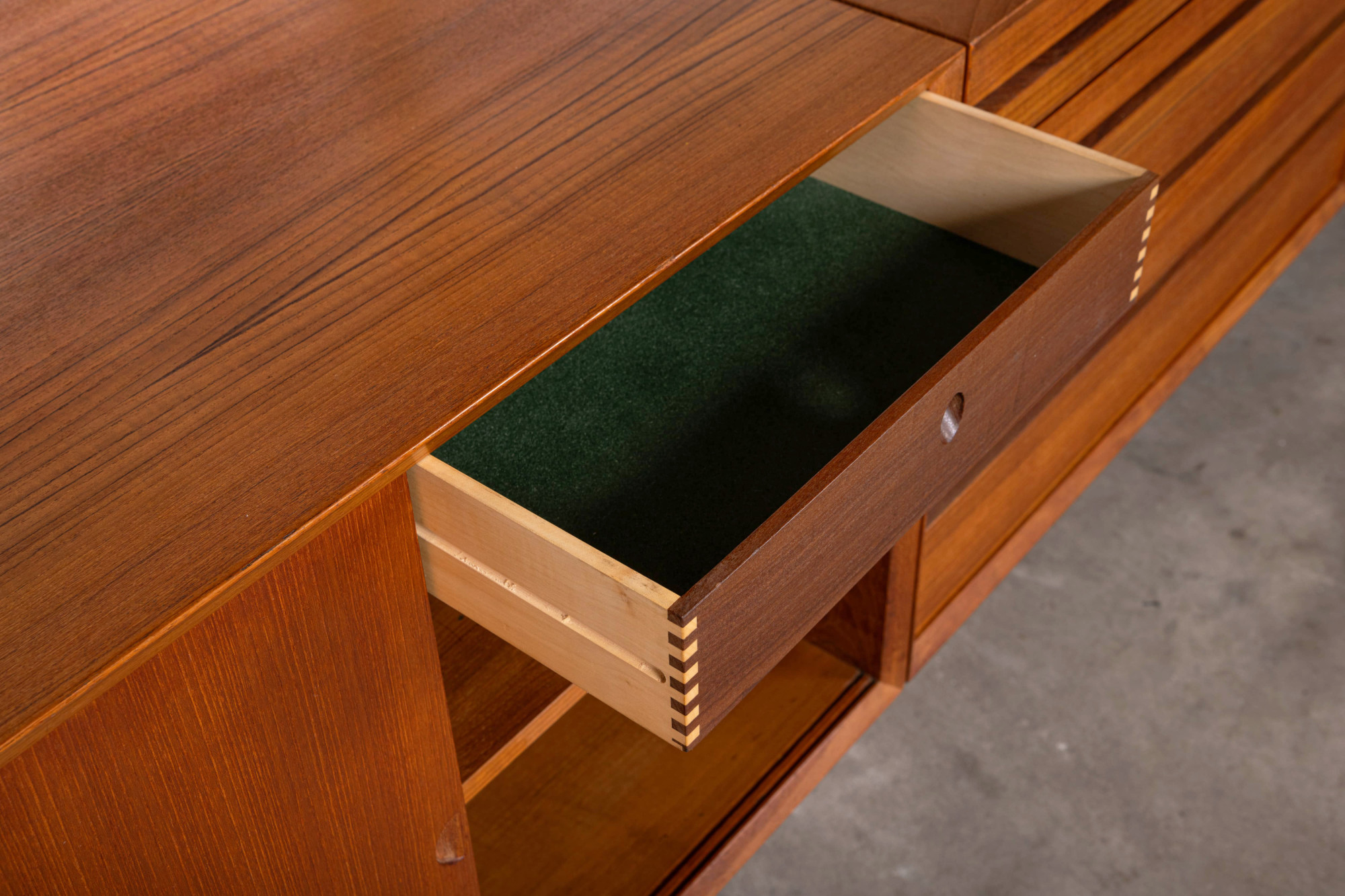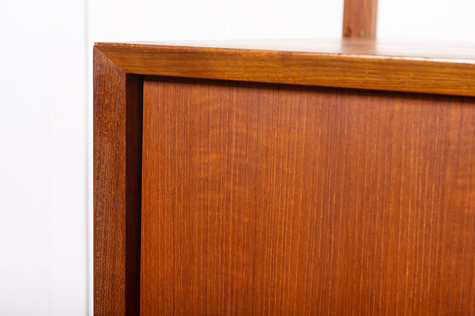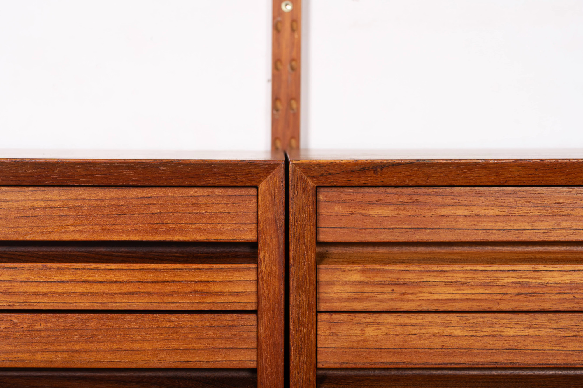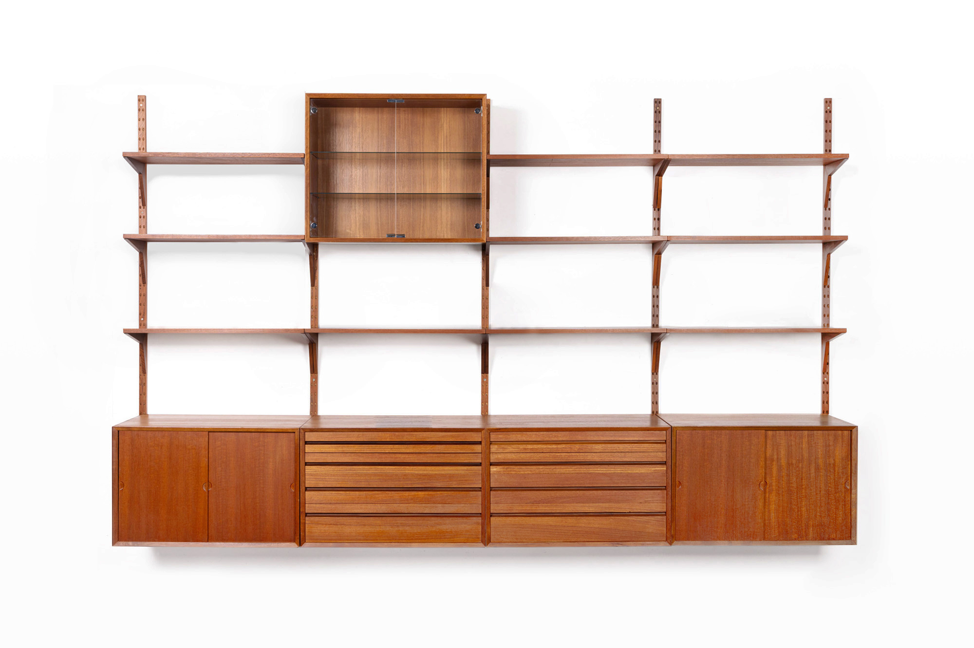 Danish modular wall unit by Poul Cadovius for Cado. This teak setup has four storage cabinets, one display cabinet and ten bookshelves. Always adaptable and further expandable.