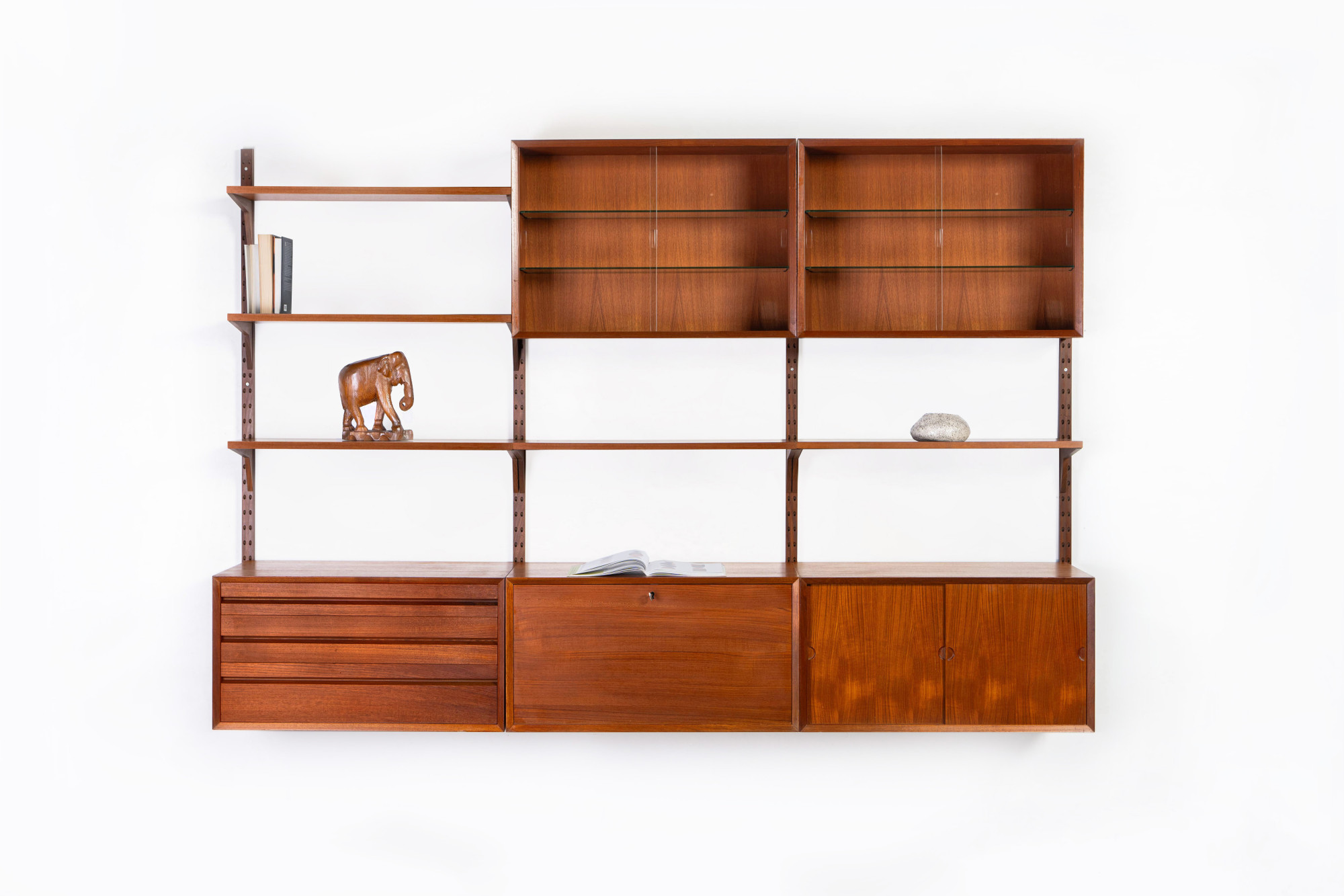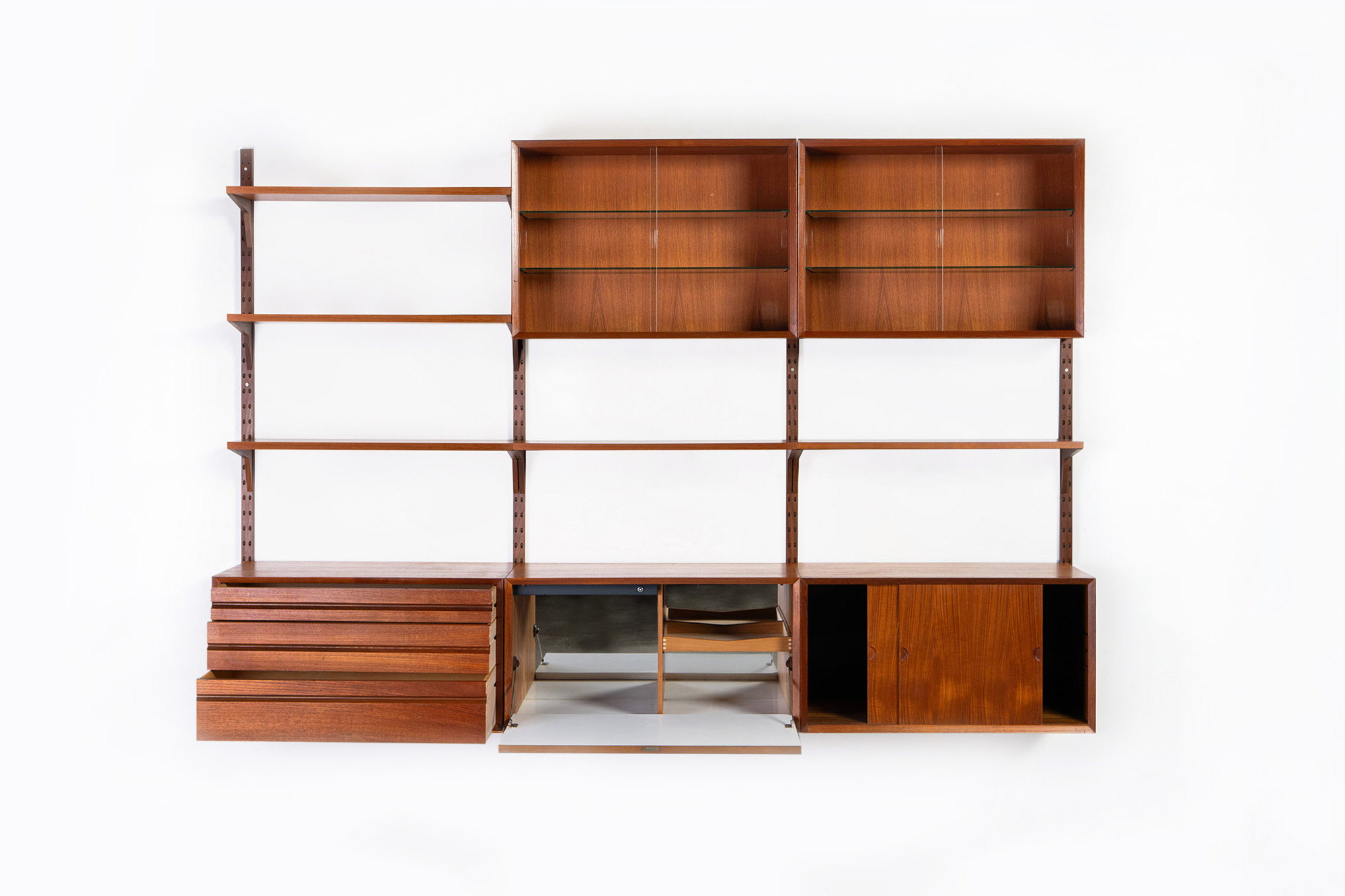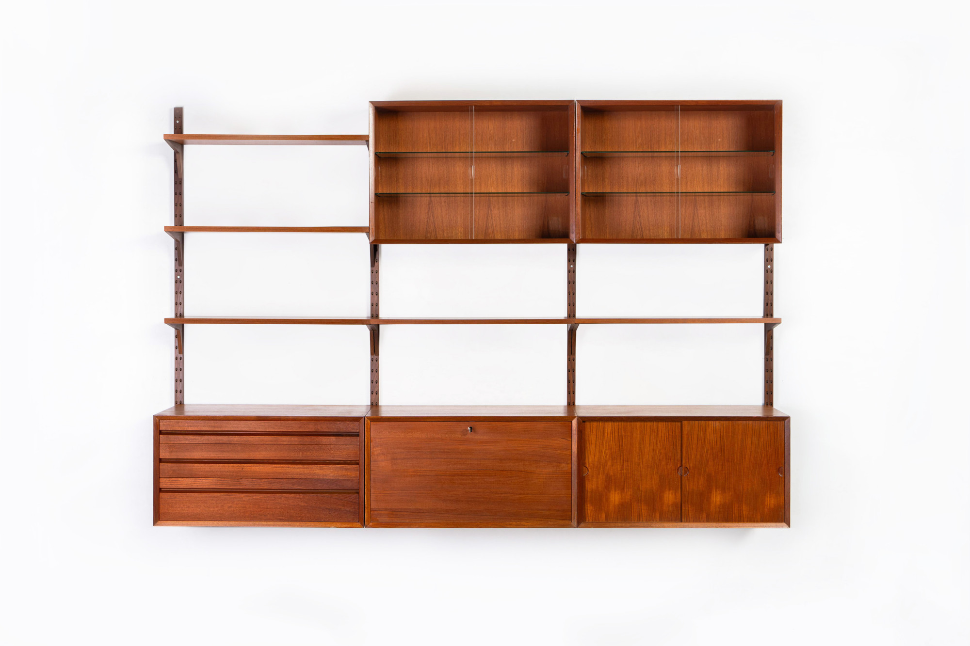 Danish modular wall unit by Poul Cadovius for CADO, Denmark 1960s. This teak setup has two storage cabinets, one drawer cabinet, two display cabinets and five bookshelves. Always adaptable and further expandable.