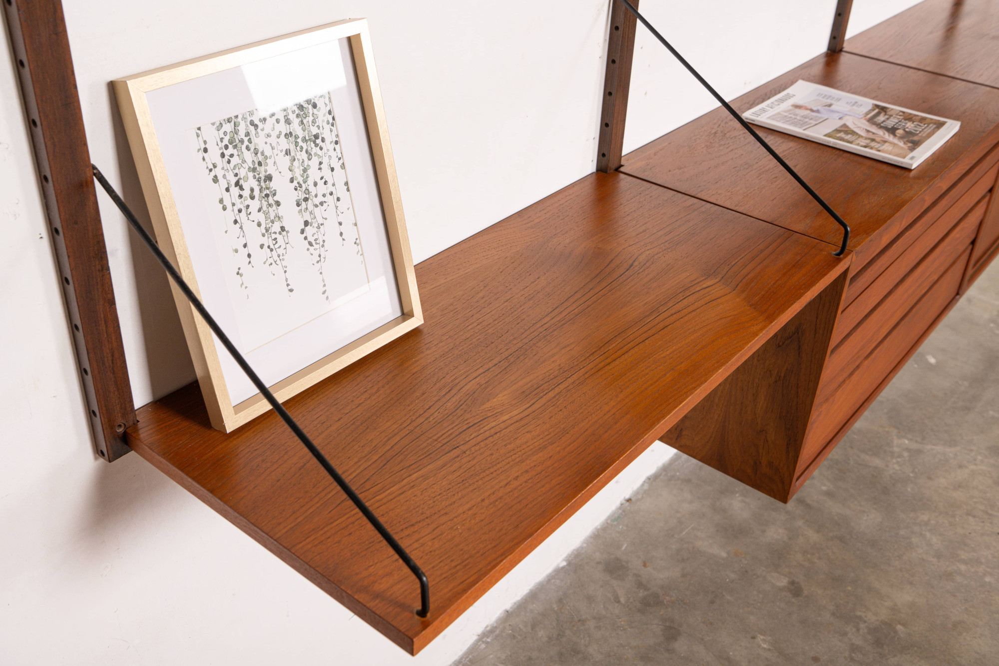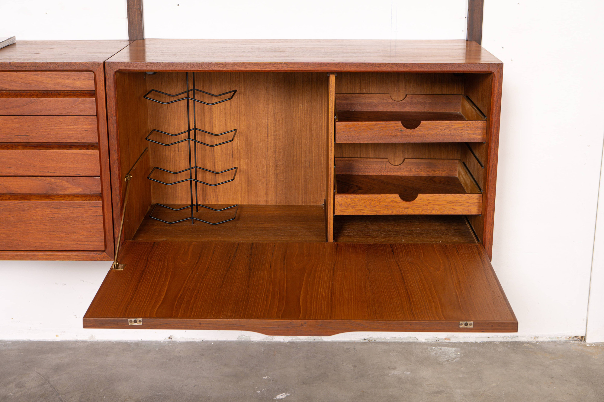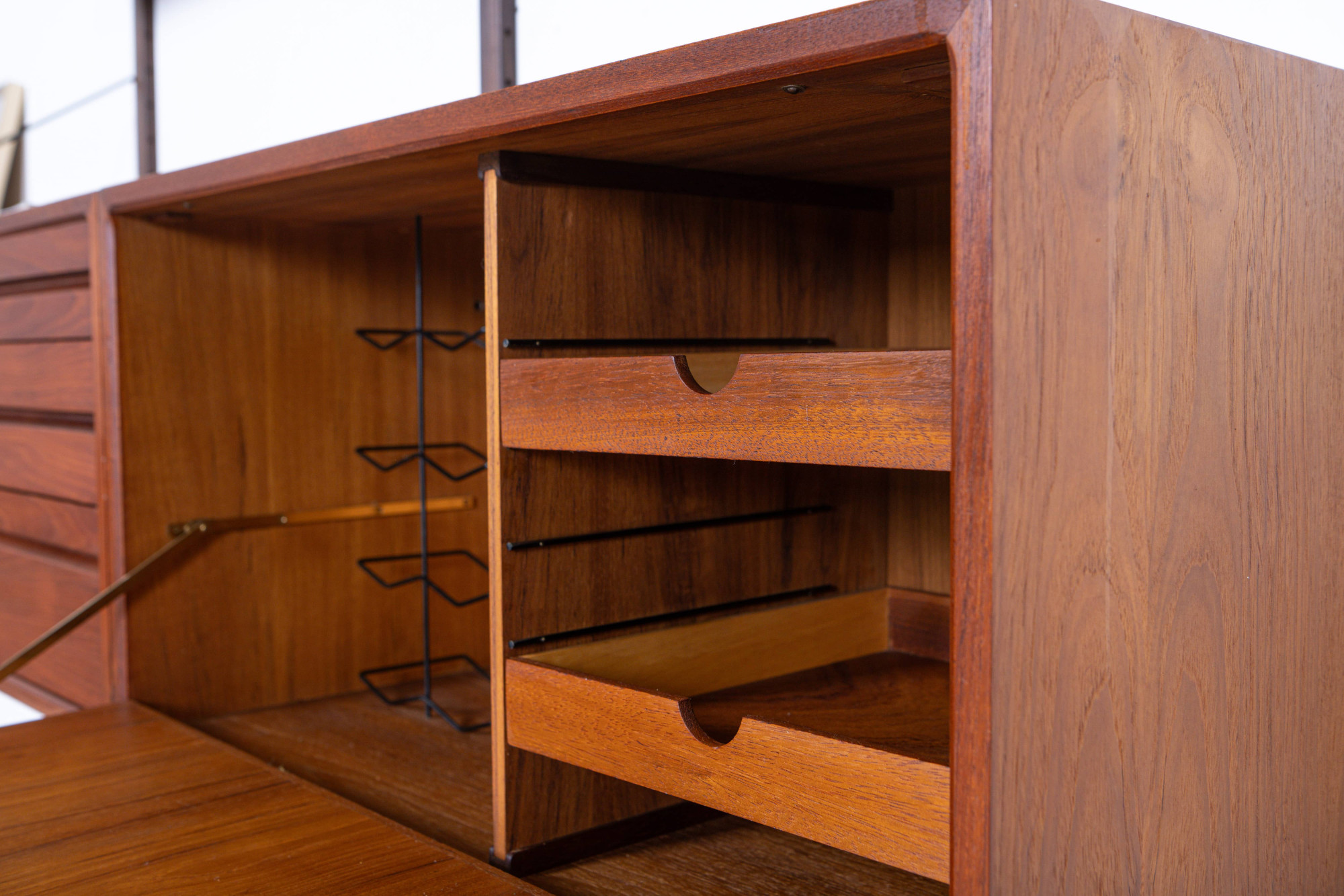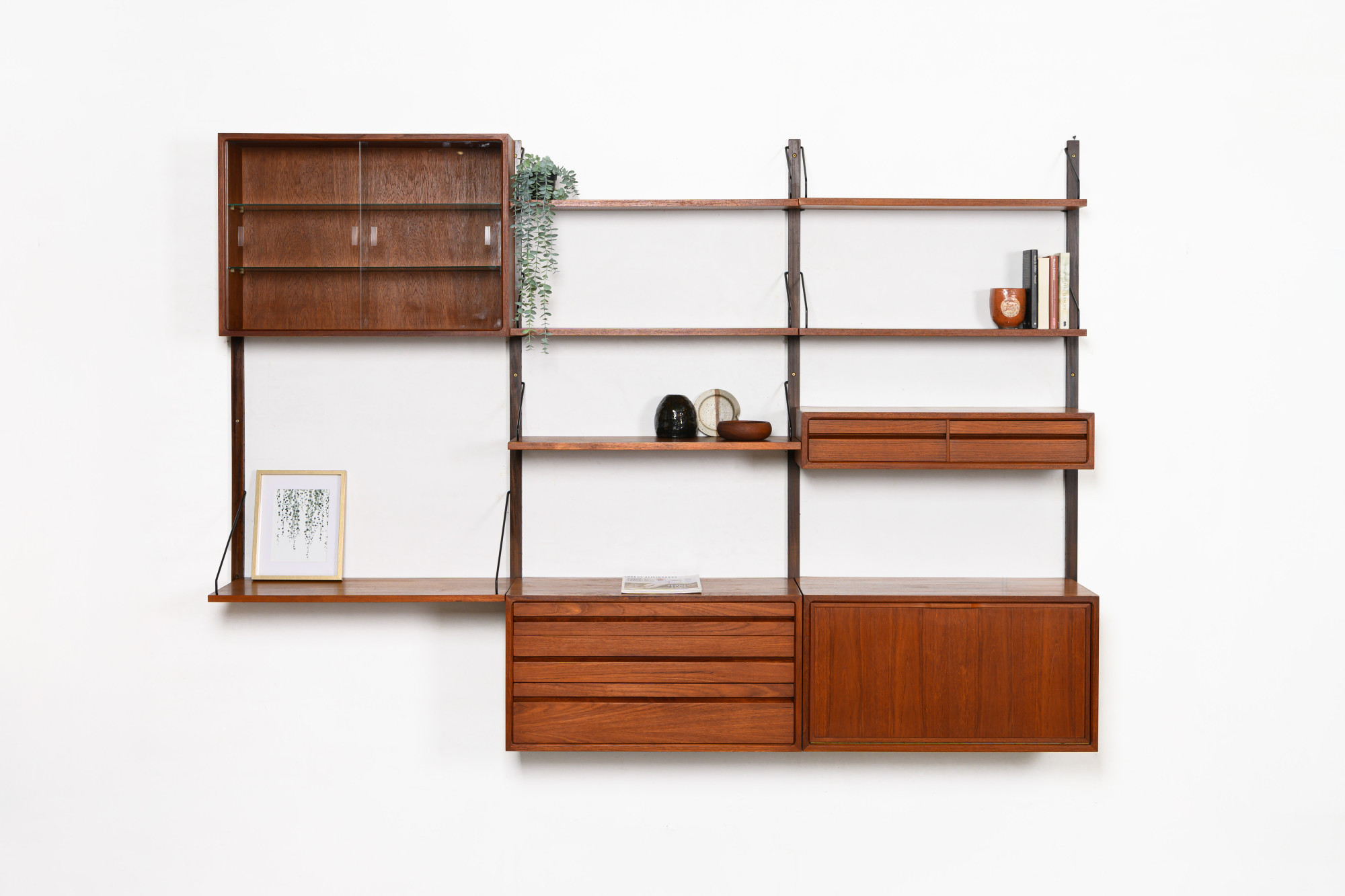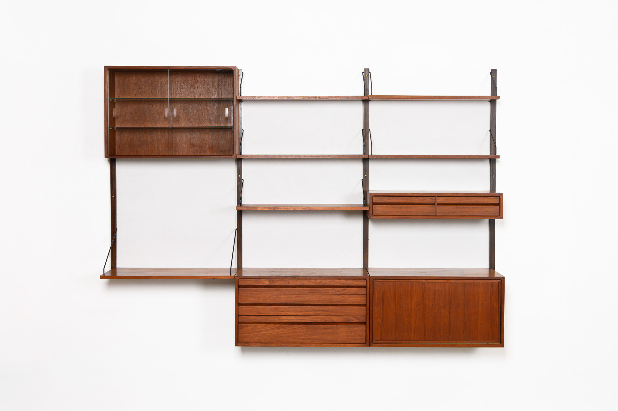 Danish modular wall unit by Poul Cadovius for Royal System. This teak setup has two storage cabinets, one display cabinet, one small drawers cabinet, one desk shelf and five bookshelves. Always adaptable and further expandable.