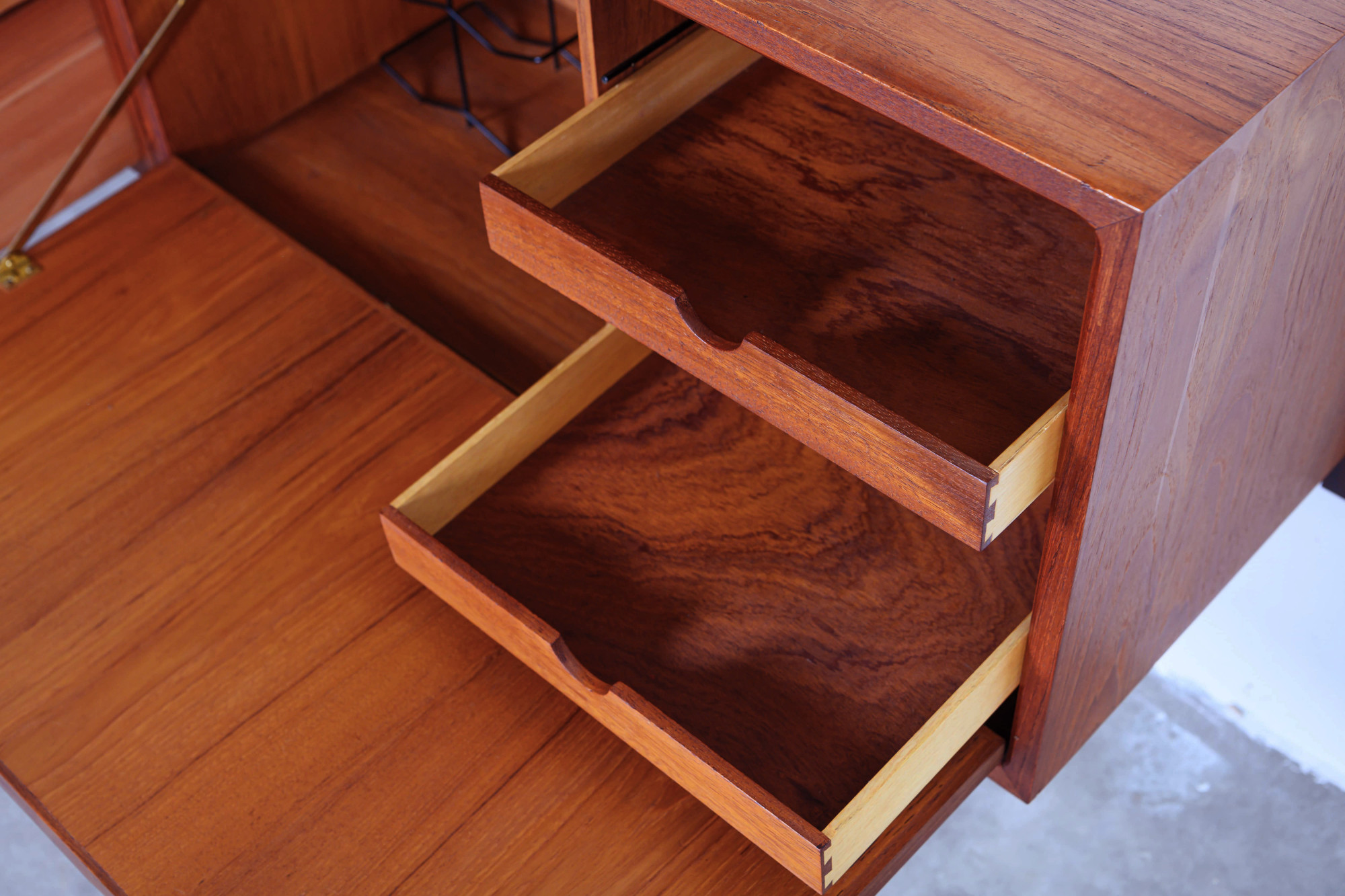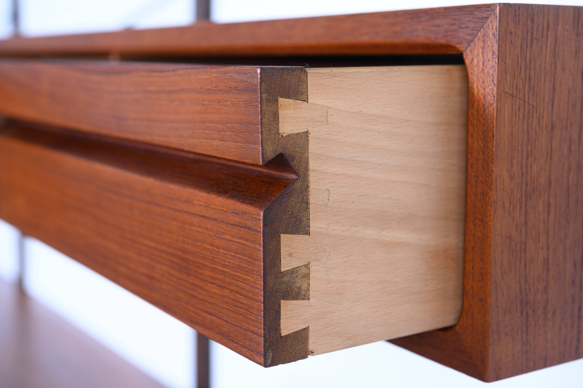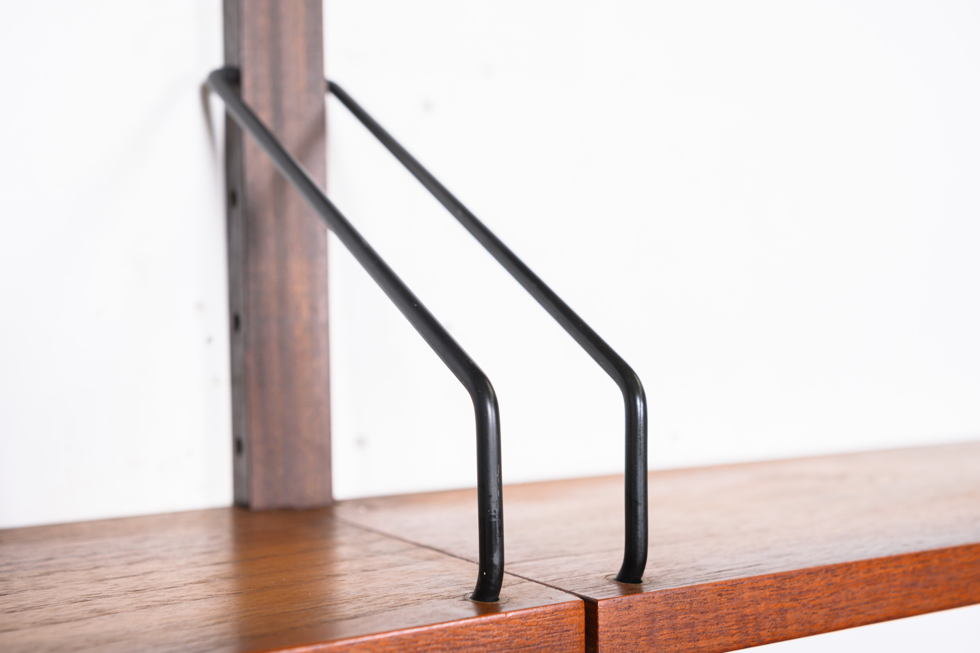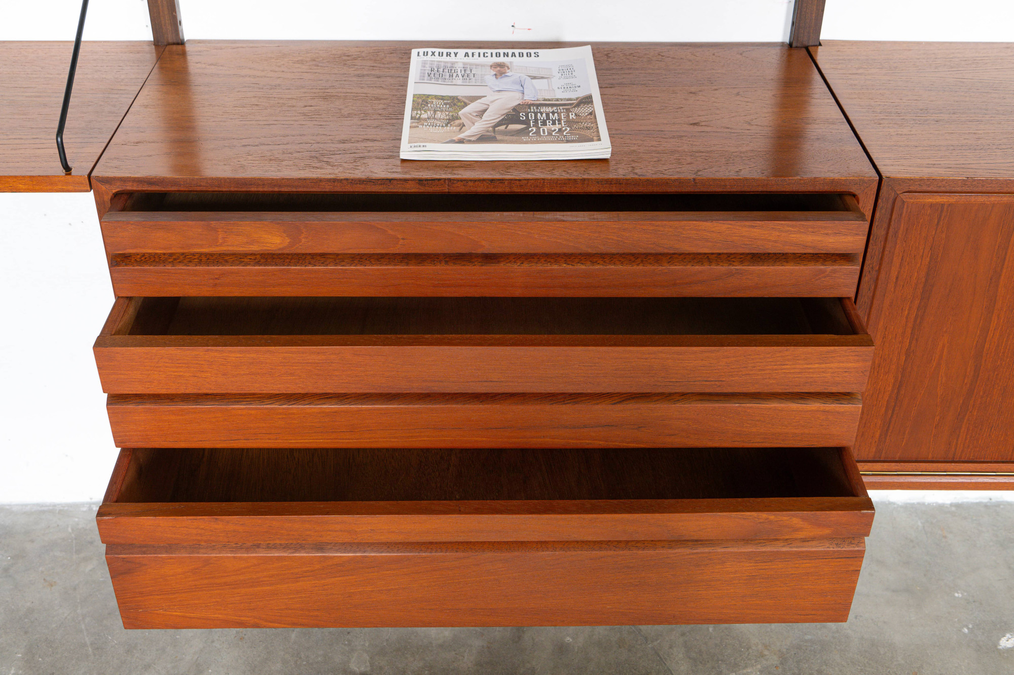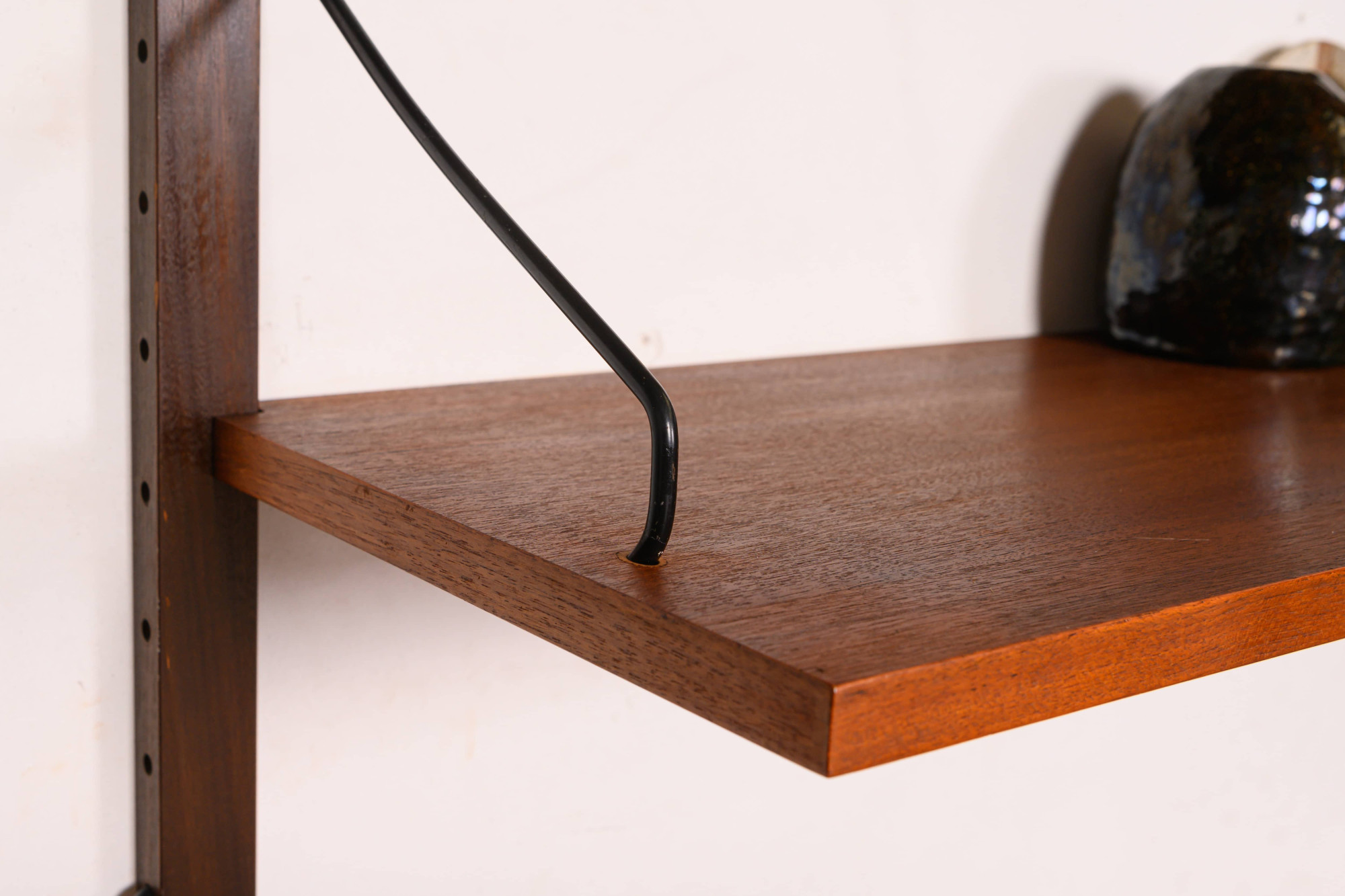 Danish modular wall unit by Poul Cadovius for Royal System. This teak setup has two storage cabinets, one display cabinet, one small drawers cabinet, one desk shelf and five bookshelves. Always adaptable and further expandable.
