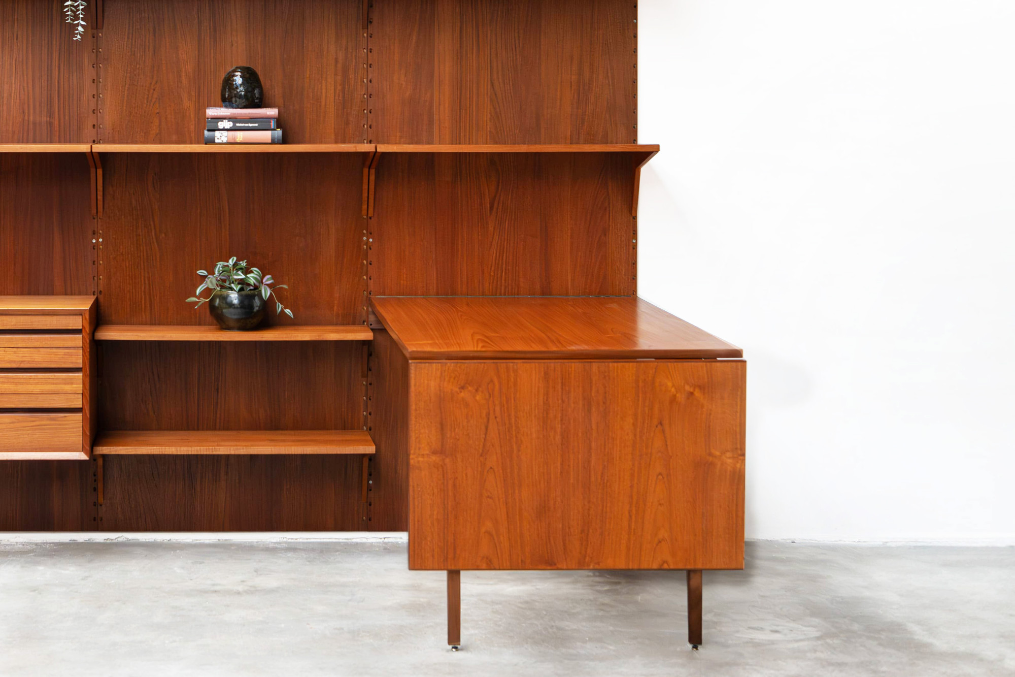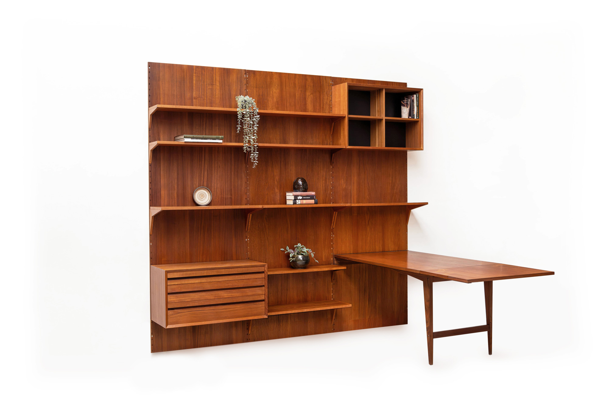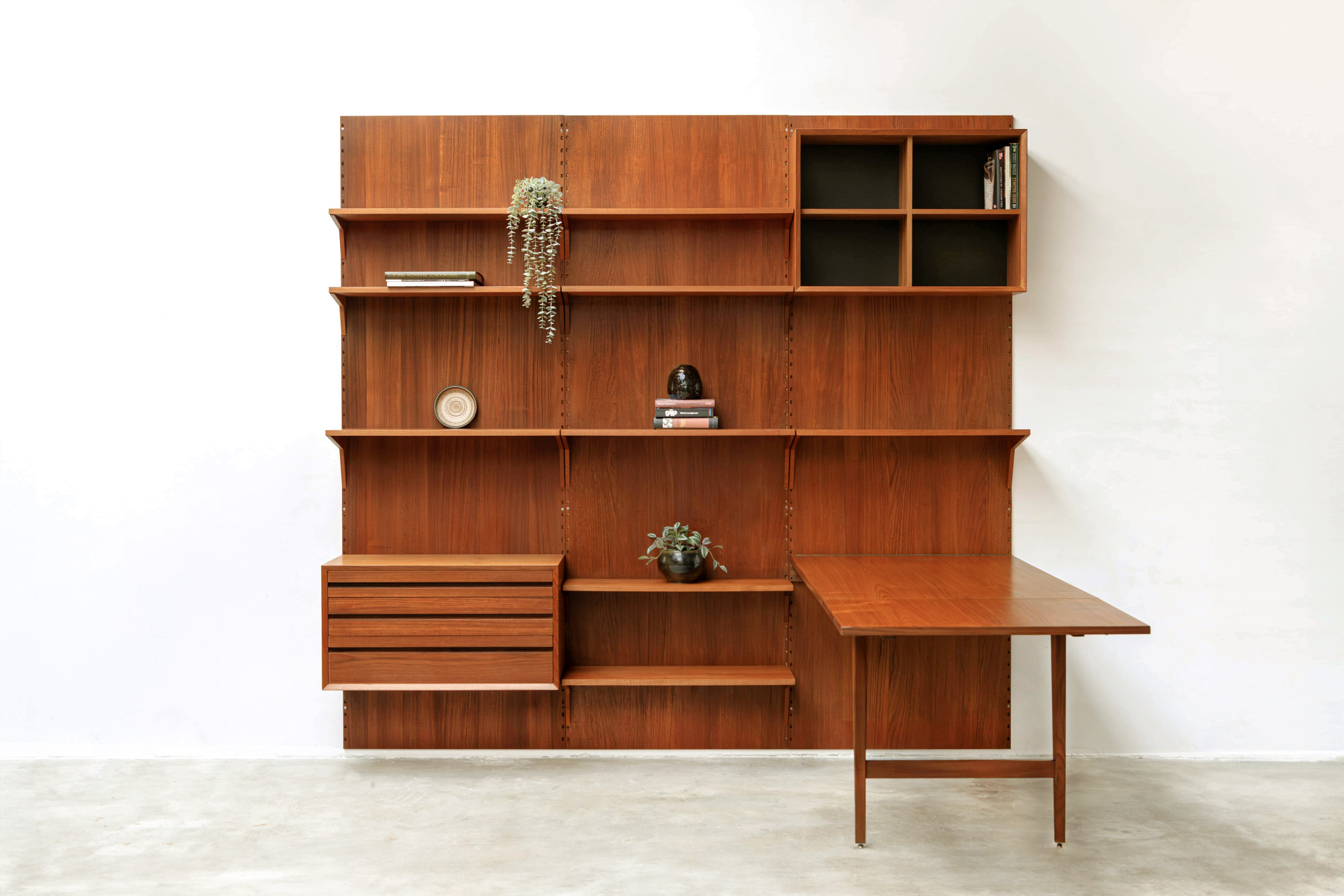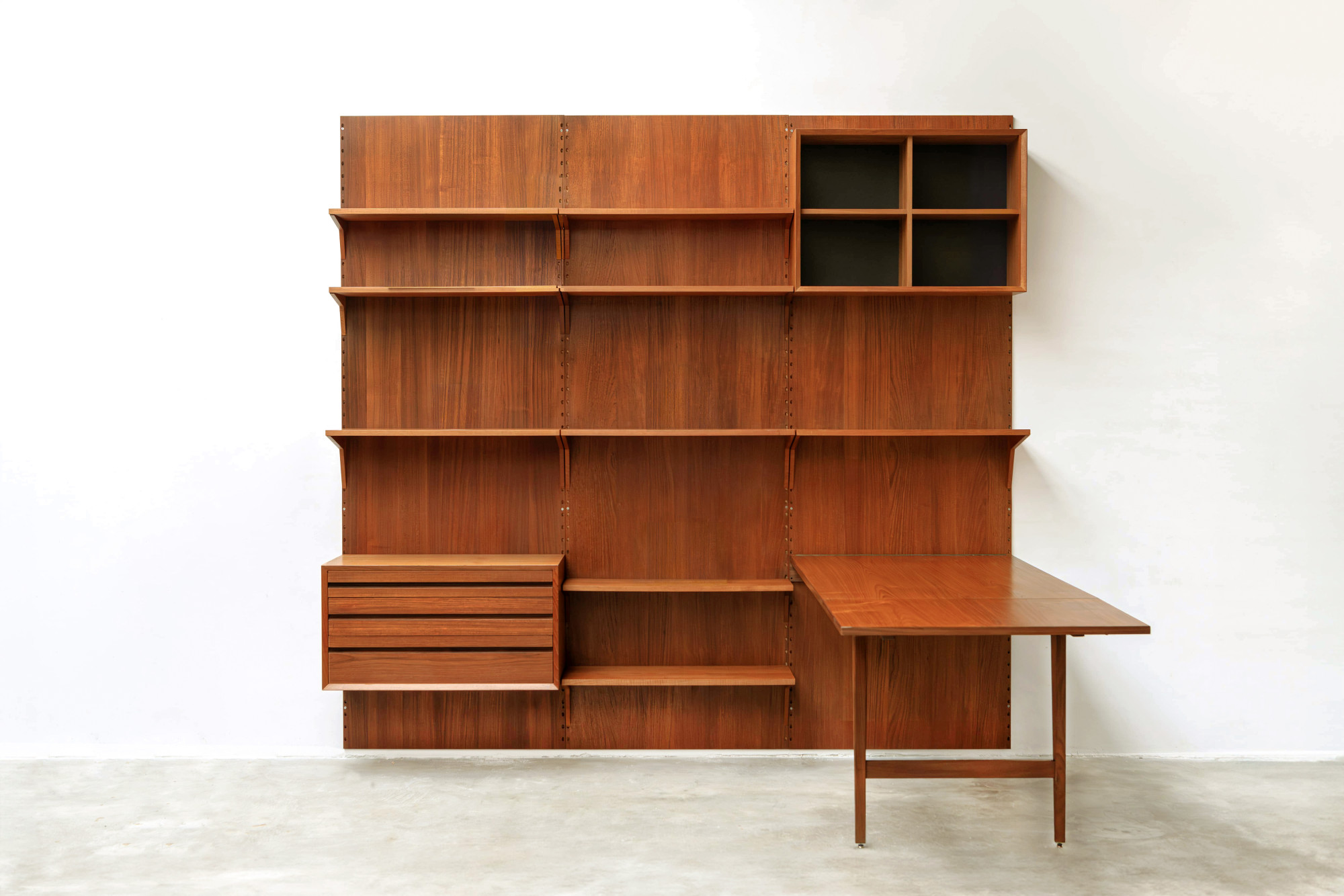 Danish modular wall unit by Poul Cadovius for Cado. This teak setup has three wall panels, one drawer cabinet, one display cabinet, one dining table and nine bookshelves. Always adaptable and further expandable. Always adaptable and further expandable.