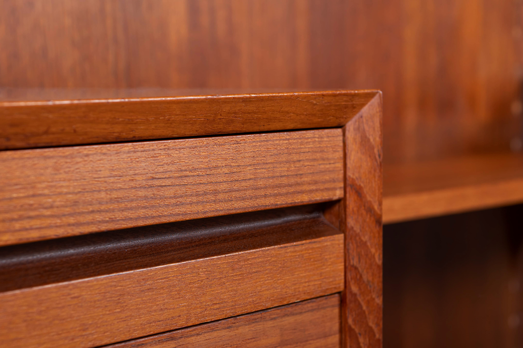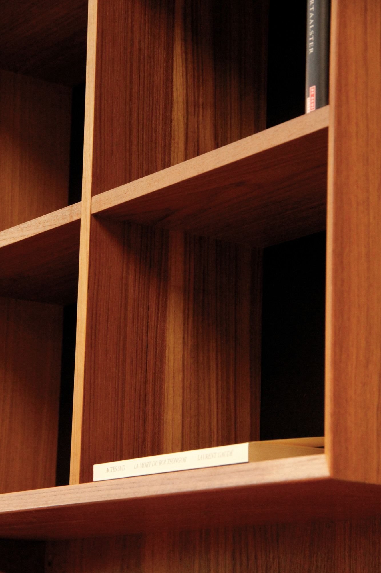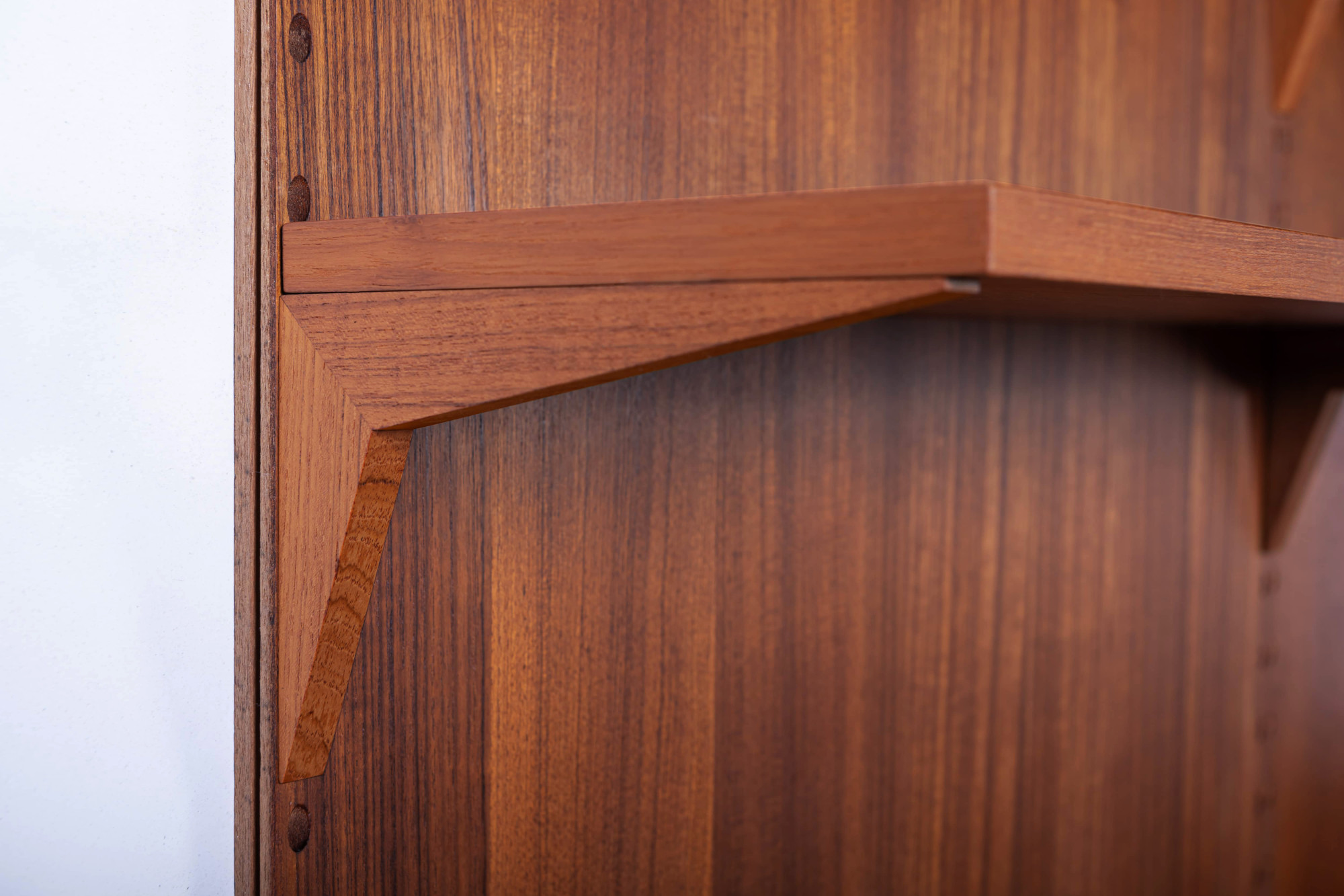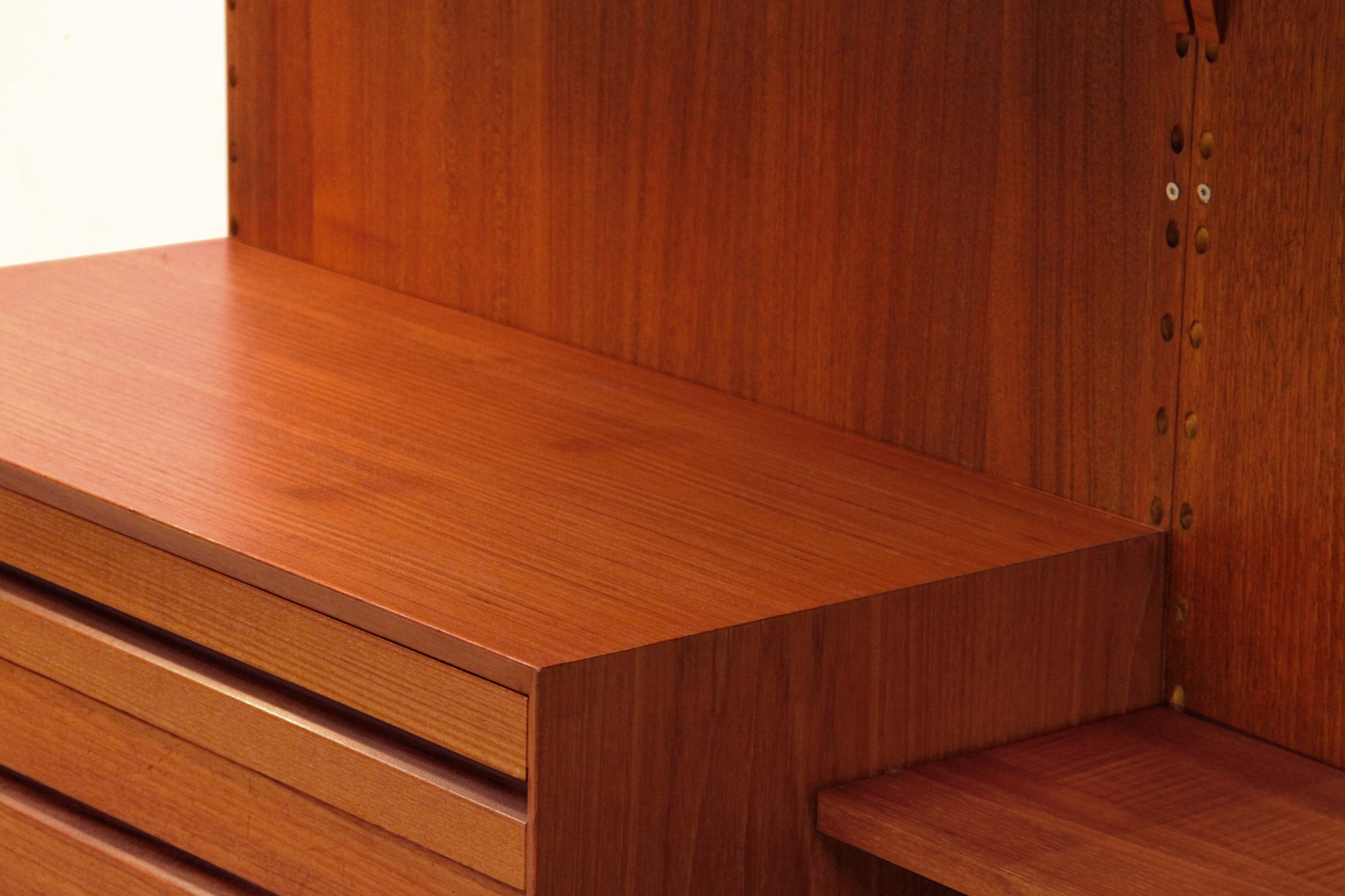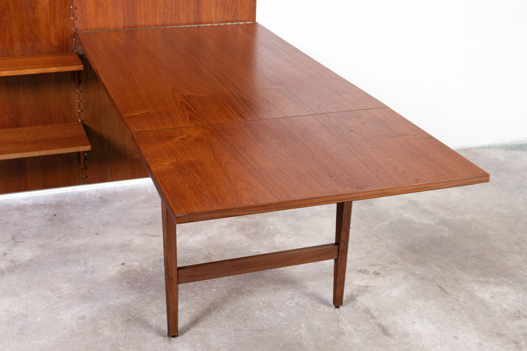 Danish modular wall unit by Poul Cadovius for Cado. This teak setup has three wall panels, one drawer cabinet, one display cabinet, one dining table and nine bookshelves. Always adaptable and further expandable. Always adaptable and further expandable.