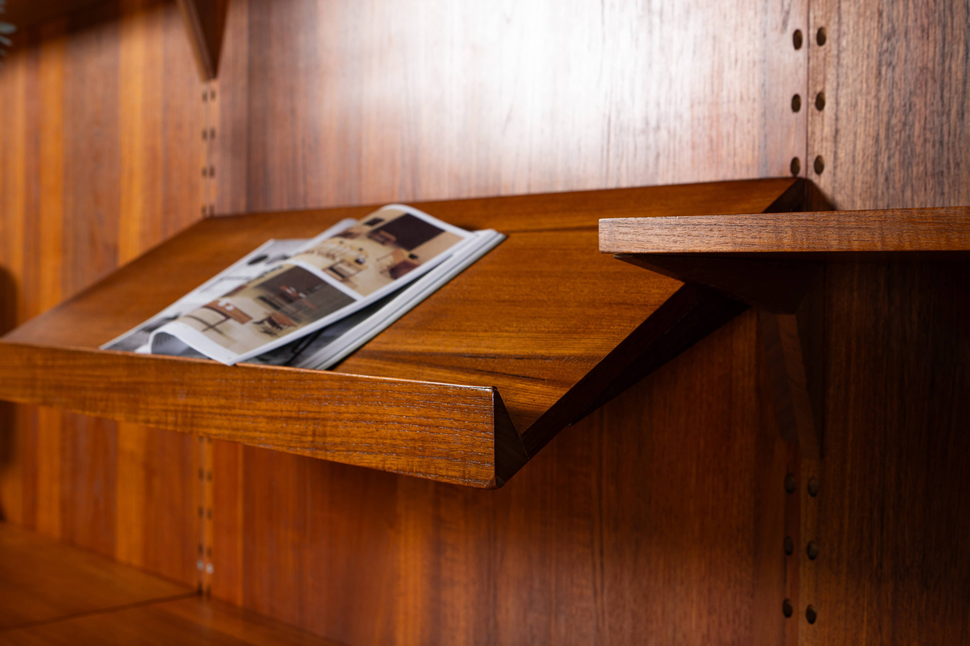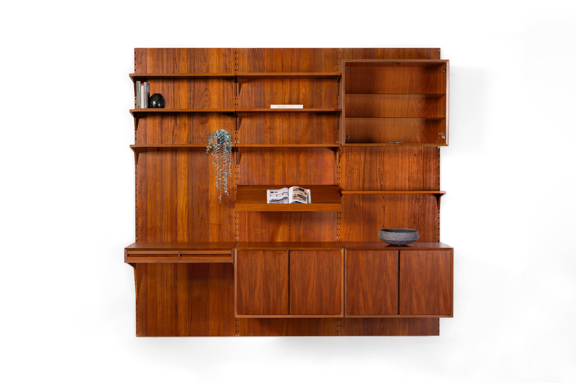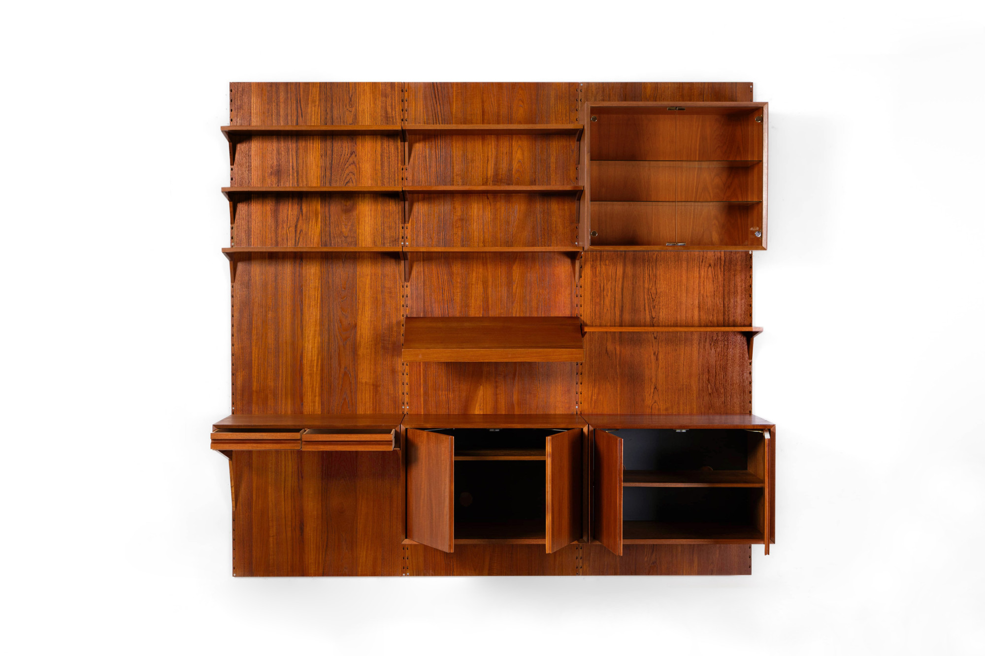 Danish modular wall unit by Poul Cadovius for Cado. This teak setup has two storage cabinets, one display cabinet, one desk cabinet, one reading shelf and seven bookshelves. Always adaptable and further expandable.