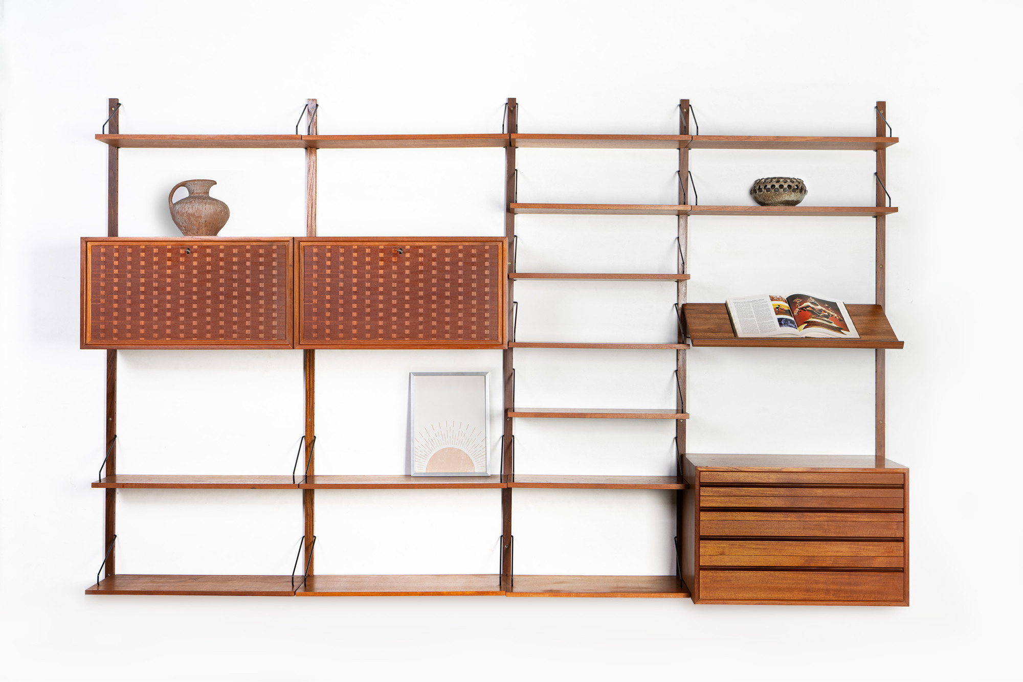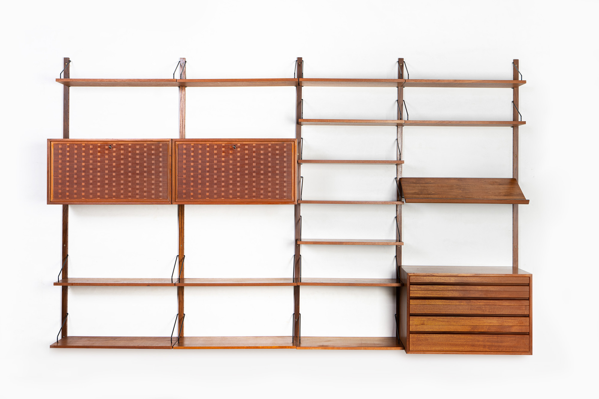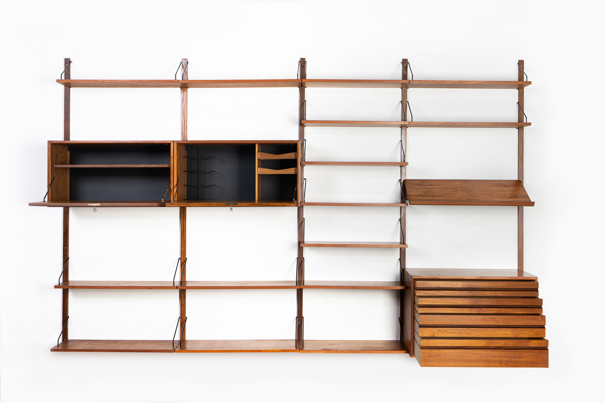 Danish modular wall unit by Poul Cadovius for Royal System. This teak setup has one storage cabinet, two bar cabinets, one reading shelf and fifteen bookshelves. Always adaptable and further expandable.