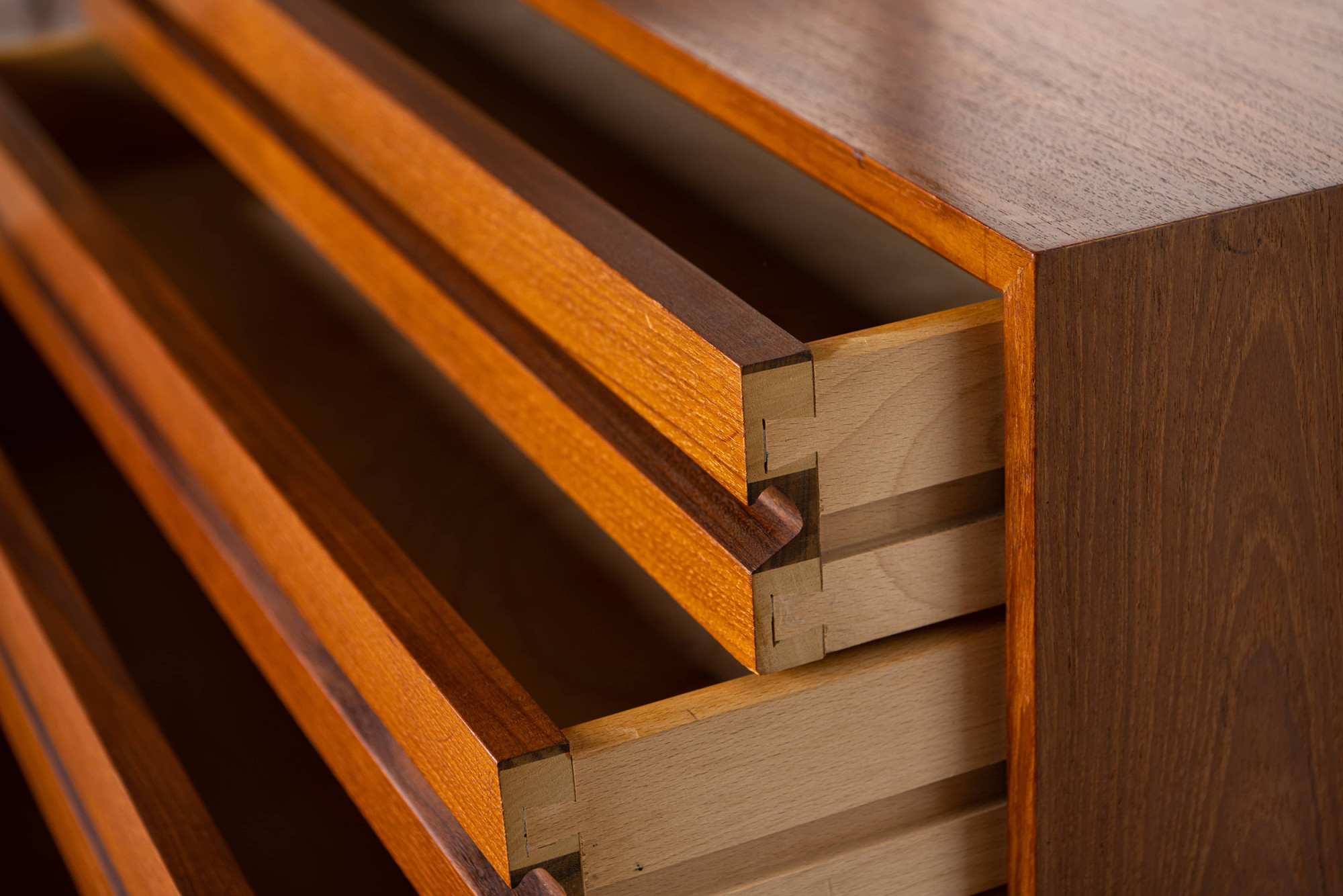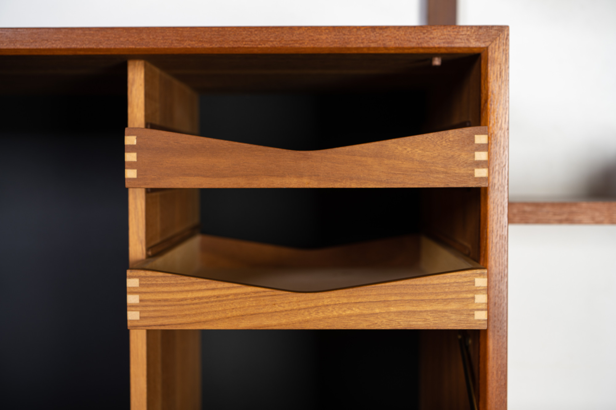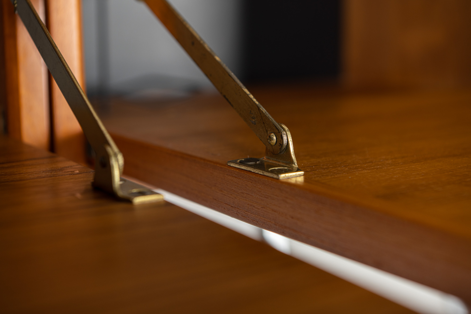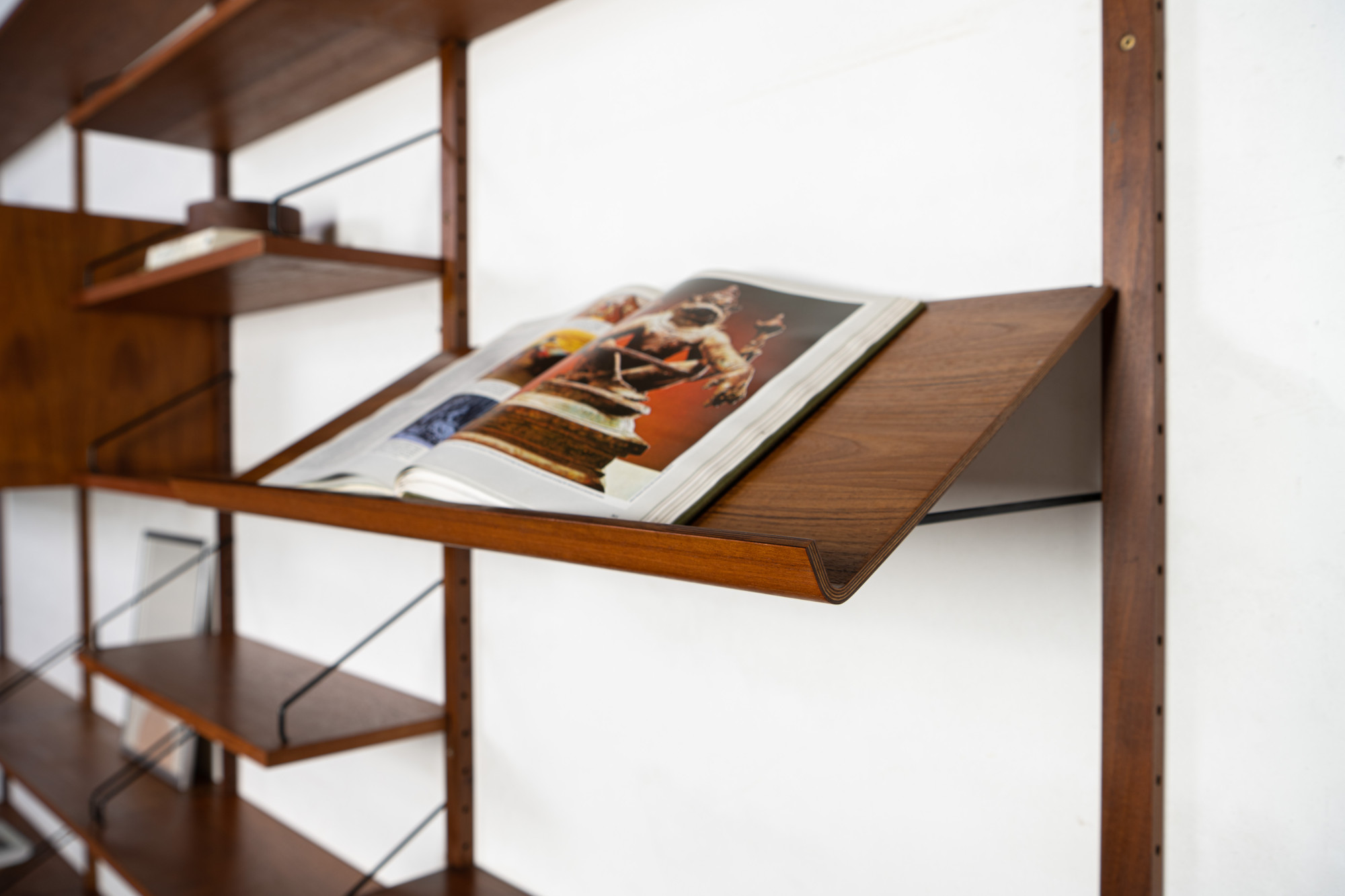 Danish modular wall unit by Poul Cadovius for Royal System. This teak setup has one storage cabinet, two bar cabinets, one reading shelf and fifteen bookshelves. Always adaptable and further expandable.