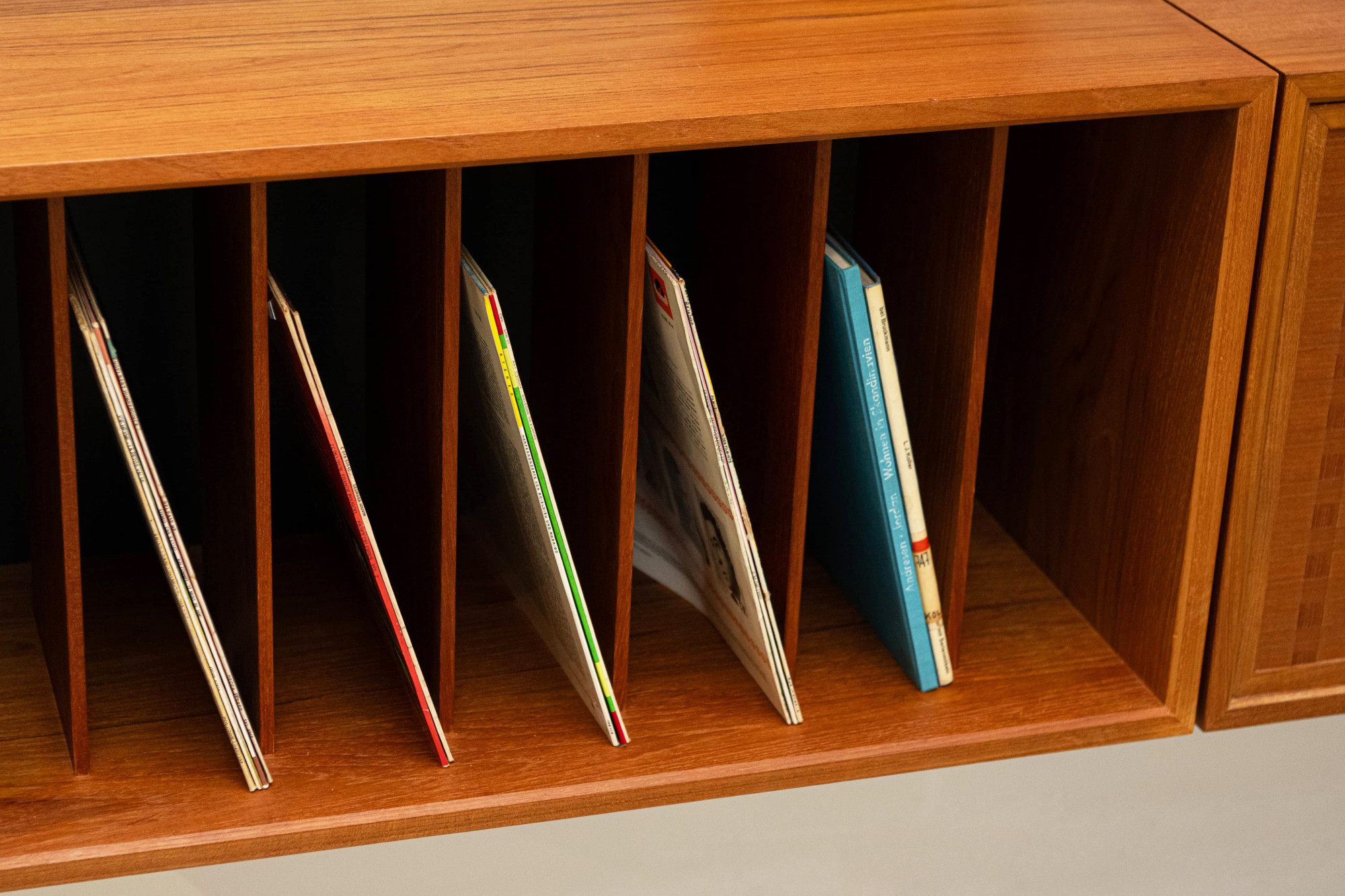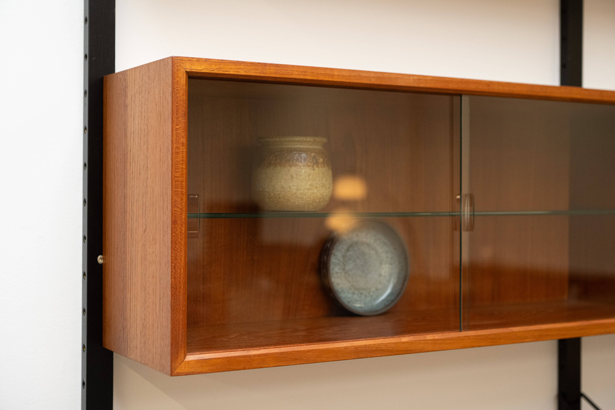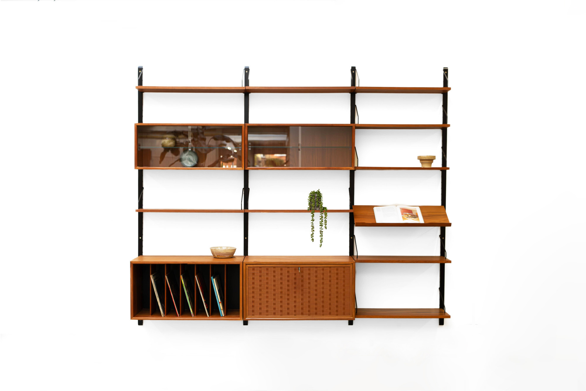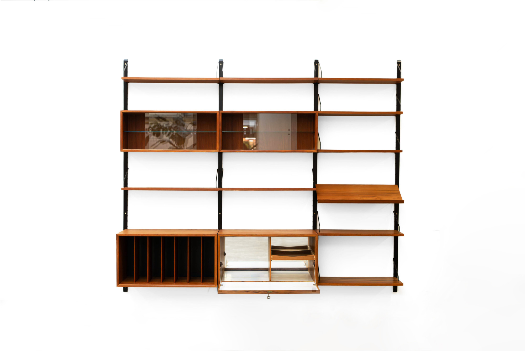 Danish modular wall unit by Poul Cadovius for Royal System, produced in Denmark in the 1960s. This teak setup has one bar cabinet, LP-cabinet, one reading shelf, two display cabinets and nine bookshelves. Always adaptable and further expandable.