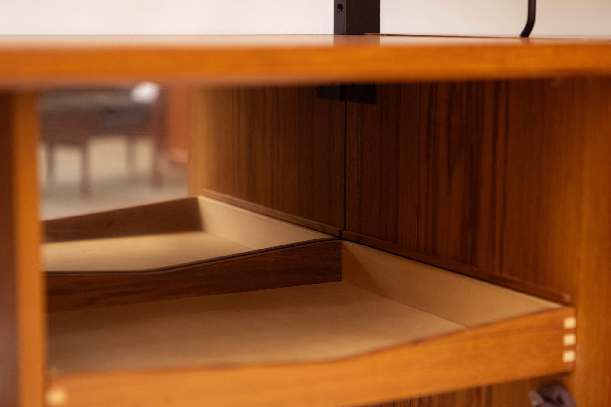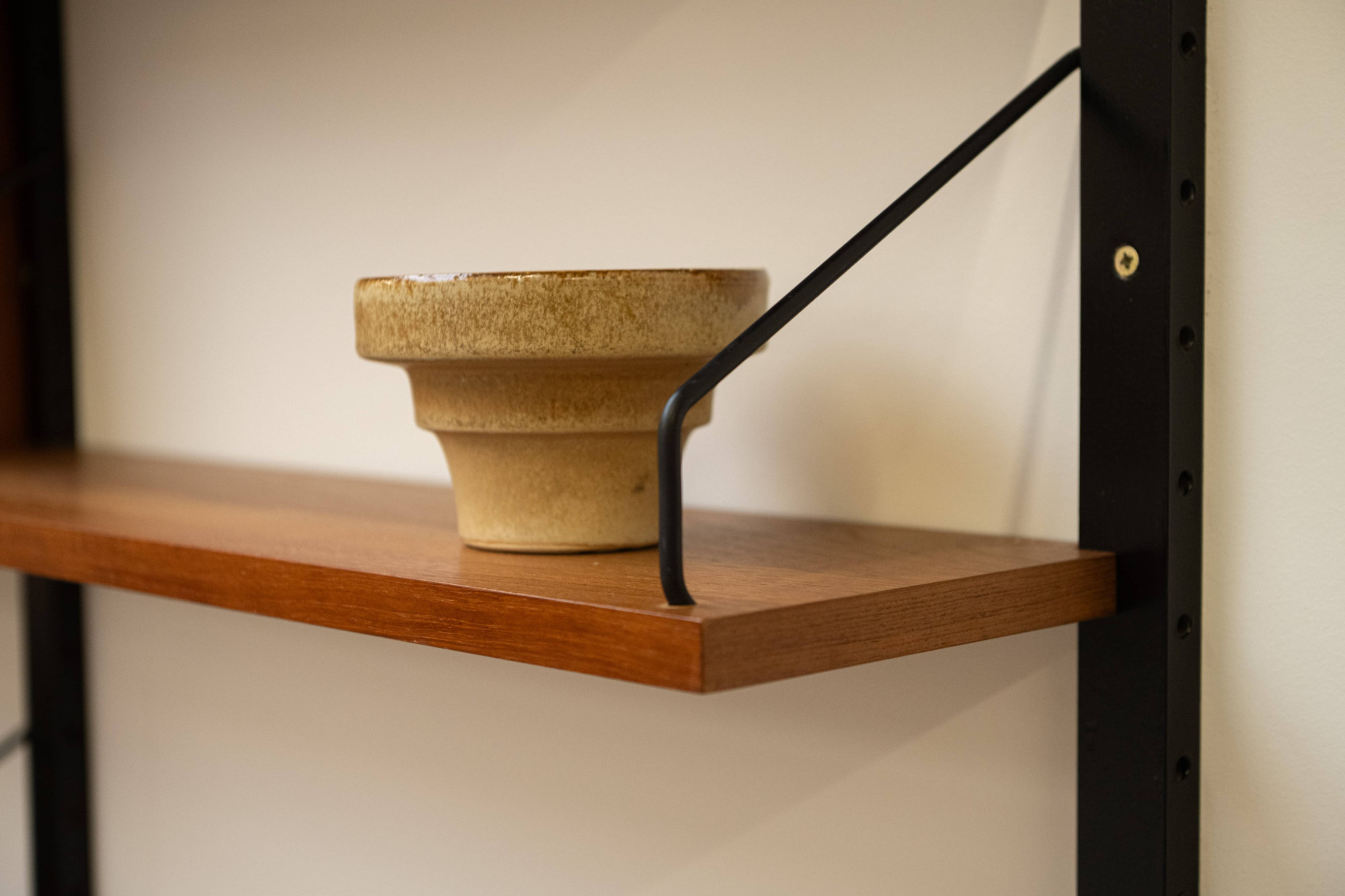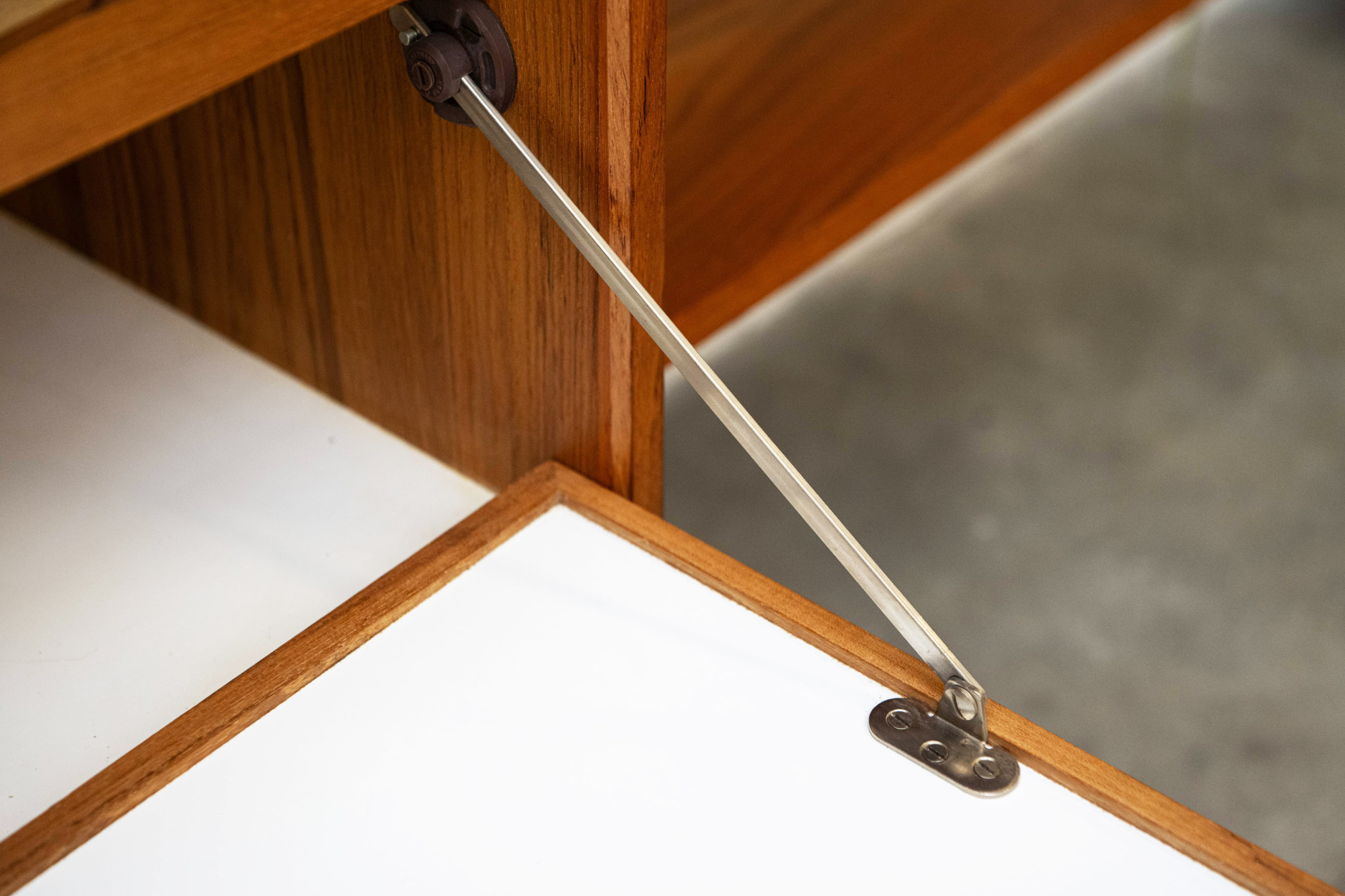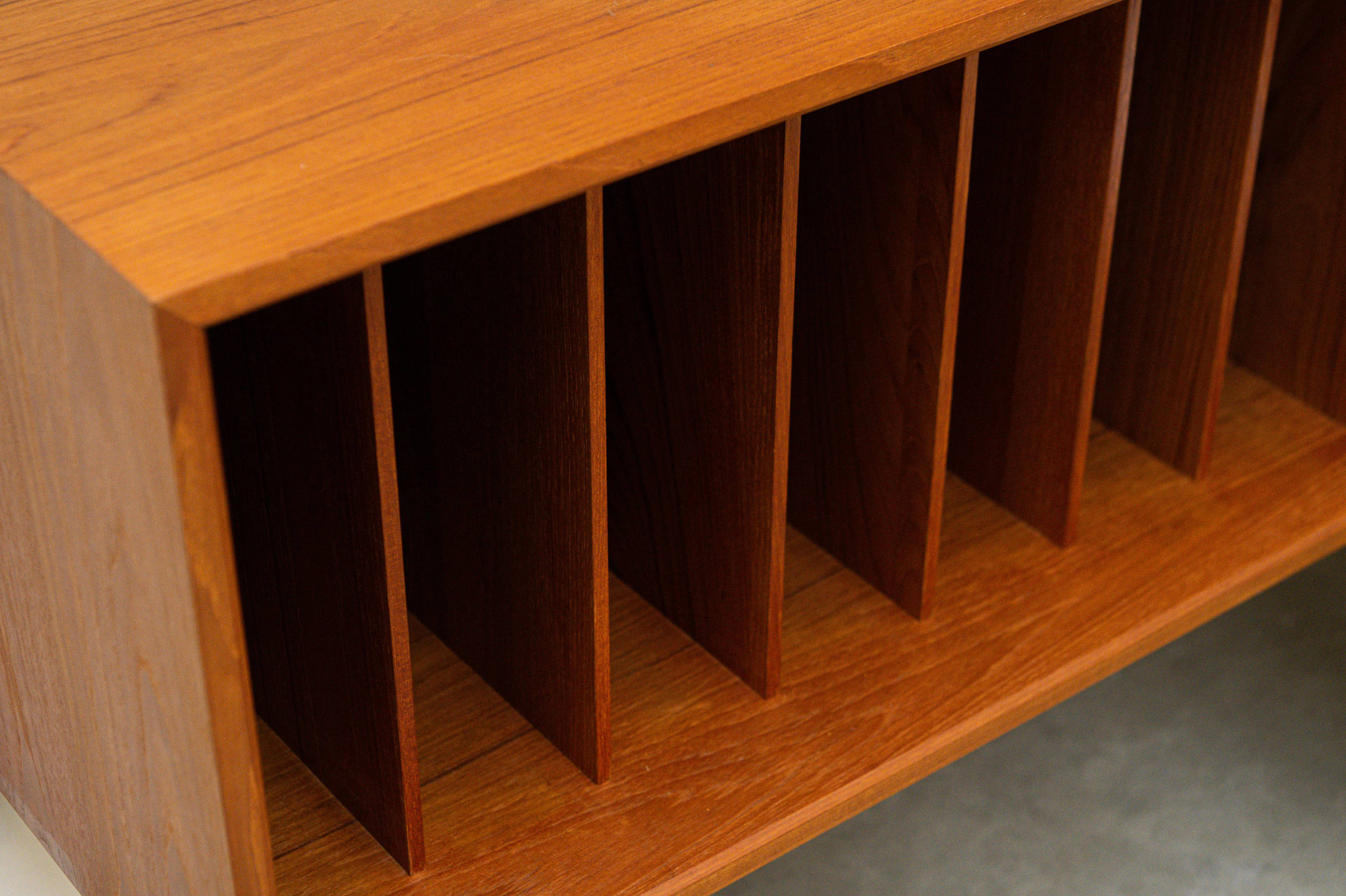 Danish modular wall unit by Poul Cadovius for Royal System, produced in Denmark in the 1960s. This teak setup has one bar cabinet, LP-cabinet, one reading shelf, two display cabinets and nine bookshelves. Always adaptable and further expandable.