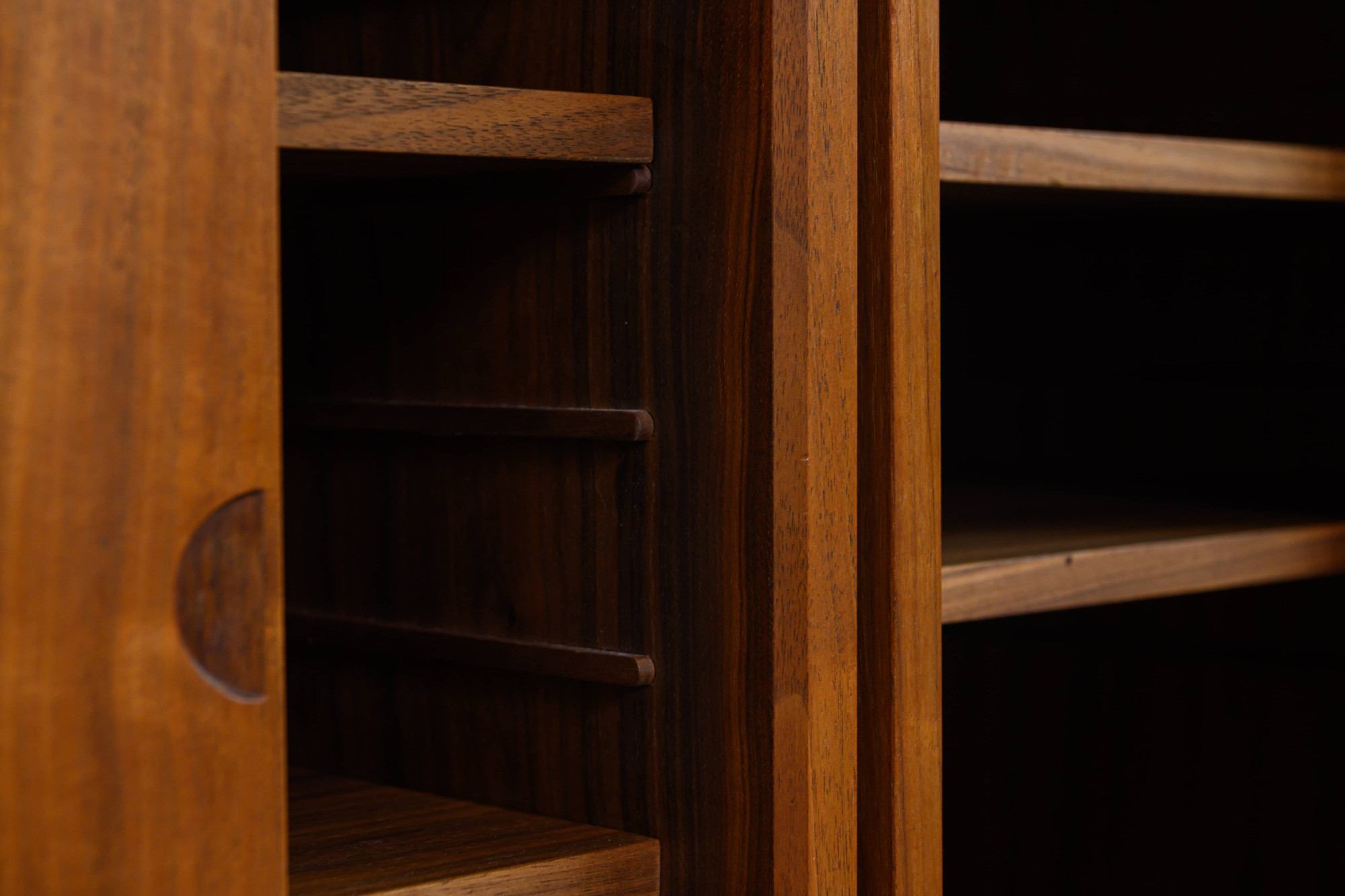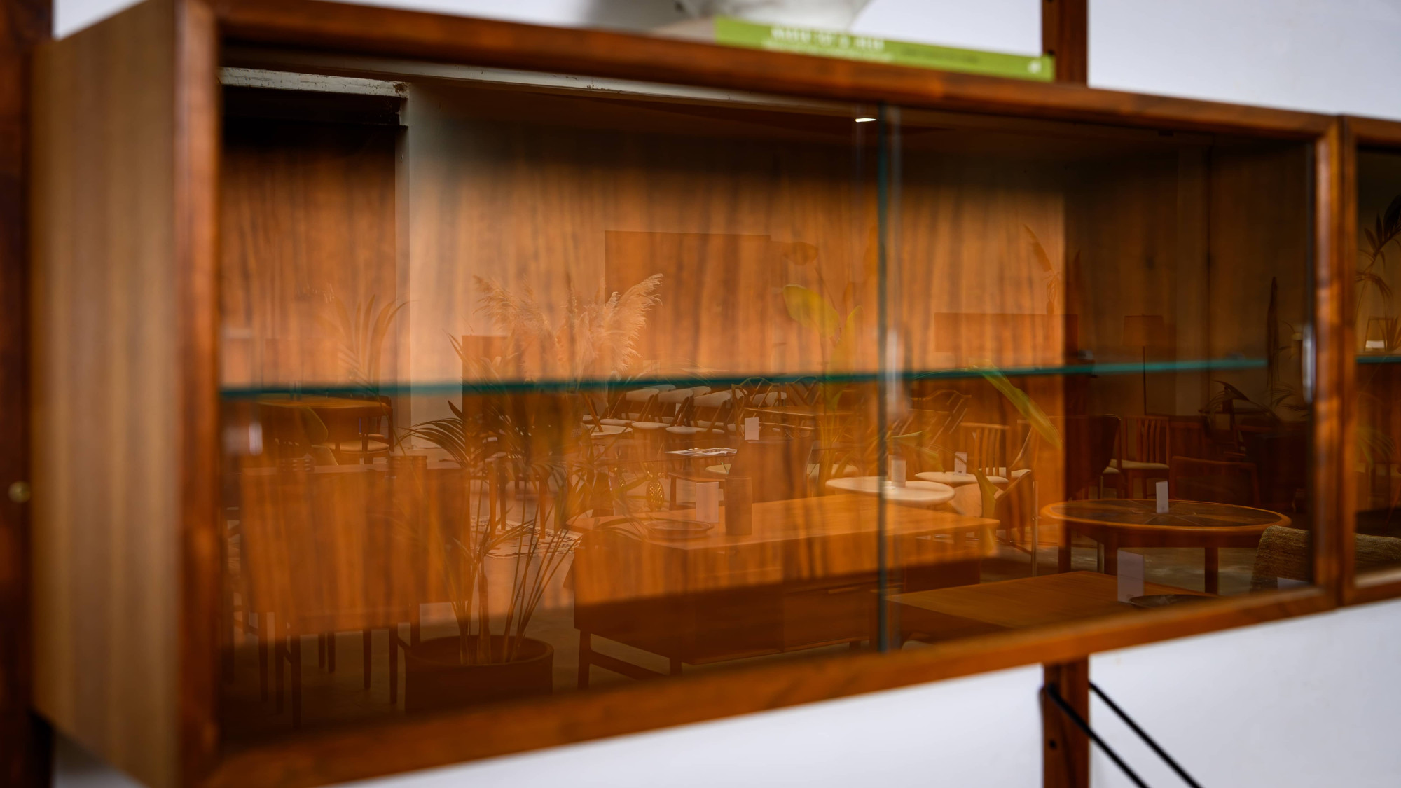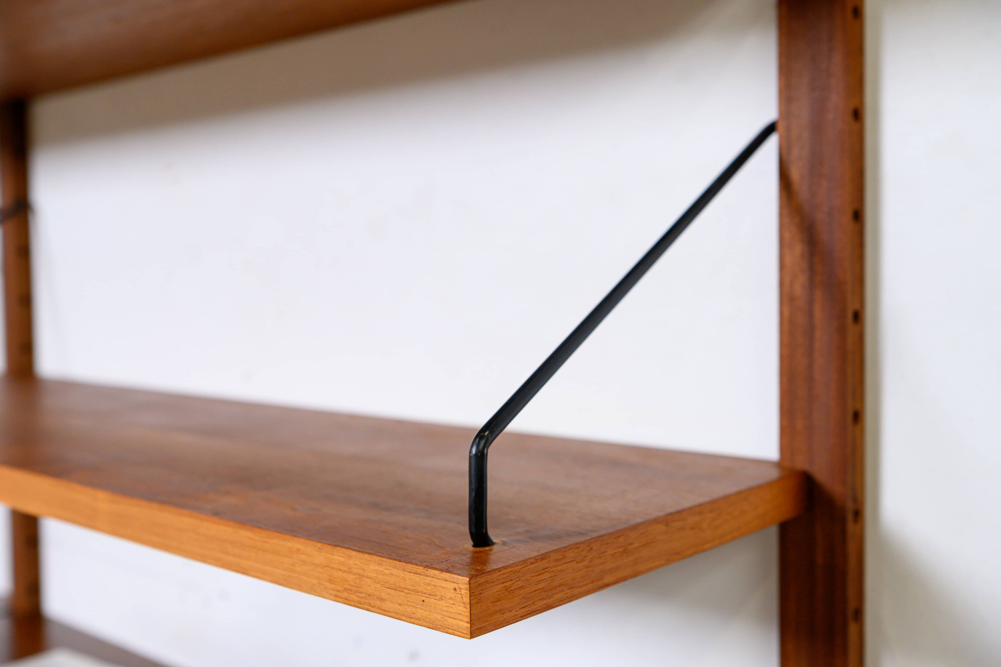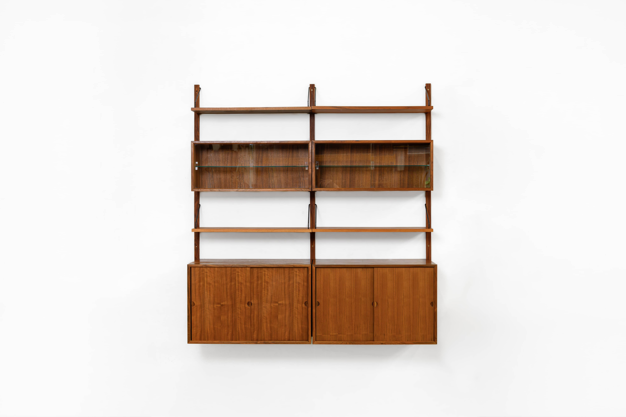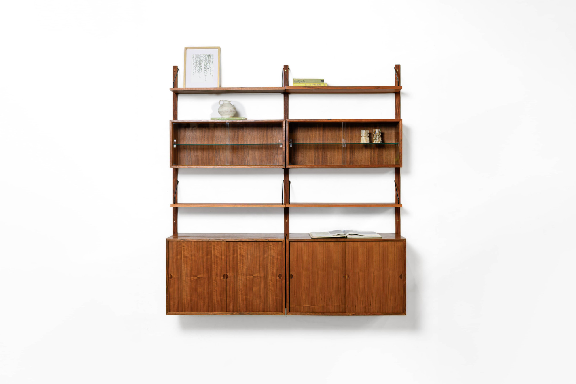 Danish modular wall unit by Poul Cadovius for Royal System. This setup has two storage cabinets, two display cabinets and four bookshelves. Always adaptable and further expandable.