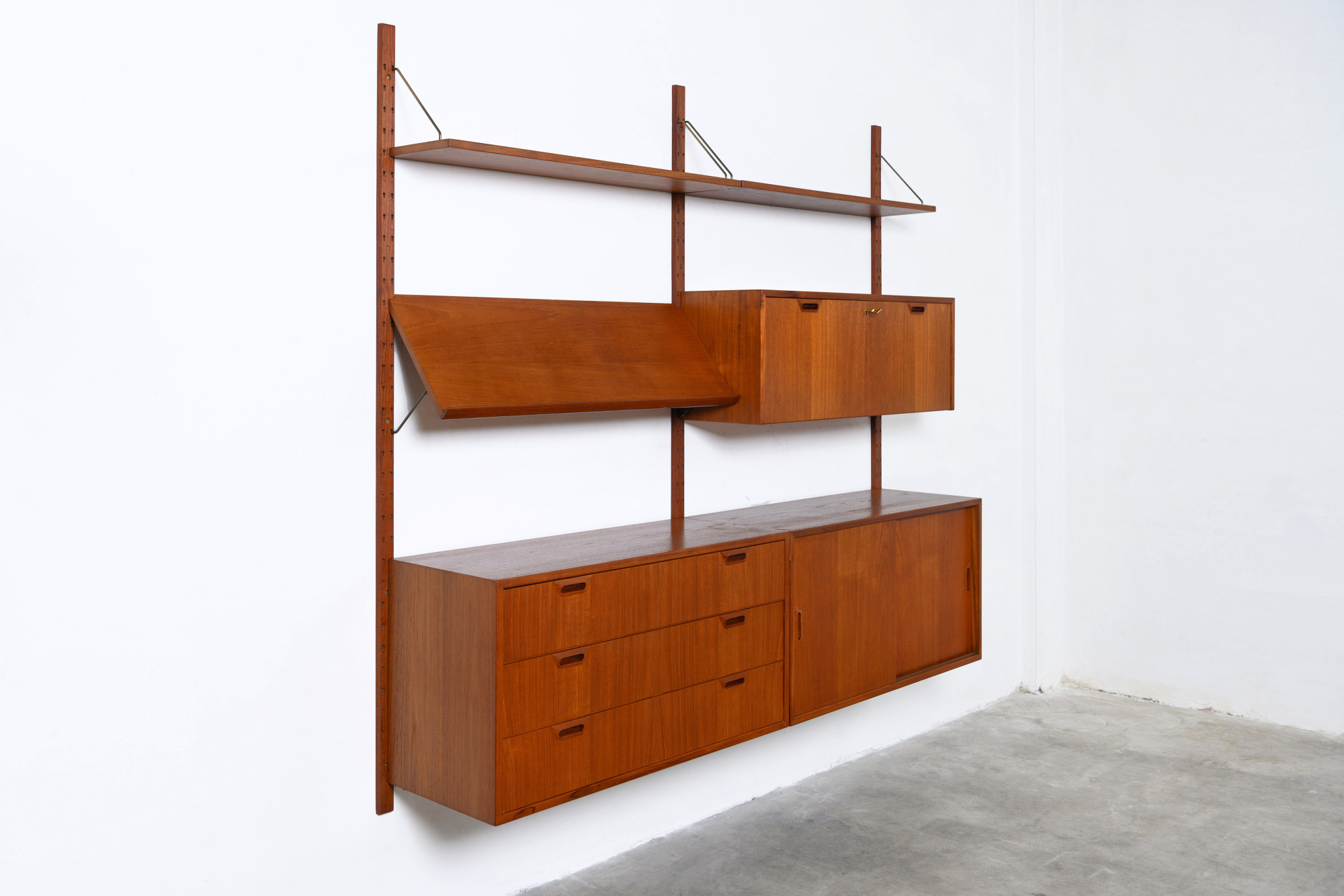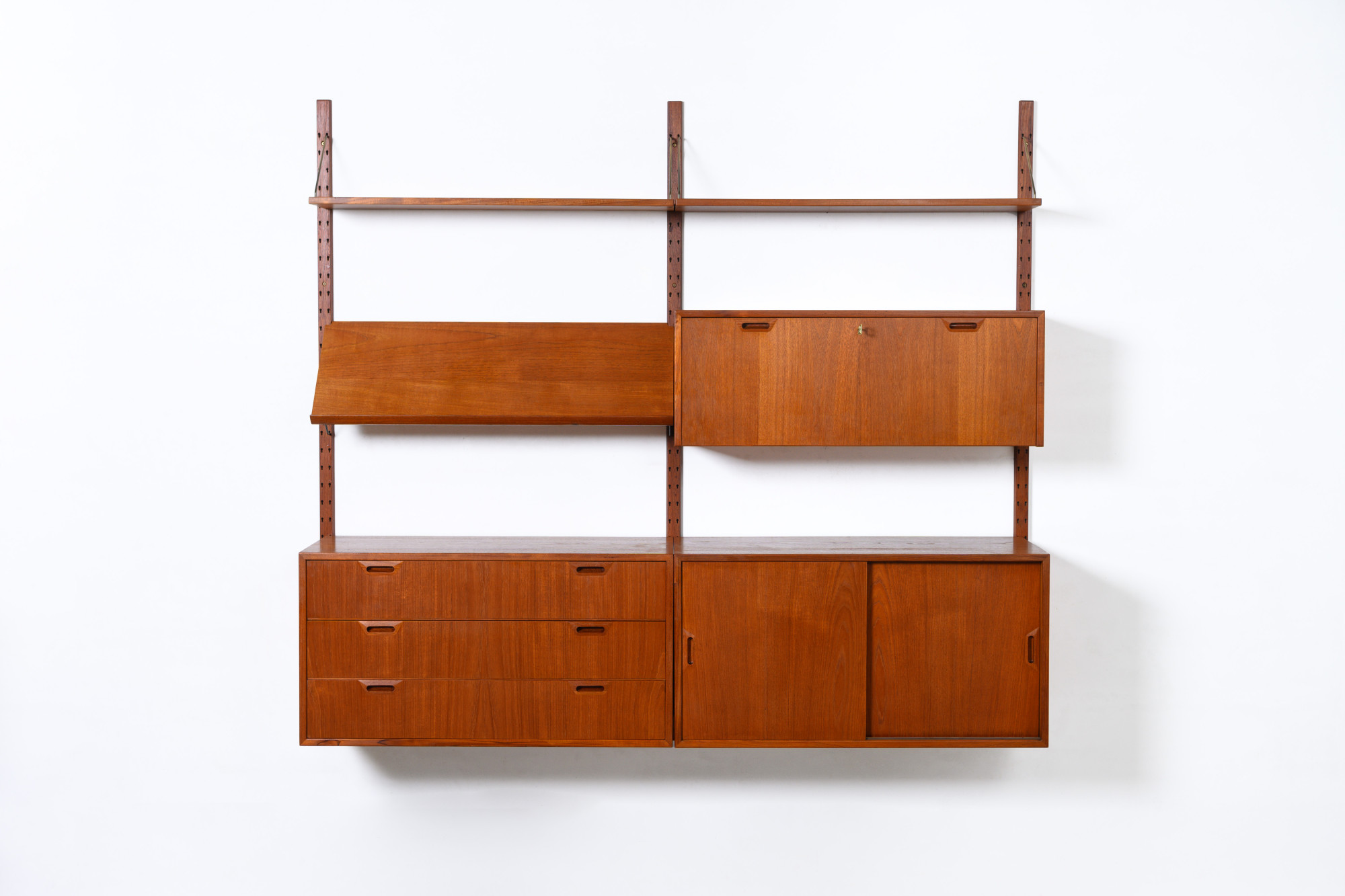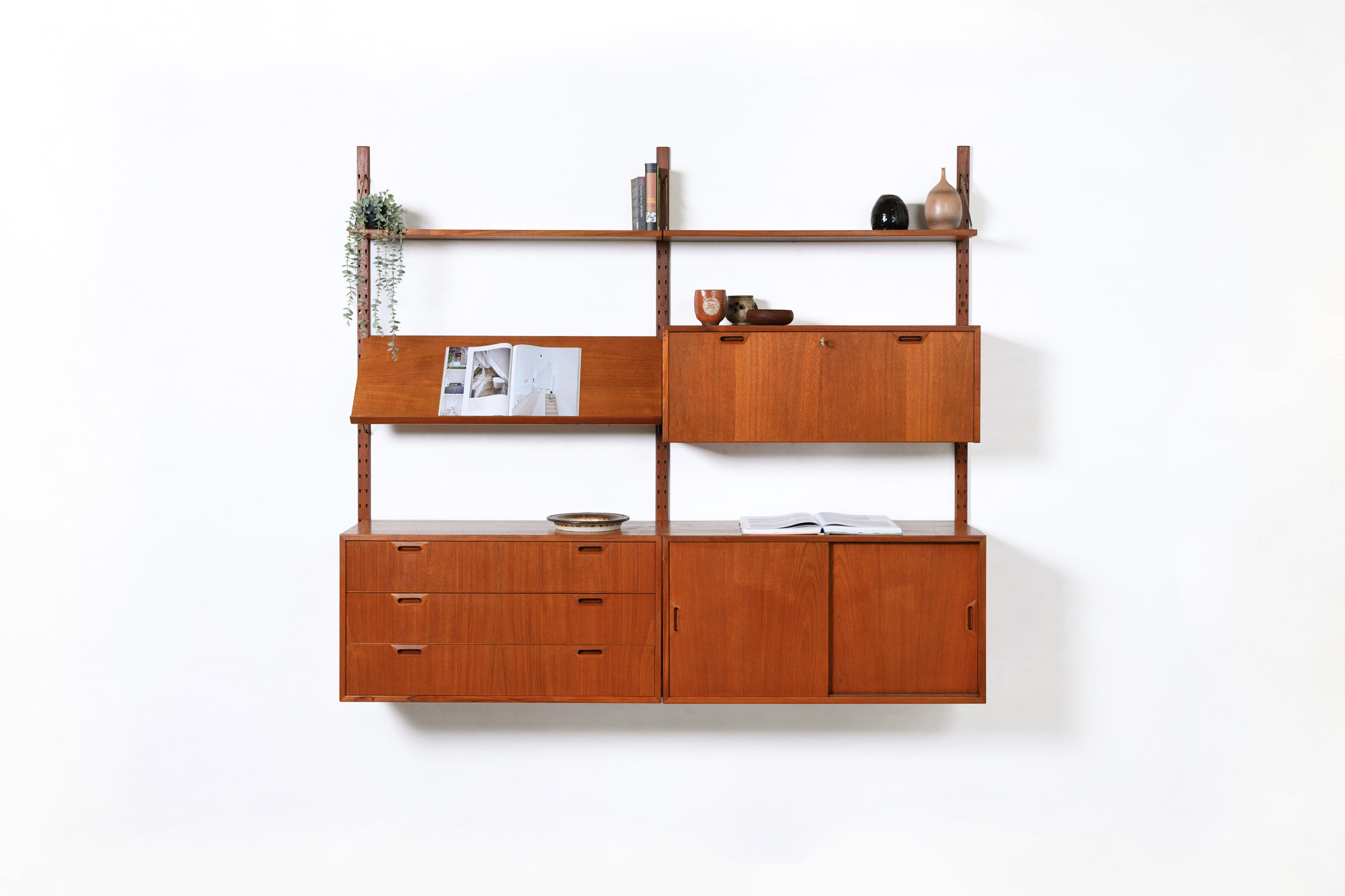 Rare Danish modular wall unit by Sven Ellekaer for Albert Hansen, Denmark 1960s. This teak setup has two storage cabinets, one bar cabinet, one reading shelf and two bookshelves. Always adaptable and further expandable.