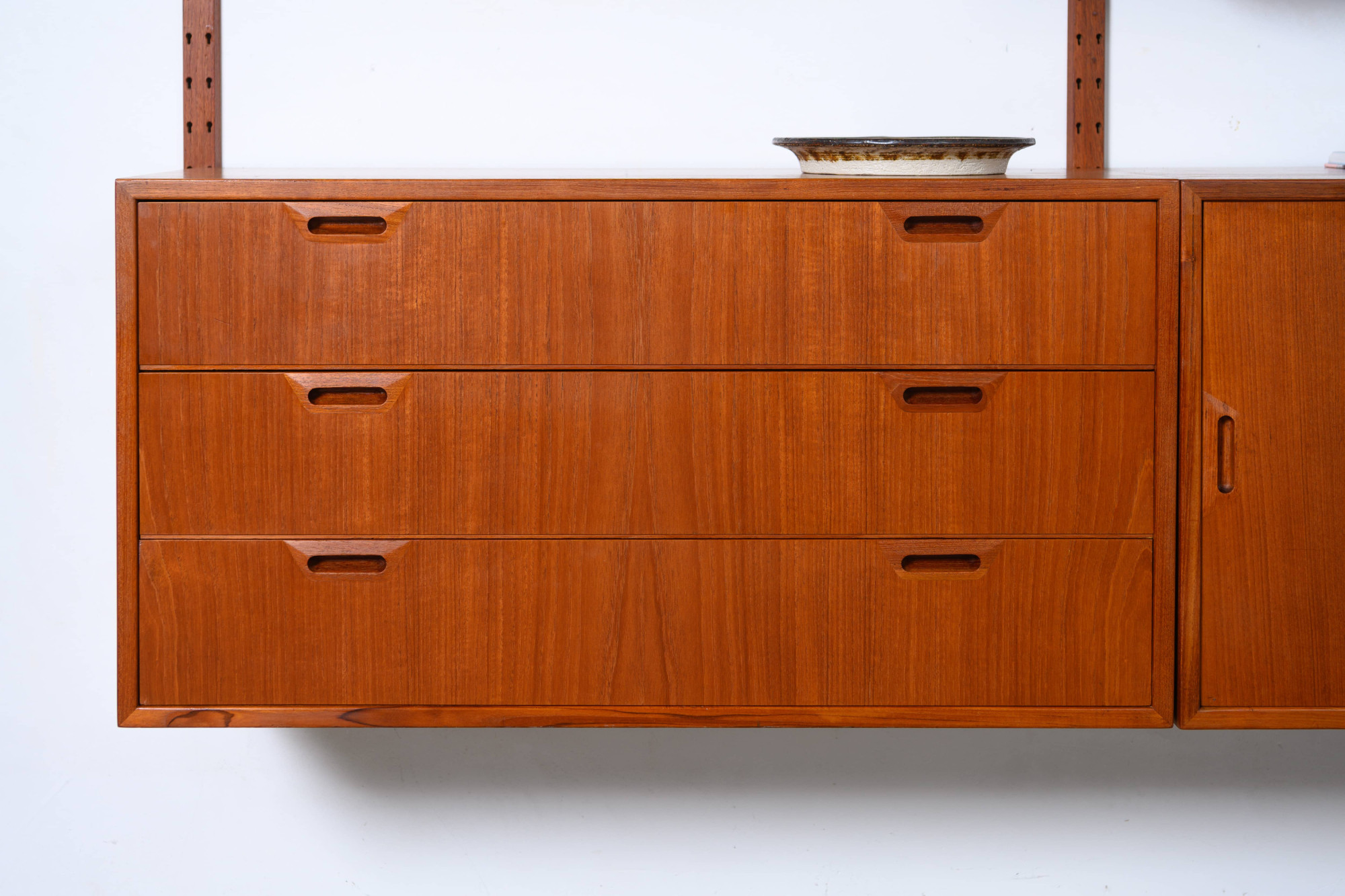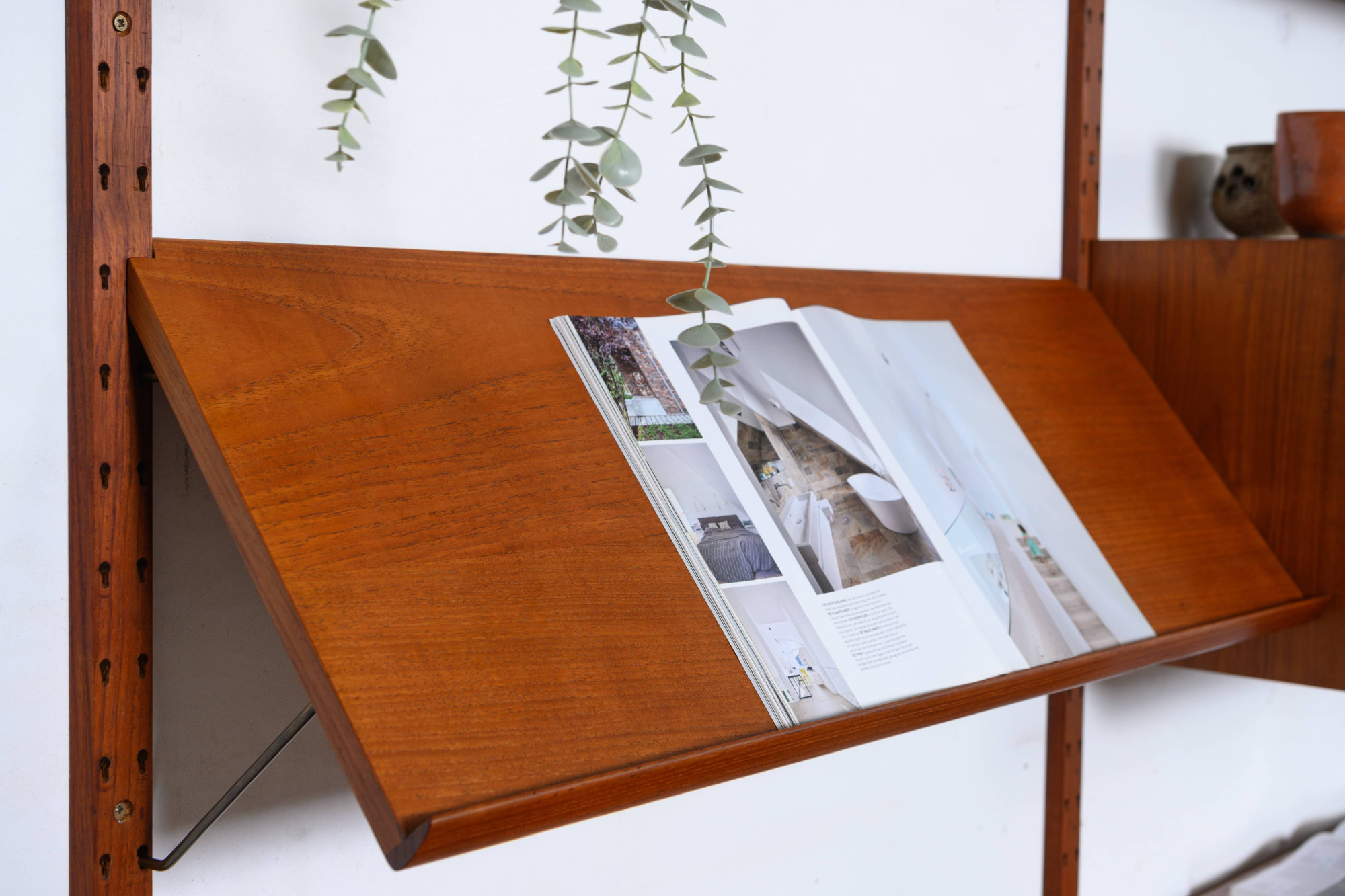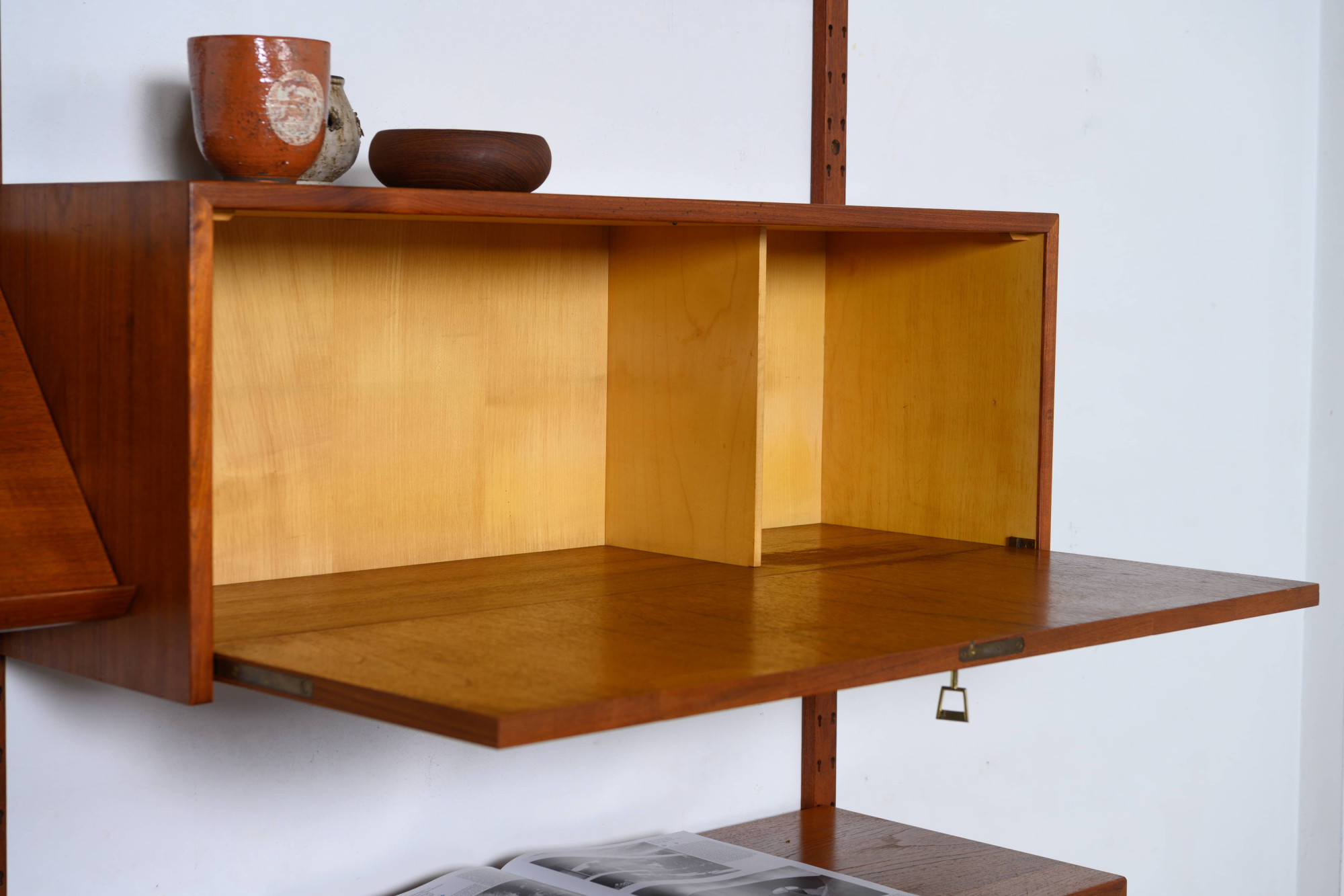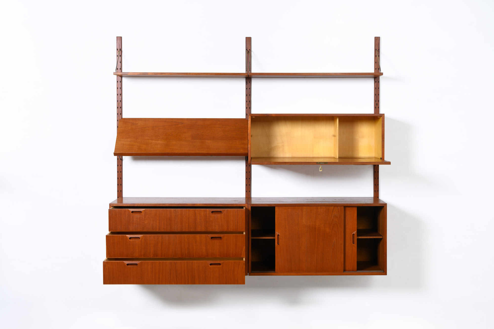 Rare Danish modular wall unit by Sven Ellekaer for Albert Hansen, Denmark 1960s. This teak setup has two storage cabinets, one bar cabinet, one reading shelf and two bookshelves. Always adaptable and further expandable.